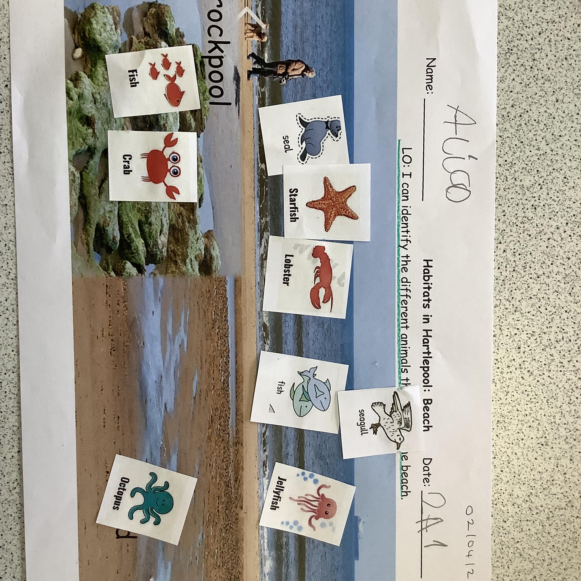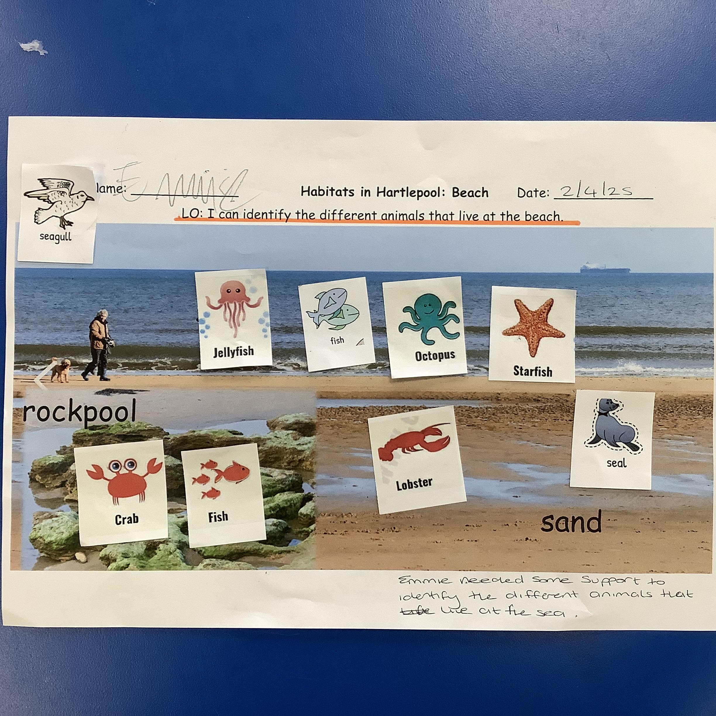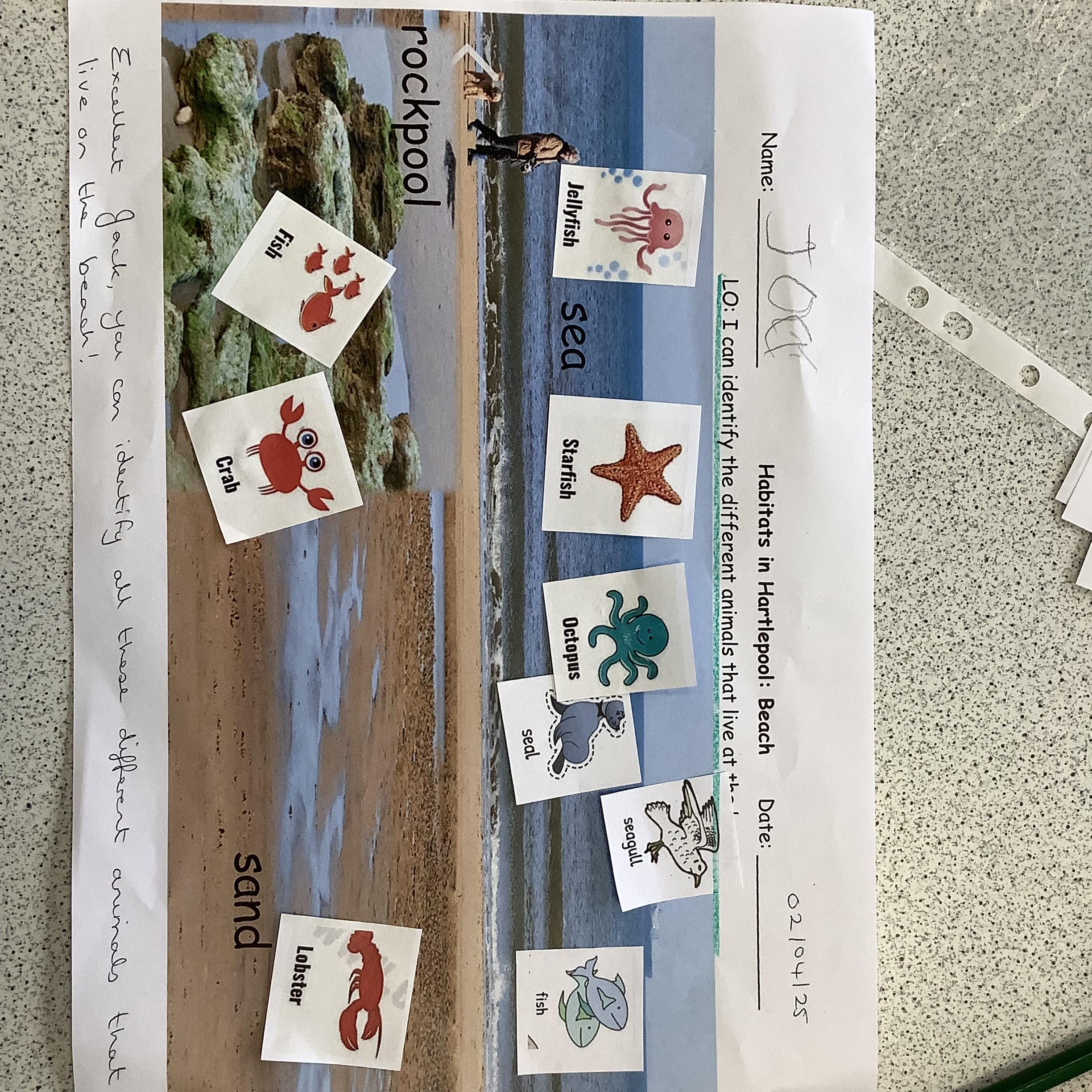 02.04.25 SCIENCE, HABITATS IN HARTLEPOOL: BEACH After visiting the Headland Beach, we identified the different features of the beach and looked at what animals lives there too. We discussed whether we would find certain animals e.g. fish, crabs, lobster, starfish, seal, jellyfish, octopus, seagull etc. in the sea, sand or rock-pools.