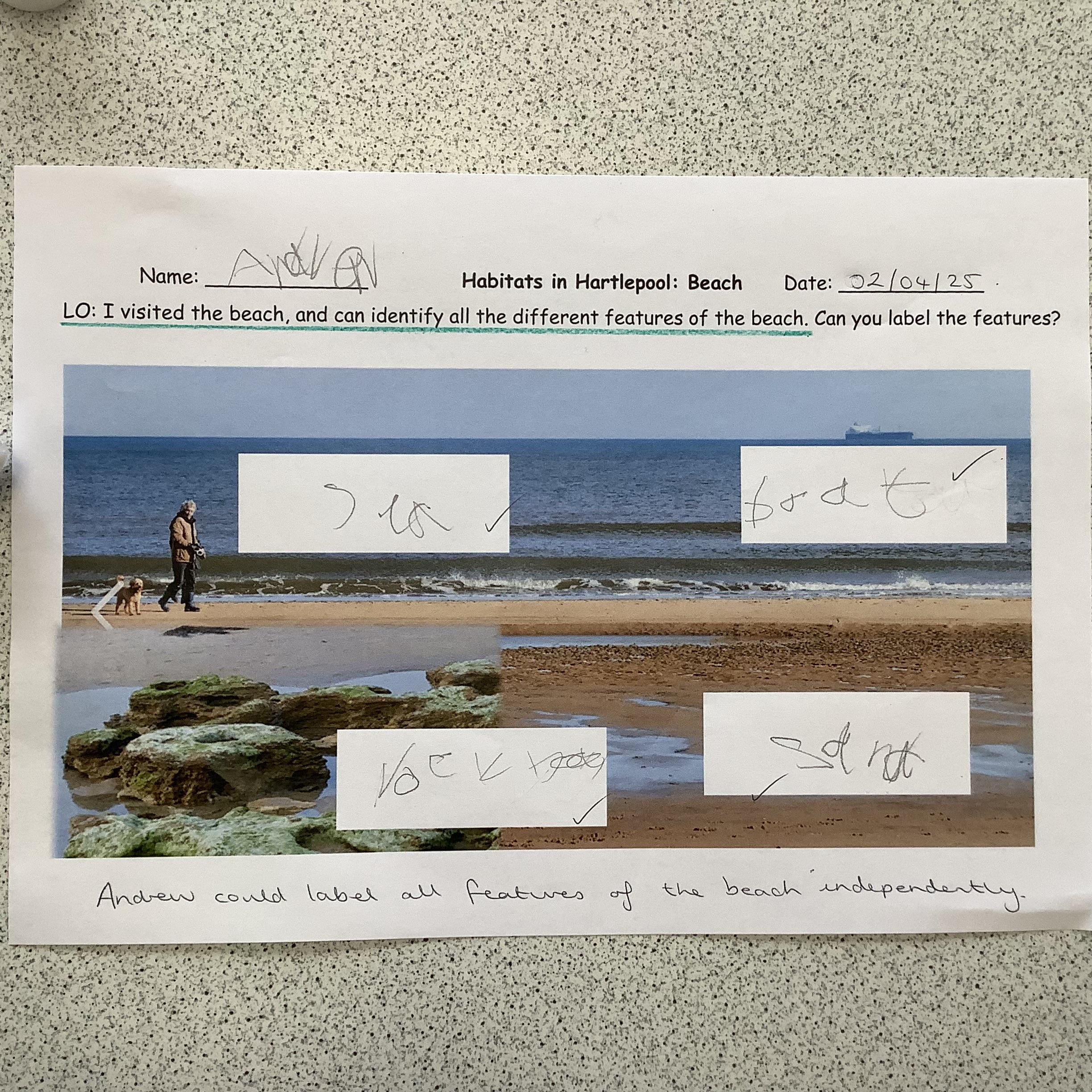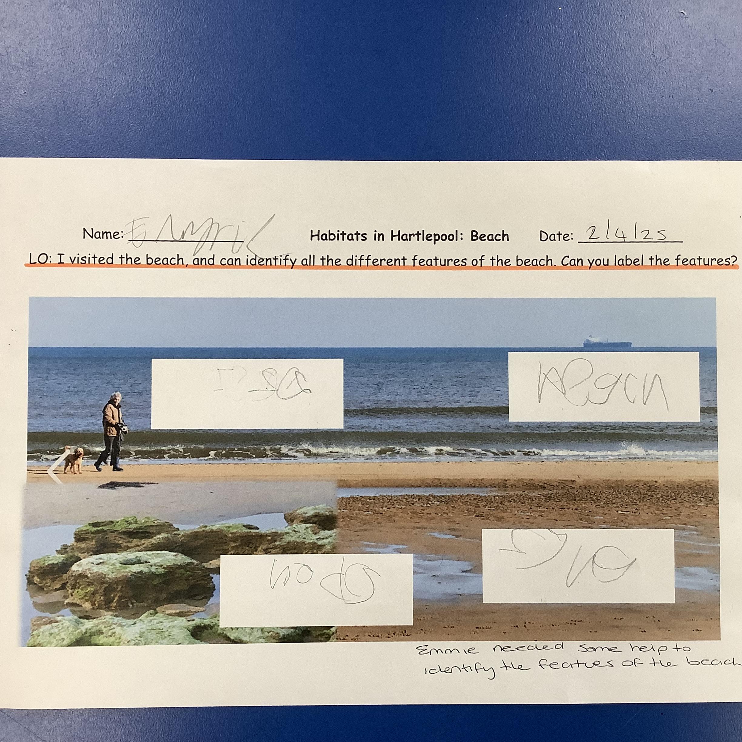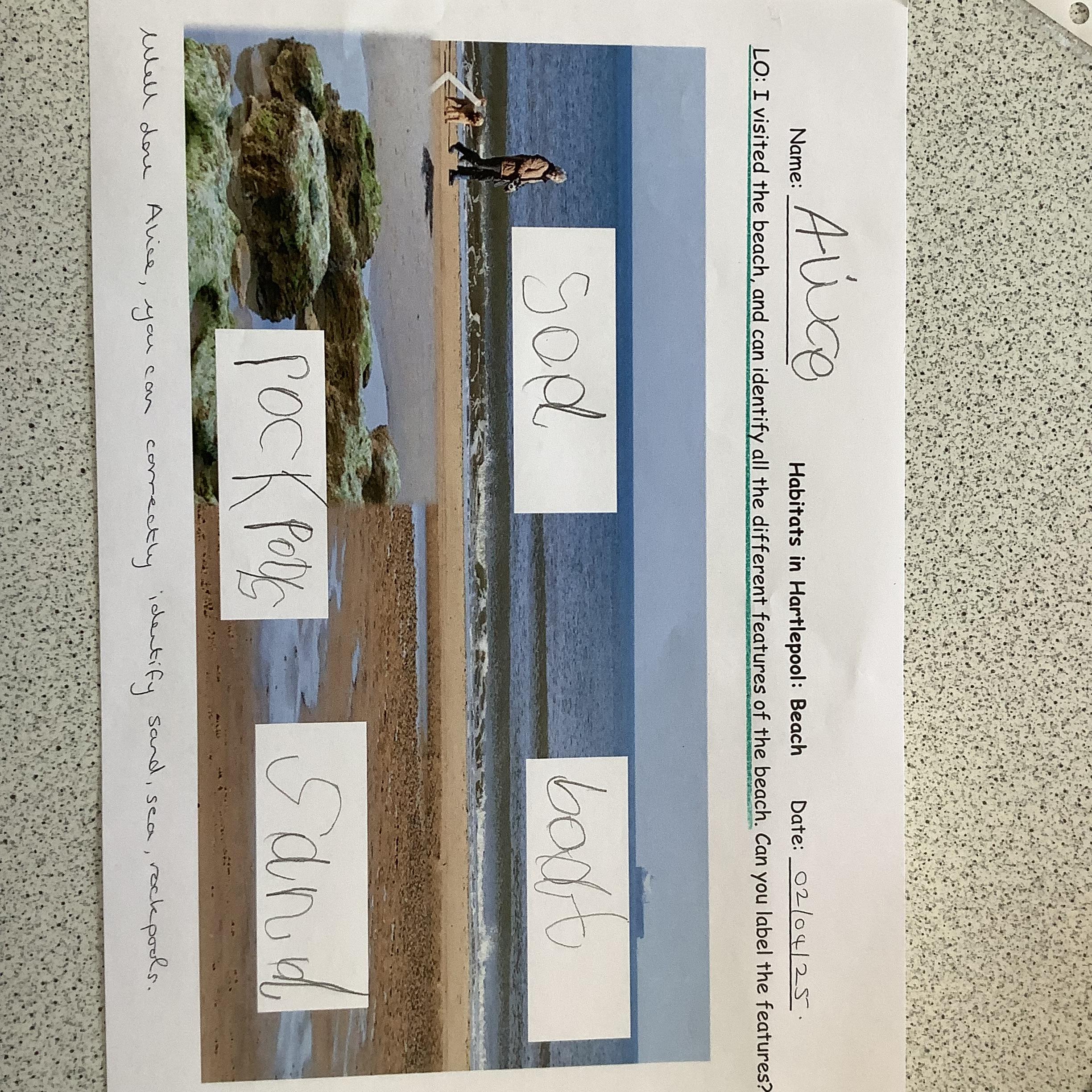 02.04.25 SCIENCE, HABITATS IN HARTLEPOOL: BEACH After visiting the Headland Beach, we identified the different features of the beach and looked at what animals lives there too. We discussed whether we would find certain animals e.g. fish, crabs, lobster, starfish, seal, jellyfish, octopus, seagull etc. in the sea, sand or rock-pools.