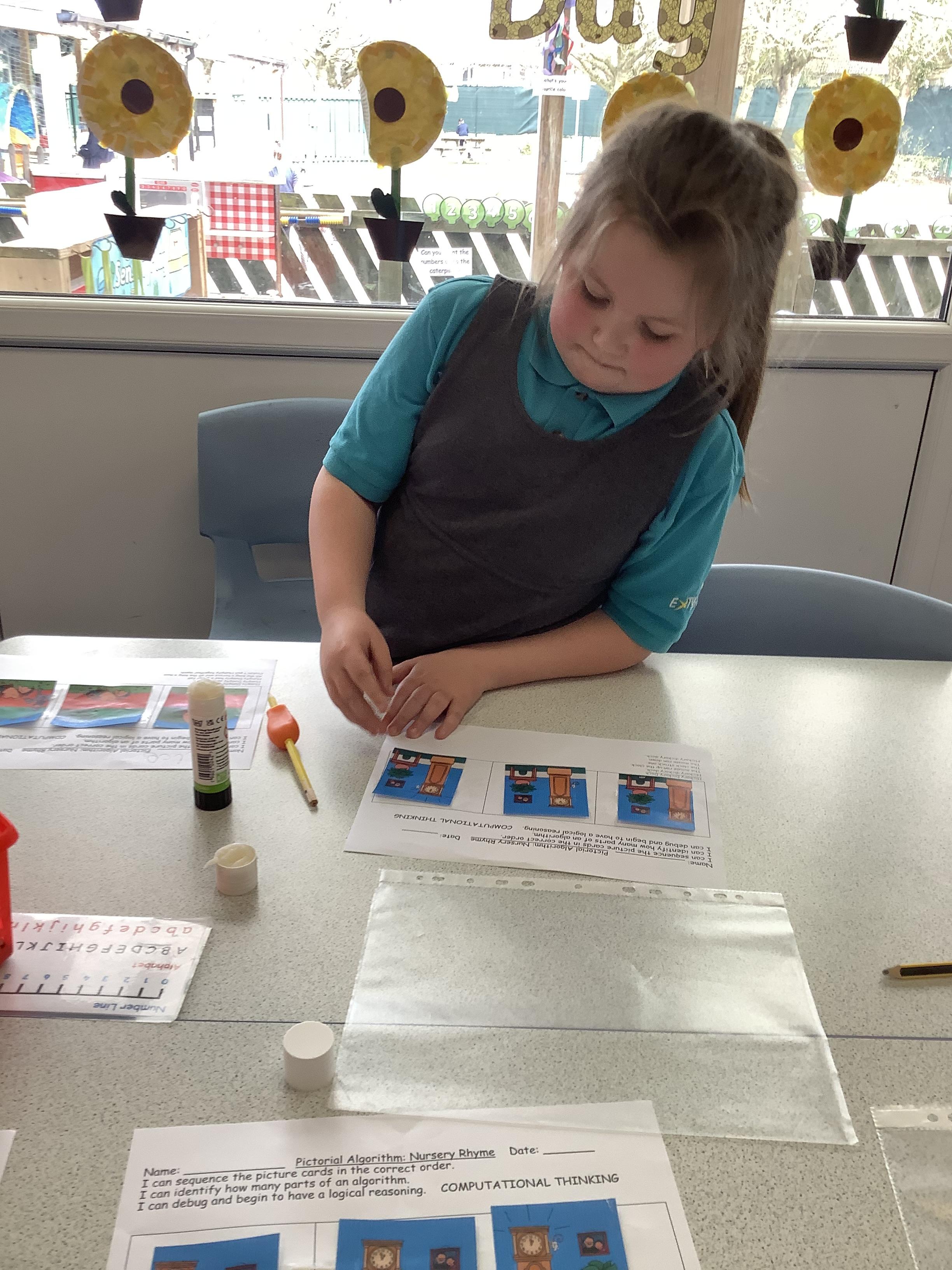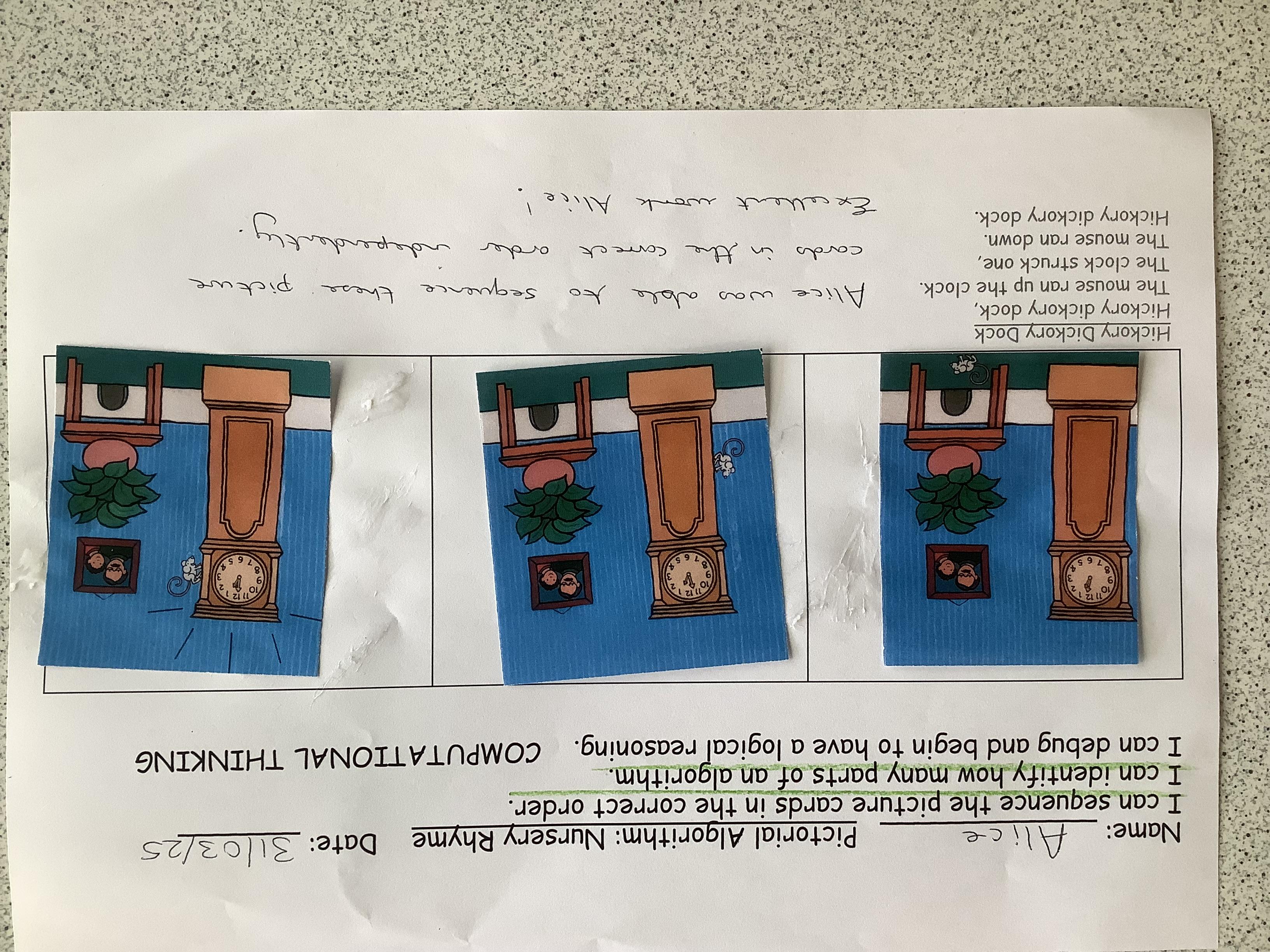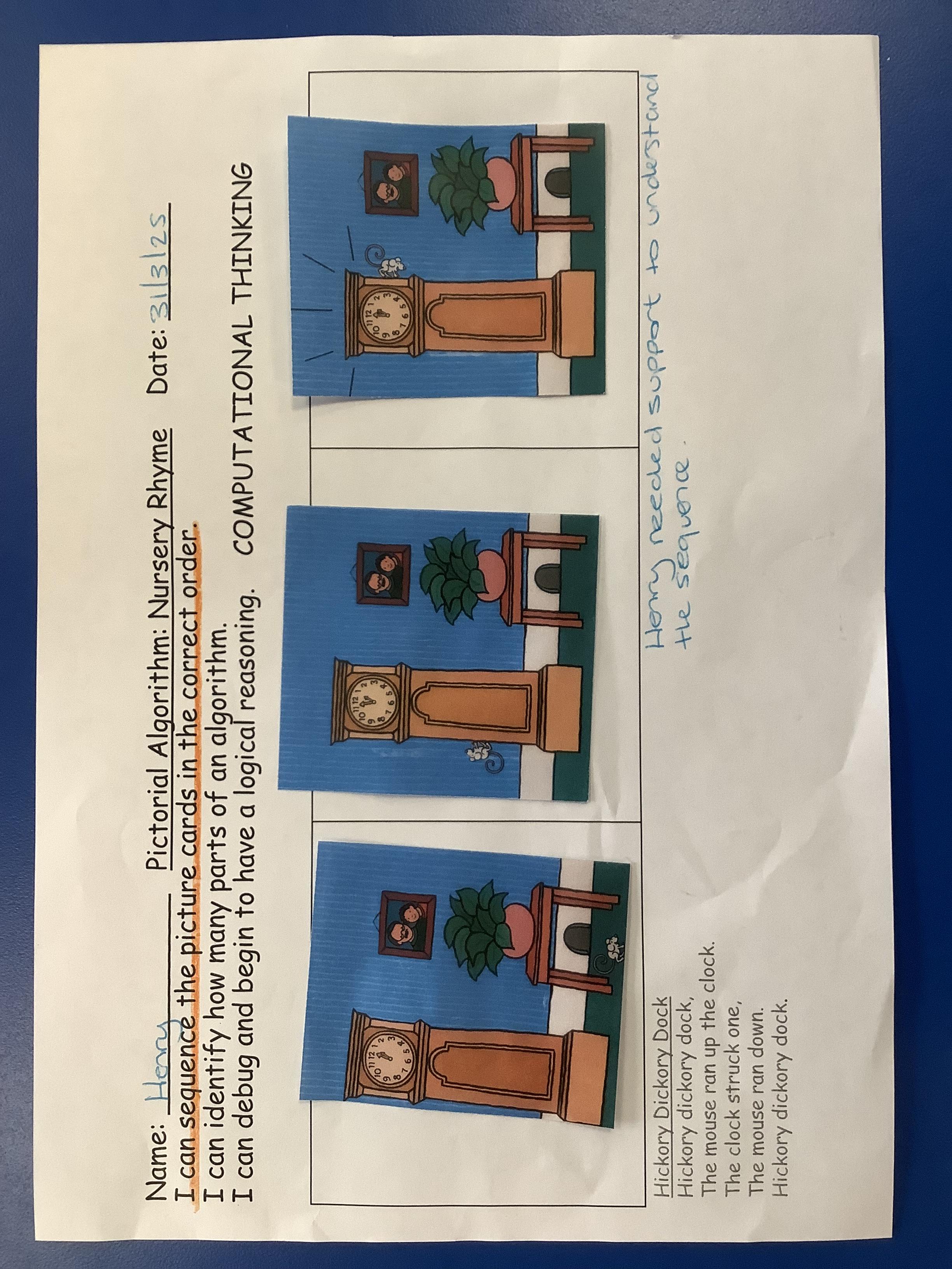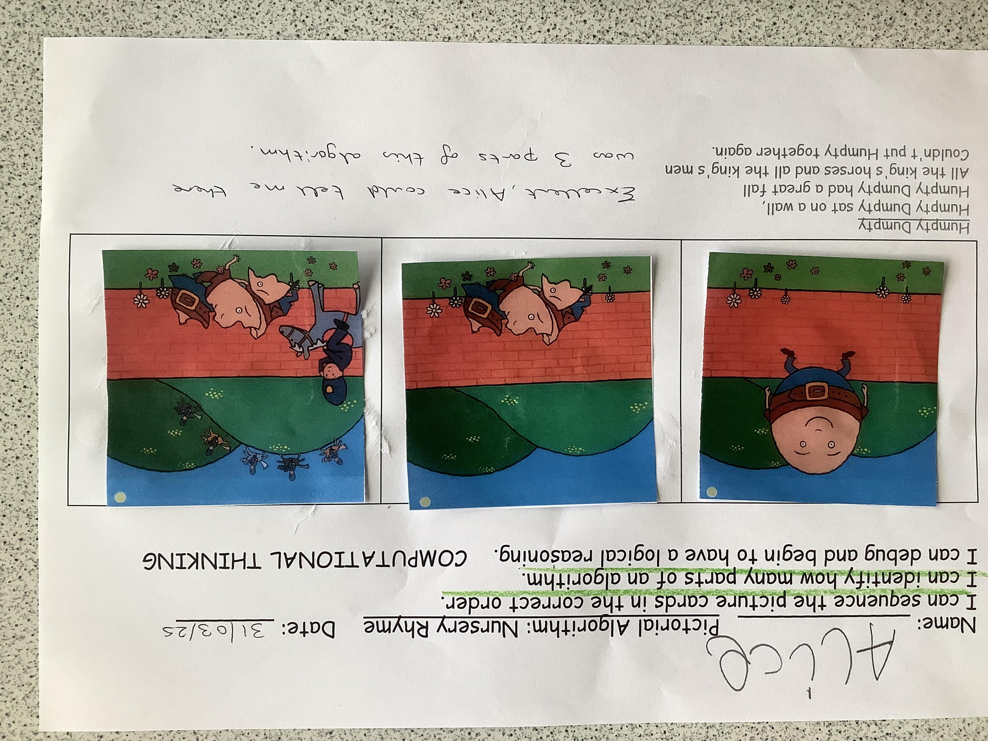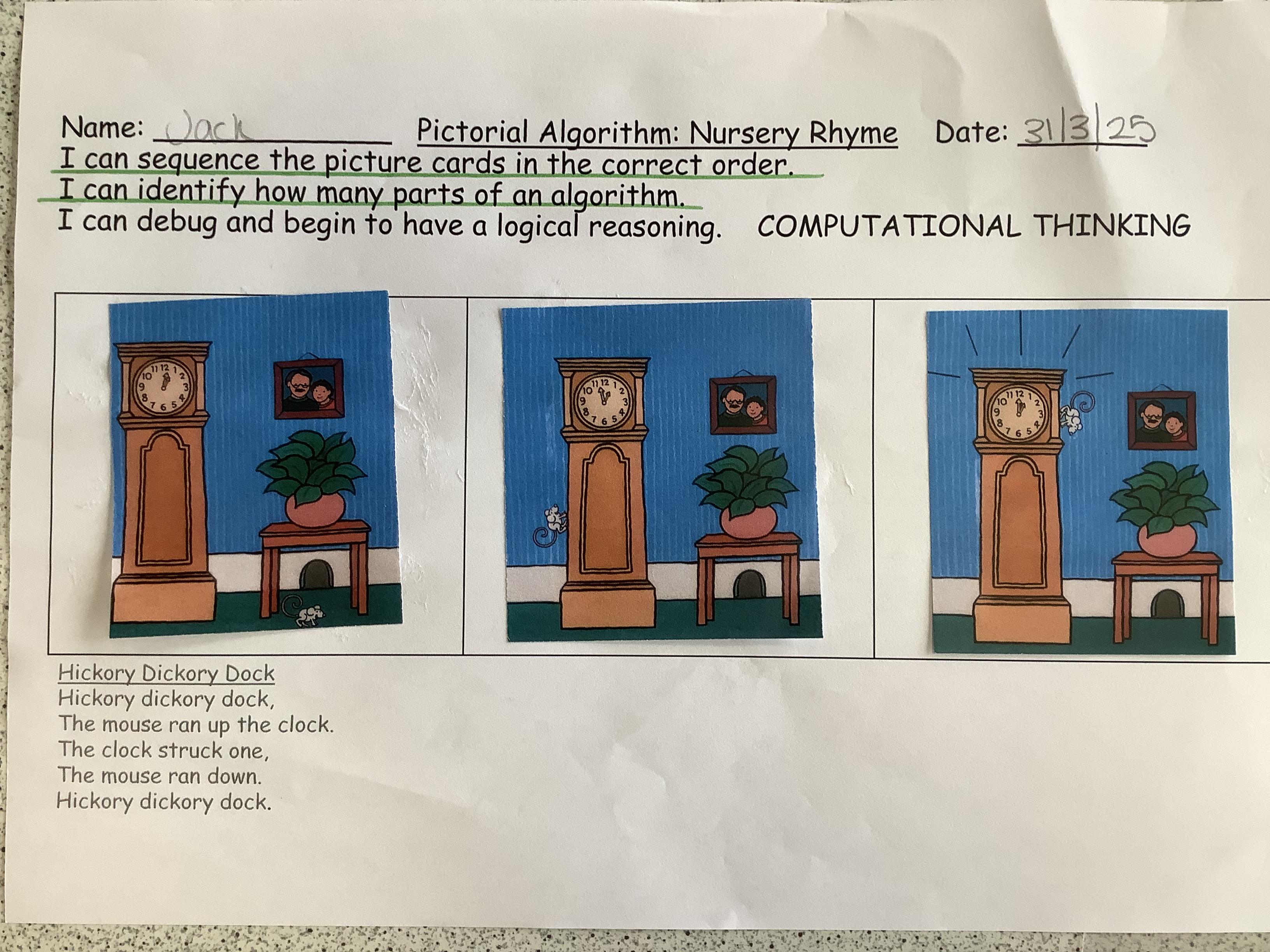 31.03.25 COMPUTING: PICTORIAL ALGORITHMS The children sequenced the nursery rhyme picture cards in the correct order. They could identify many parts of an algorithm there was. We had to debug and develop our logical reasoning when the picture cards were not in the correct order.
