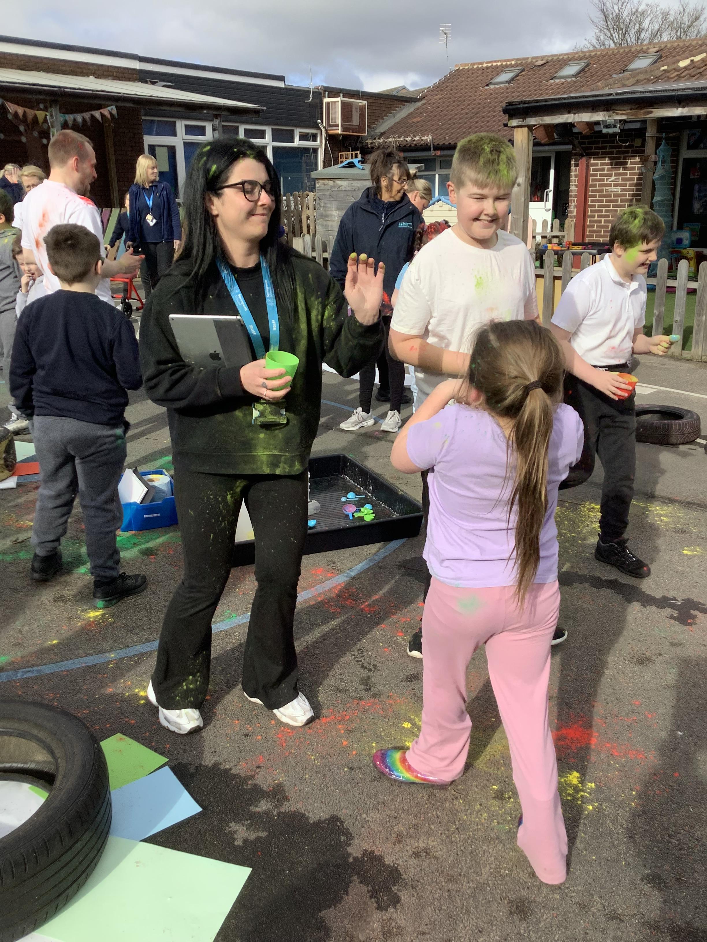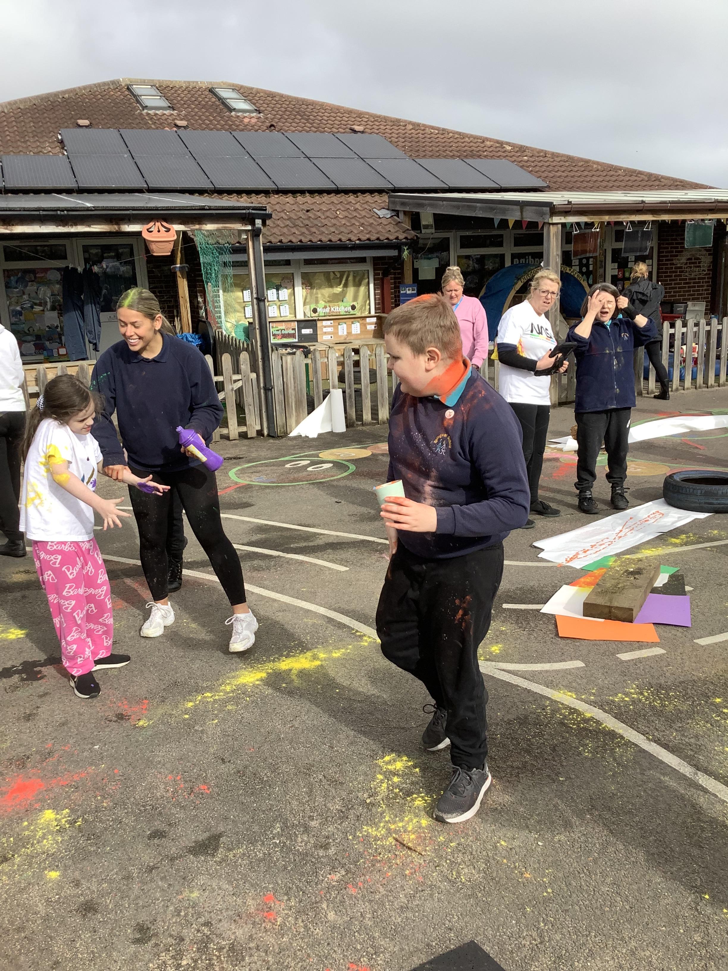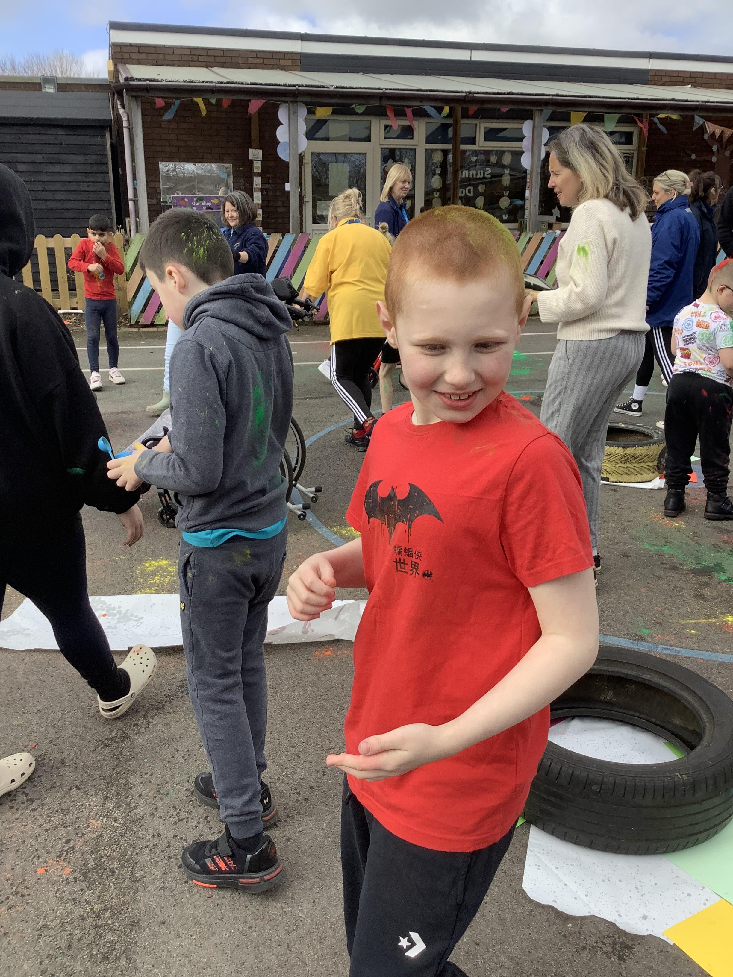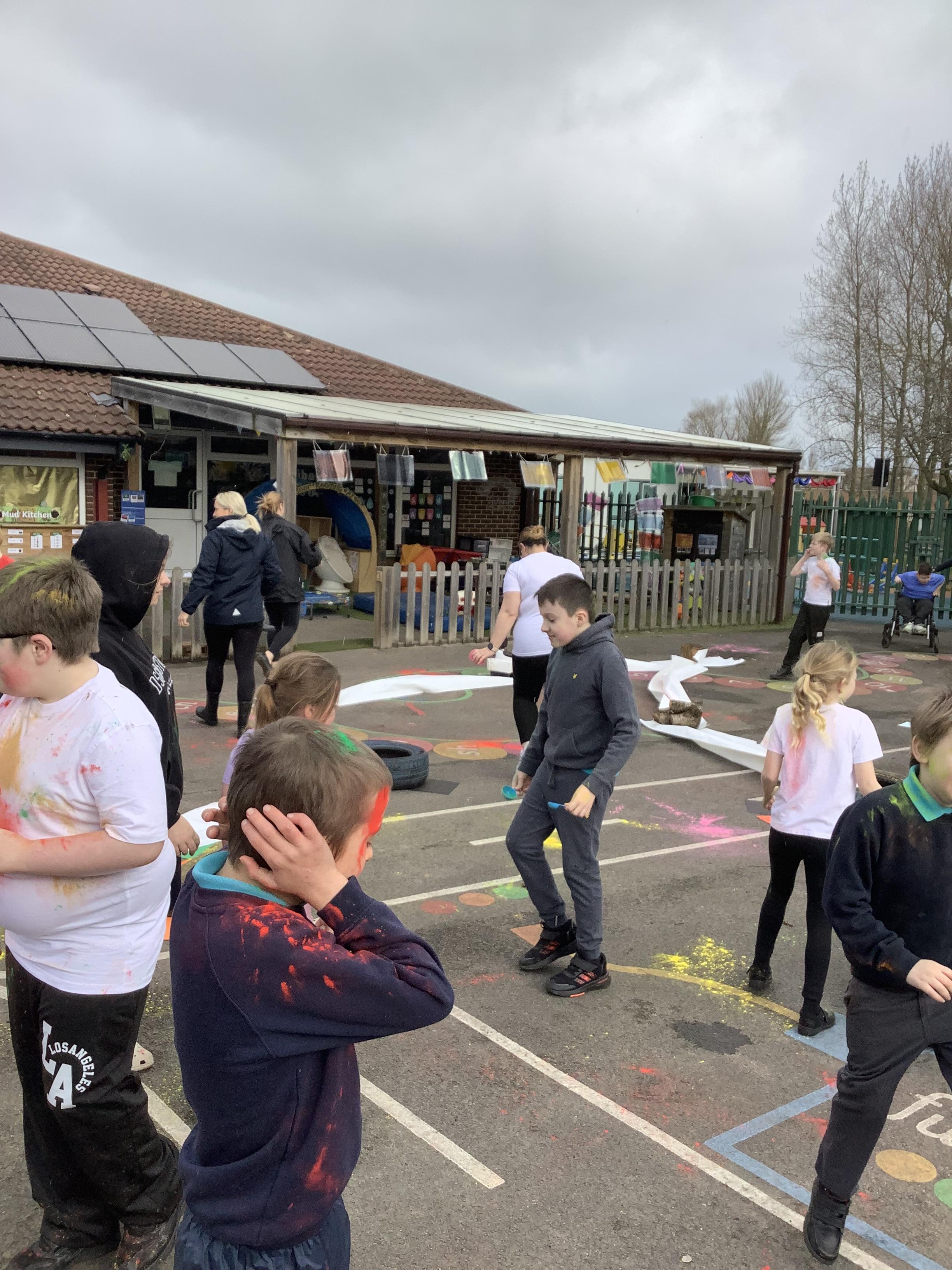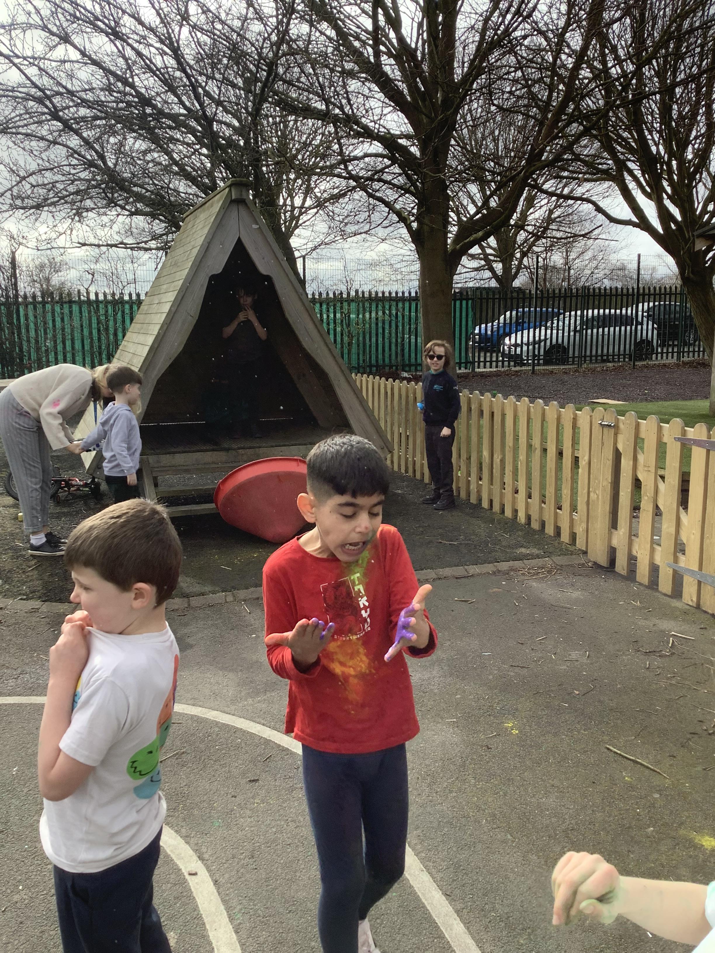 14.03.25 RE: Holi Festival! Some of the children from Anaconda Class had a brilliant time at Springwell Schools Holi Festival, the festival of colour! They had great fun throwing paint at each other and getting messy out on the yard.