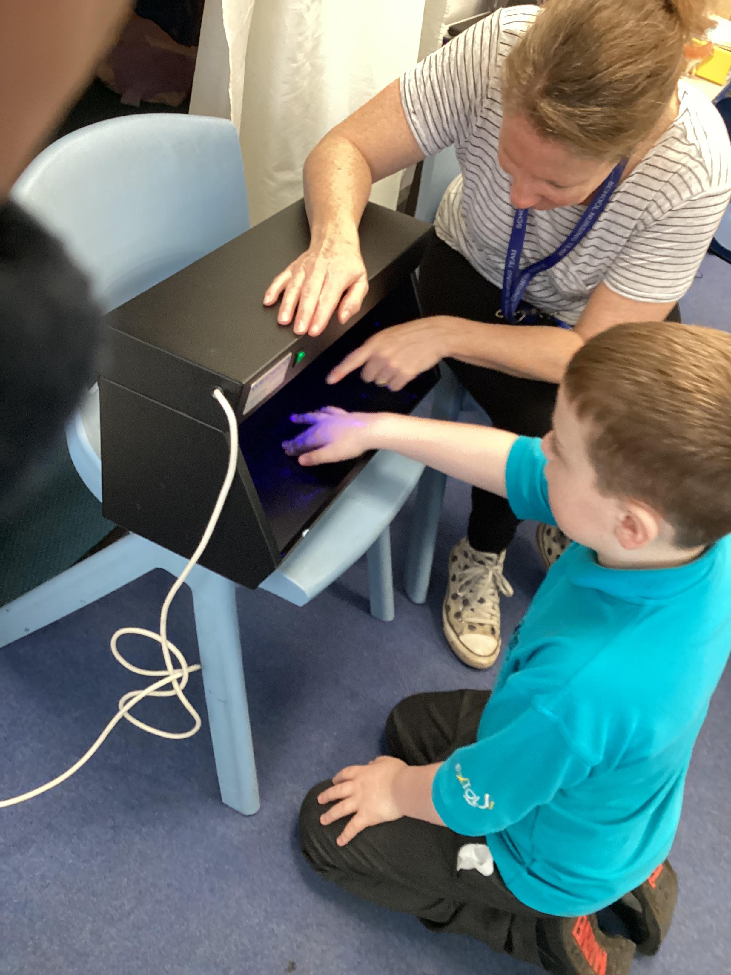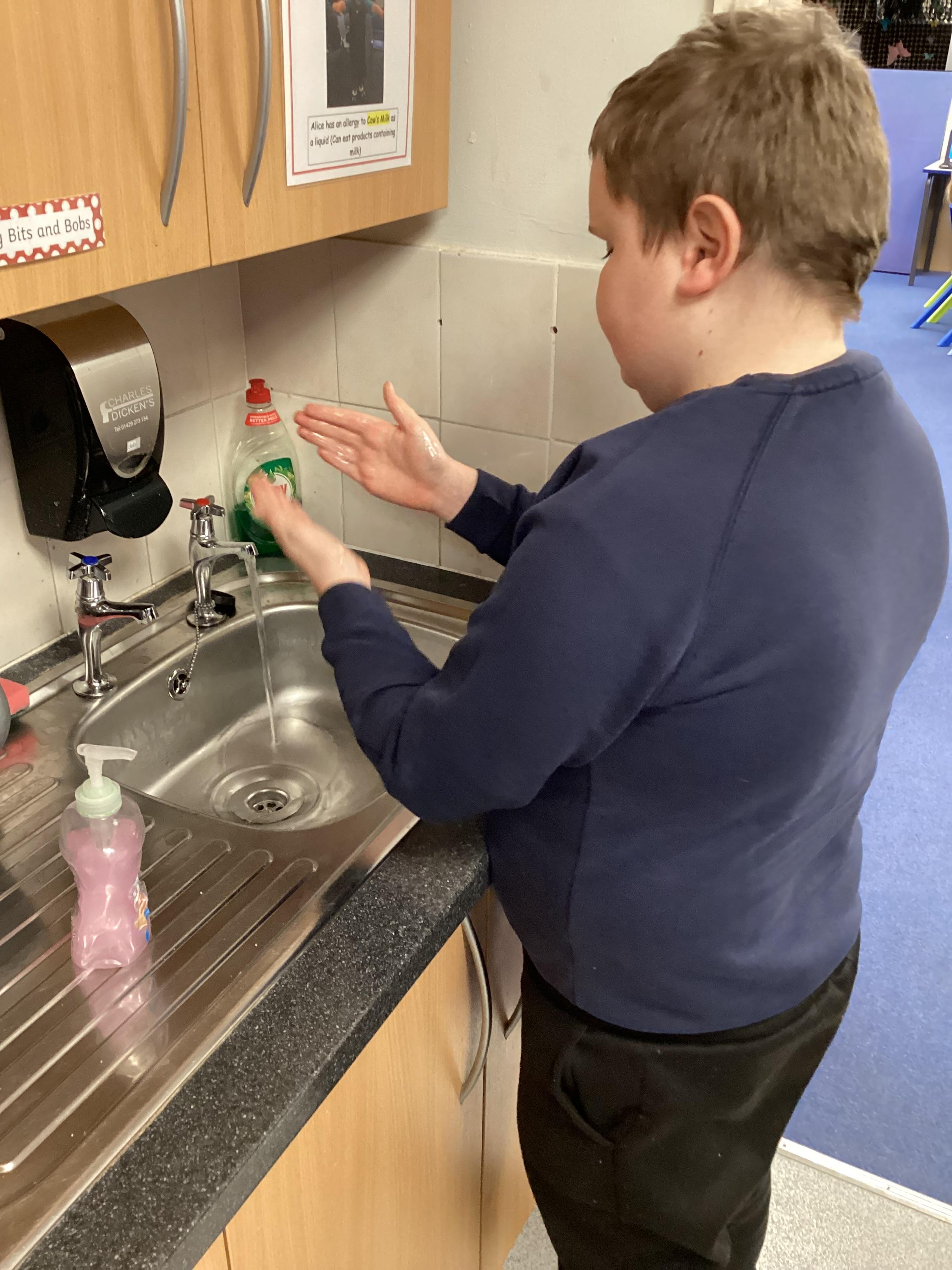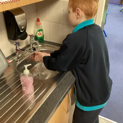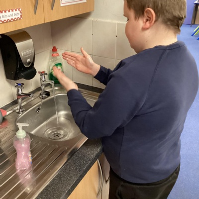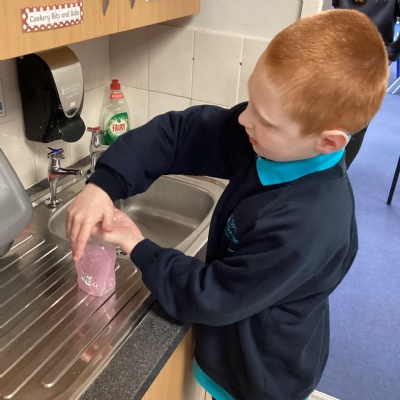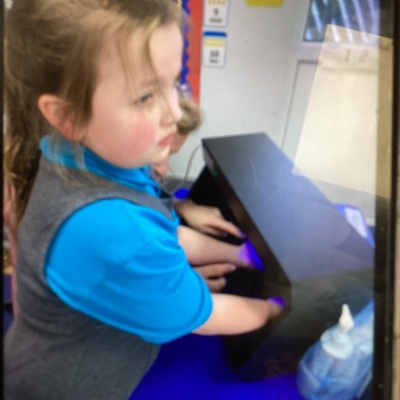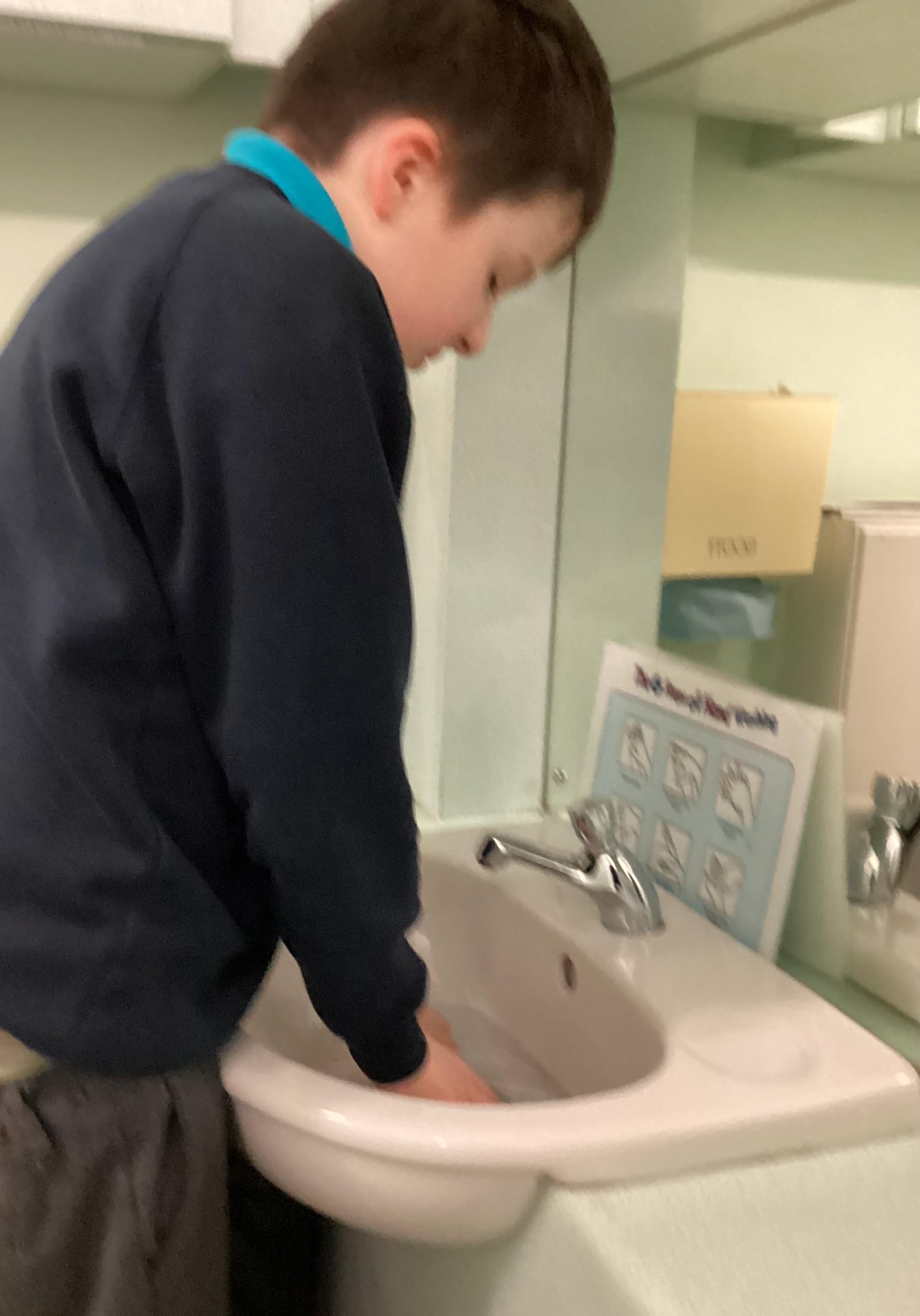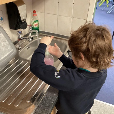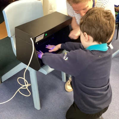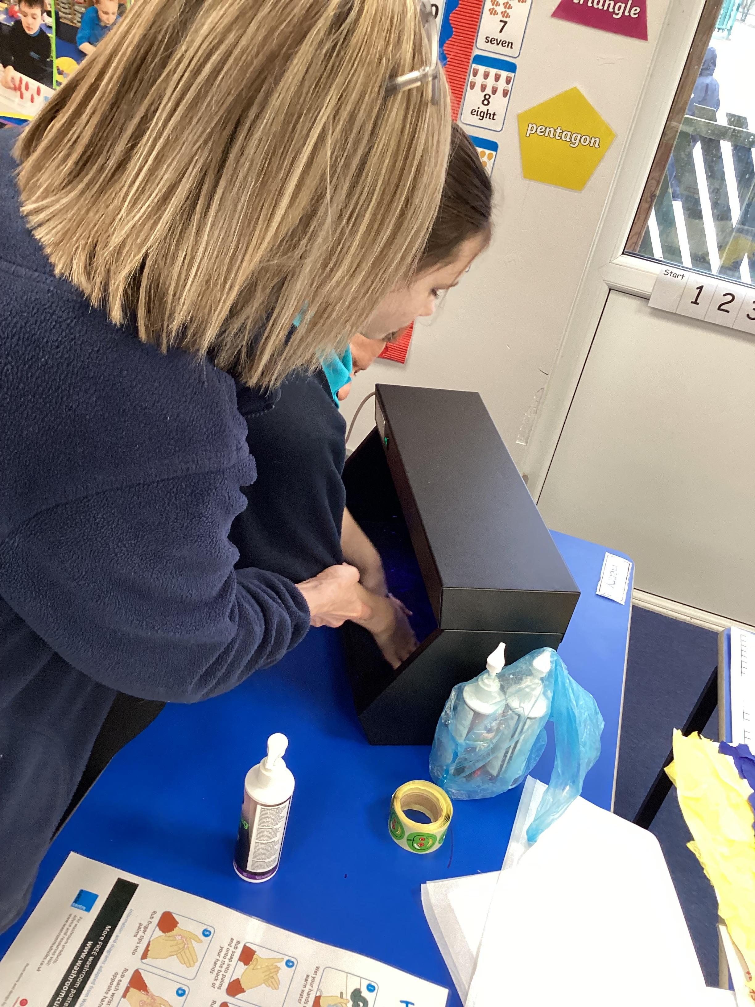 21.02.25 PHSRE: HAND WASHING The school nurses came into school today and read the children a story called: 'I Don't Want To Wash My Hands!' by Tony Ross. The children put special soap on their hands and placed them under a light box which illuminated all the germs. The children washed all their germs off their hands with soap and water. The nurses explained the importance of washing our hands regularly and when we should do so.