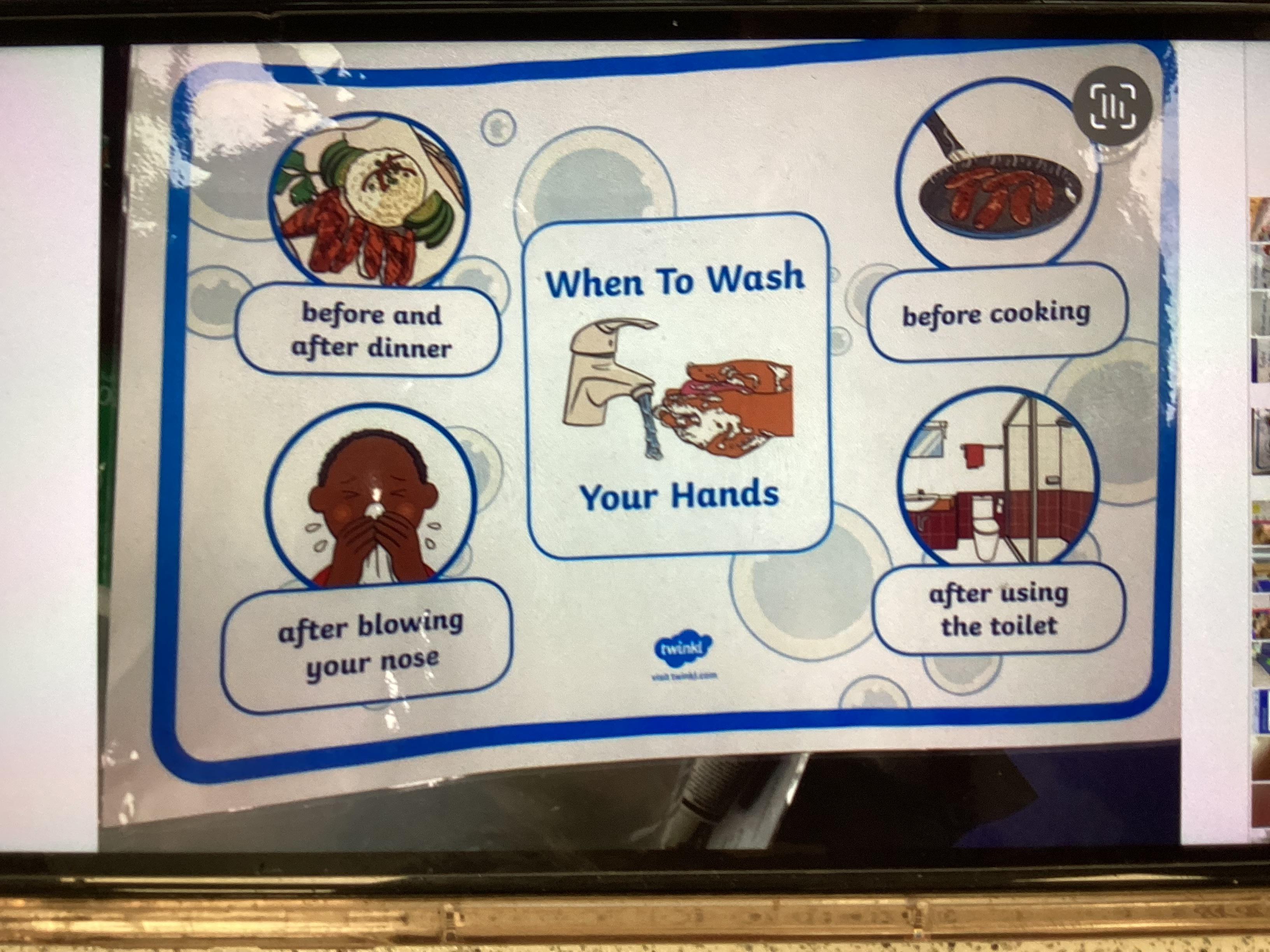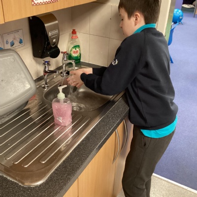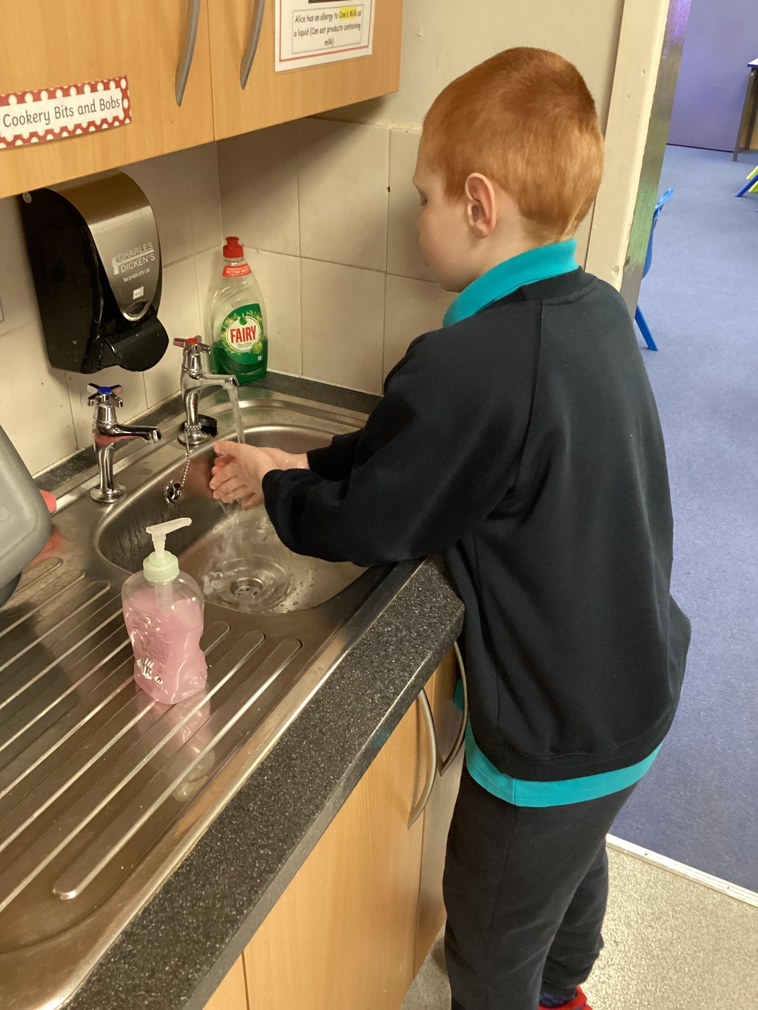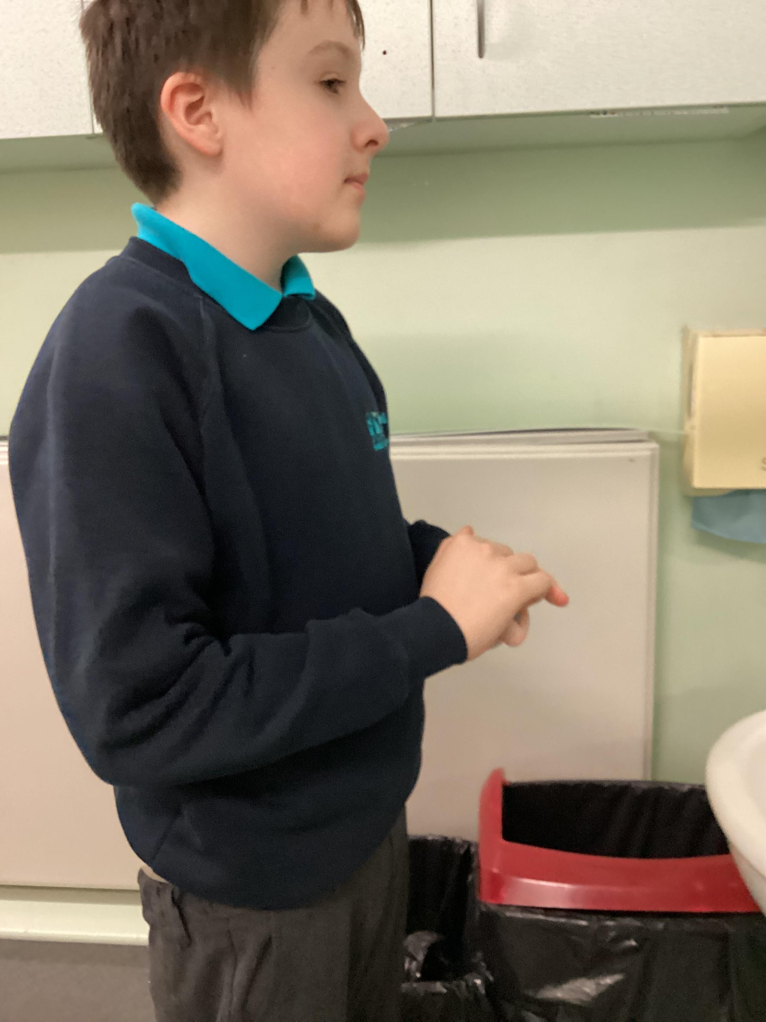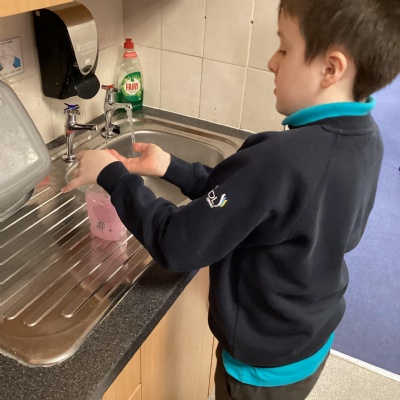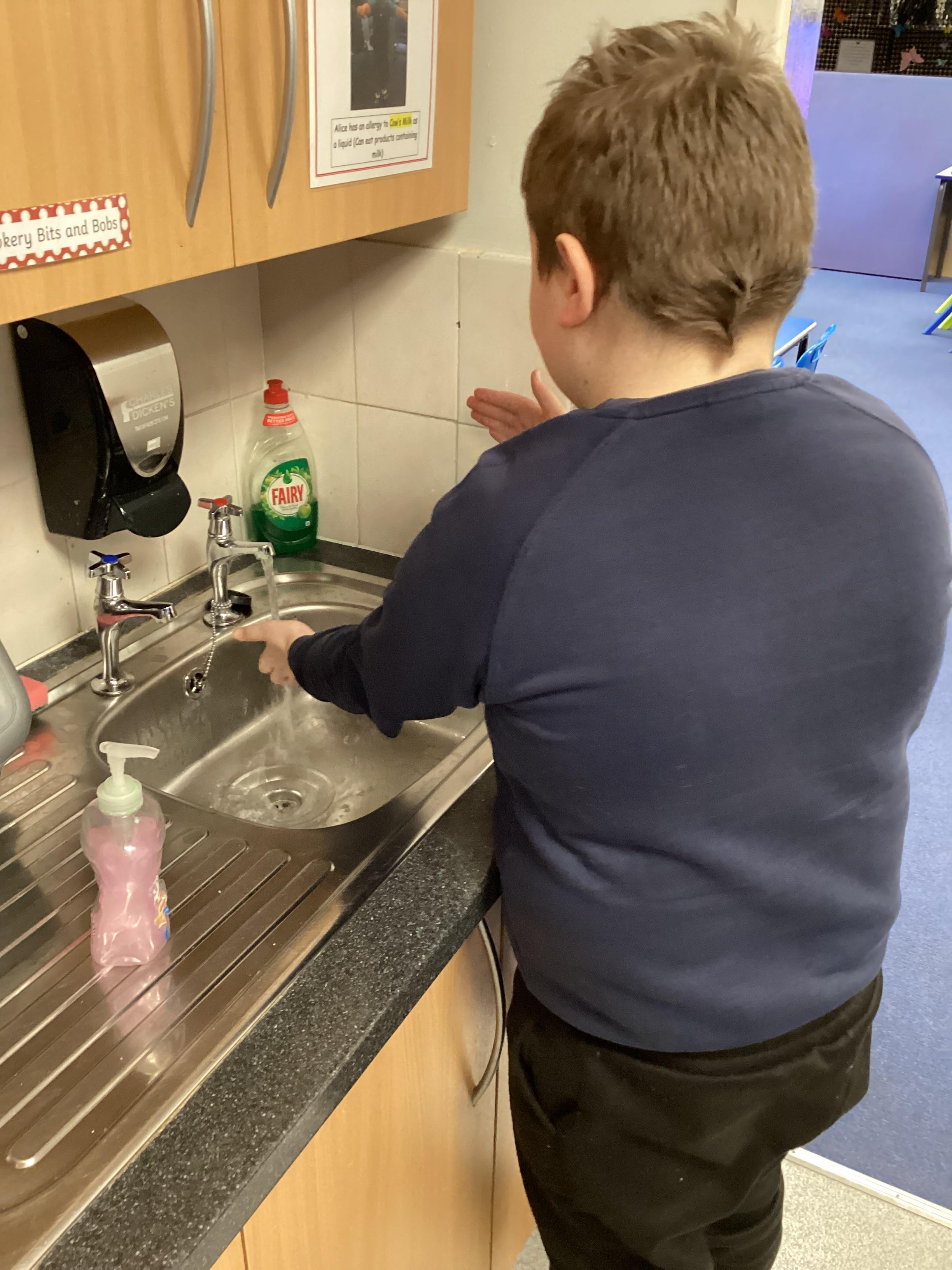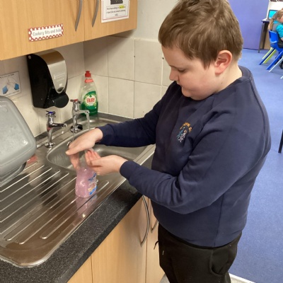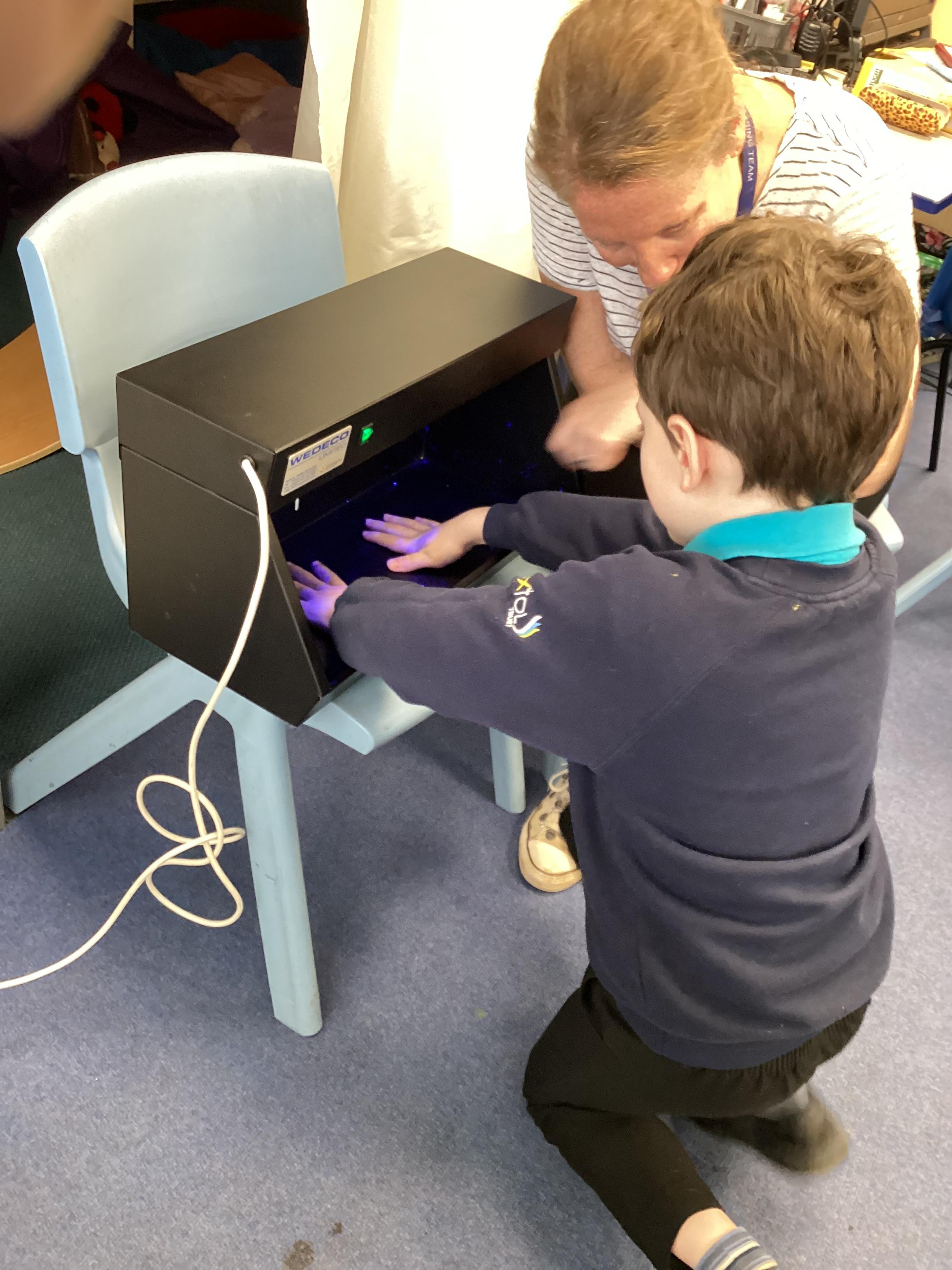 21.02.25 PHSRE: HAND WASHING The school nurses came into school today and read the children a story called: 'I Don't Want To Wash My Hands!' by Tony Ross. The children put special soap on their hands and placed them under a light box which illuminated all the germs. The children washed all their germs off their hands with soap and water. The nurses explained the importance of washing our hands regularly and when we should do so.