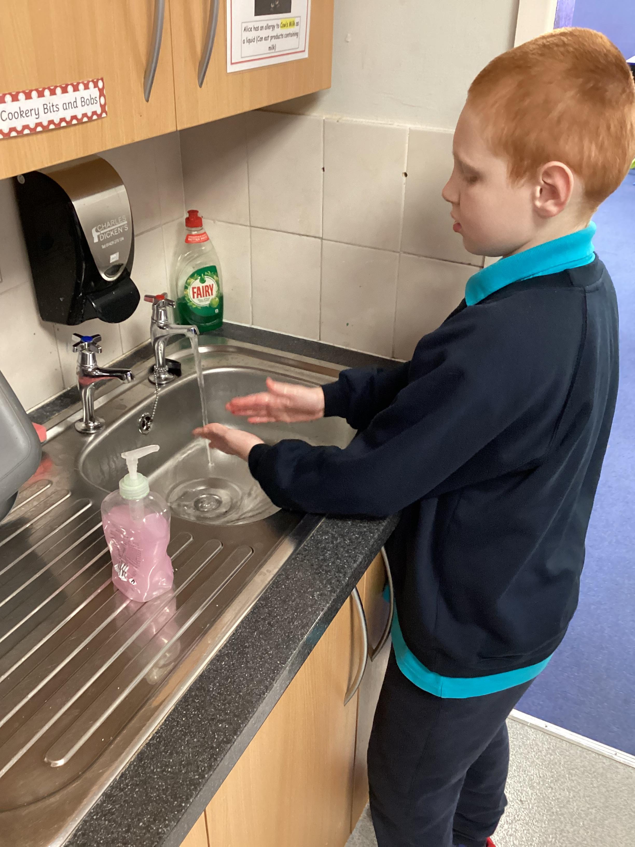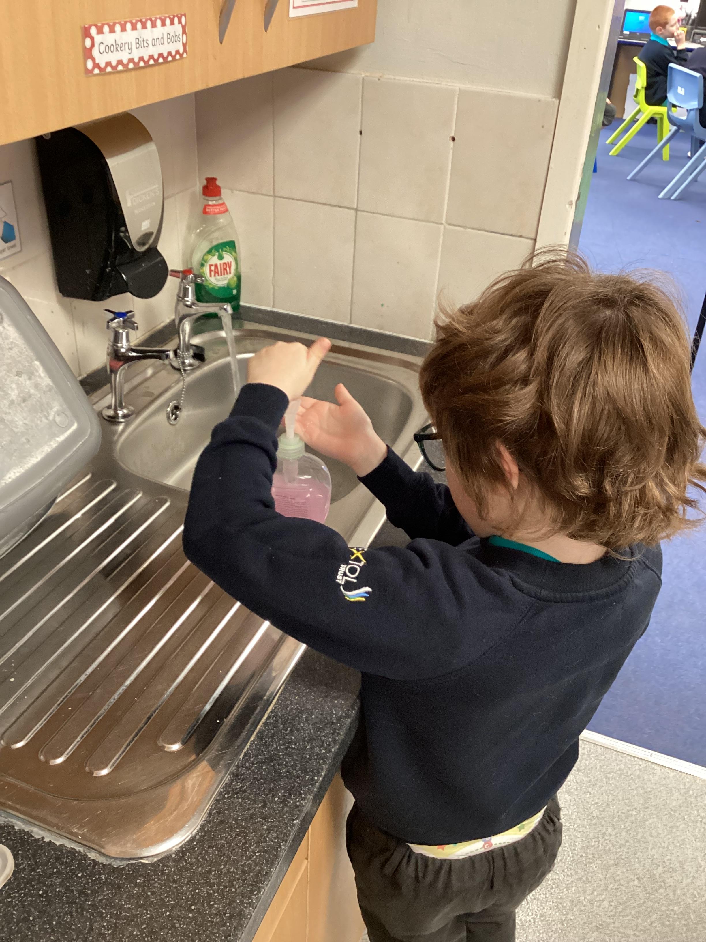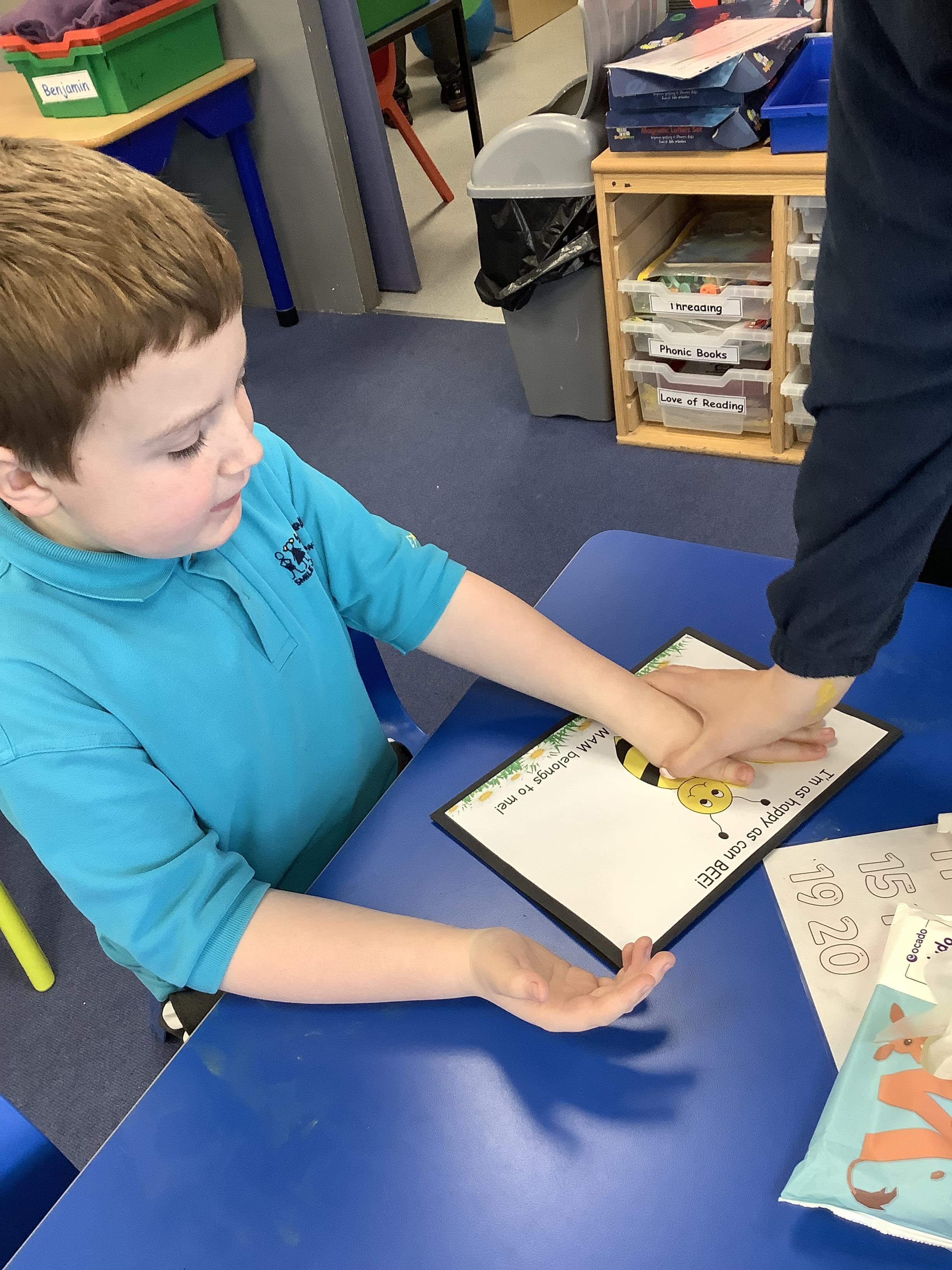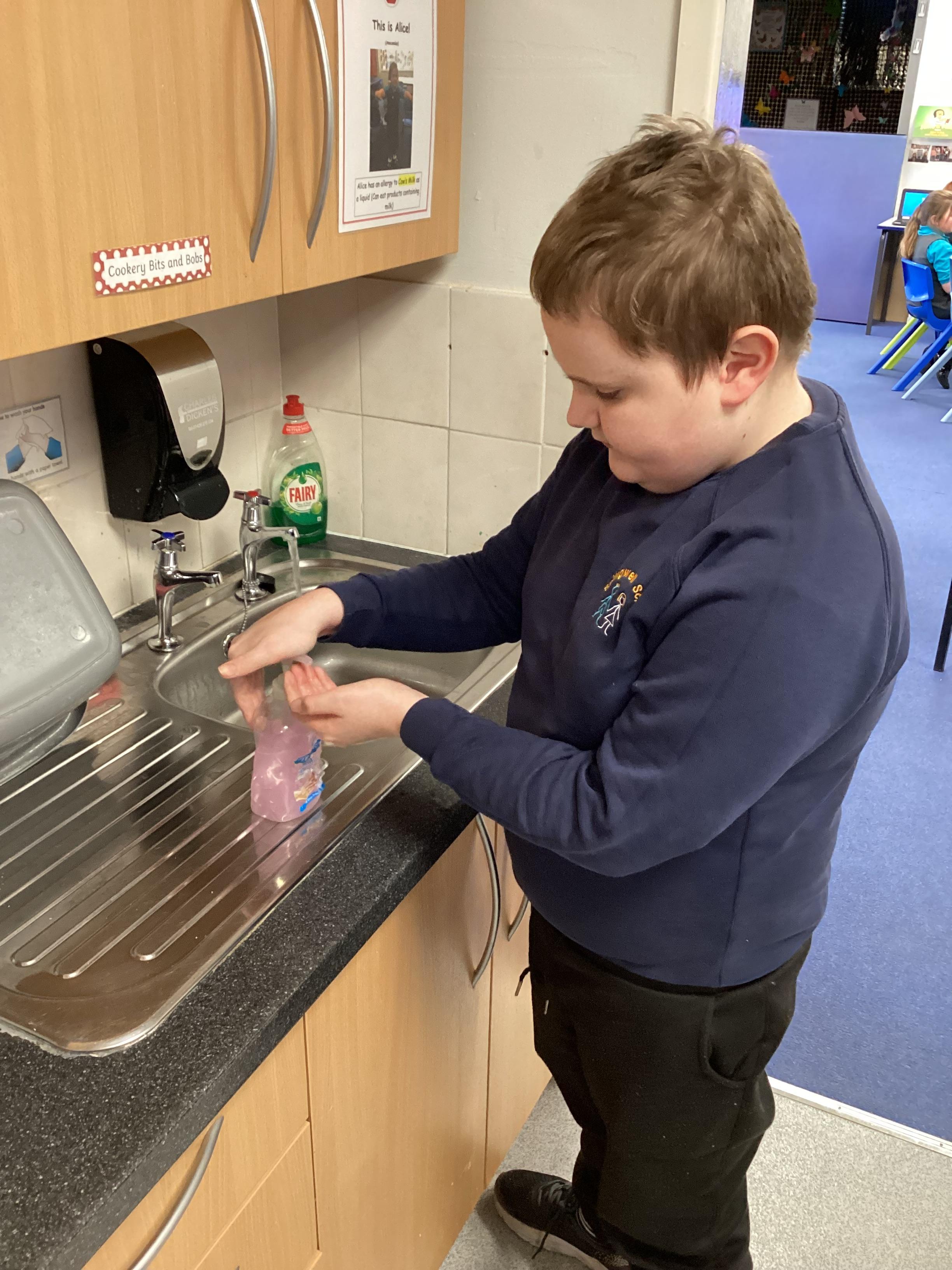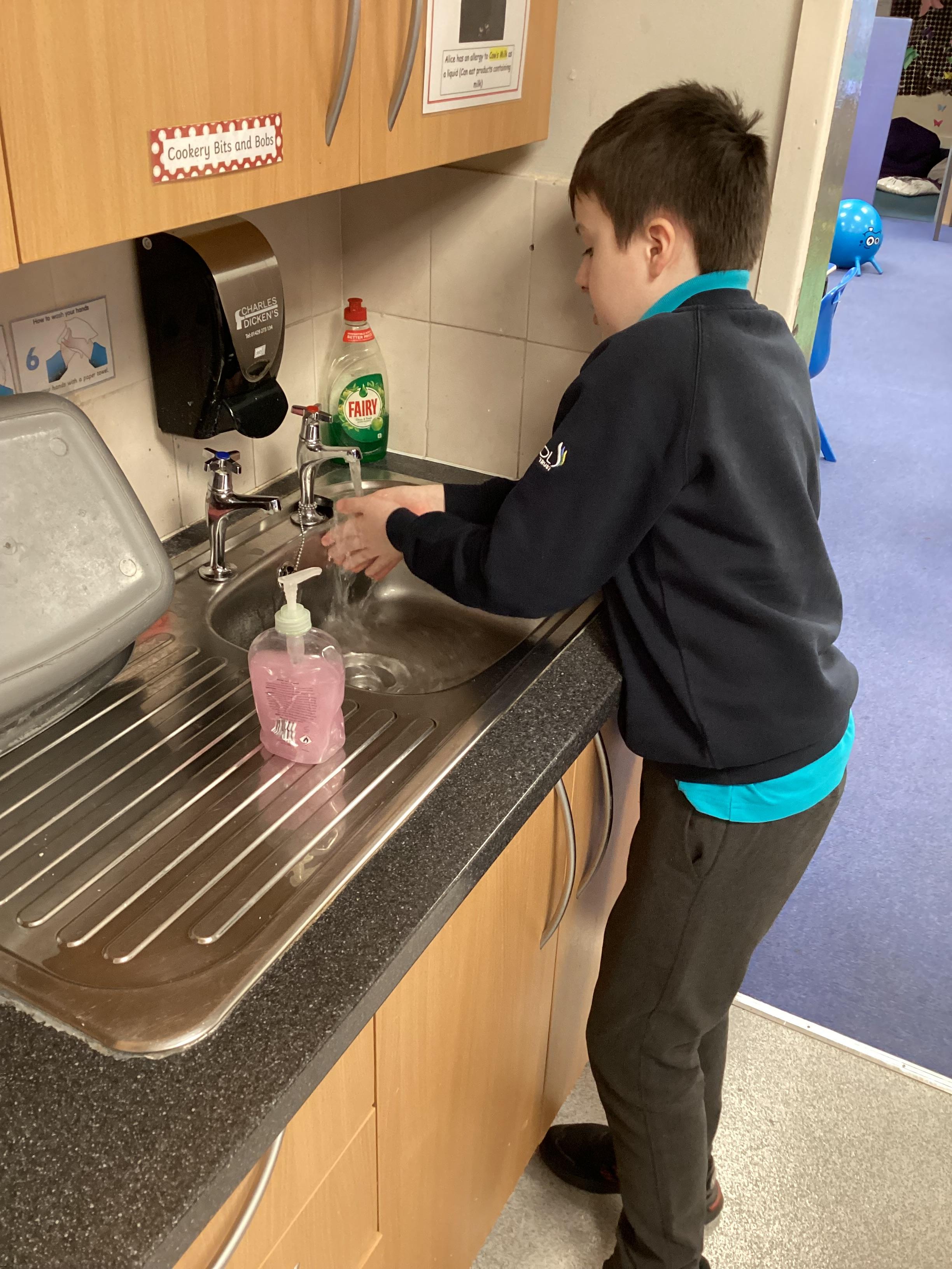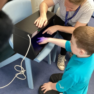 21.02.25 PHSRE: HAND WASHING The school nurses came into school today and read the children a story called: 'I Don't Want To Wash My Hands!' by Tony Ross. The children put special soap on their hands and placed them under a light box which illuminated all the germs. The children washed all their germs off their hands with soap and water. The nurses explained the importance of washing our hands regularly and when we should do so.