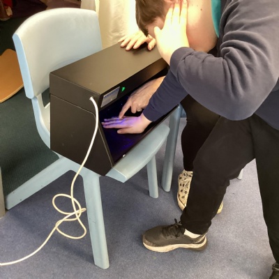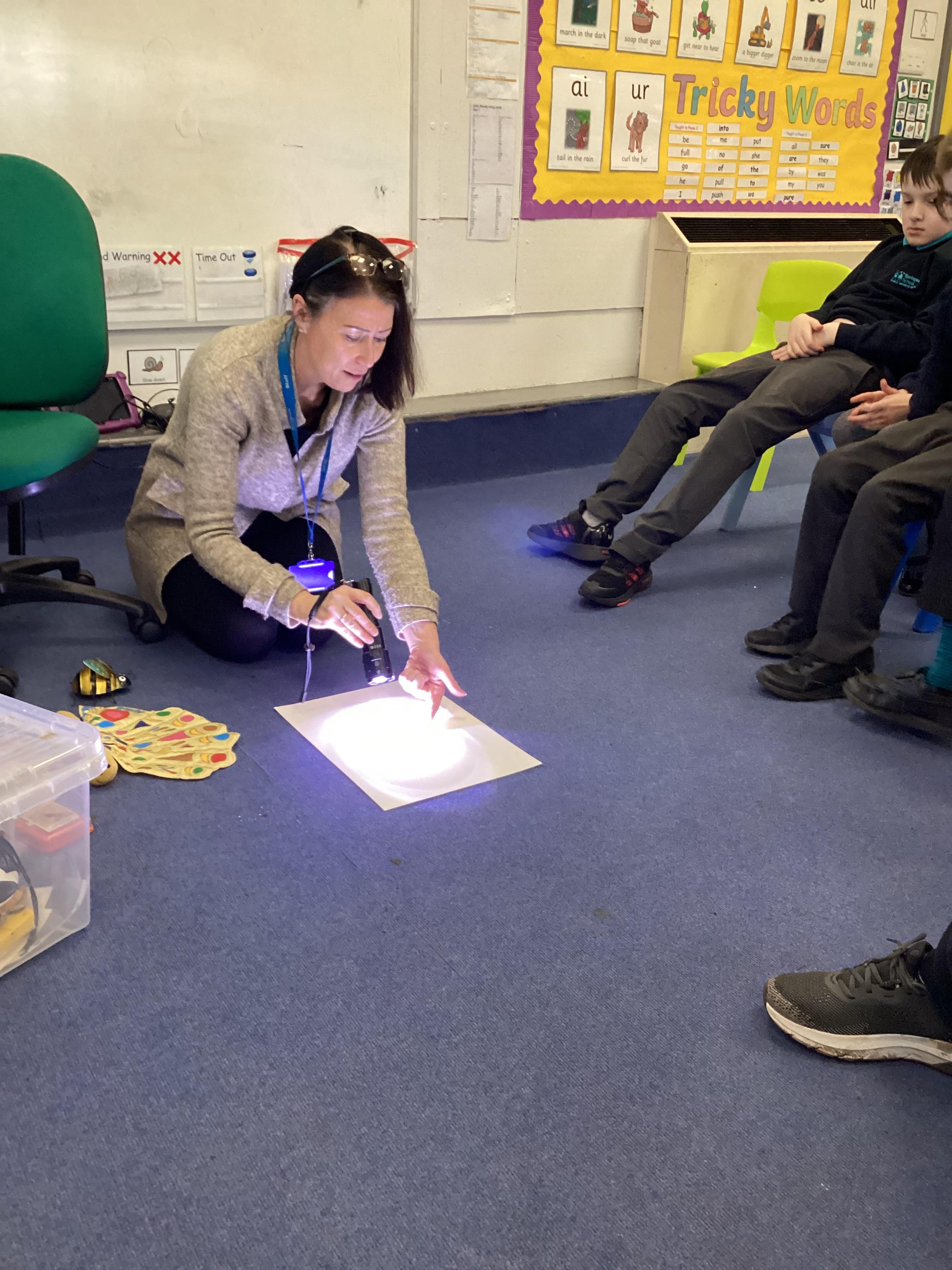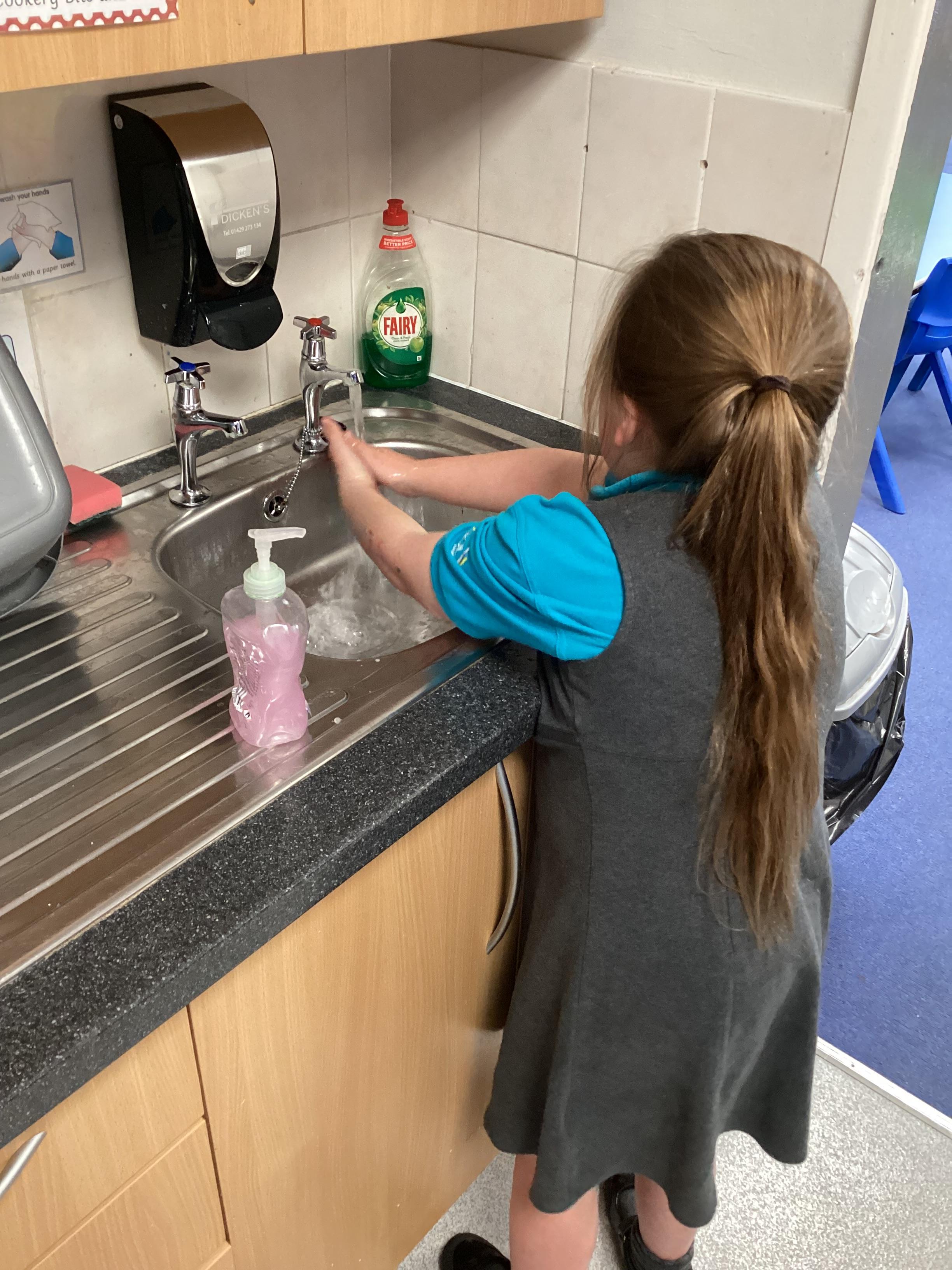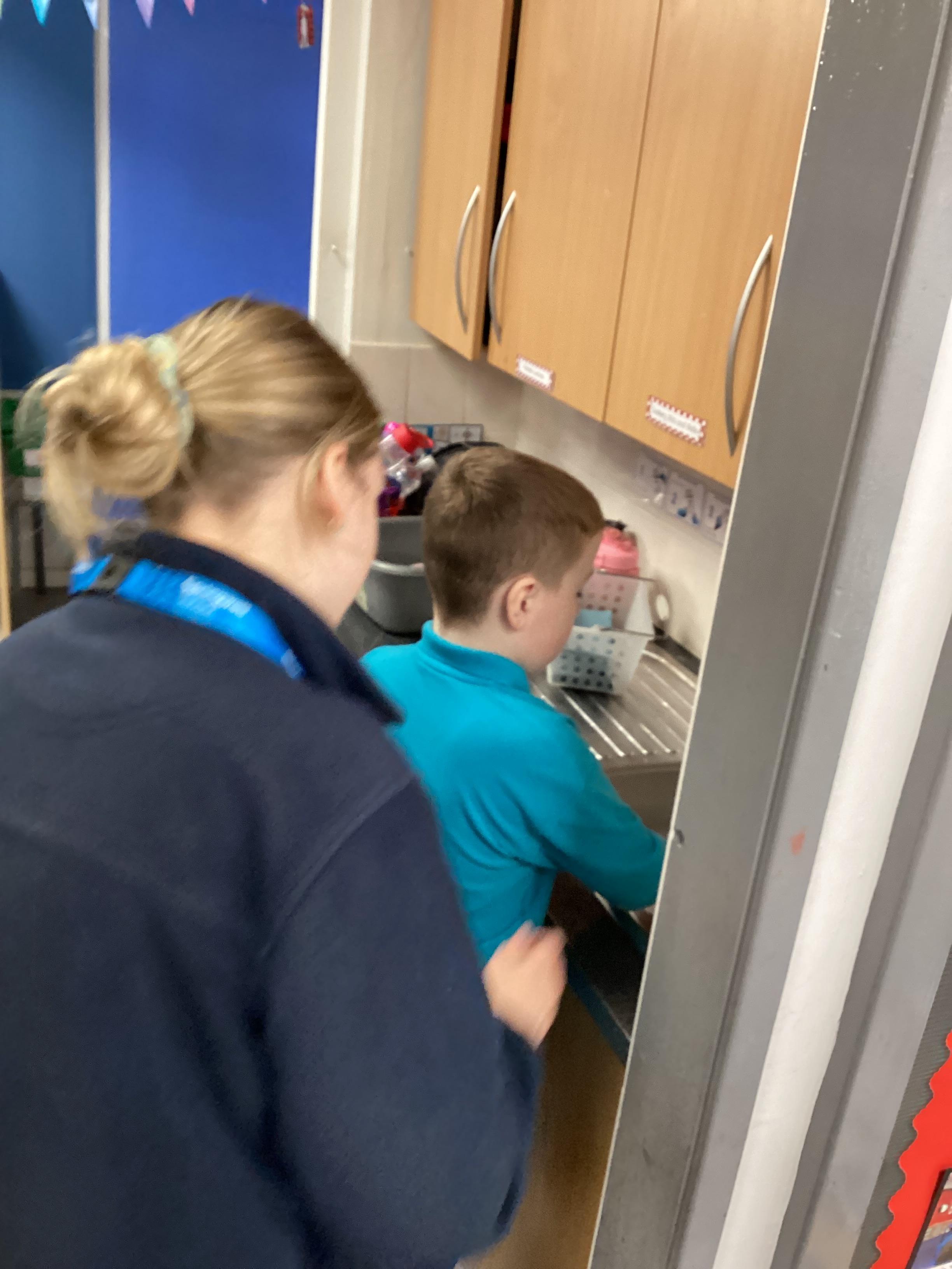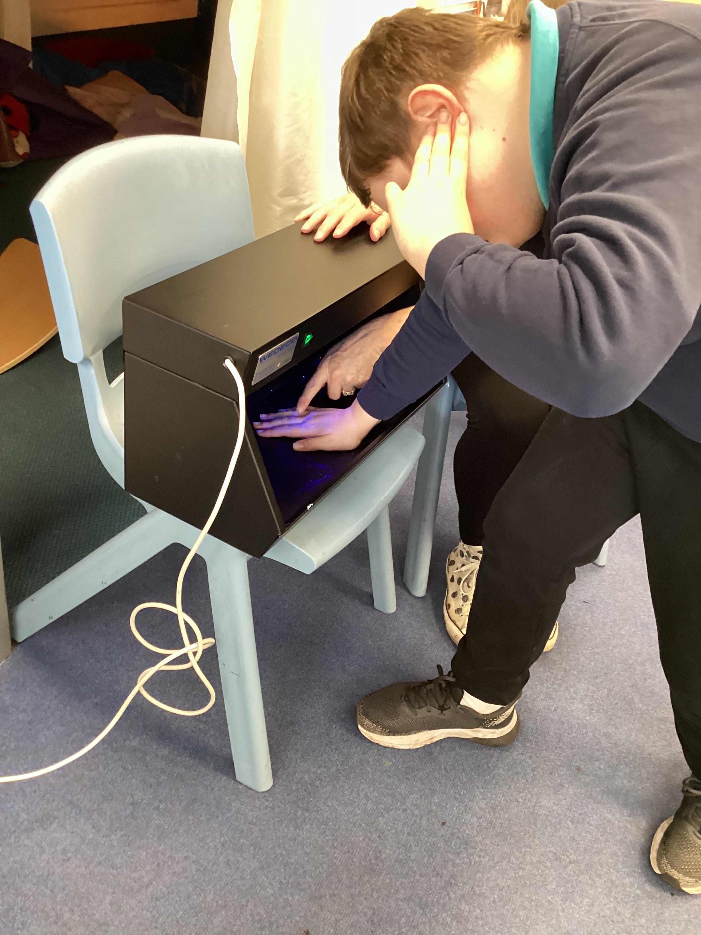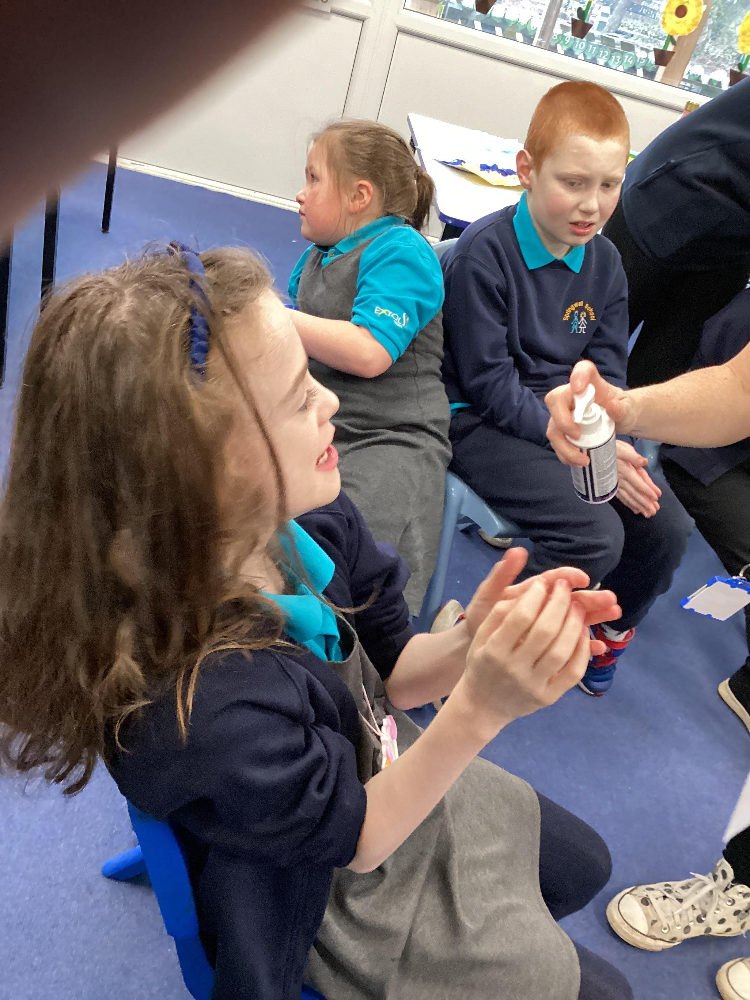 21.02.25 PHSRE: HAND WASHING The school nurses came into school today and read the children a story called: 'I Don't Want To Wash My Hands!' by Tony Ross. The children put special soap on their hands and placed them under a light box which illuminated all the germs. The children washed all their germs off their hands with soap and water. The nurses explained the importance of washing our hands regularly and when we should do so.