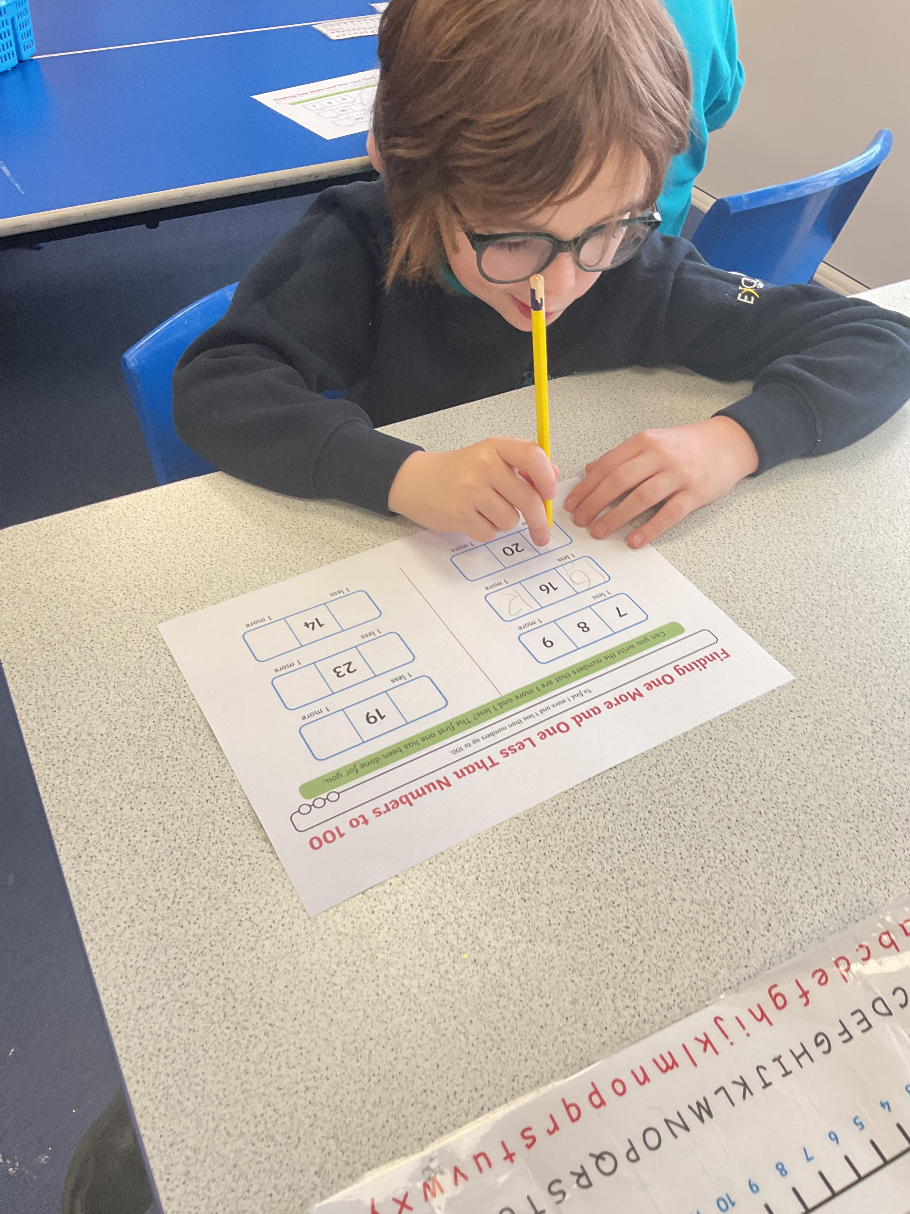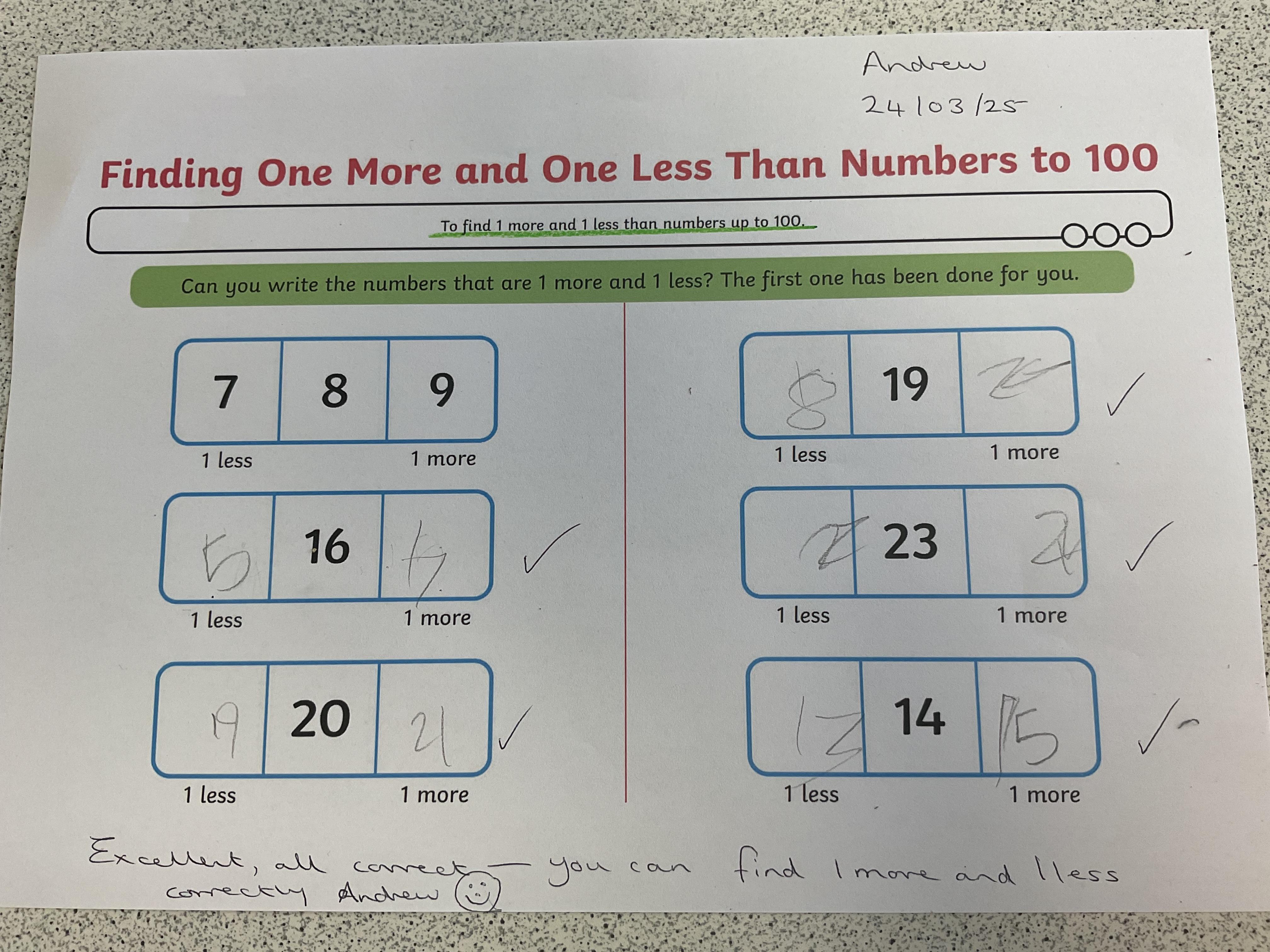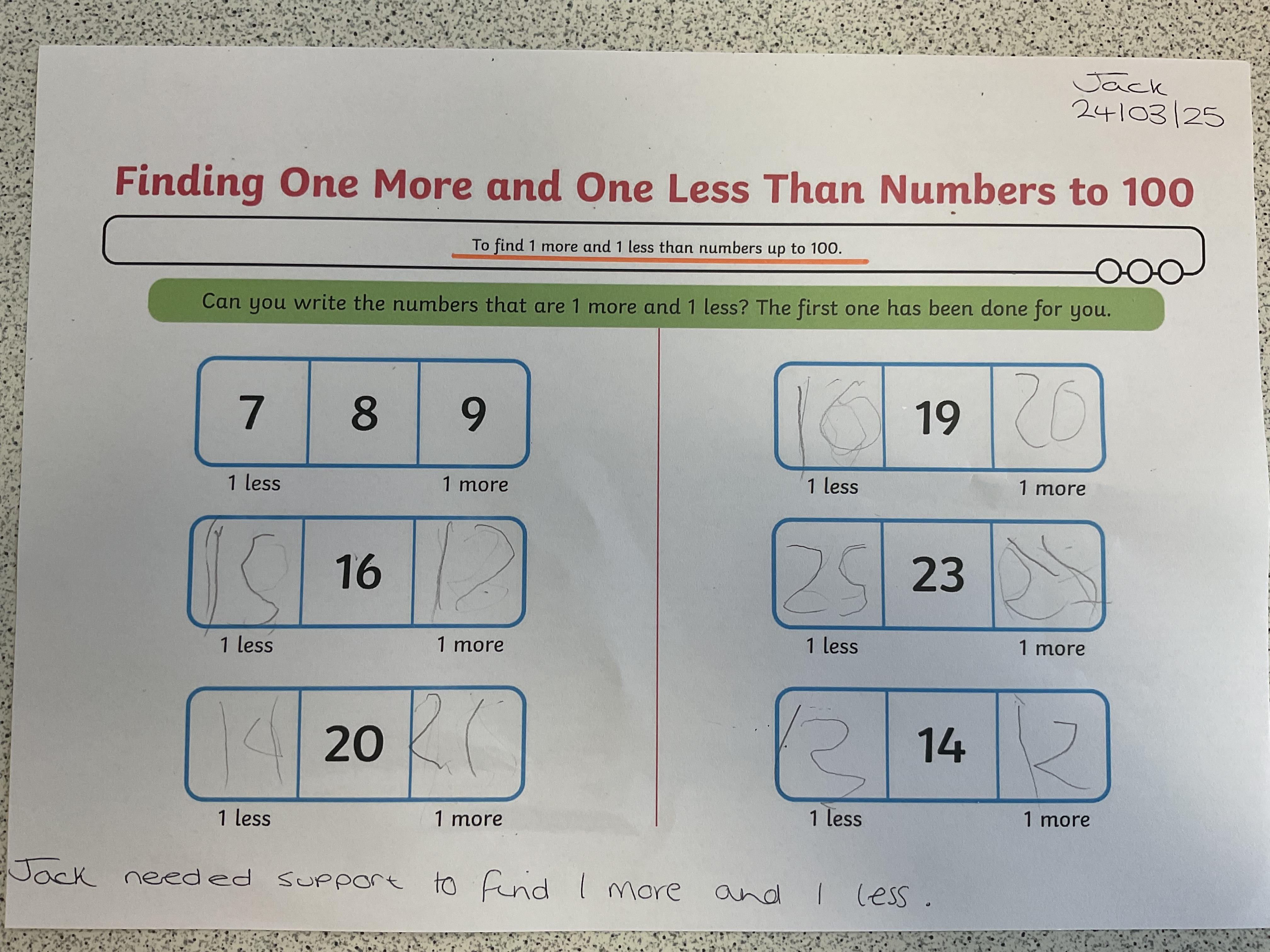 24.03.25 MATHS: In maths, Anaconda Class have been learning about adding one more from a given number, take one away from a given number.