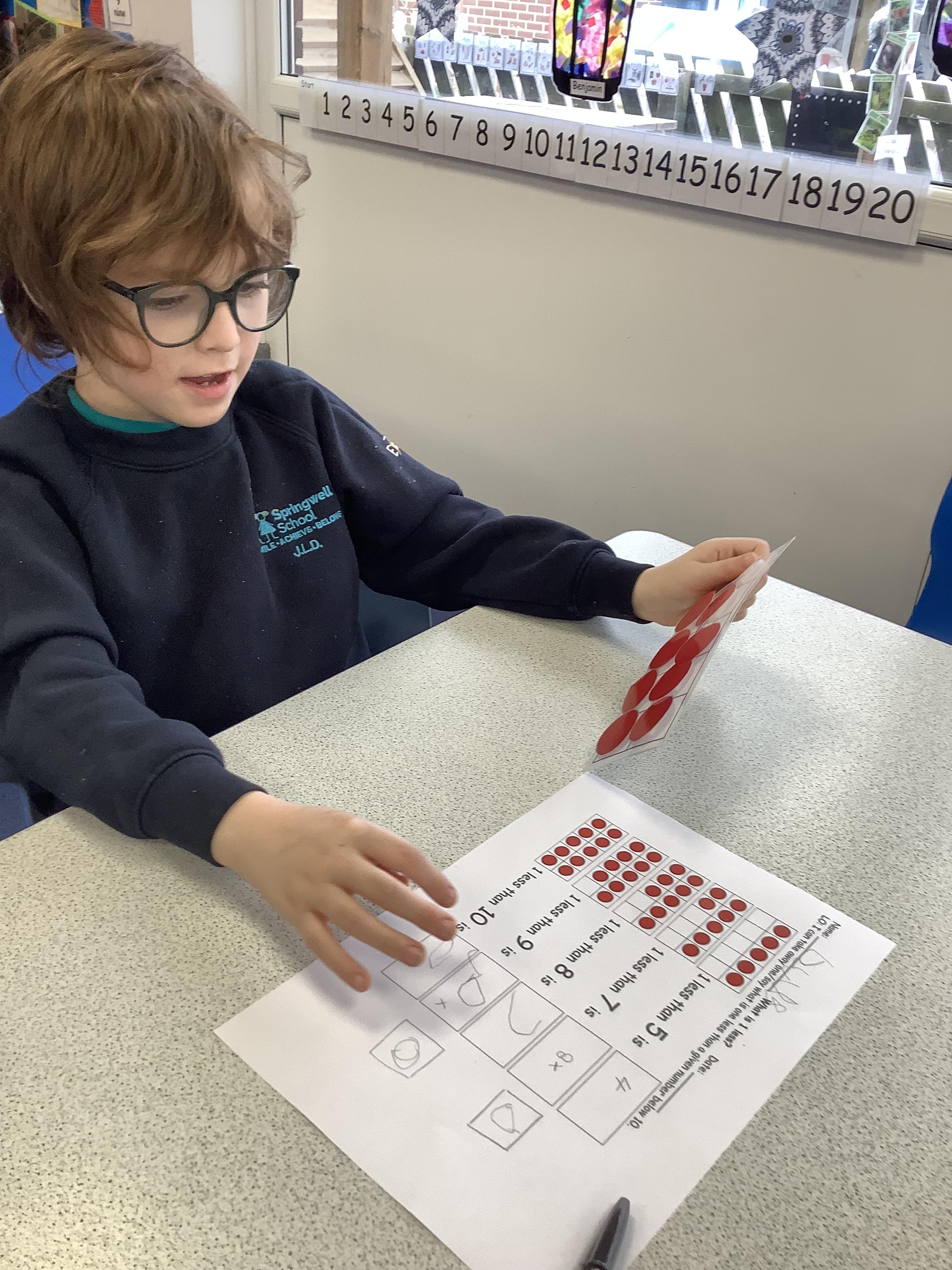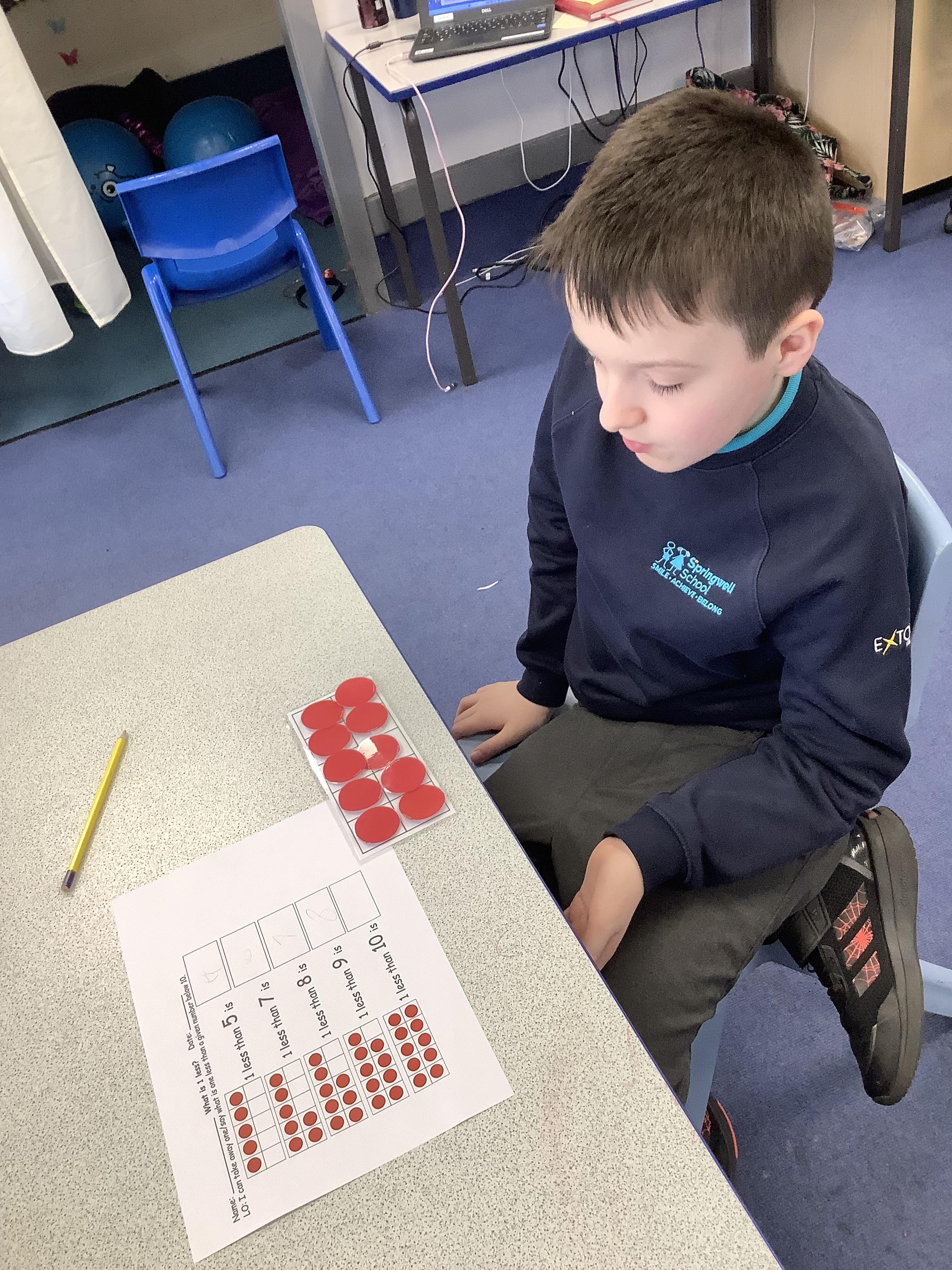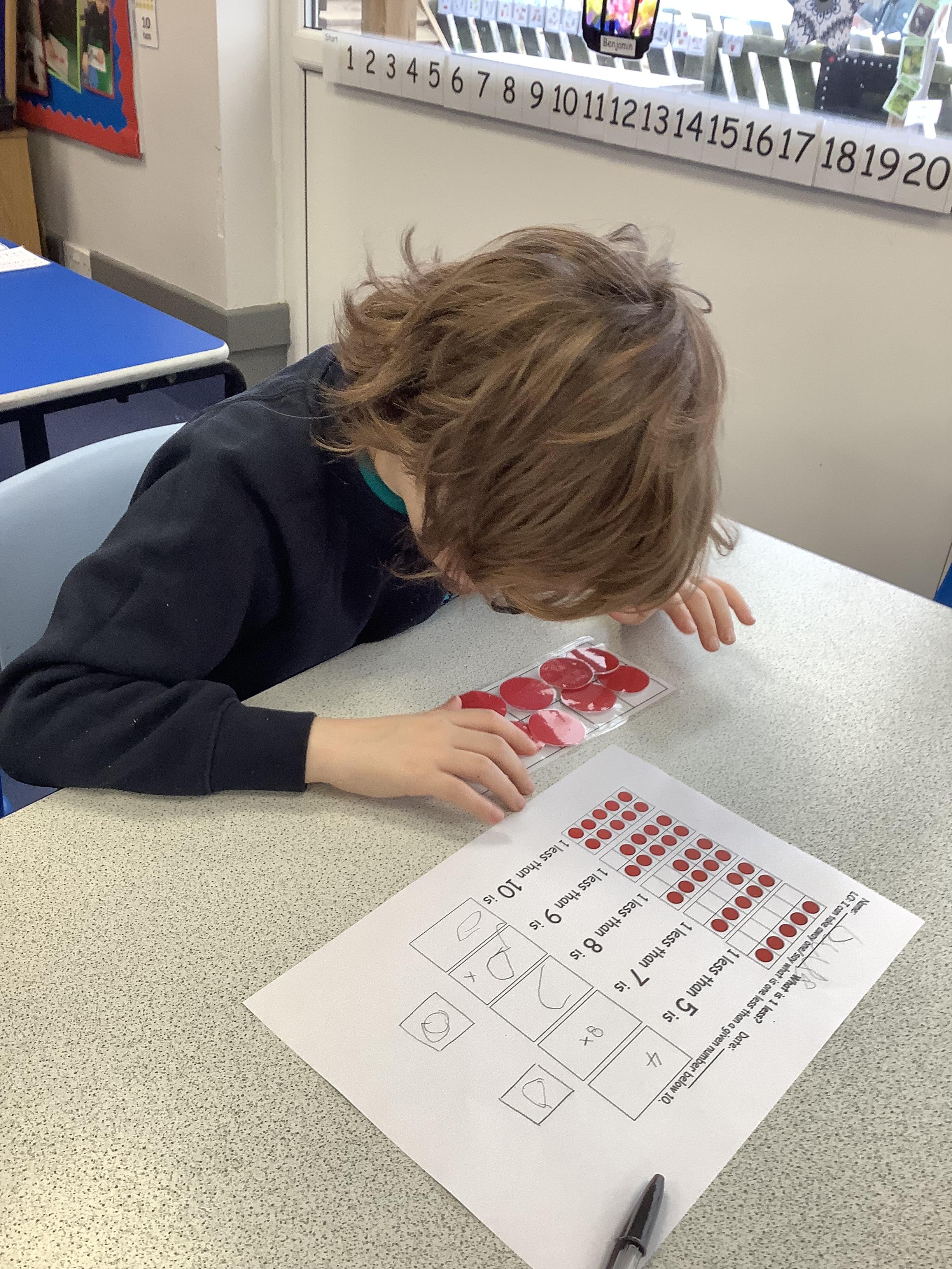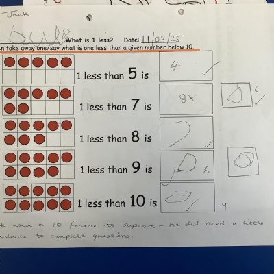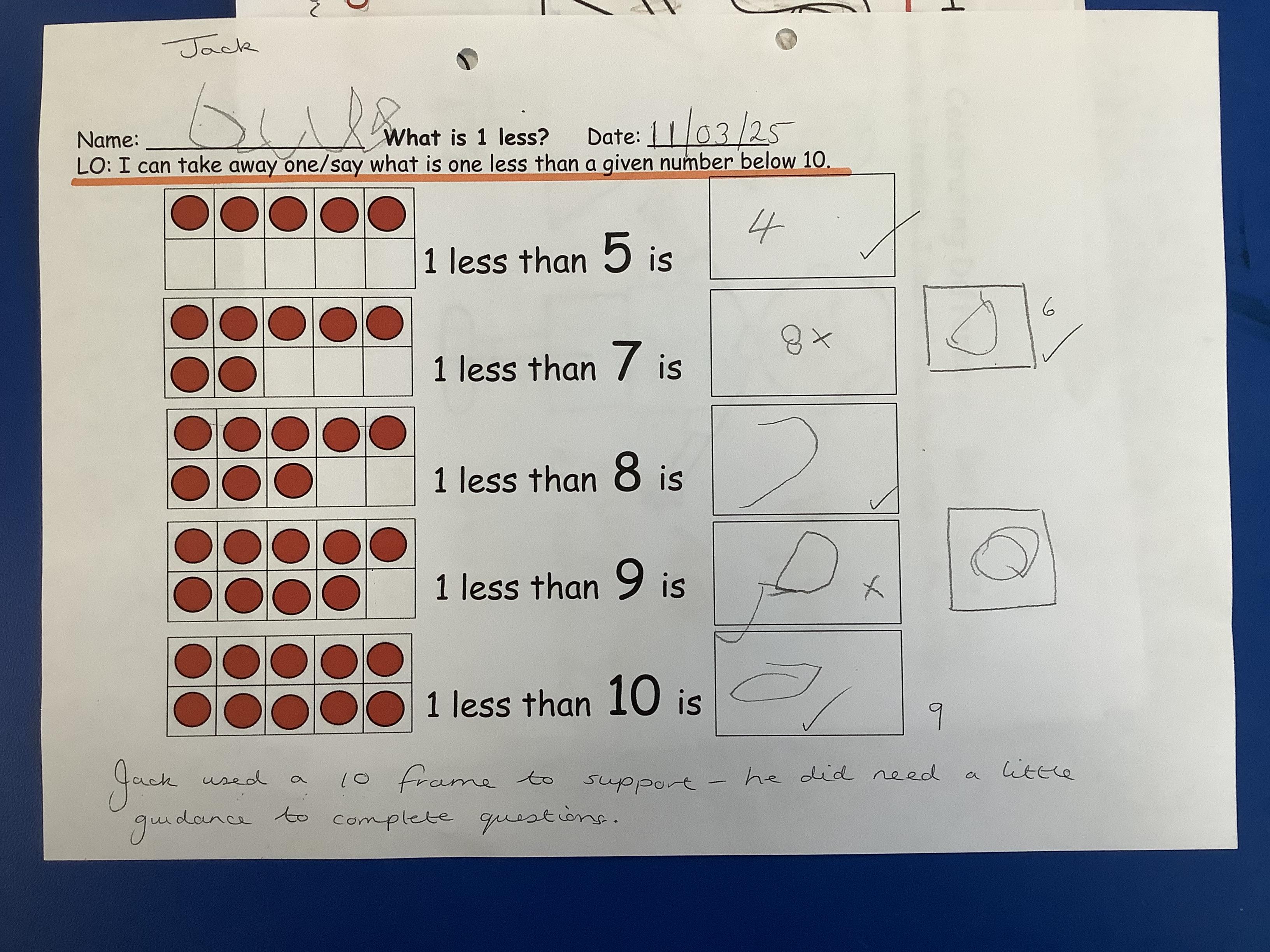 13.03.25 MATHS: The children have been using a five or ten frame to support them to take away one or say what is one less than a given number.
