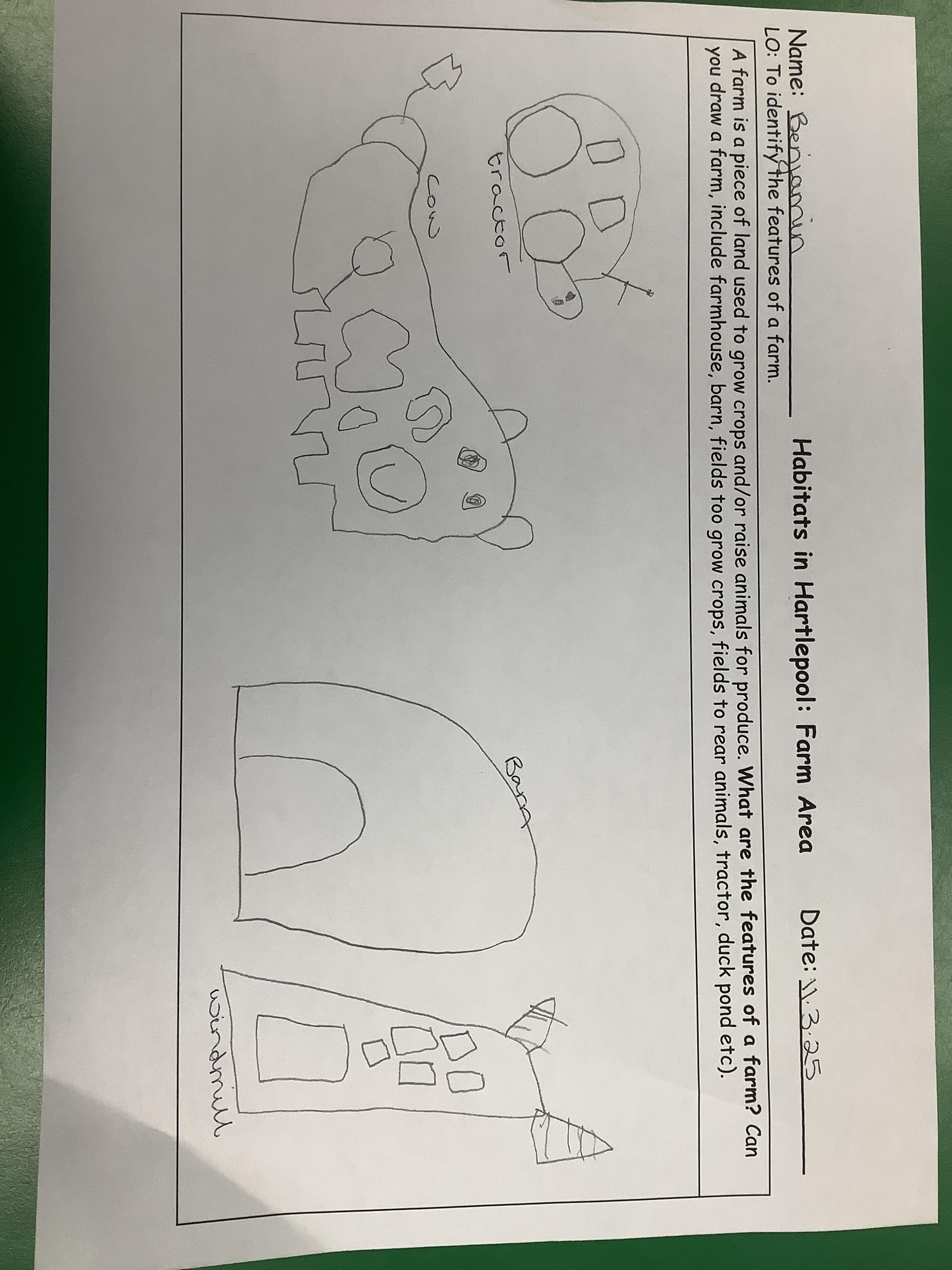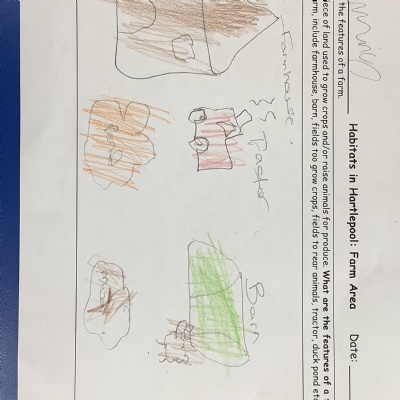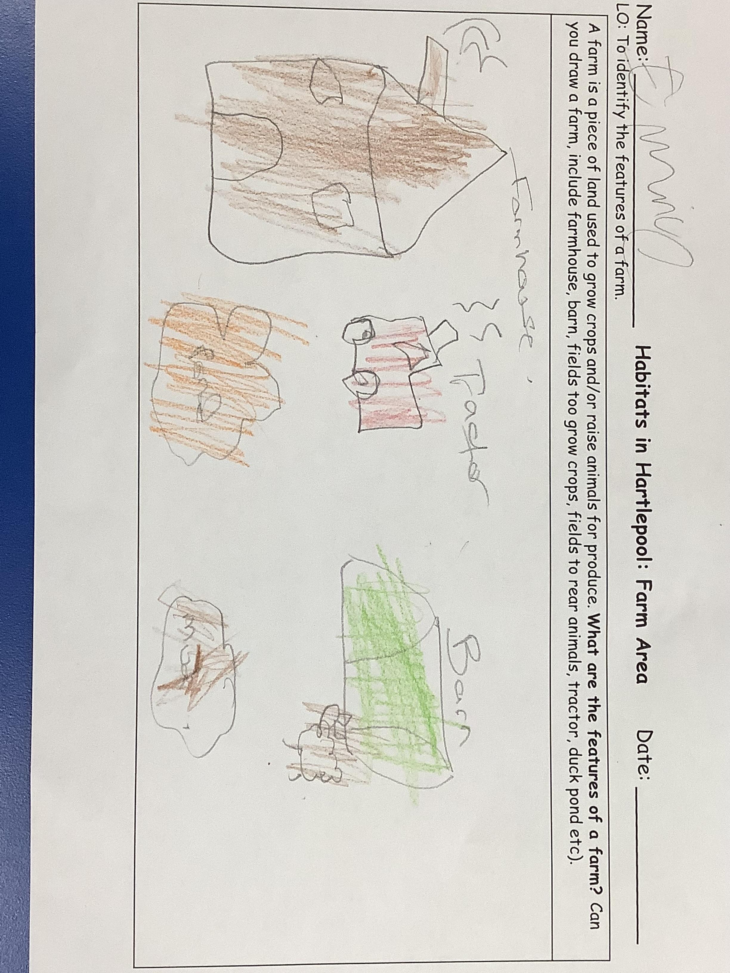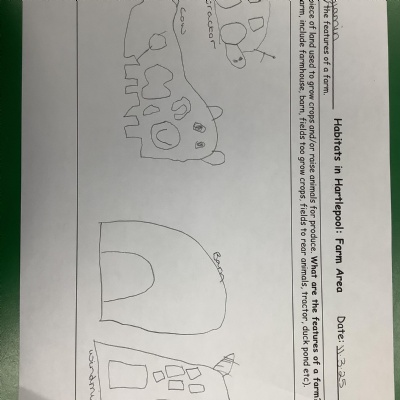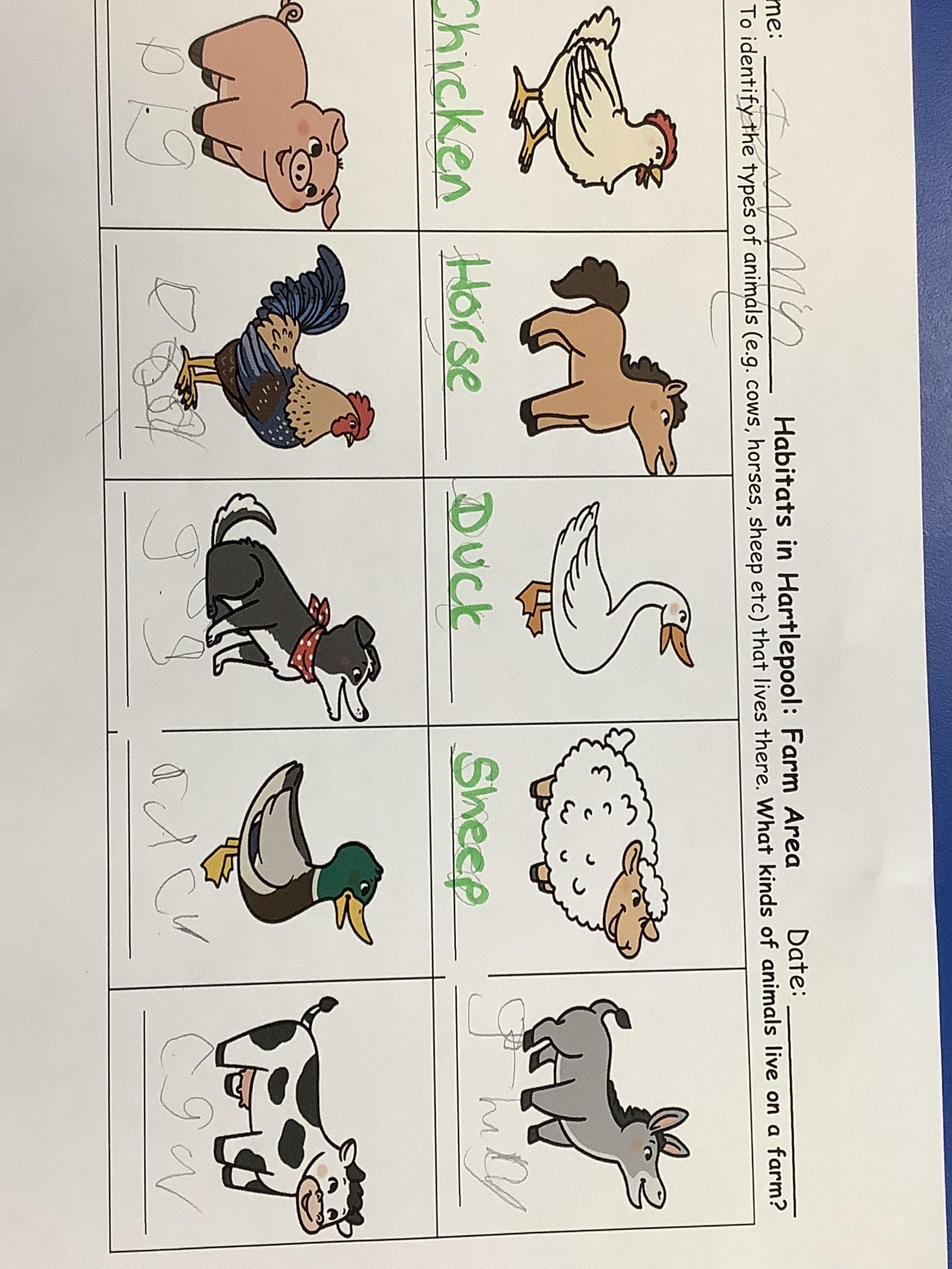 17.03.25 SCIENCE We have been looking closely at a farm and identifying what types of animals live here. We have been identifying all the different features in the farm environment and drawing symbolic representations of them including a farm house, duck pond, fields, a barn, muddy area for the pigs etc. We have been listening to the sounds each of the farm animals make, identifying them and mimicking them.