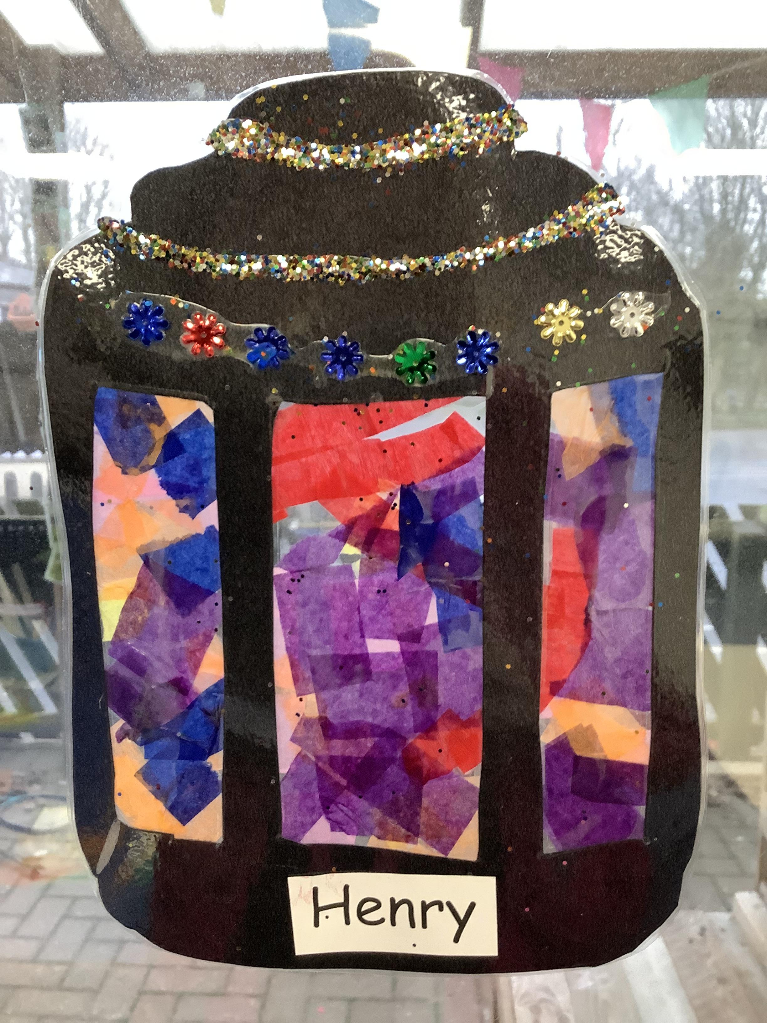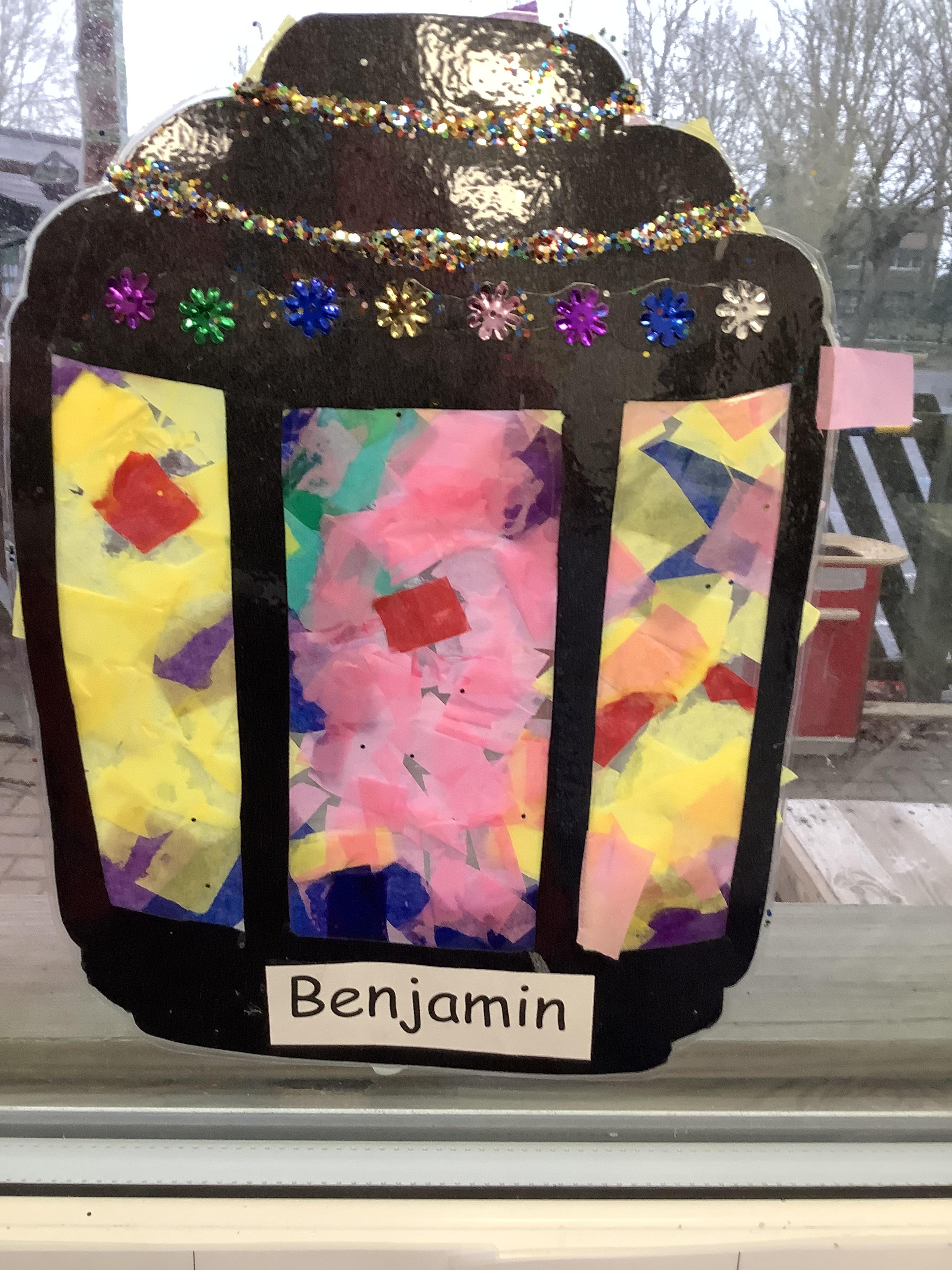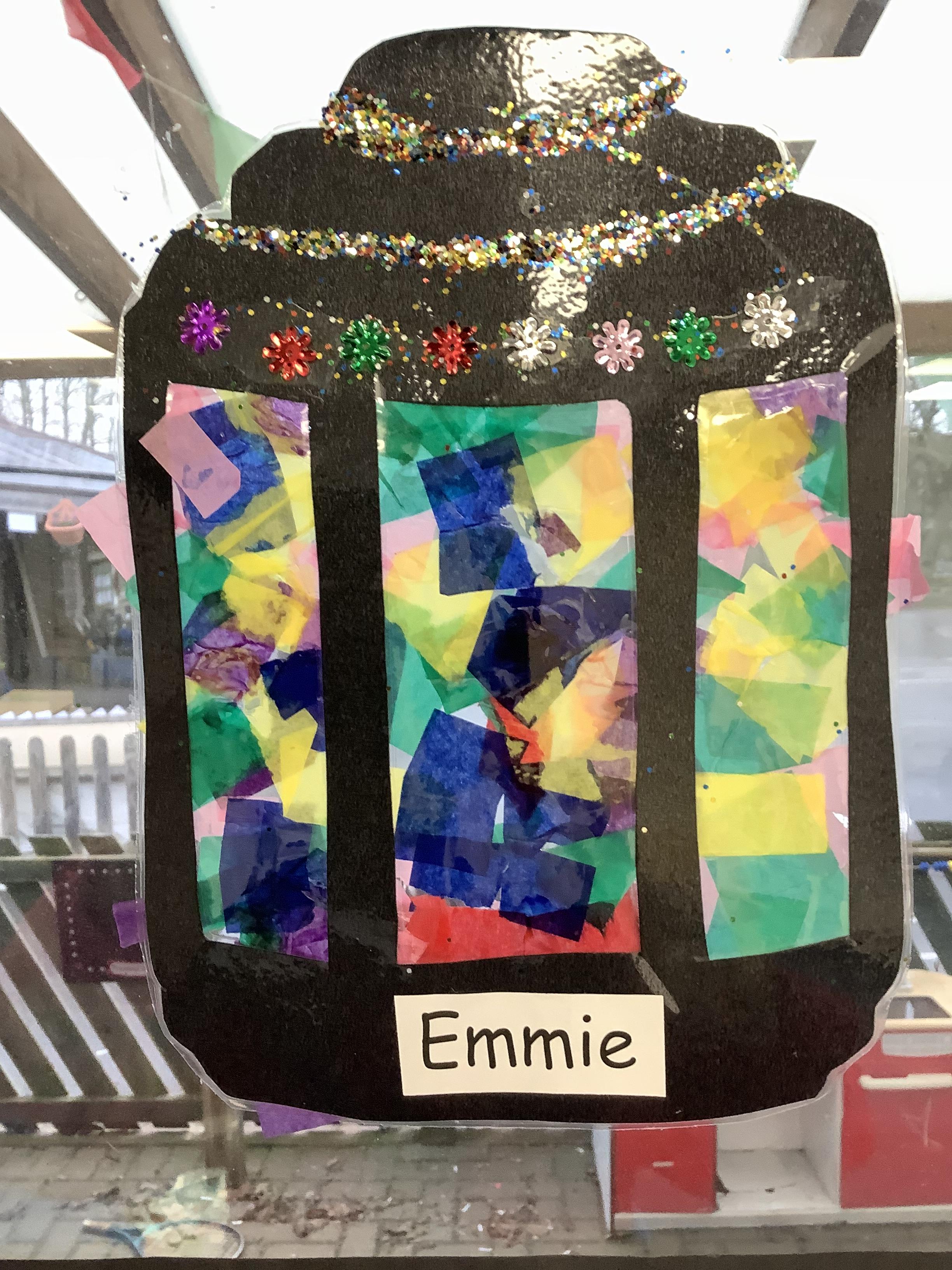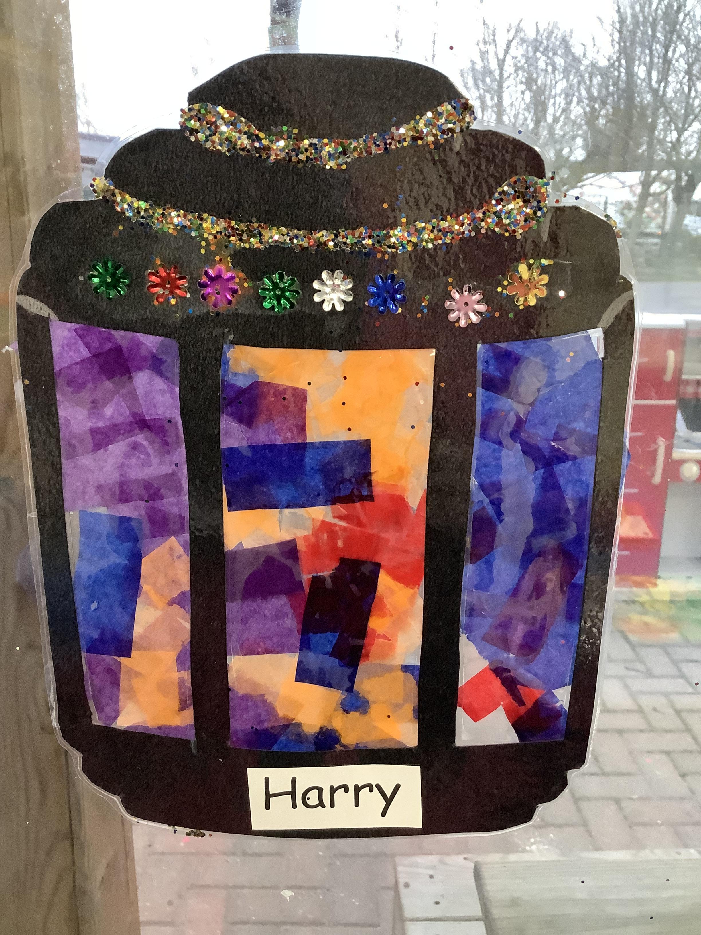 04.03.25 RE: RAMADAN The children enjoyed making their own Ramadan, sun catcher lanterns using different coloured tissue paper. To make them extra decorative, the children sprinkled them with glitter and added jewels.