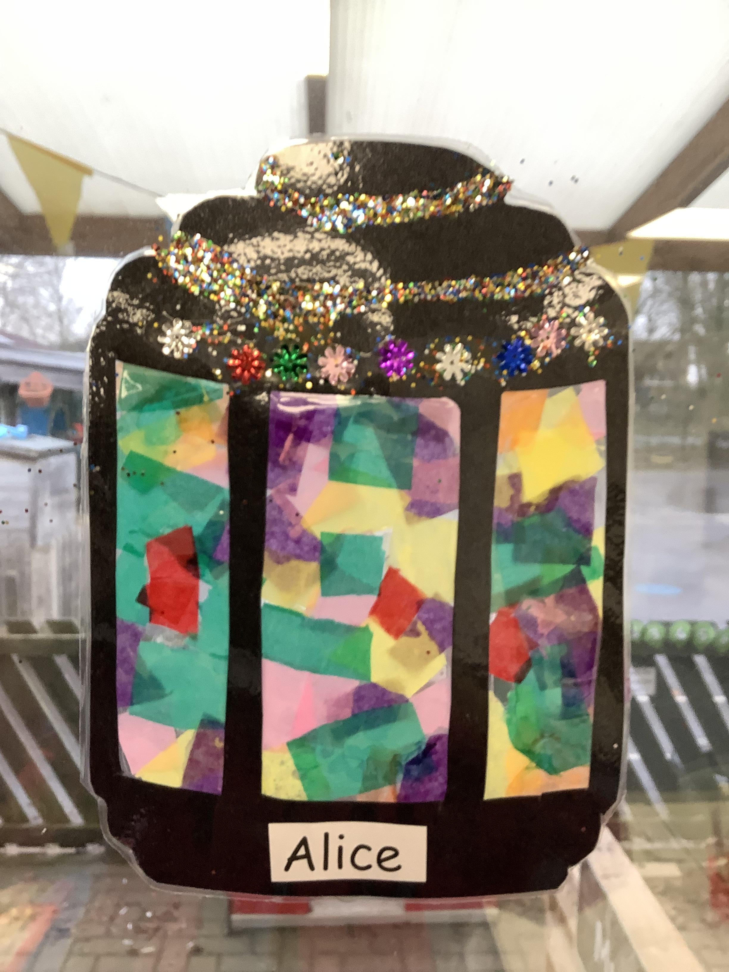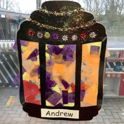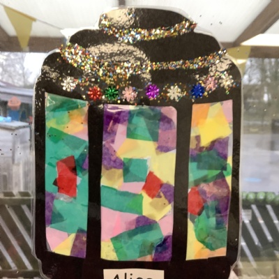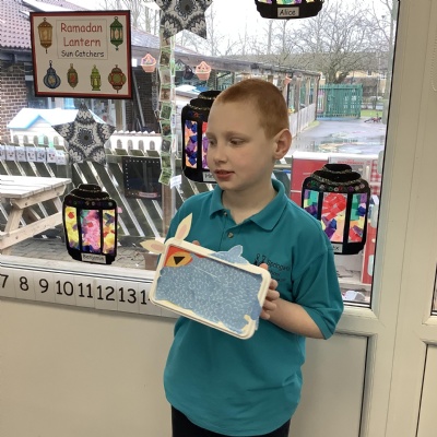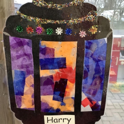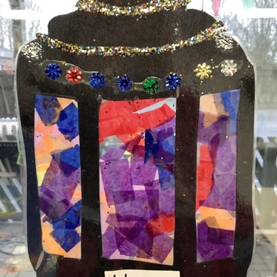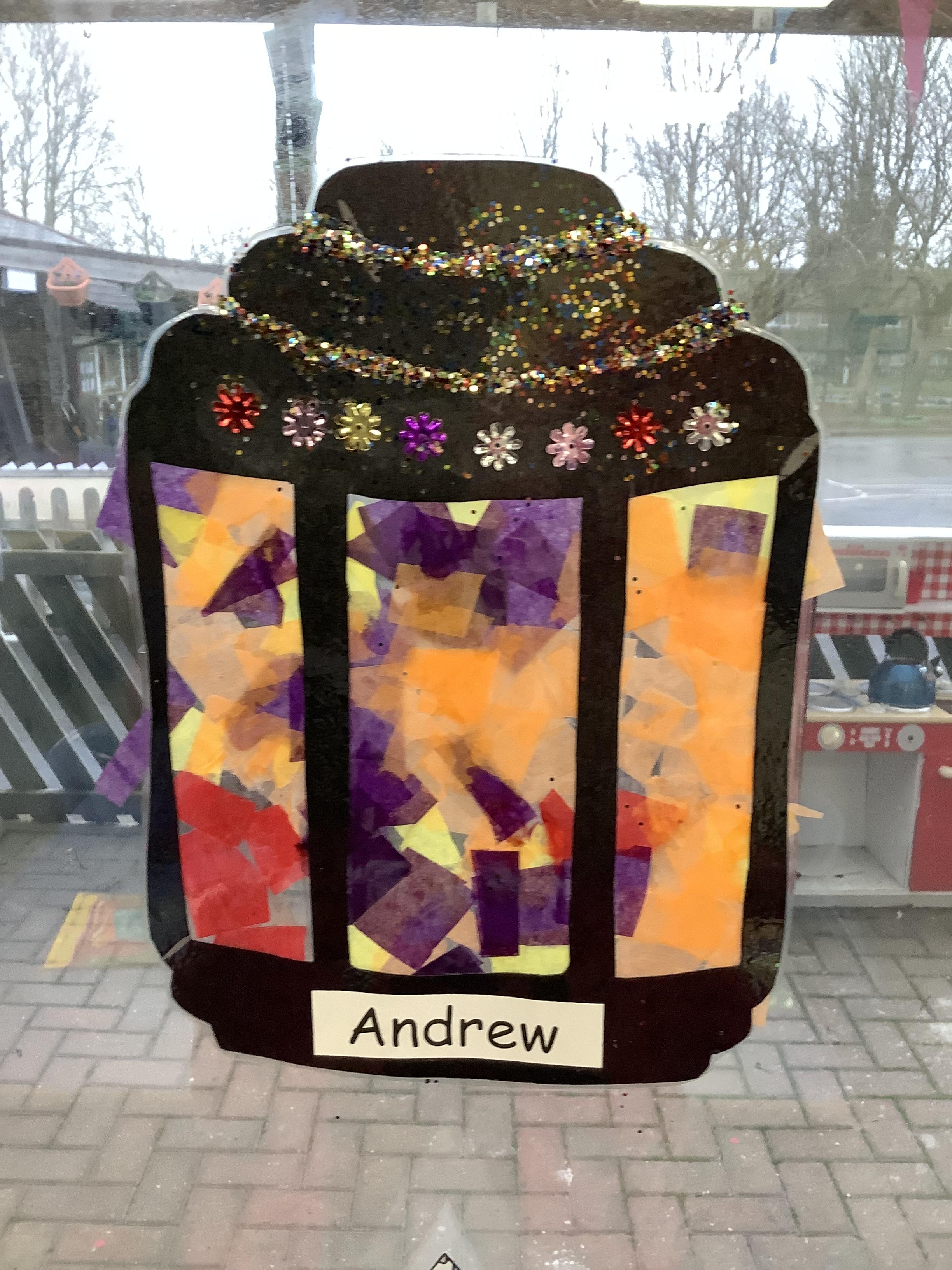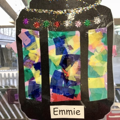 04.03.25 RE: RAMADAN The children enjoyed making their own Ramadan, sun catcher lanterns using different coloured tissue paper. To make them extra decorative, the children sprinkled them with glitter and added jewels.