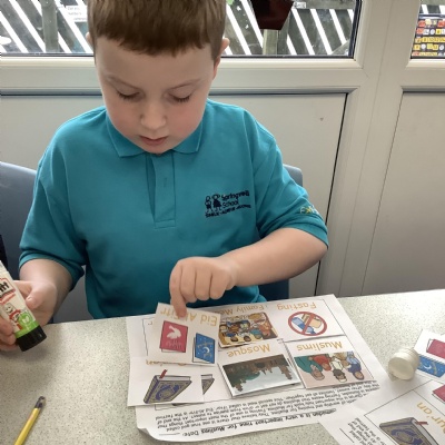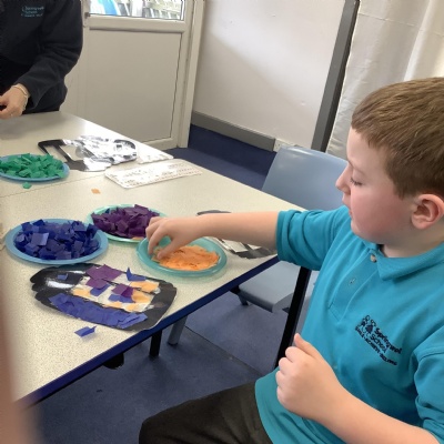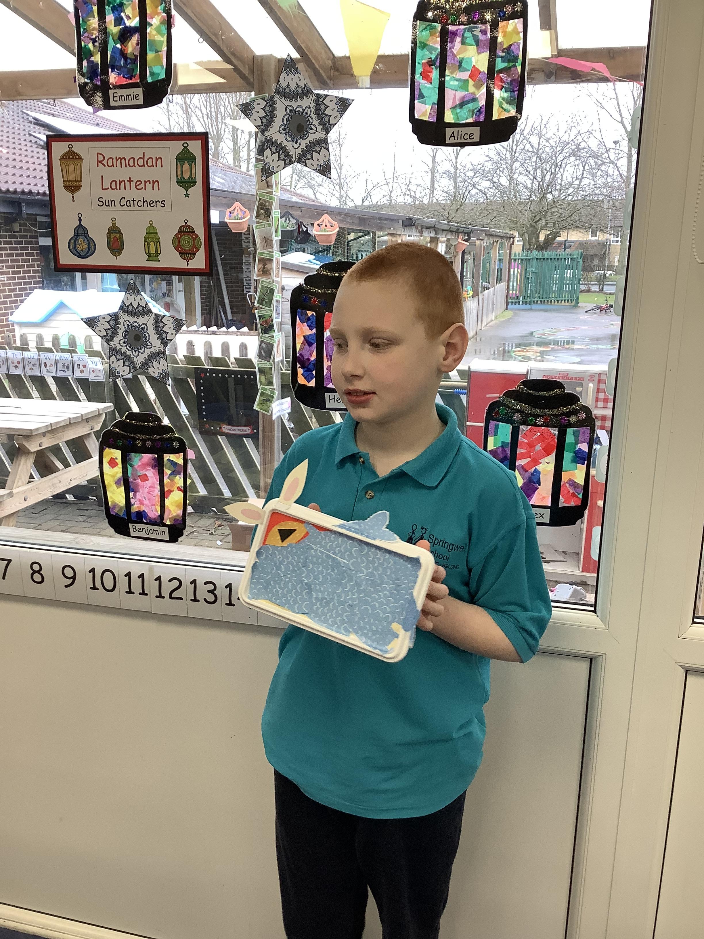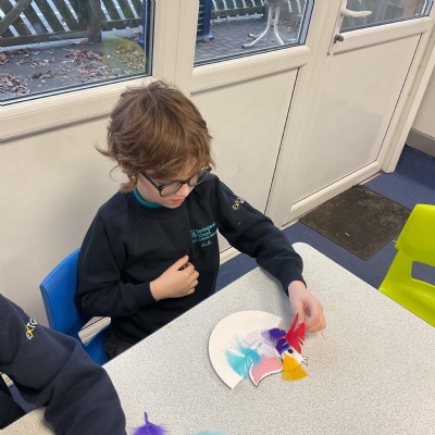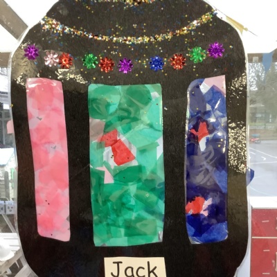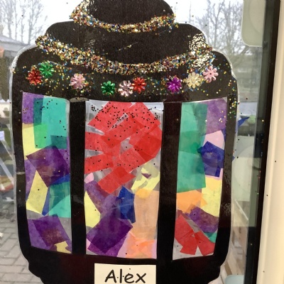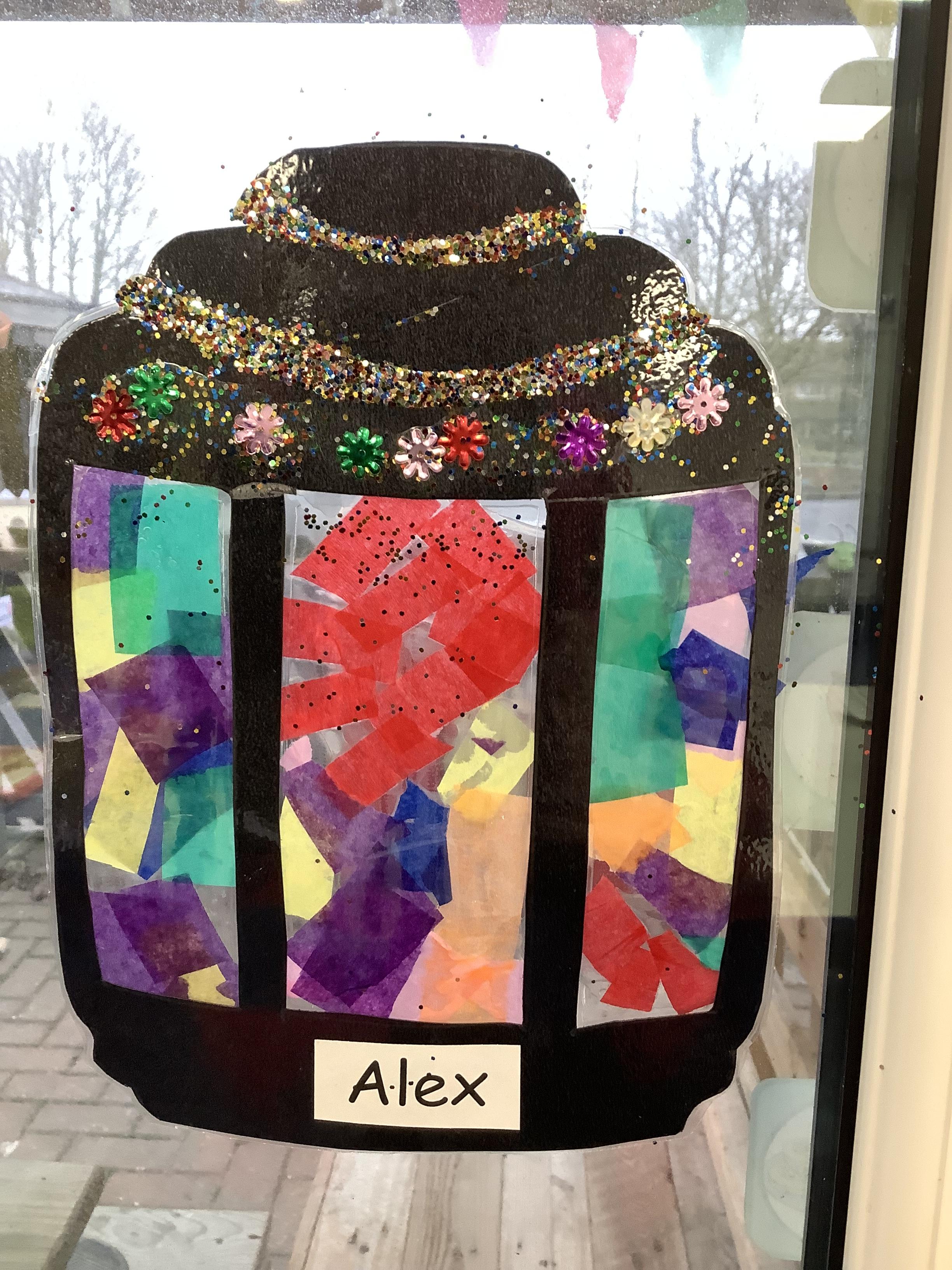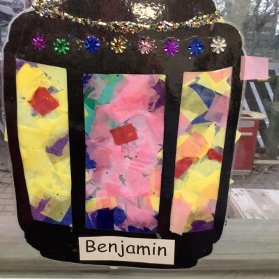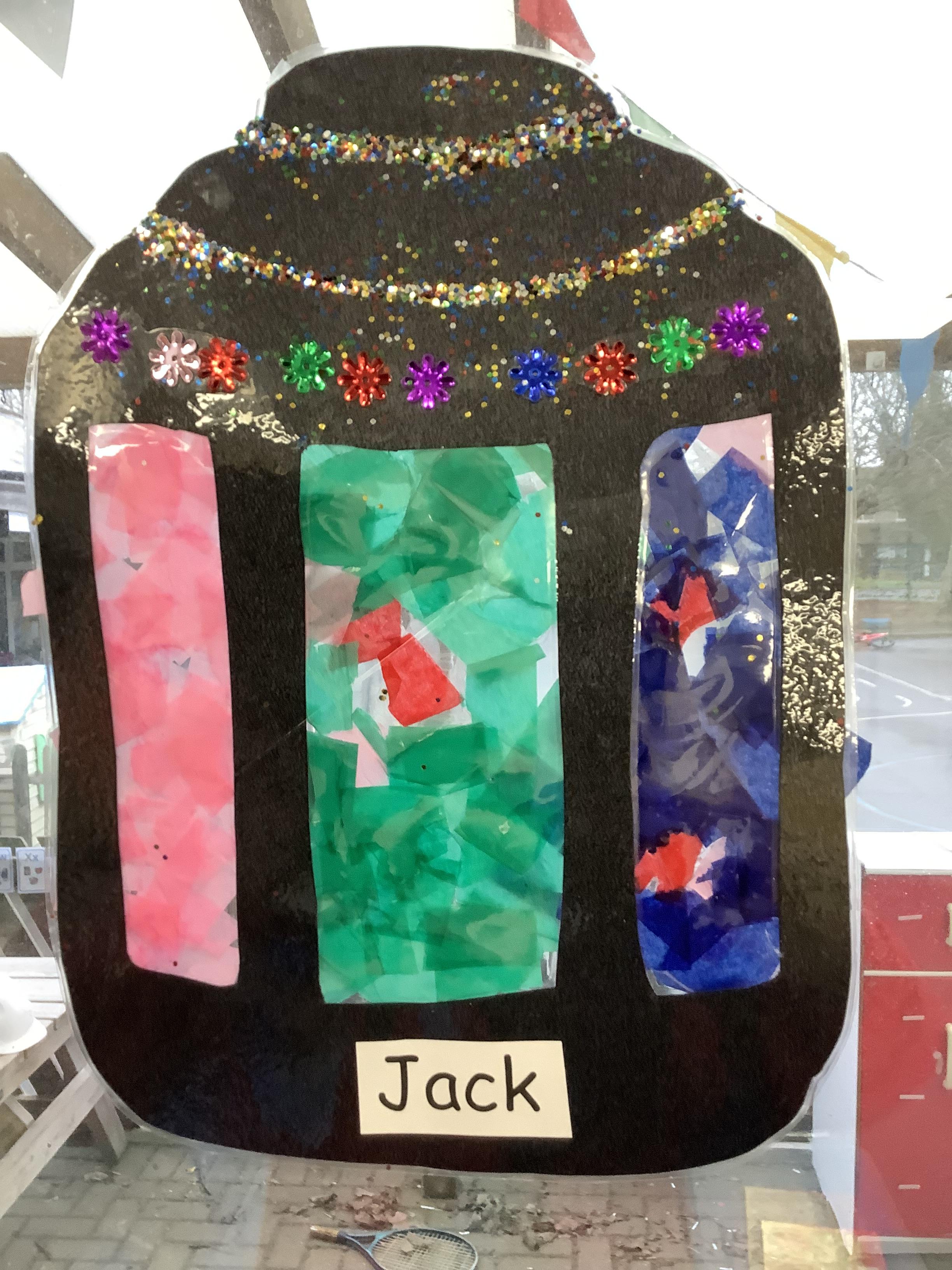 04.03.25 RE: RAMADAN The children enjoyed making their own Ramadan, sun catcher lanterns using different coloured tissue paper. To make them extra decorative, the children sprinkled them with glitter and added jewels.