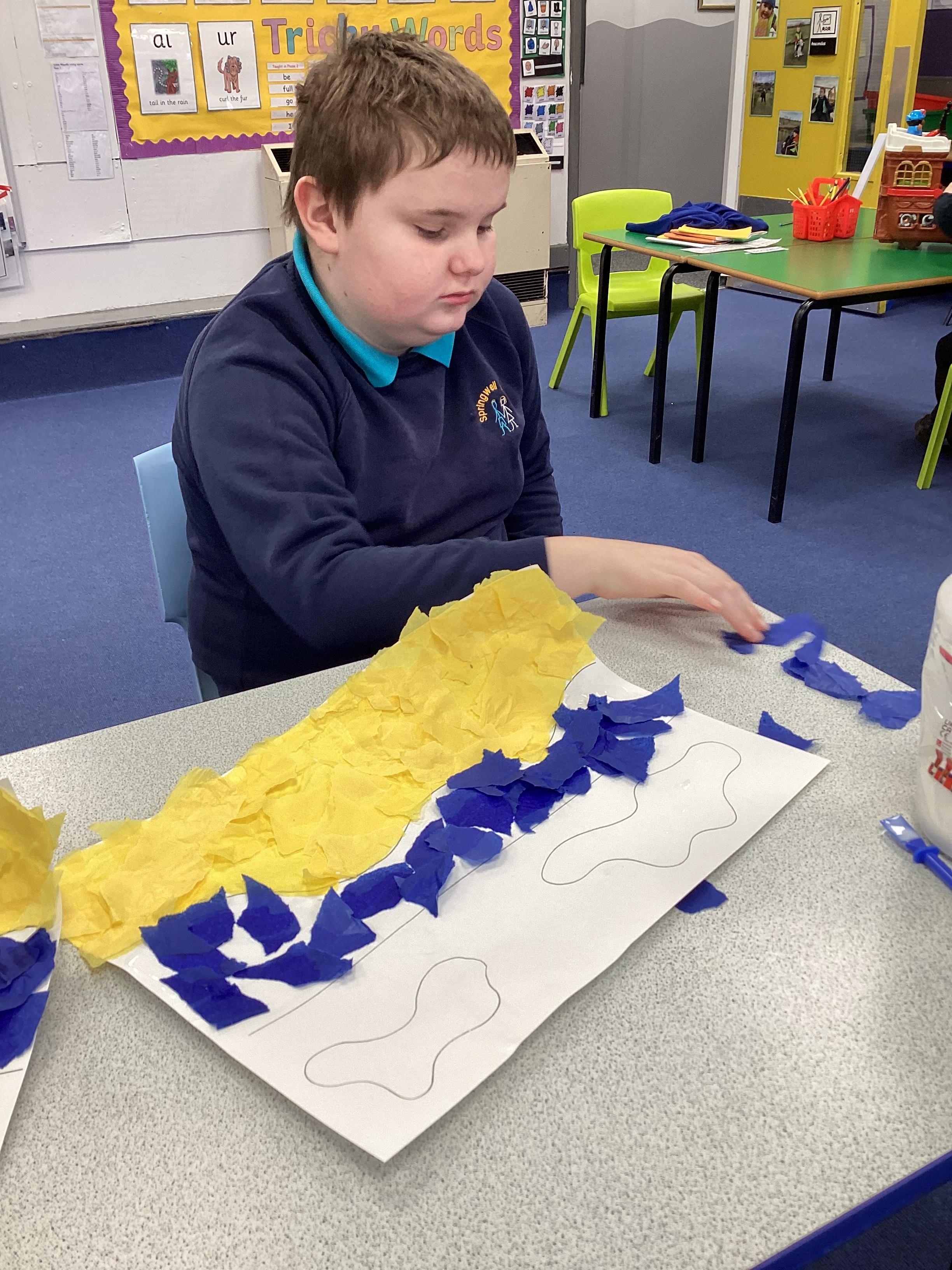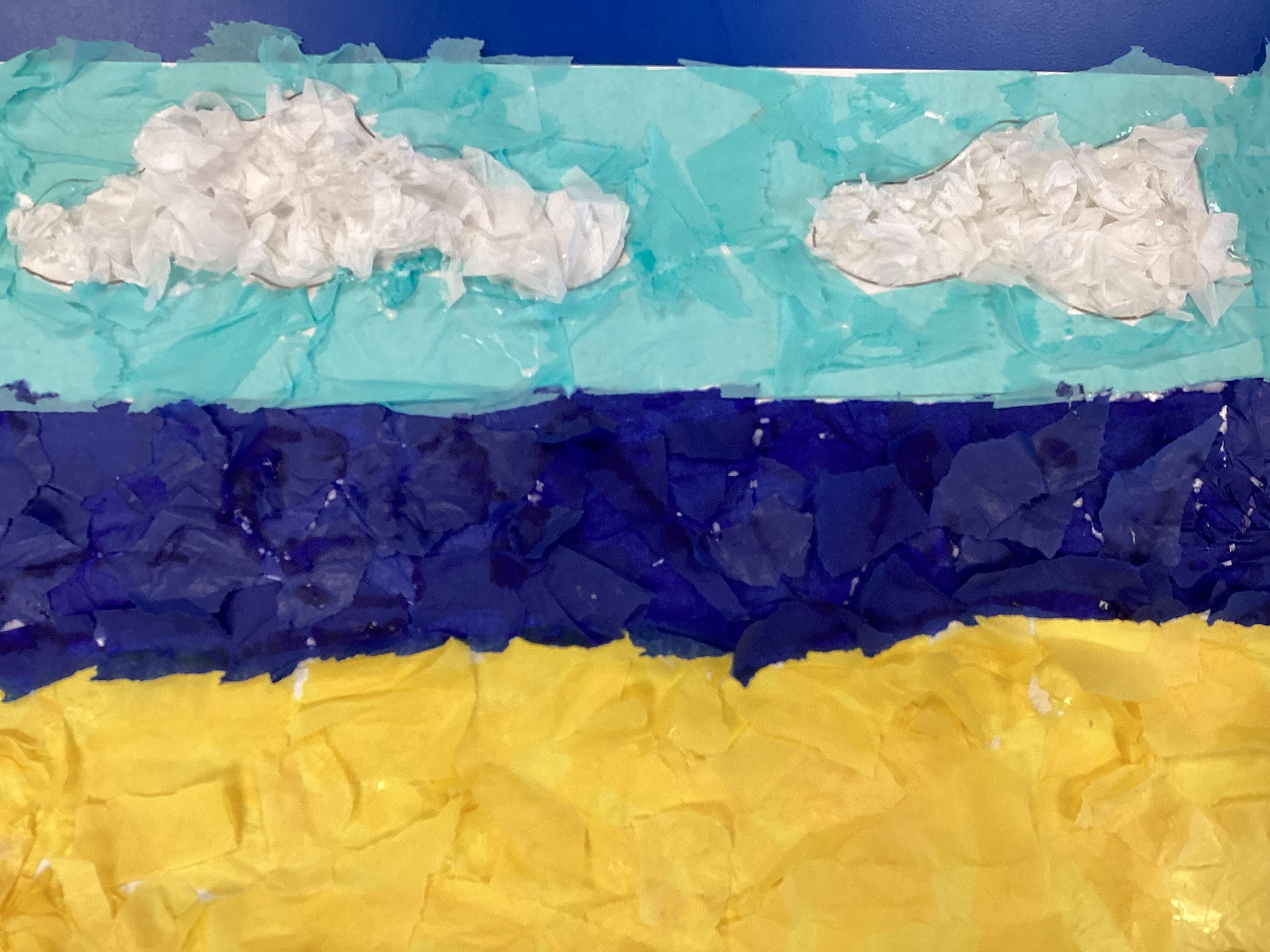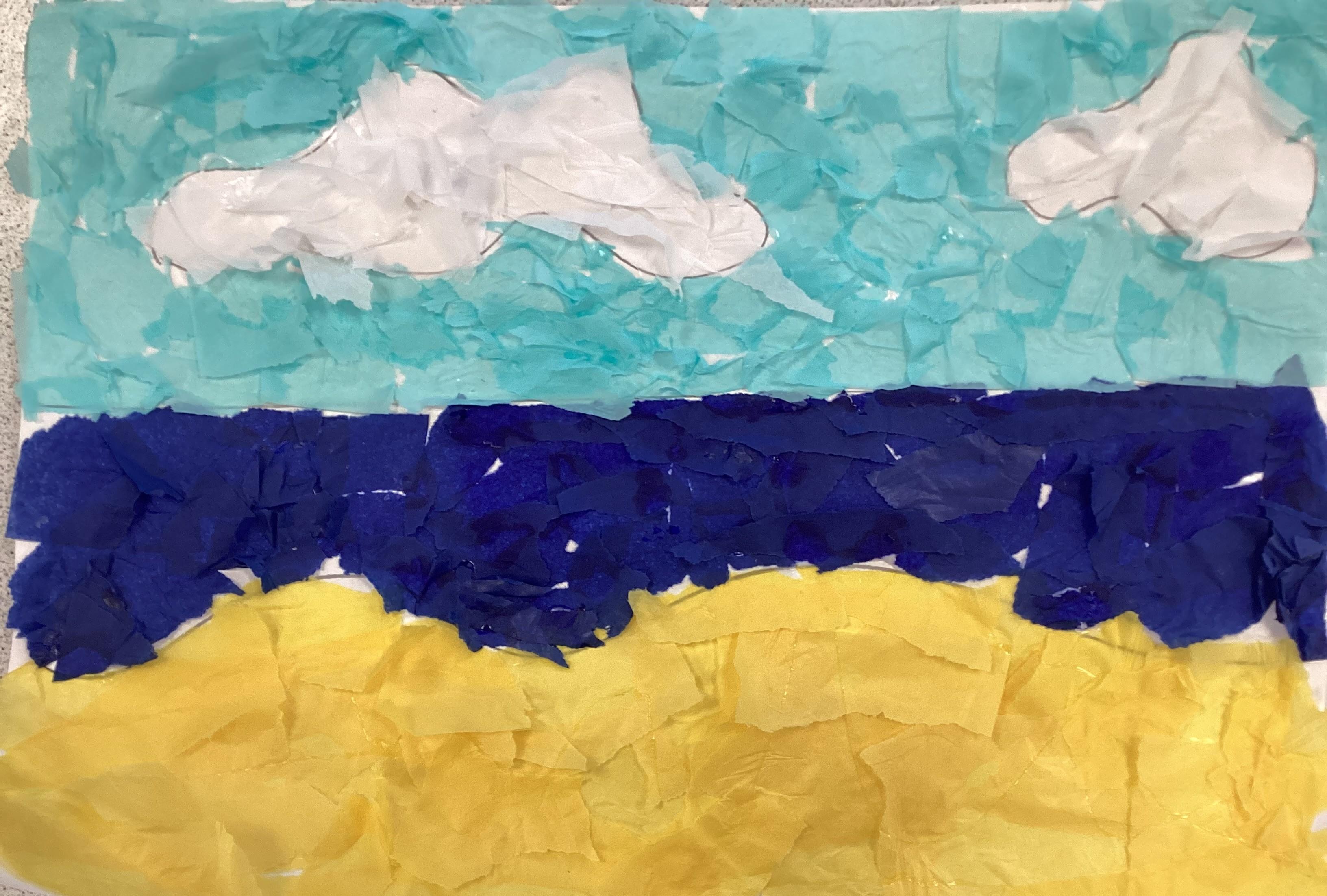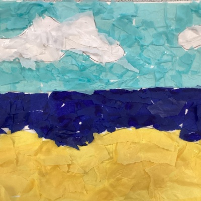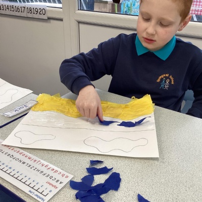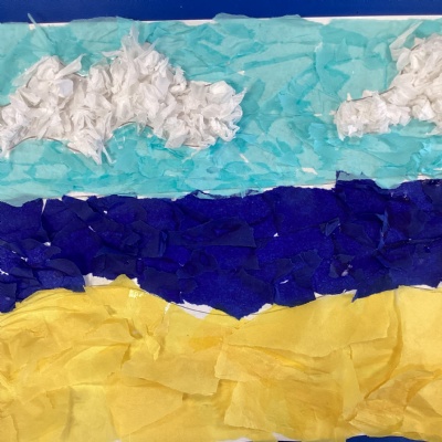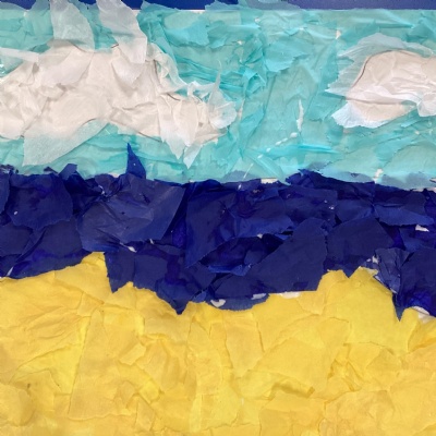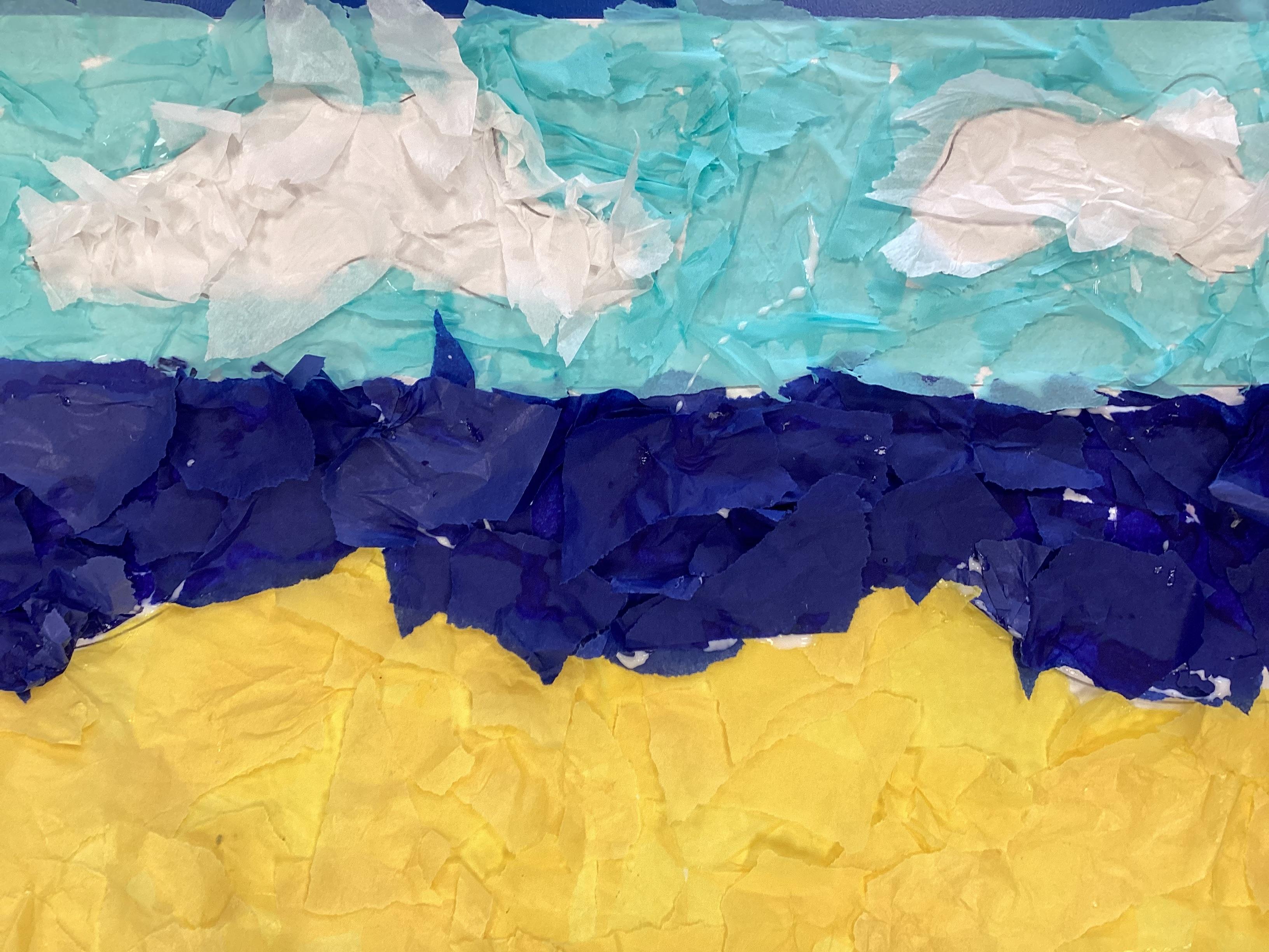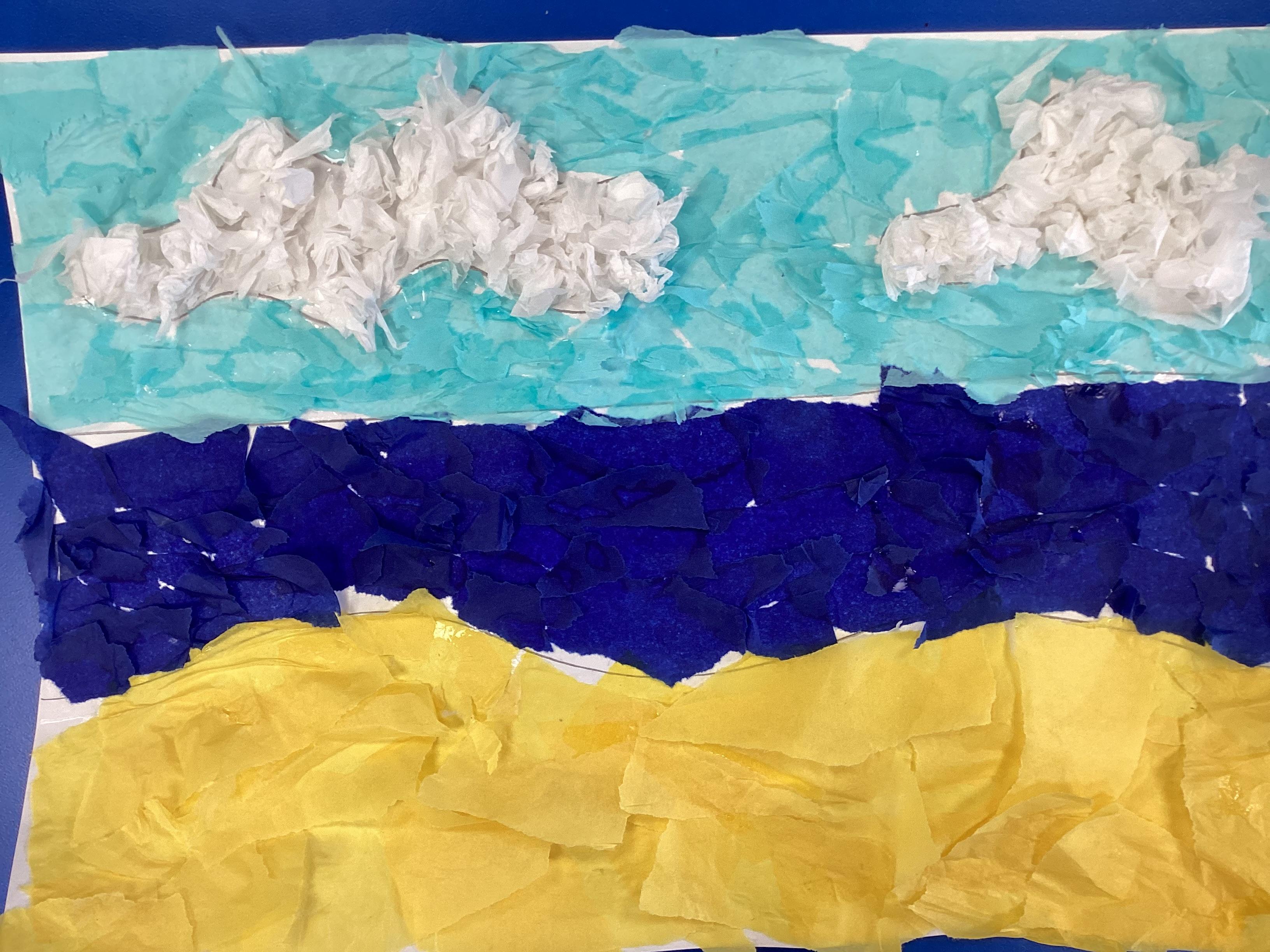 17.02.25 ART: CREATING COLLAGE OF SEATON SEA FRONT We took photos of the sea front, and we asked the children what they could see? The children said they could see the sea, sky, clouds, sand and people walking on the beach. We created a collage of the beach in the style of Megan Coyle using different coloured tissue paper.
