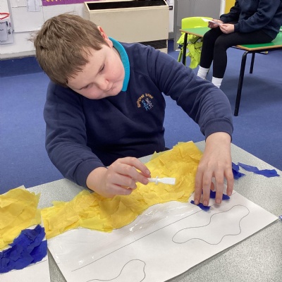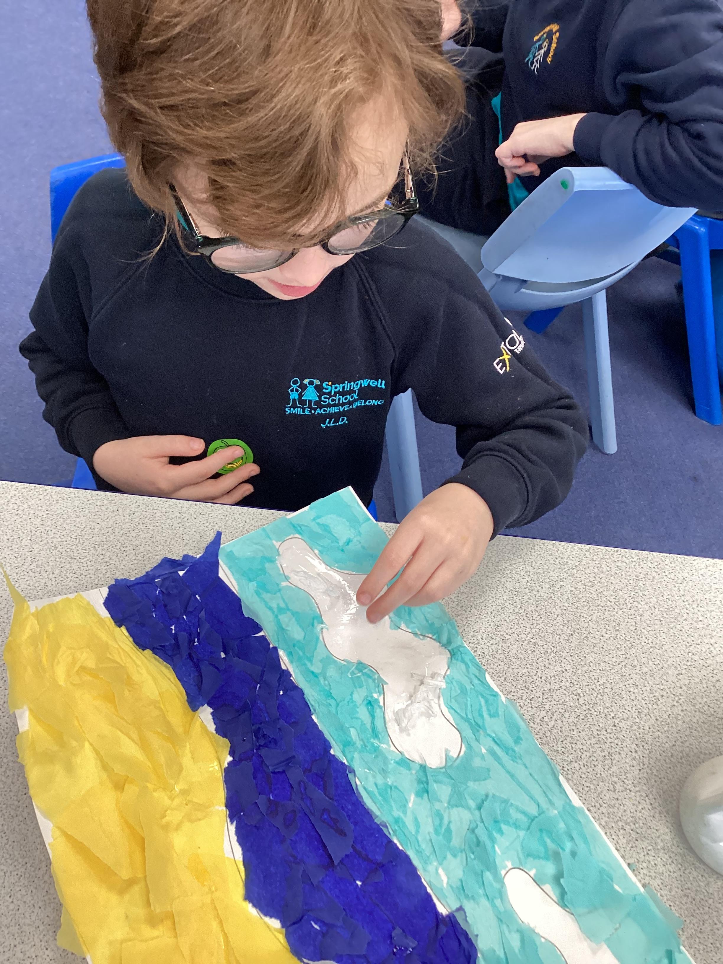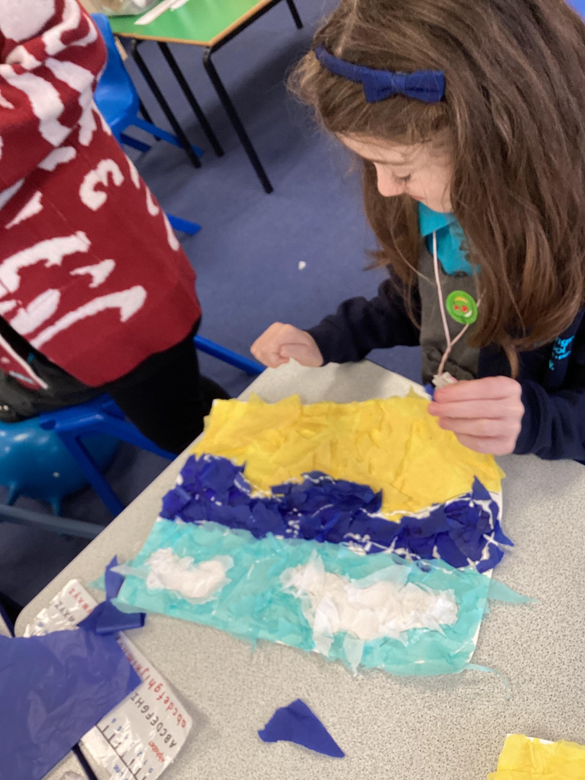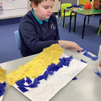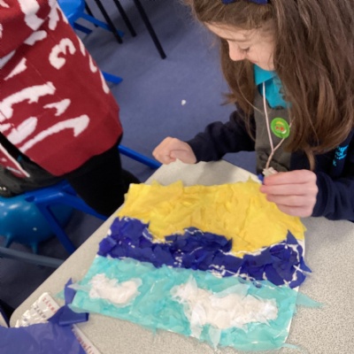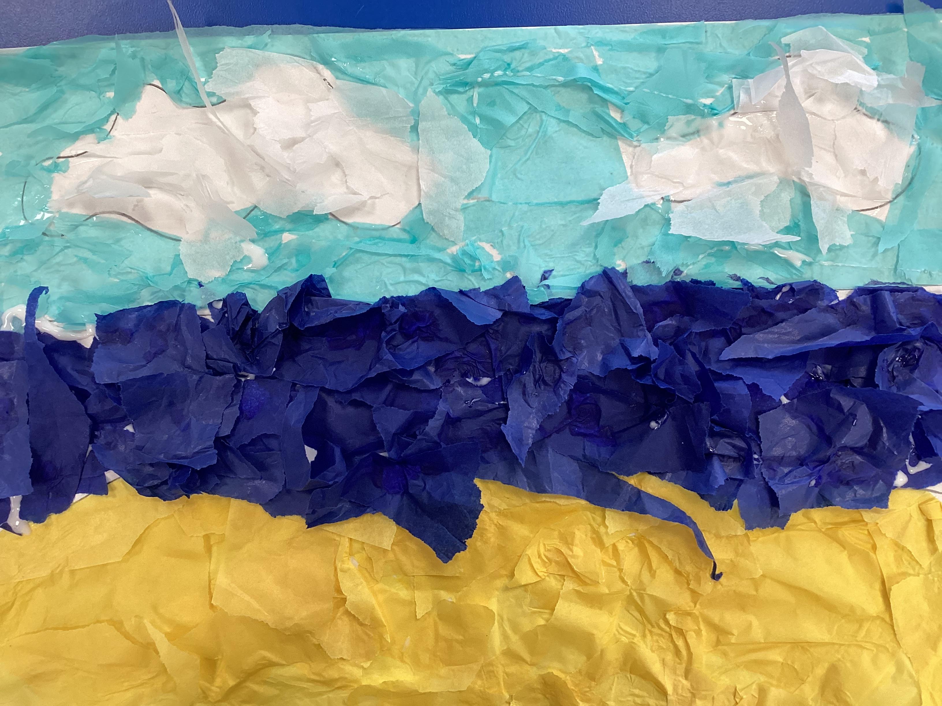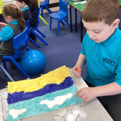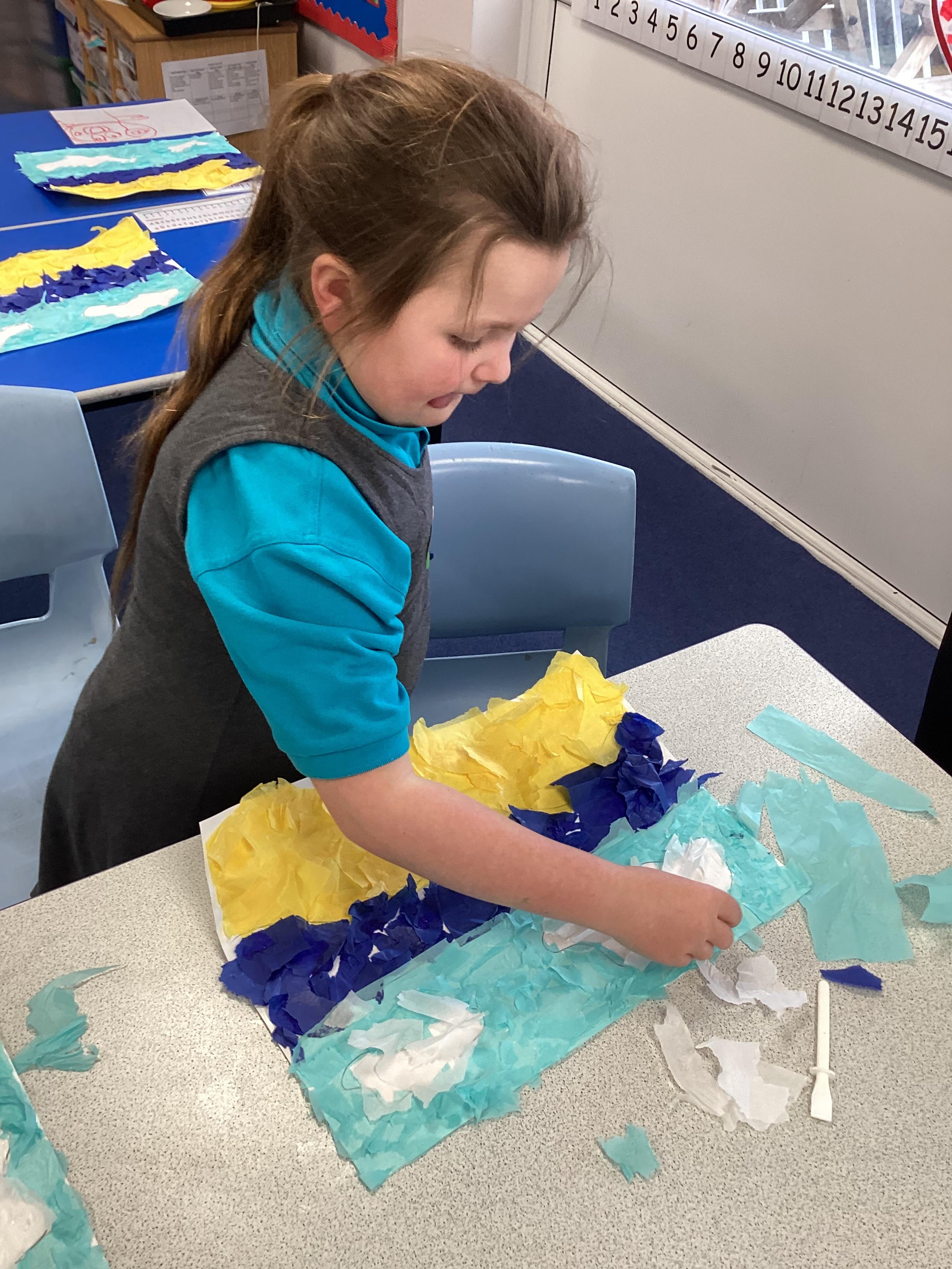 17.02.25 ART: CREATING COLLAGE OF SEATON SEA FRONT We took photos of the sea front, and we asked the children what they could see? The children said they could see the sea, sky, clouds, sand and people walking on the beach. We created a collage of the beach in the style of Megan Coyle using different coloured tissue paper.