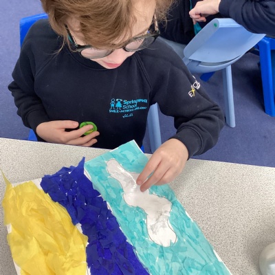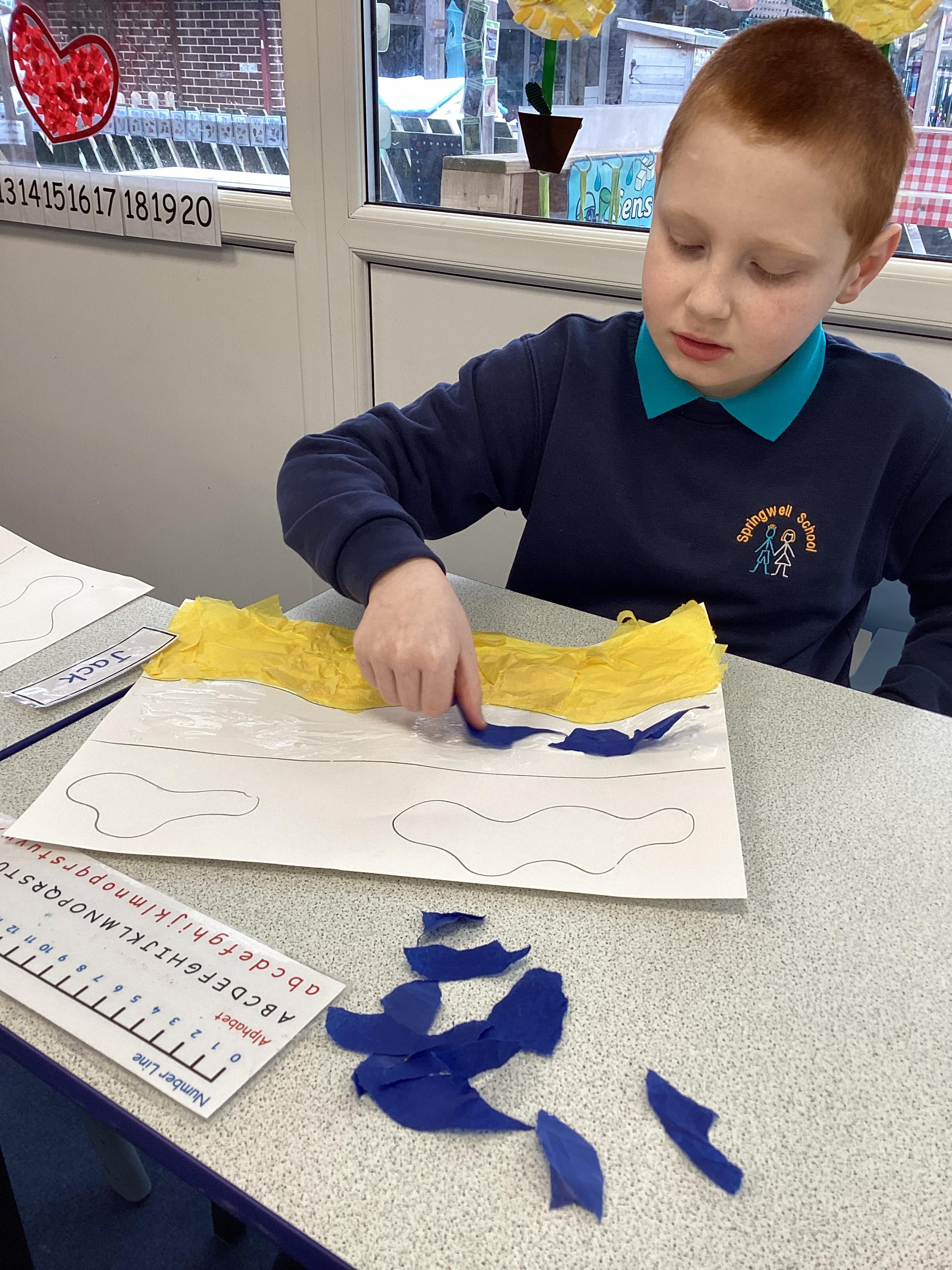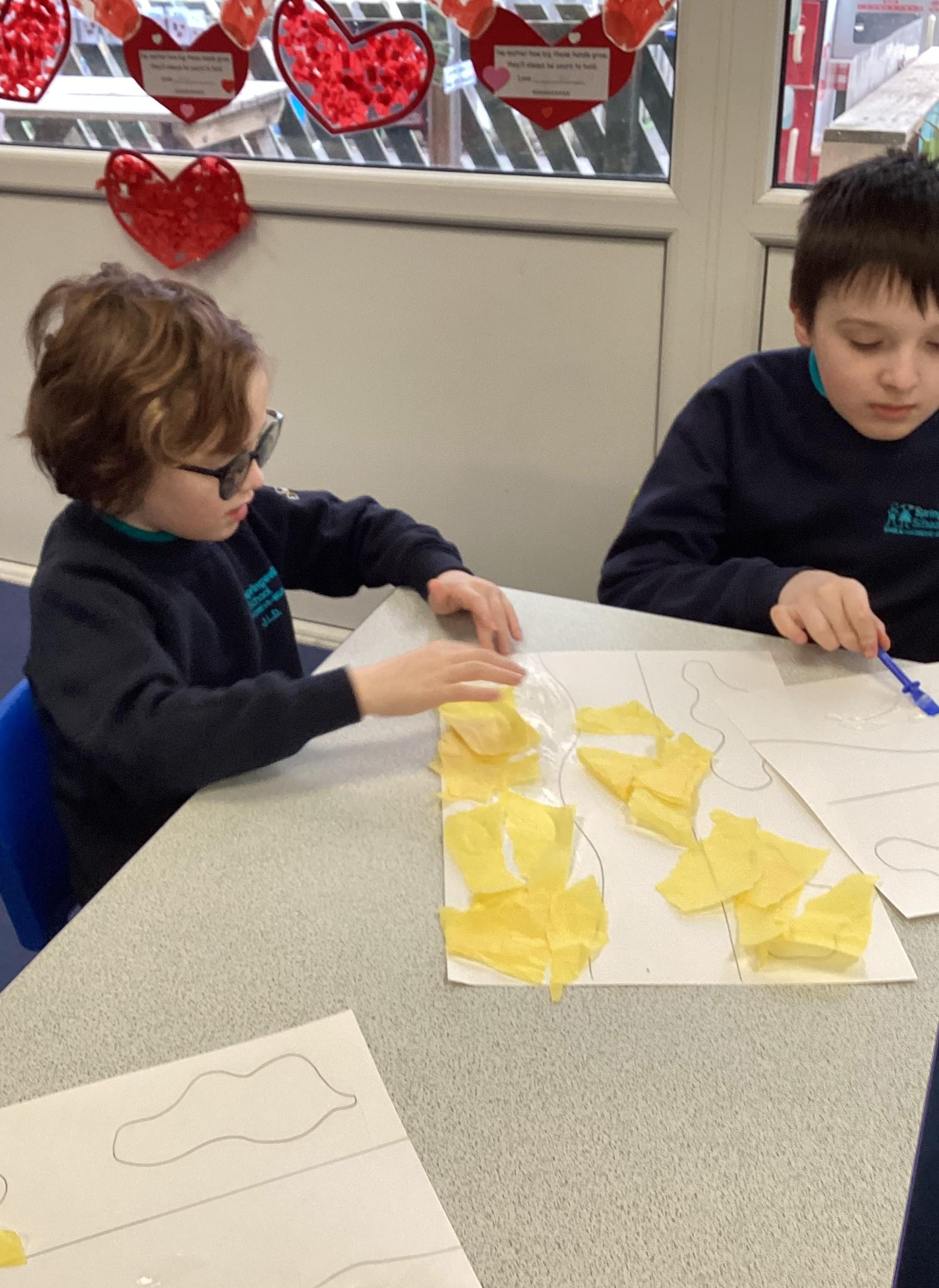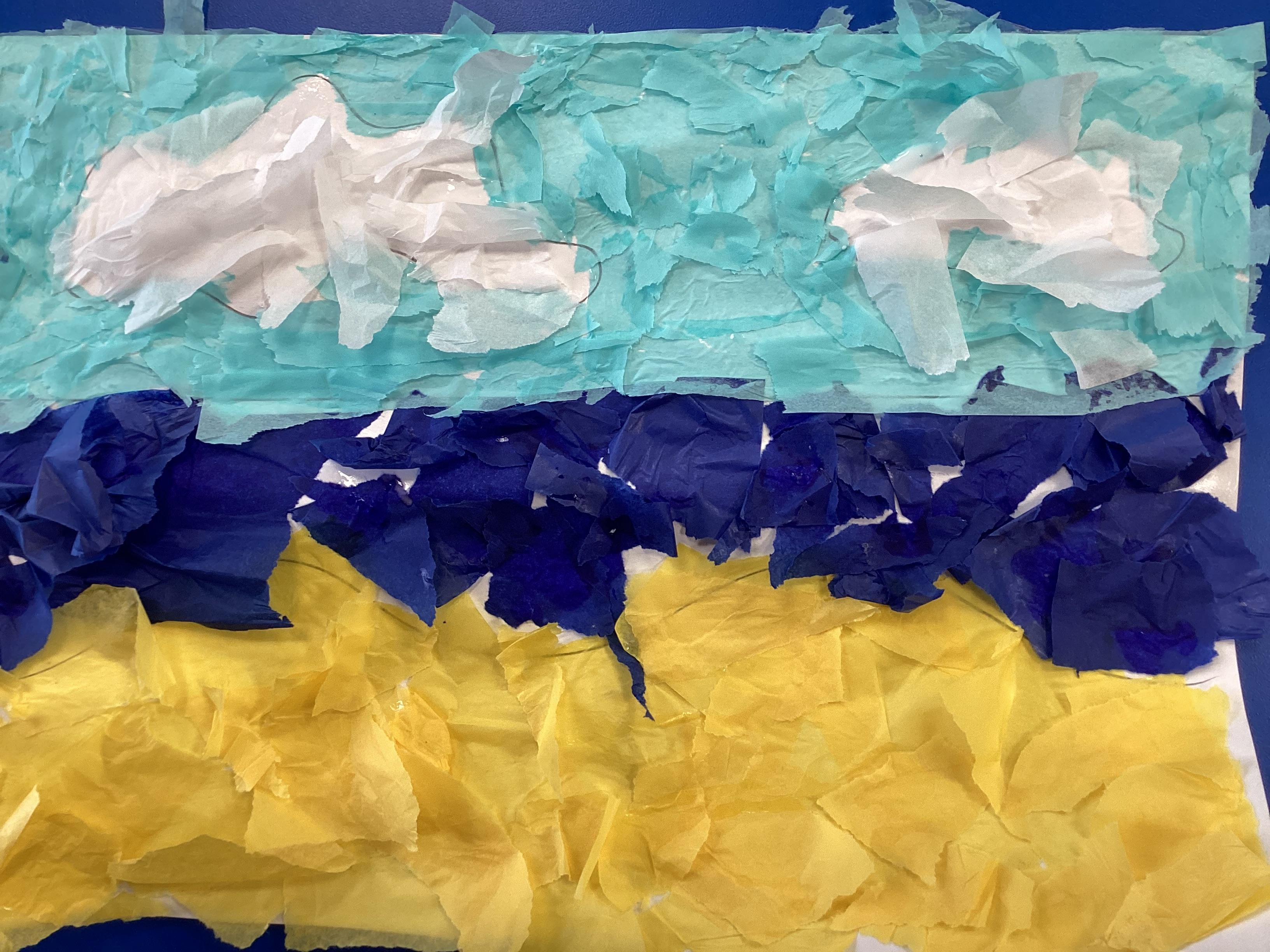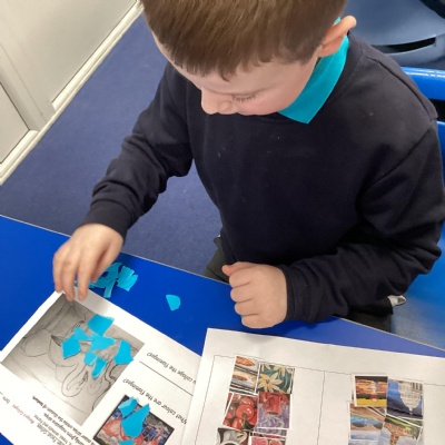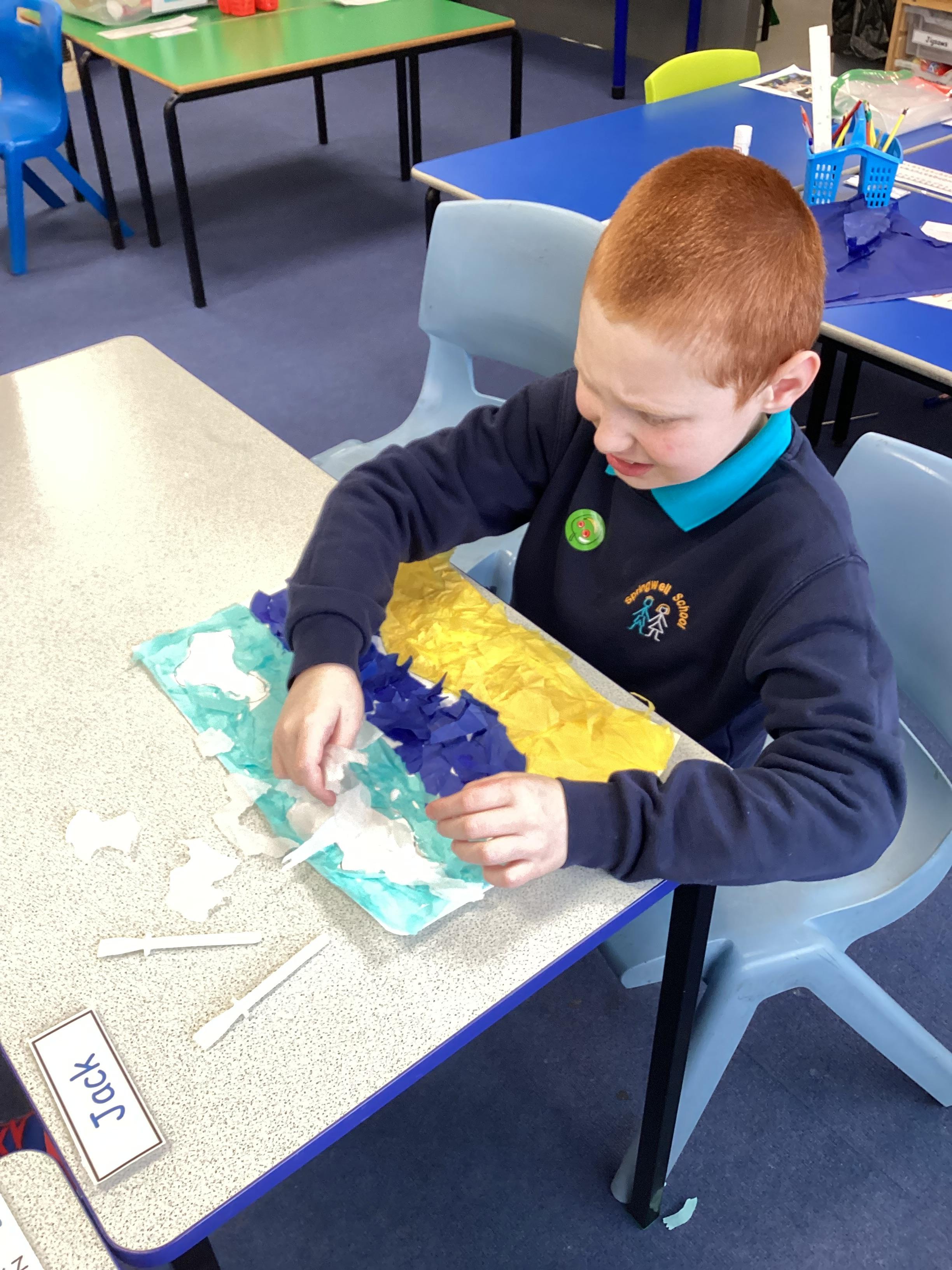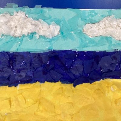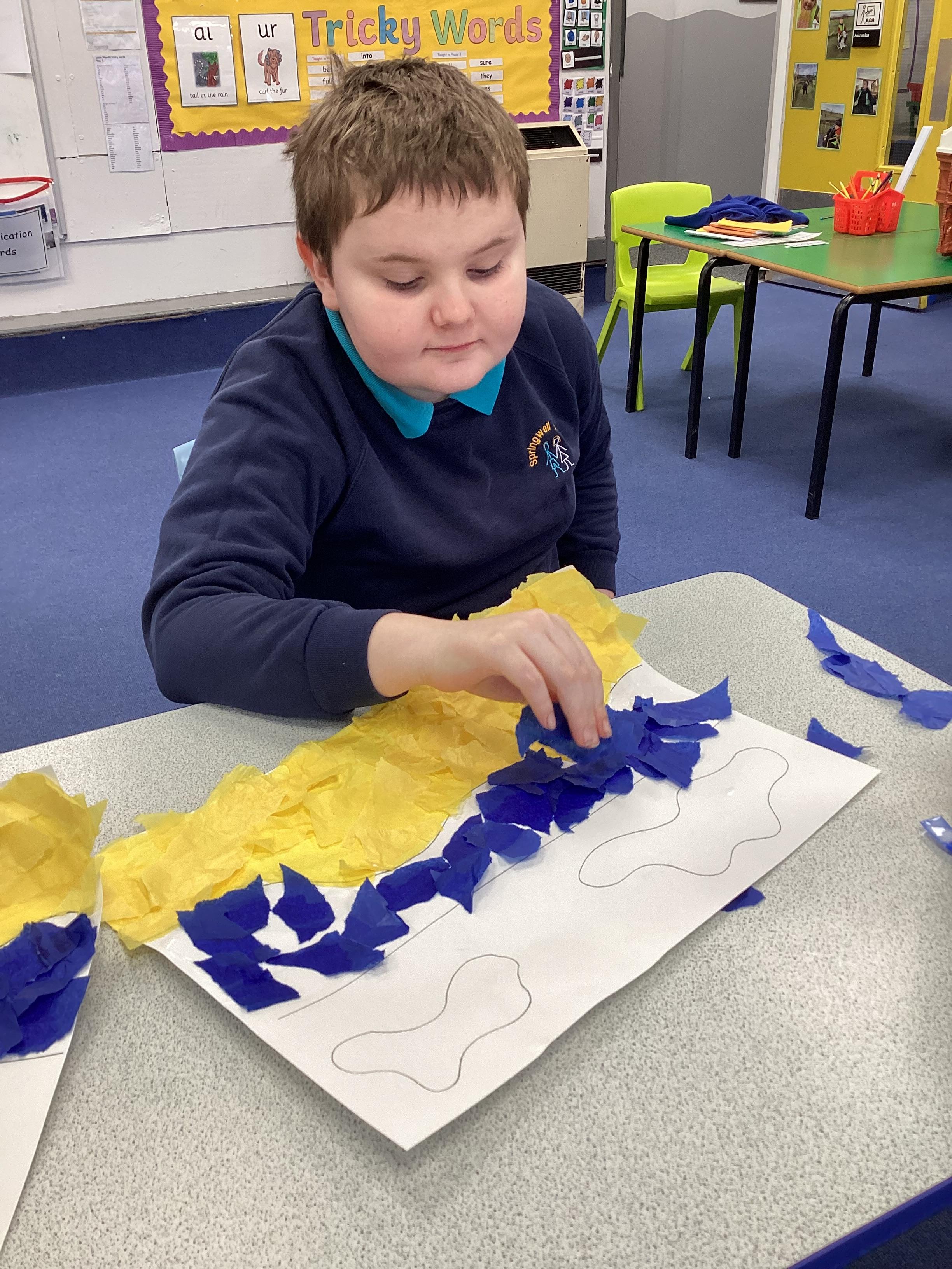 17.02.25 ART: CREATING COLLAGE OF SEATON SEA FRONT We took photos of the sea front, and we asked the children what they could see? The children said they could see the sea, sky, clouds, sand and people walking on the beach. We created a collage of the beach in the style of Megan Coyle using different coloured tissue paper.