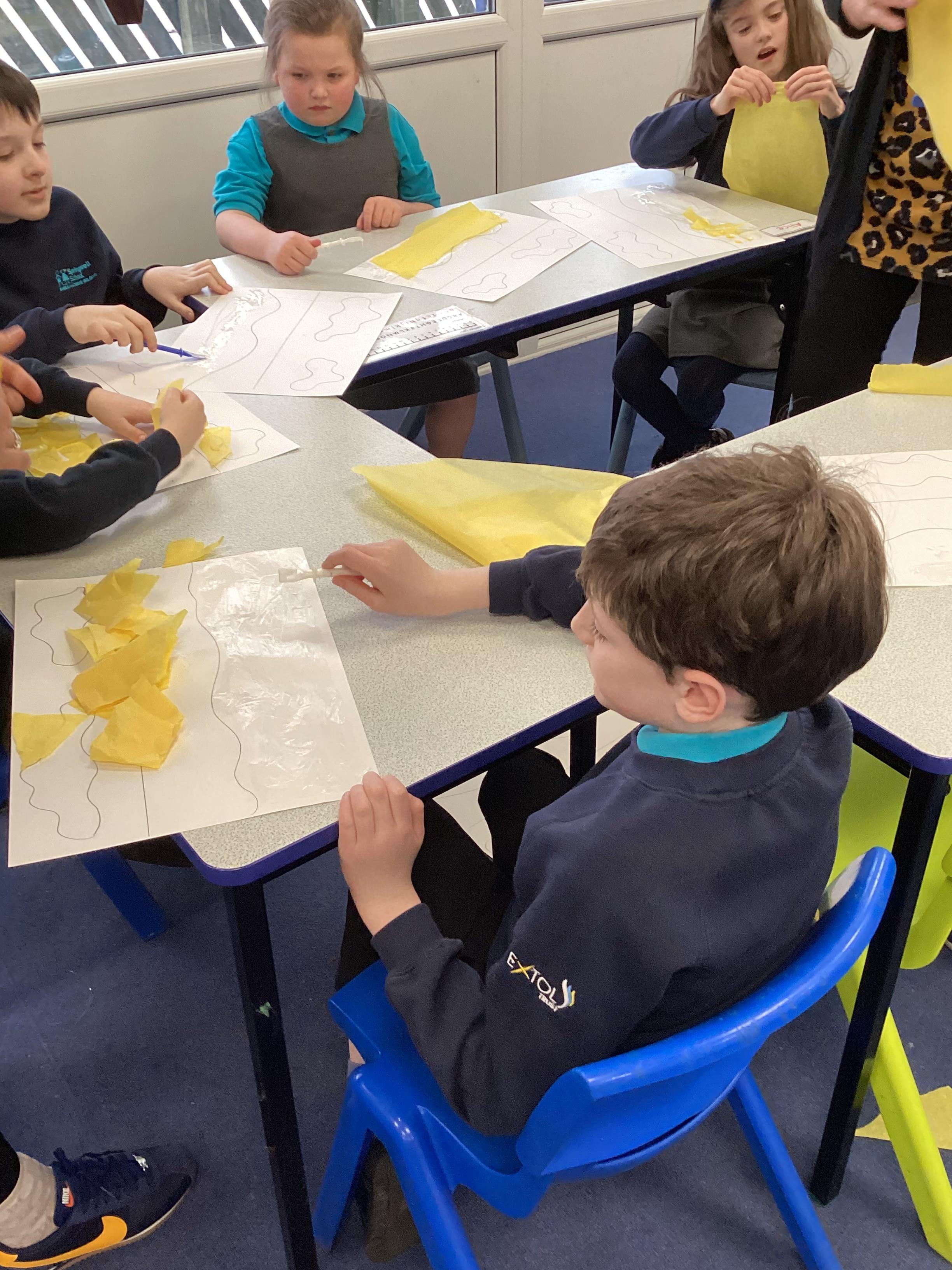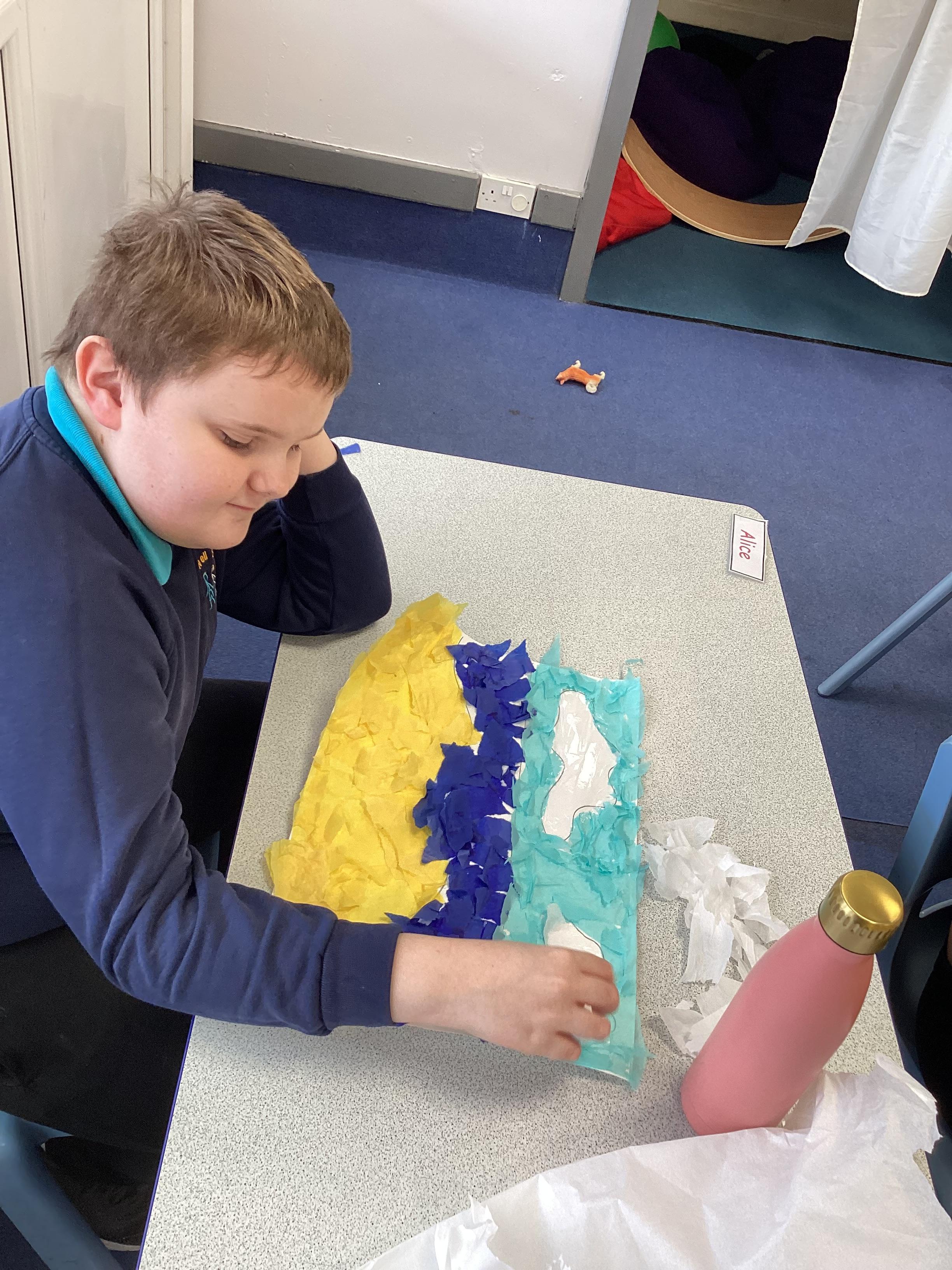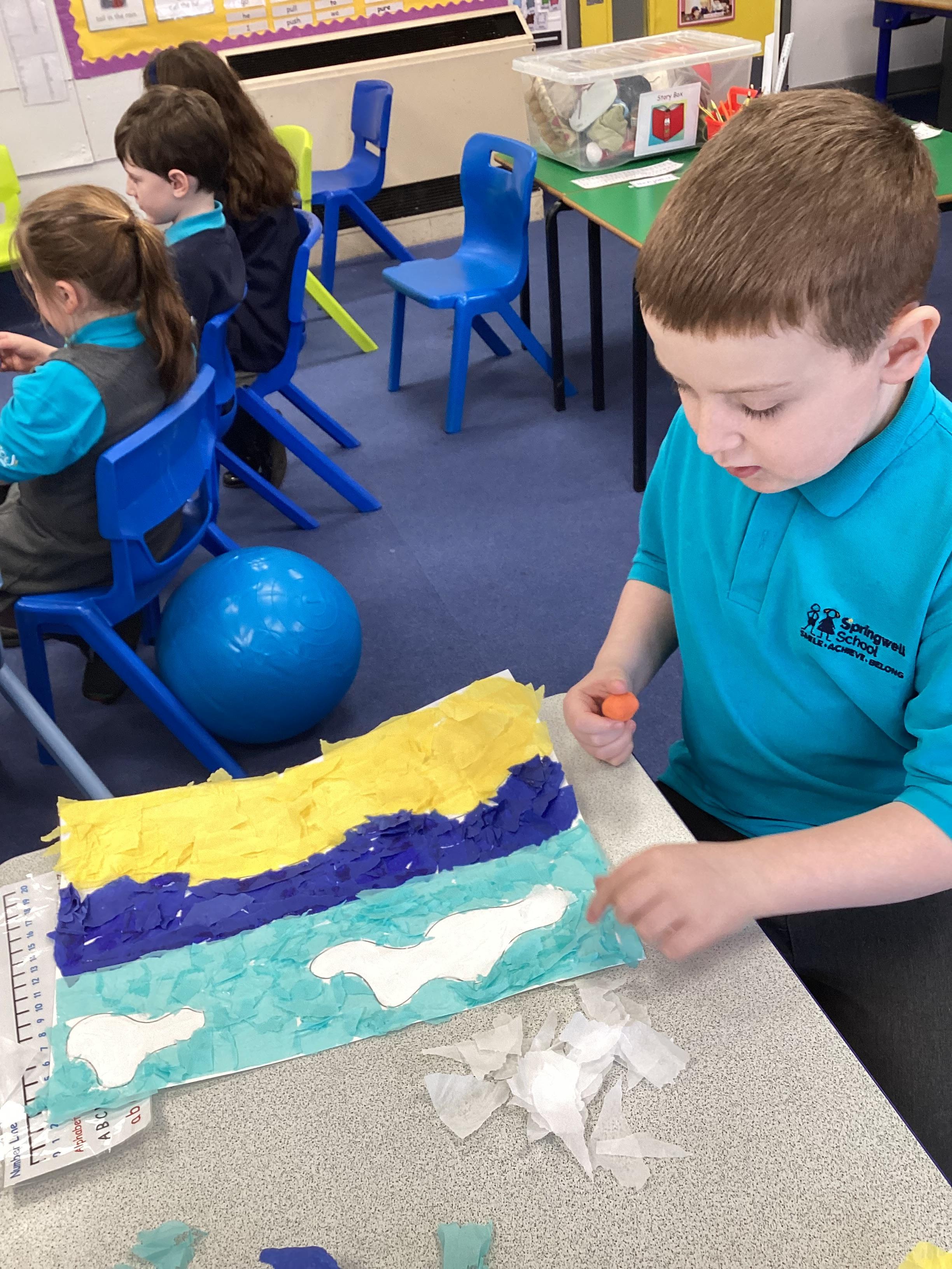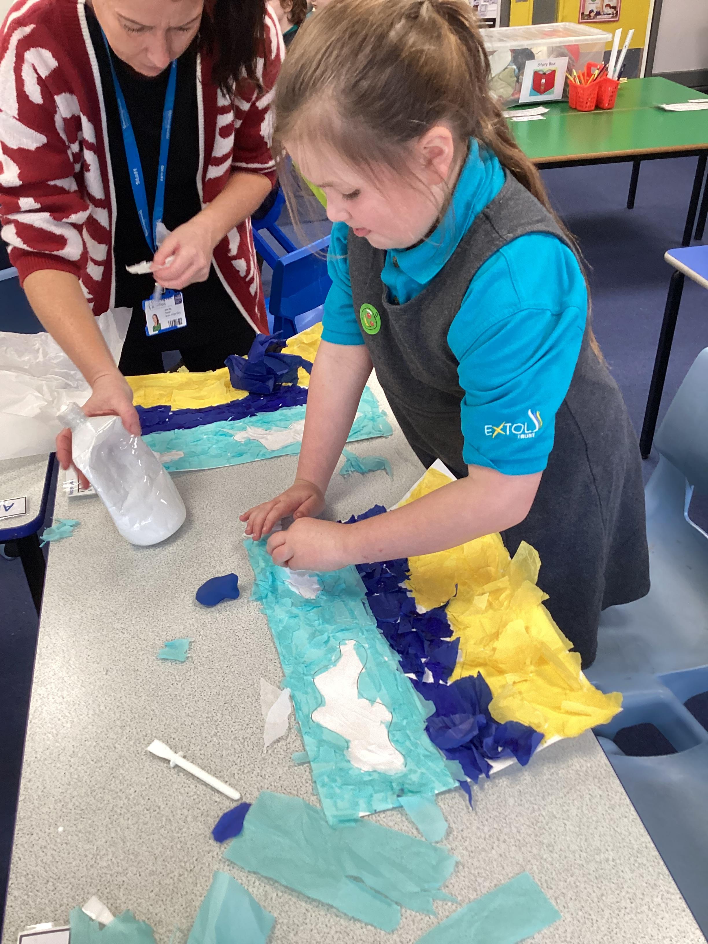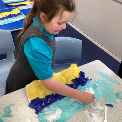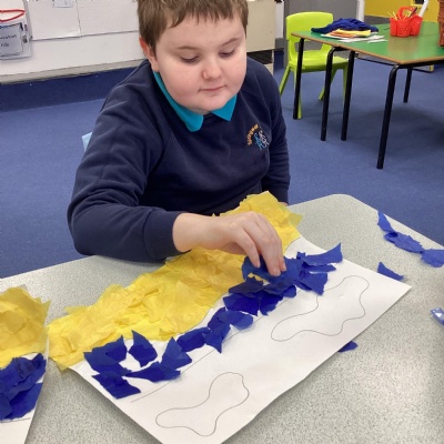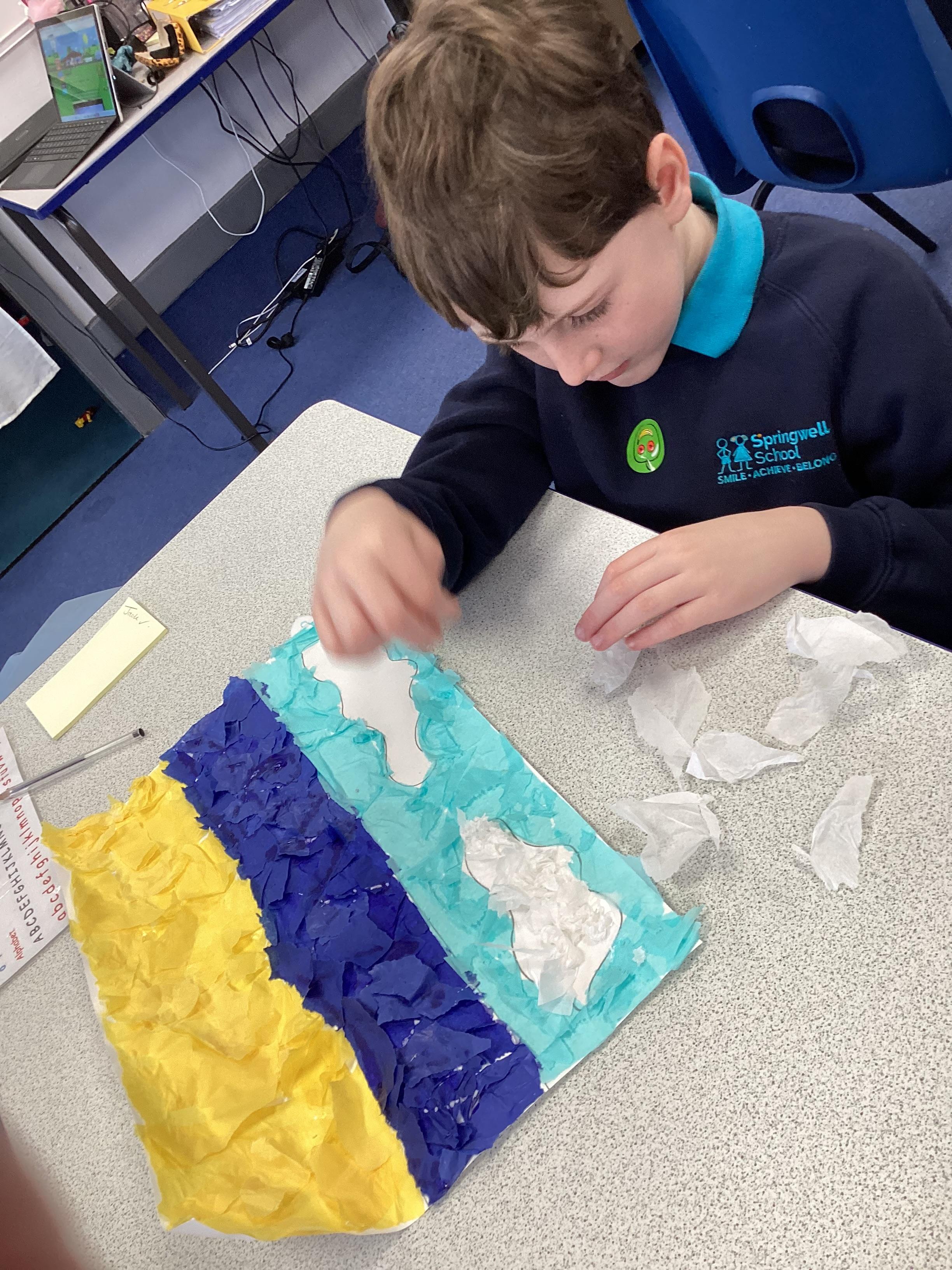 17.02.25 ART: CREATING COLLAGE OF SEATON SEA FRONT We took photos of the sea front, and we asked the children what they could see? The children said they could see the sea, sky, clouds, sand and people walking on the beach. We created a collage of the beach in the style of Megan Coyle using different coloured tissue paper.