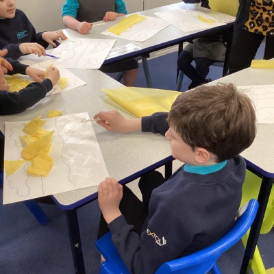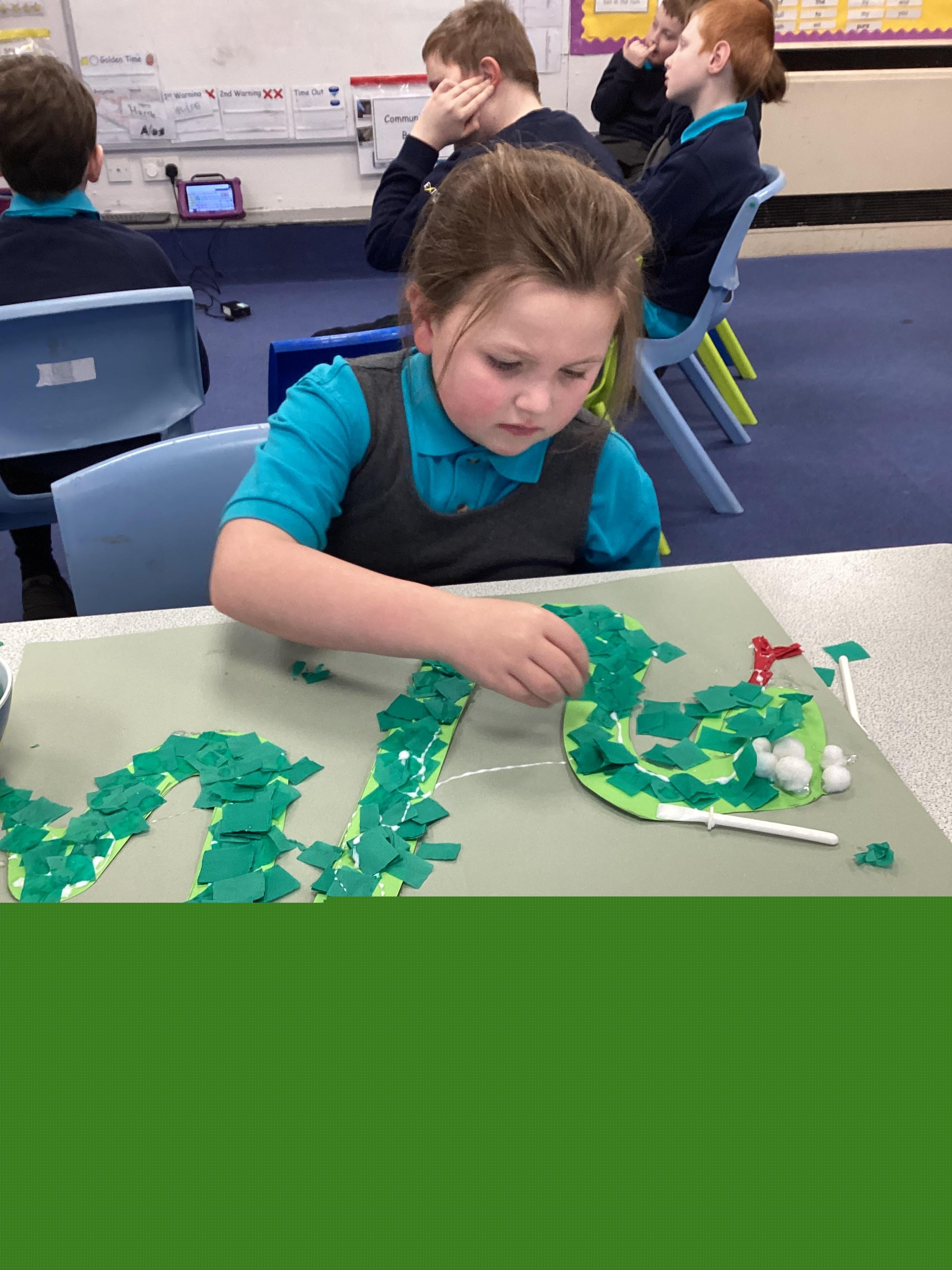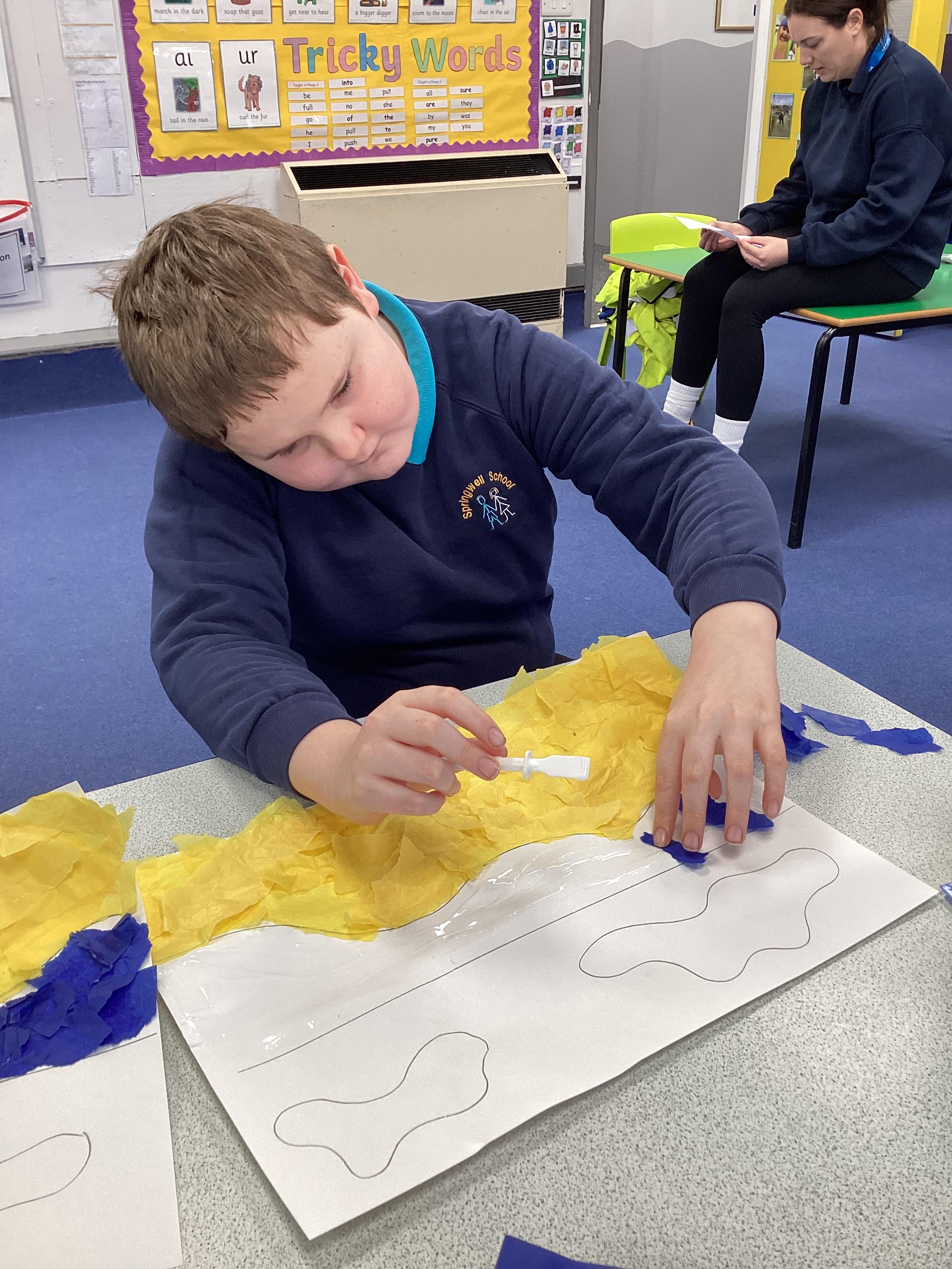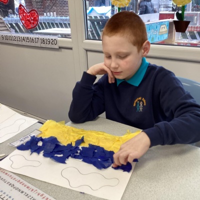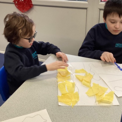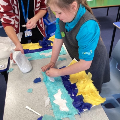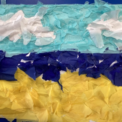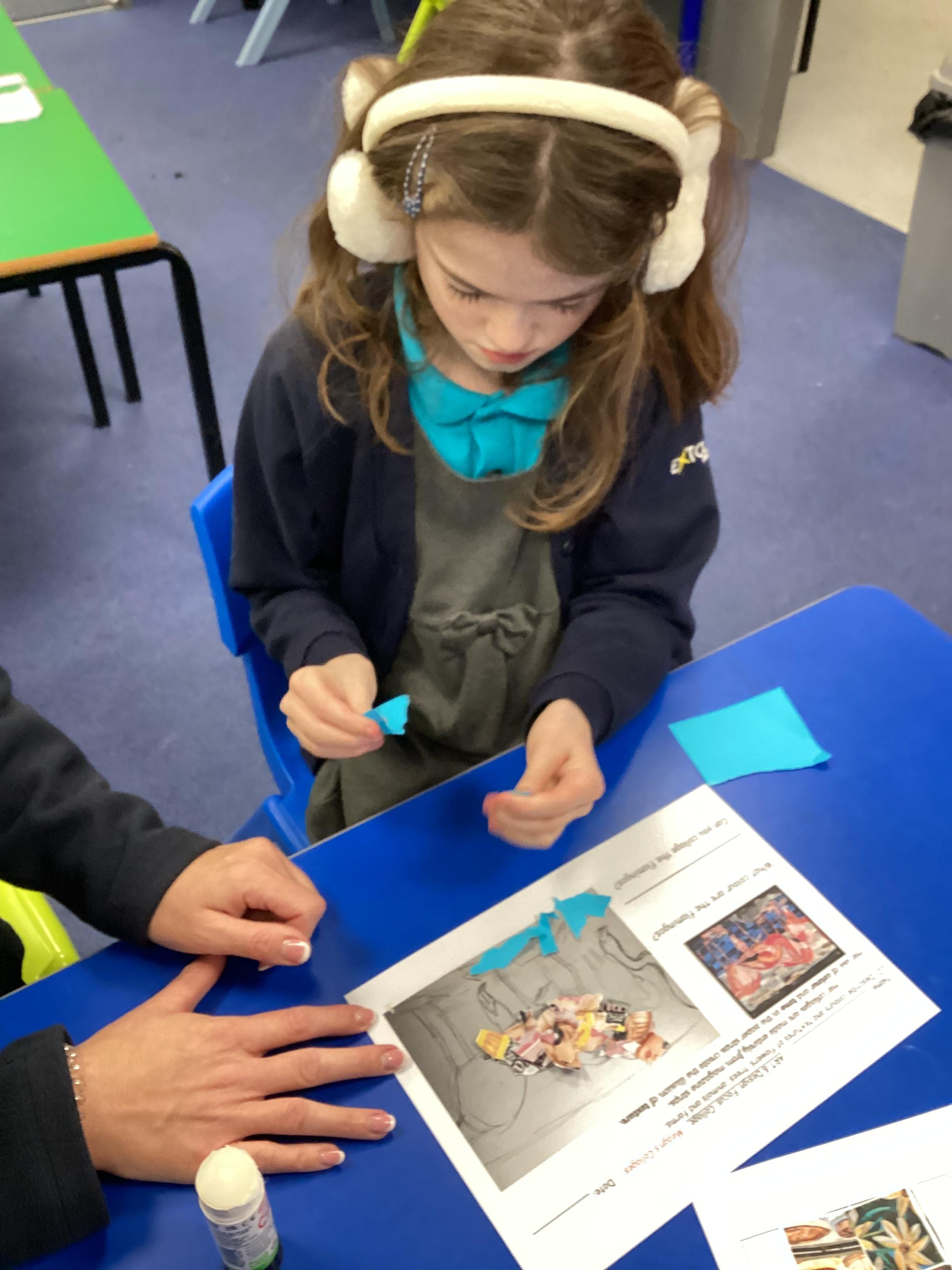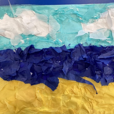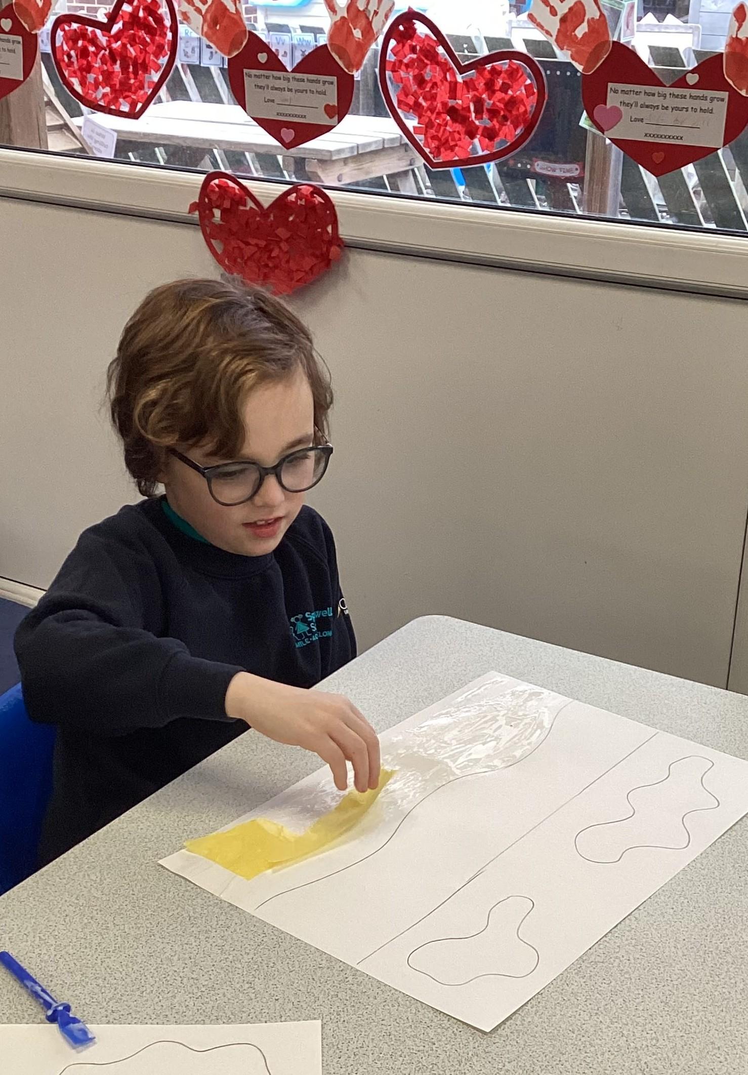 17.02.25 ART: CREATING COLLAGE OF SEATON SEA FRONT We took photos of the sea front, and we asked the children what they could see? The children said they could see the sea, sky, clouds, sand and people walking on the beach. We created a collage of the beach in the style of Megan Coyle using different coloured tissue paper.