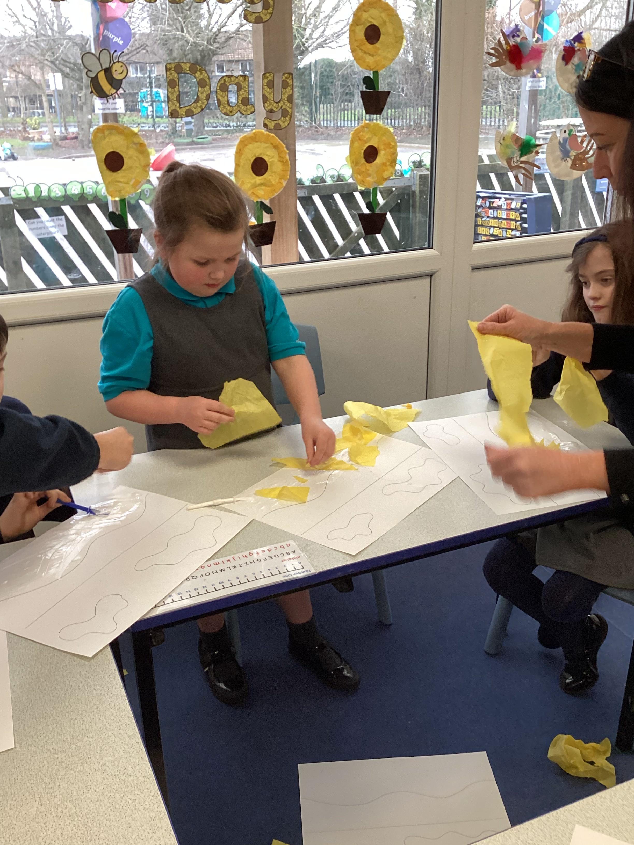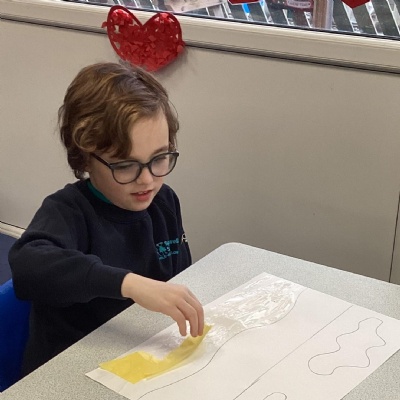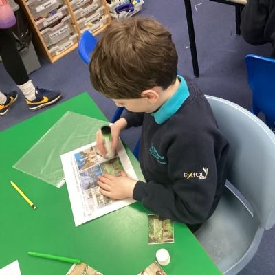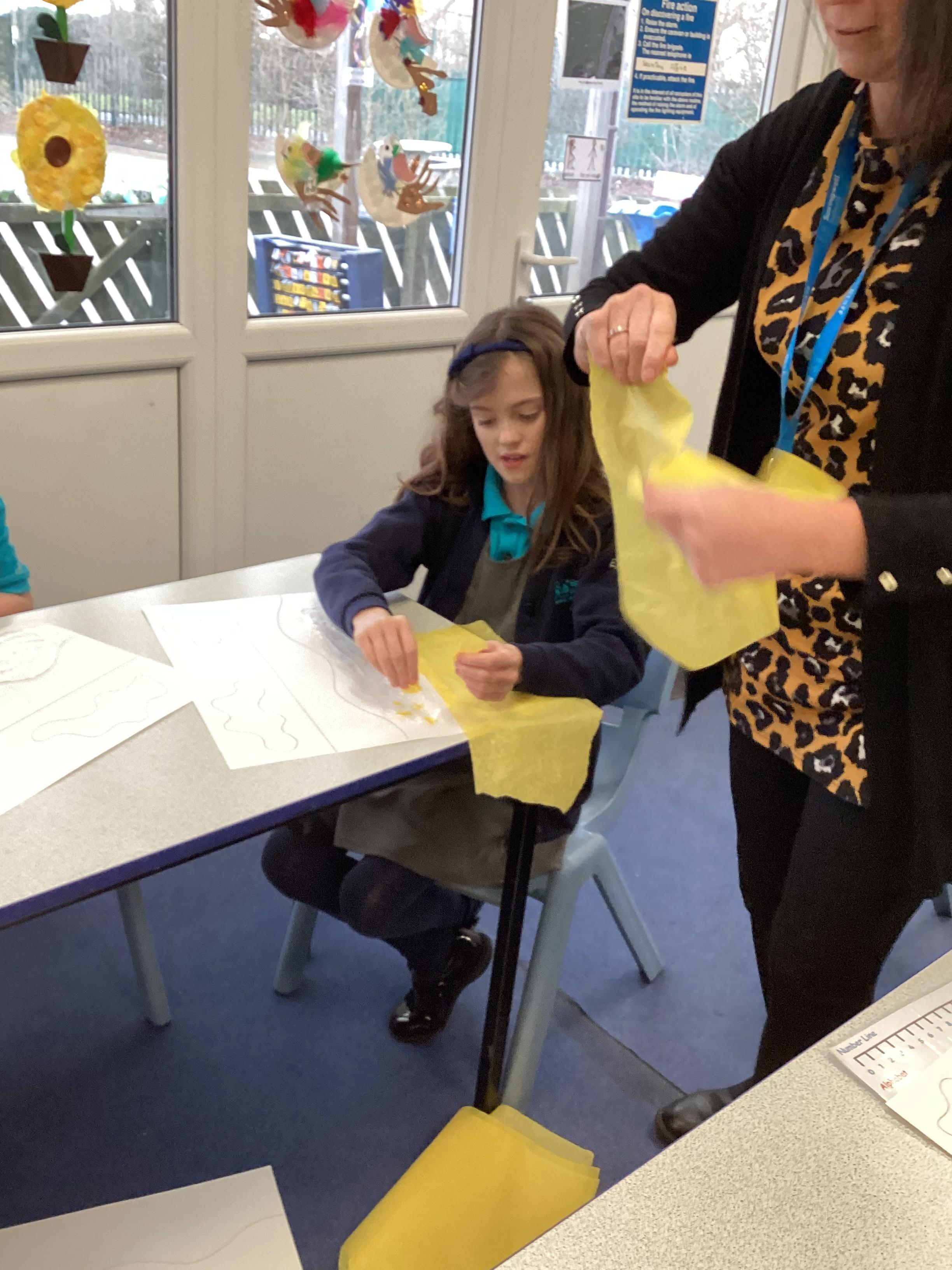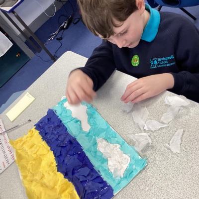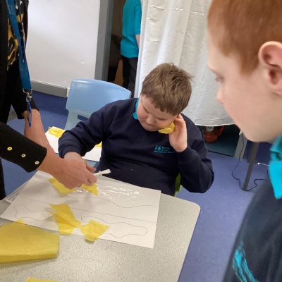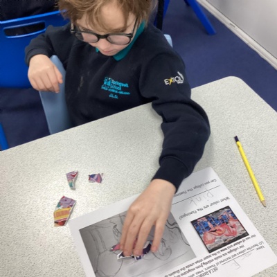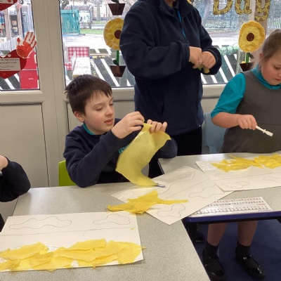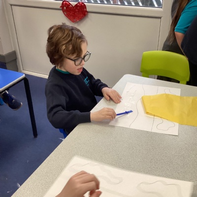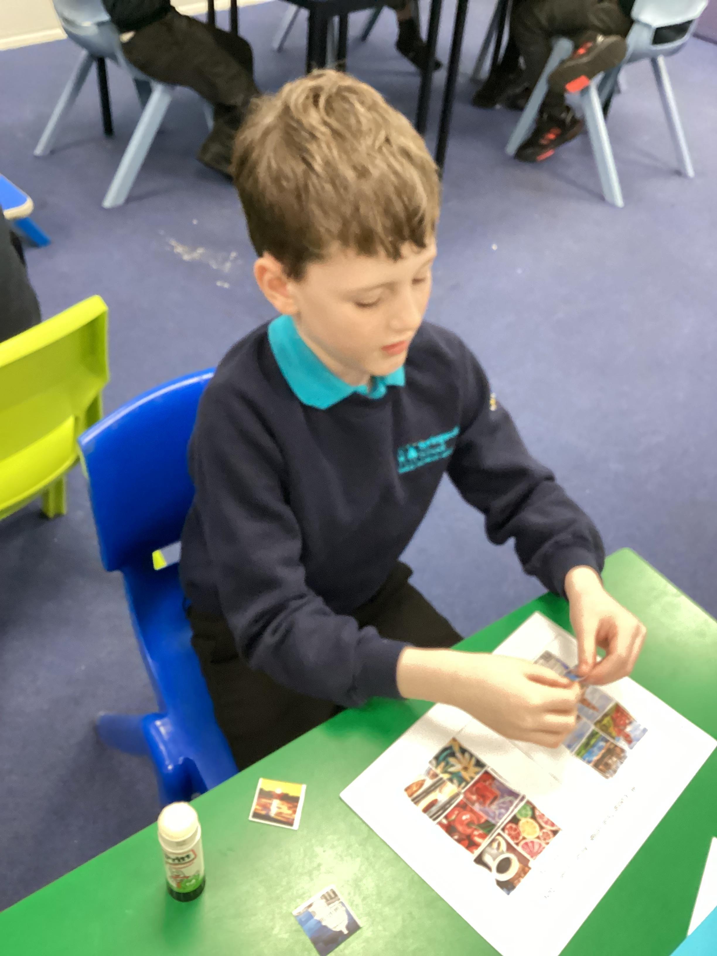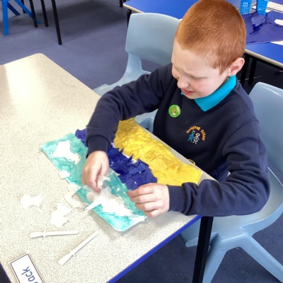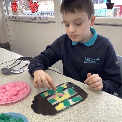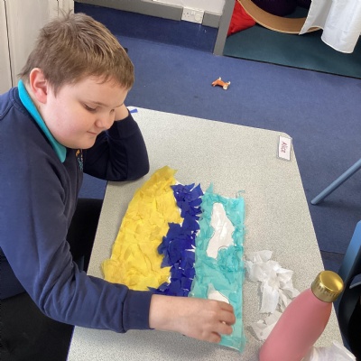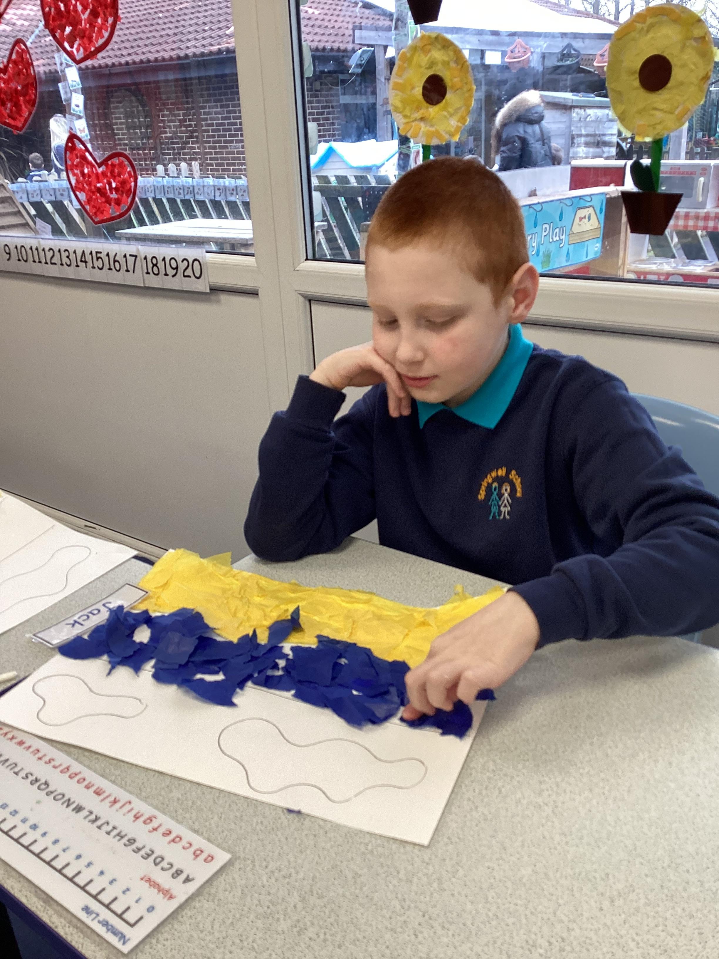 17.02.25 ART: CREATING COLLAGE OF SEATON SEA FRONT We took photos of the sea front, and we asked the children what they could see? The children said they could see the sea, sky, clouds, sand and people walking on the beach. We created a collage of the beach in the style of Megan Coyle using different coloured tissue paper.