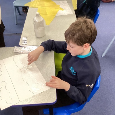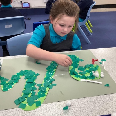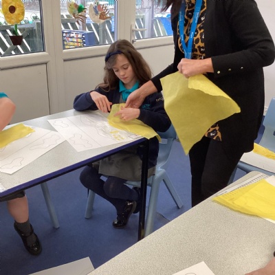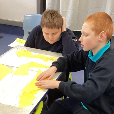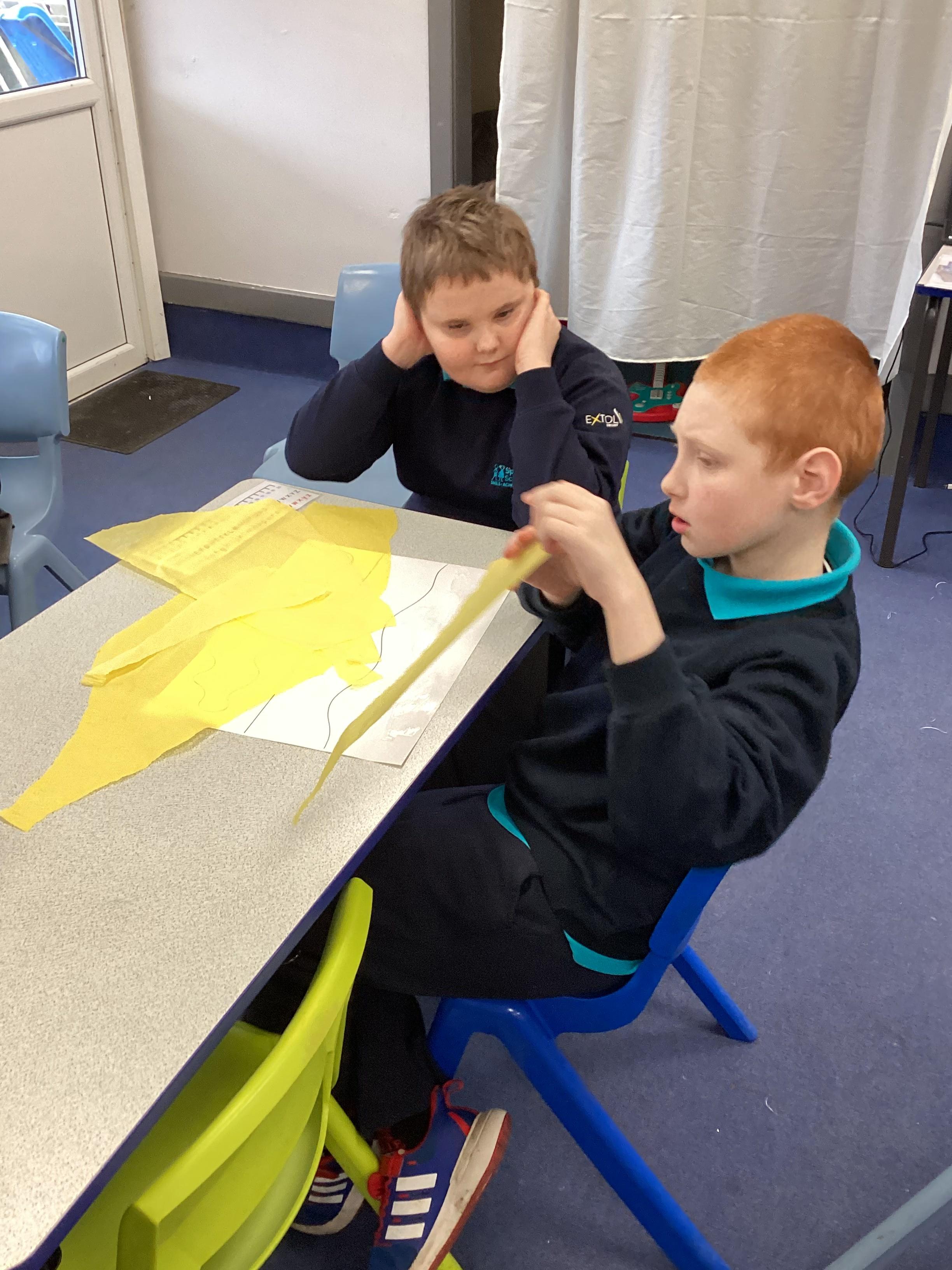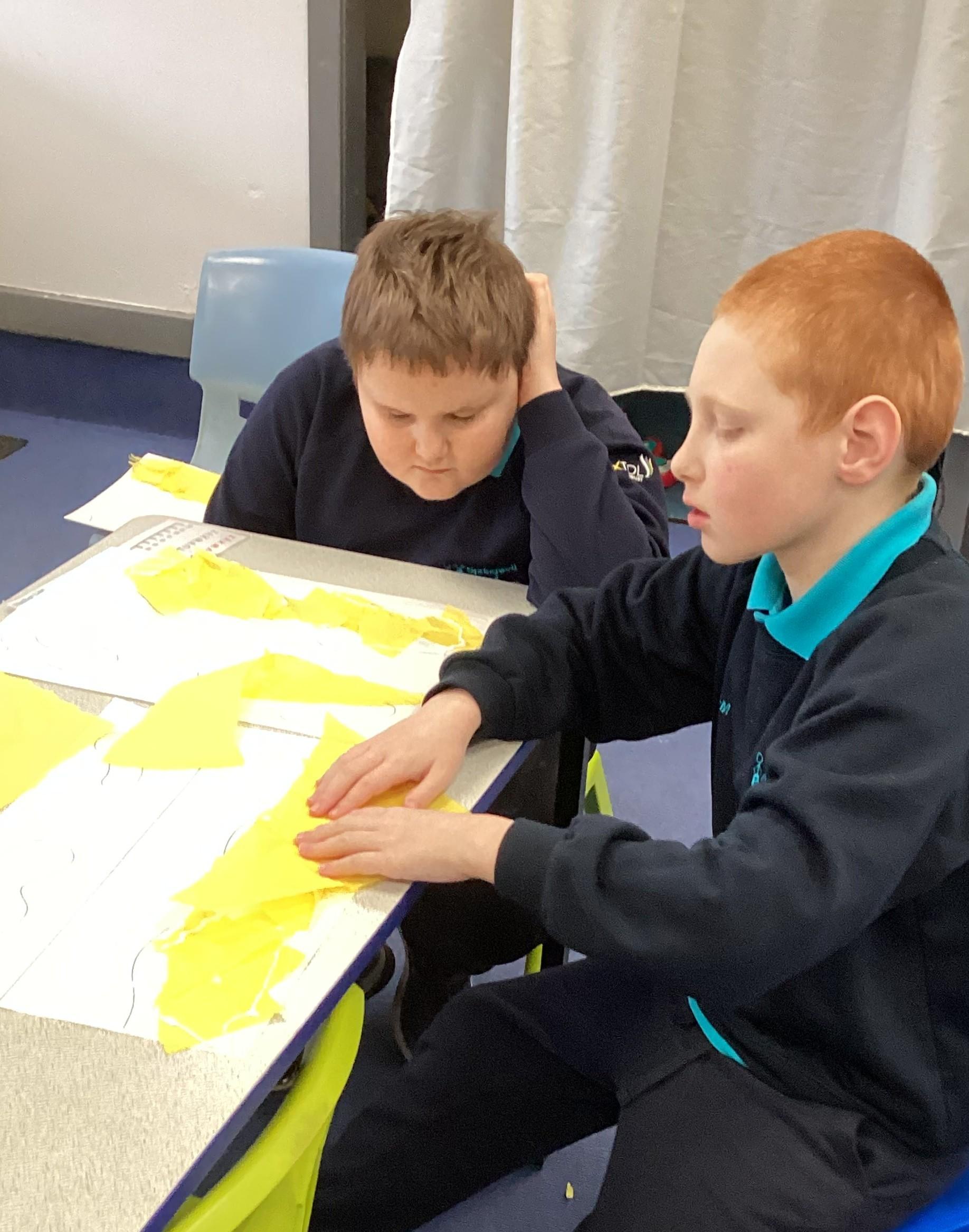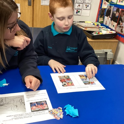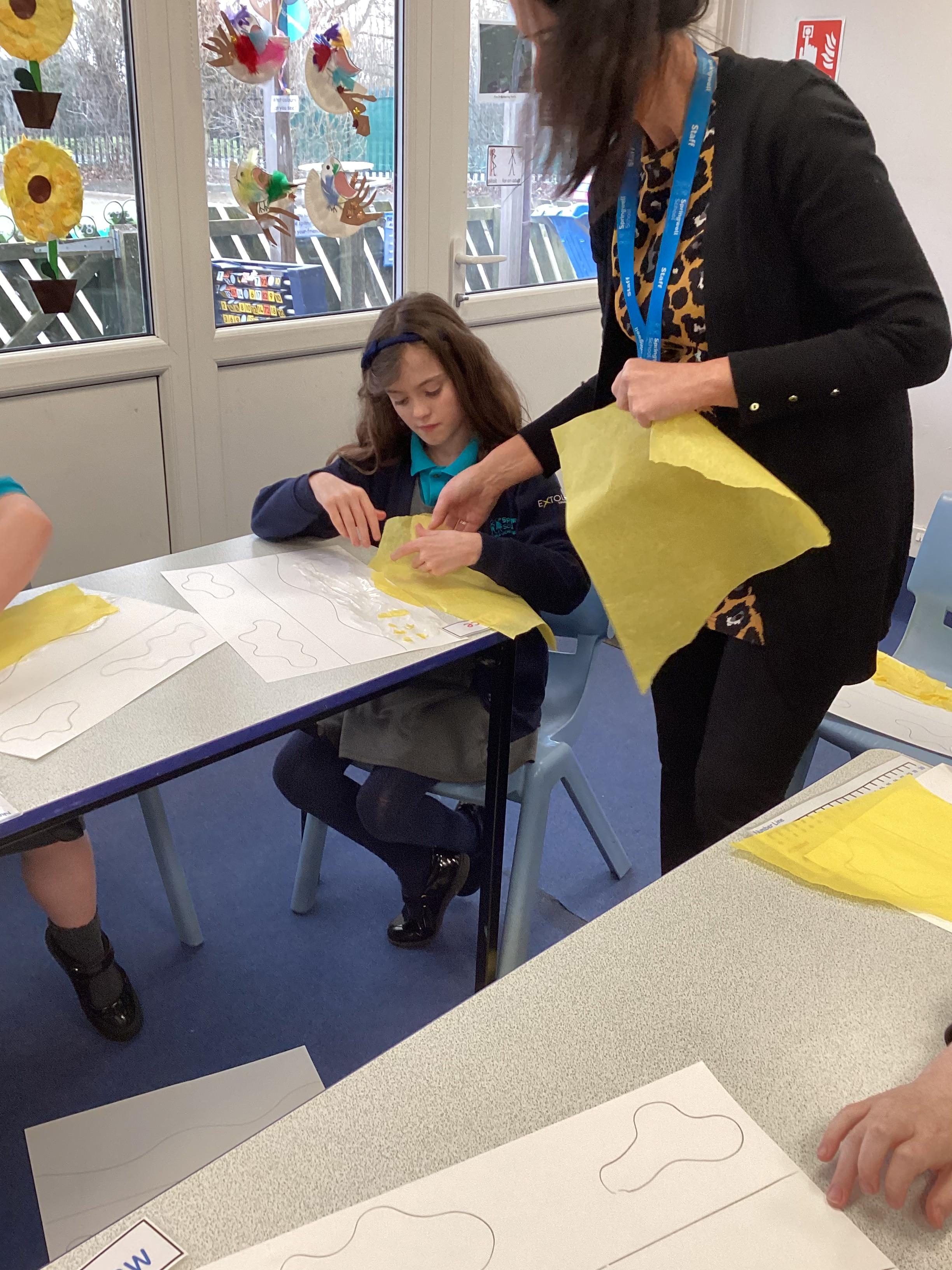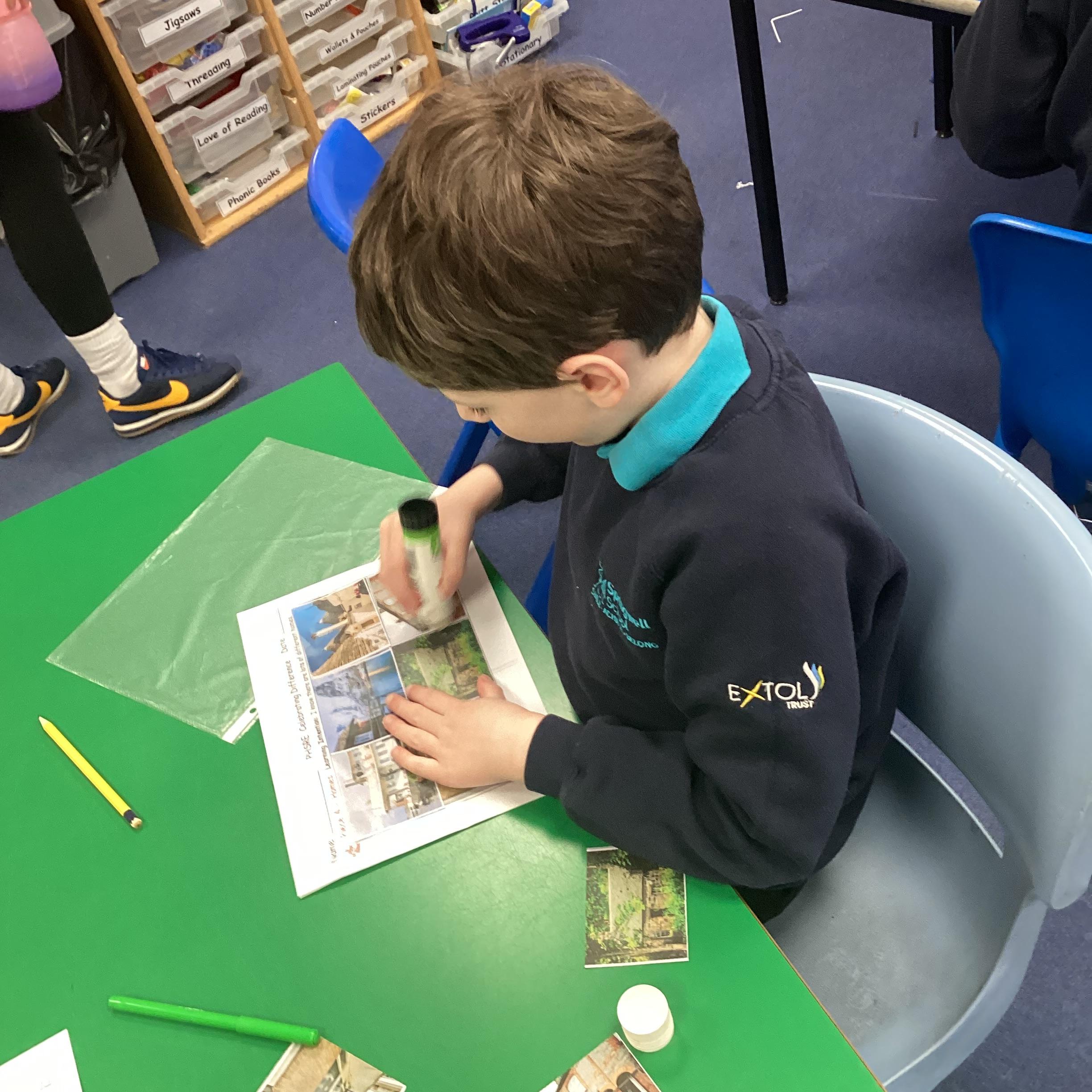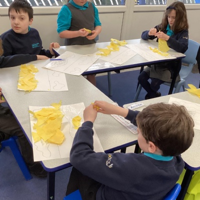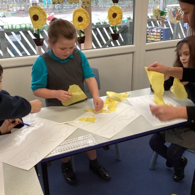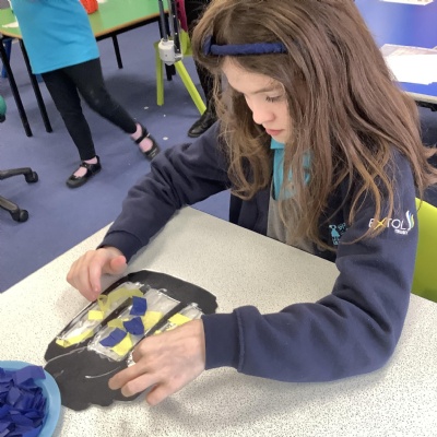 17.02.25 ART: CREATING COLLAGE OF SEATON SEA FRONT We took photos of the sea front, and we asked the children what they could see? The children said they could see the sea, sky, clouds, sand and people walking on the beach. We created a collage of the beach in the style of Megan Coyle using different coloured tissue paper.