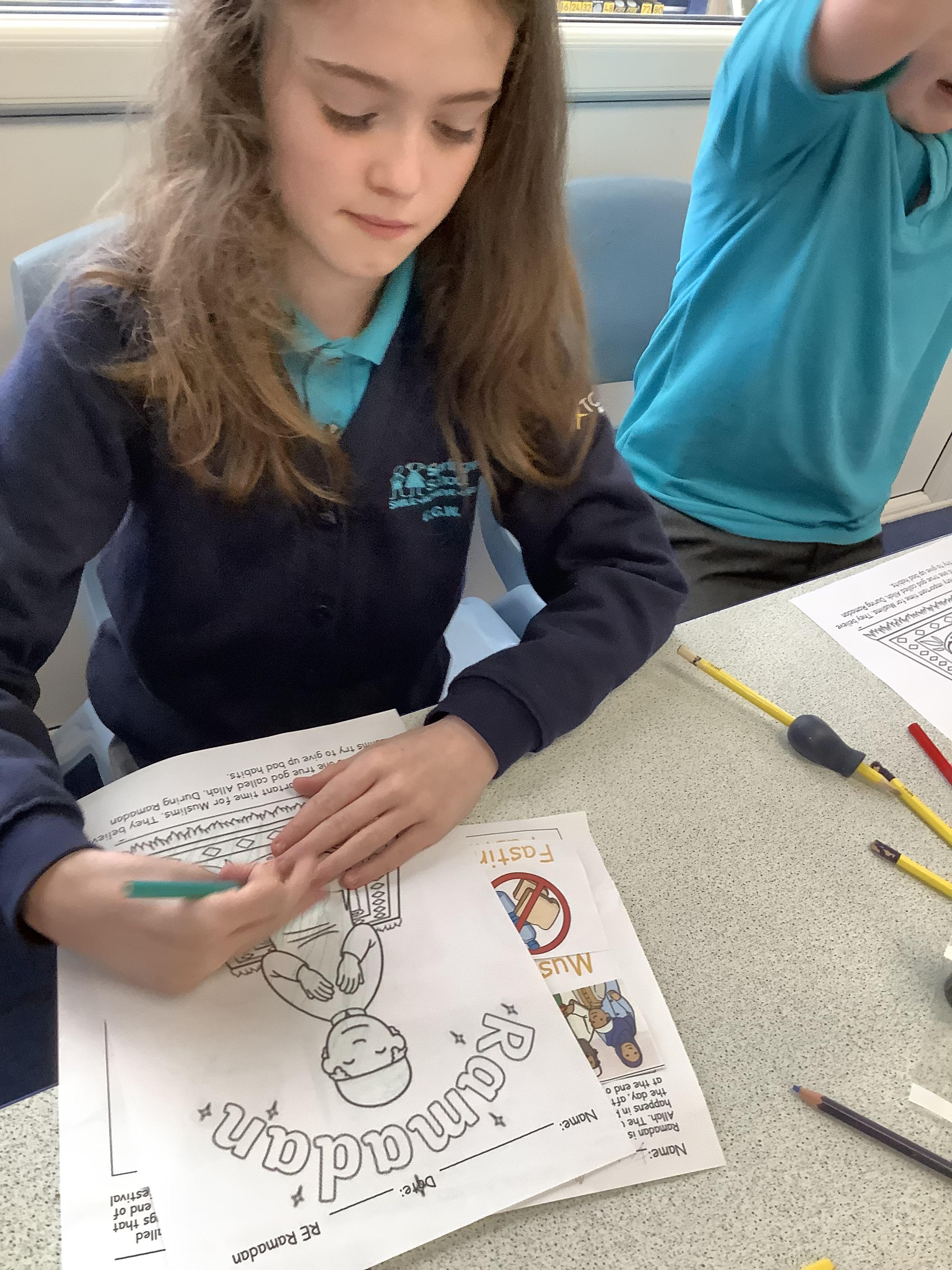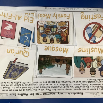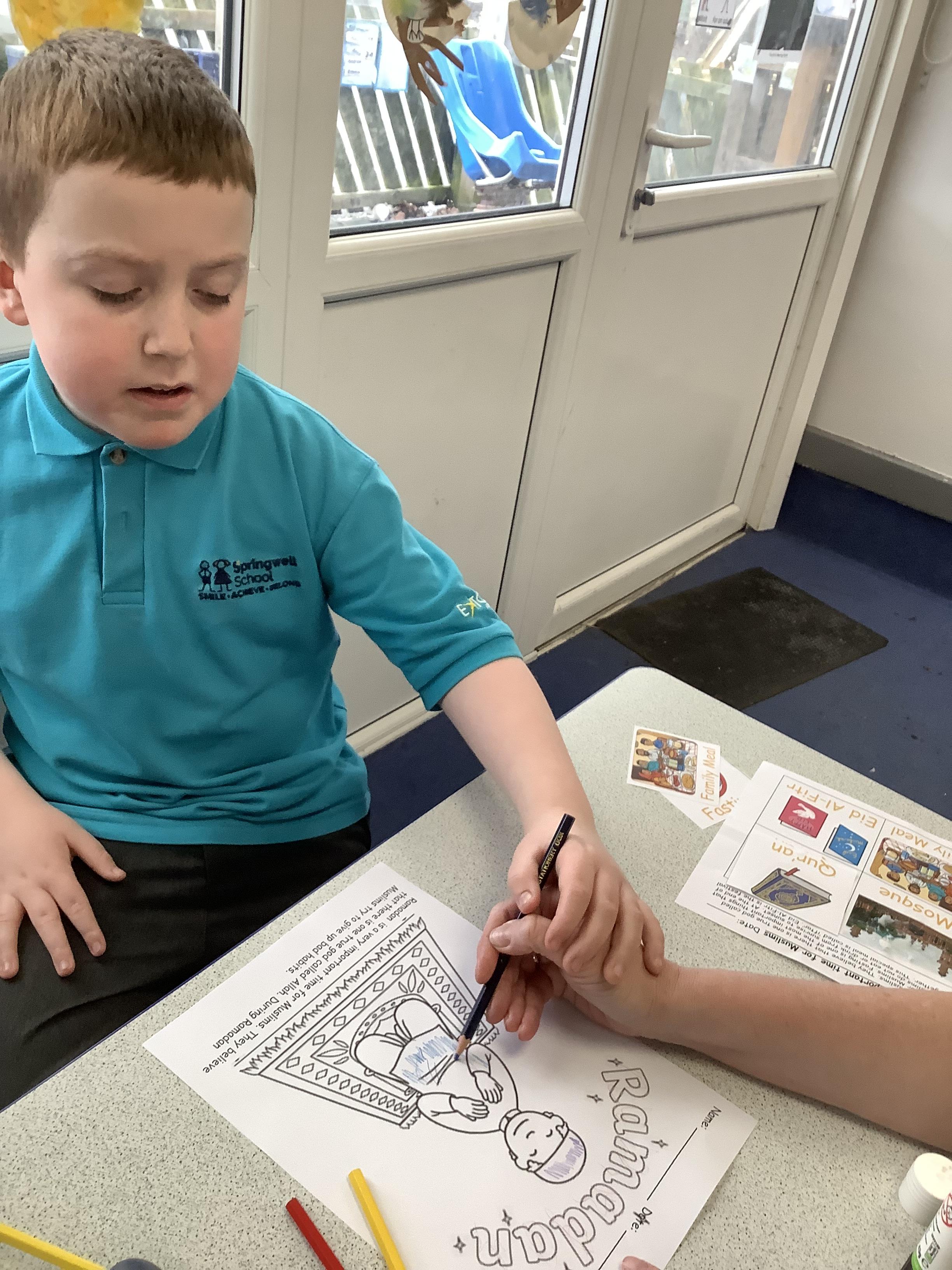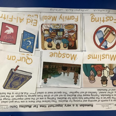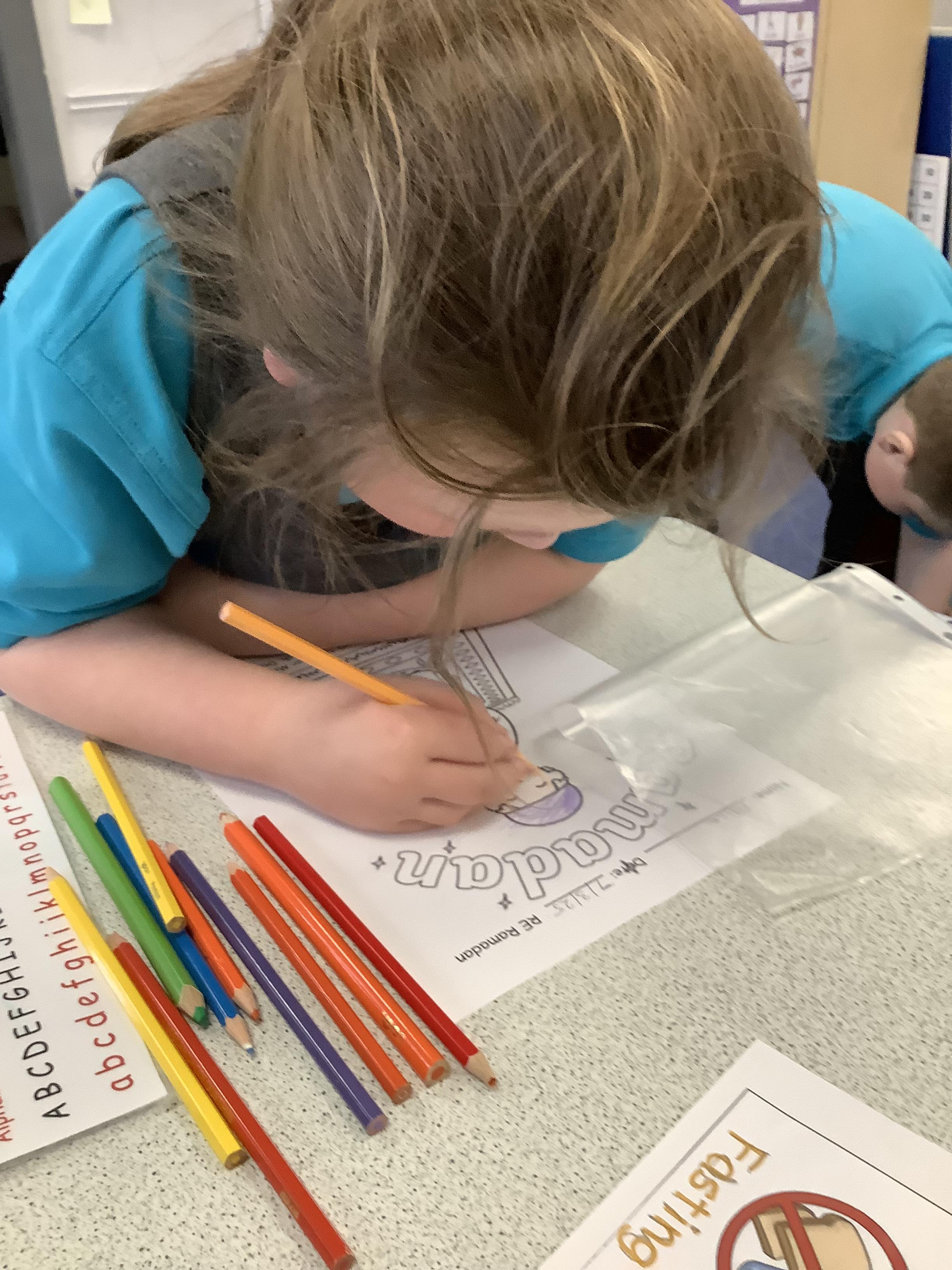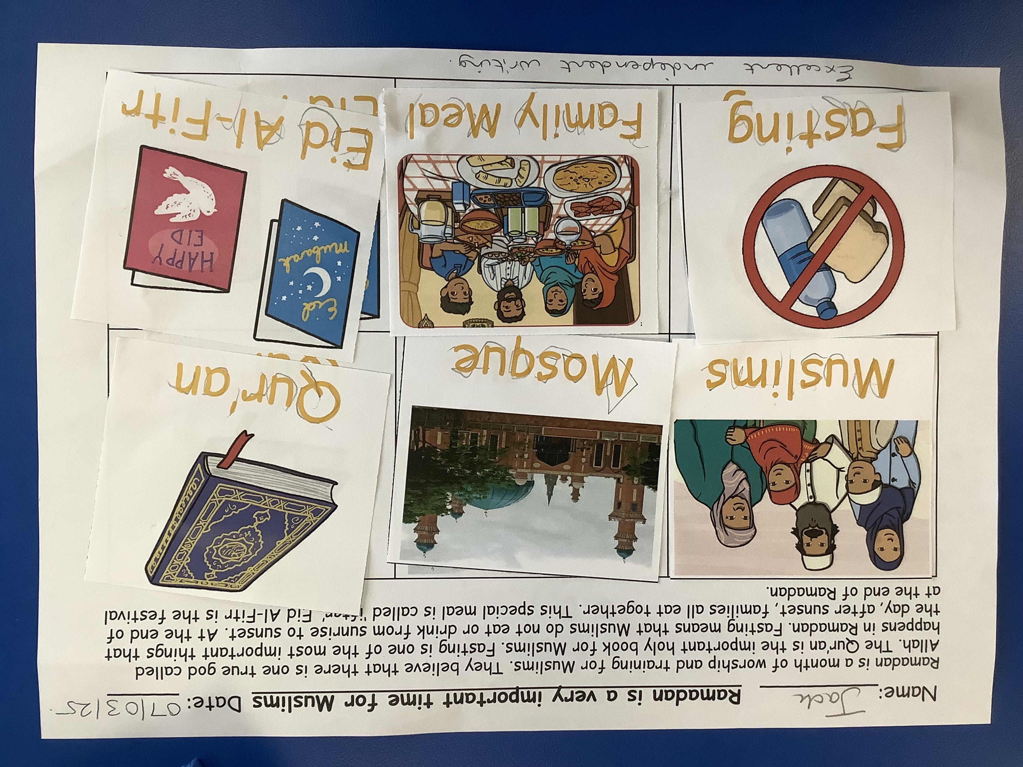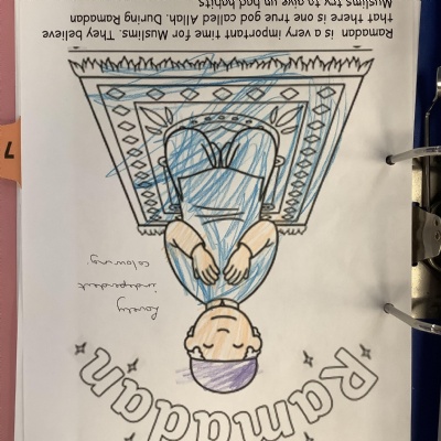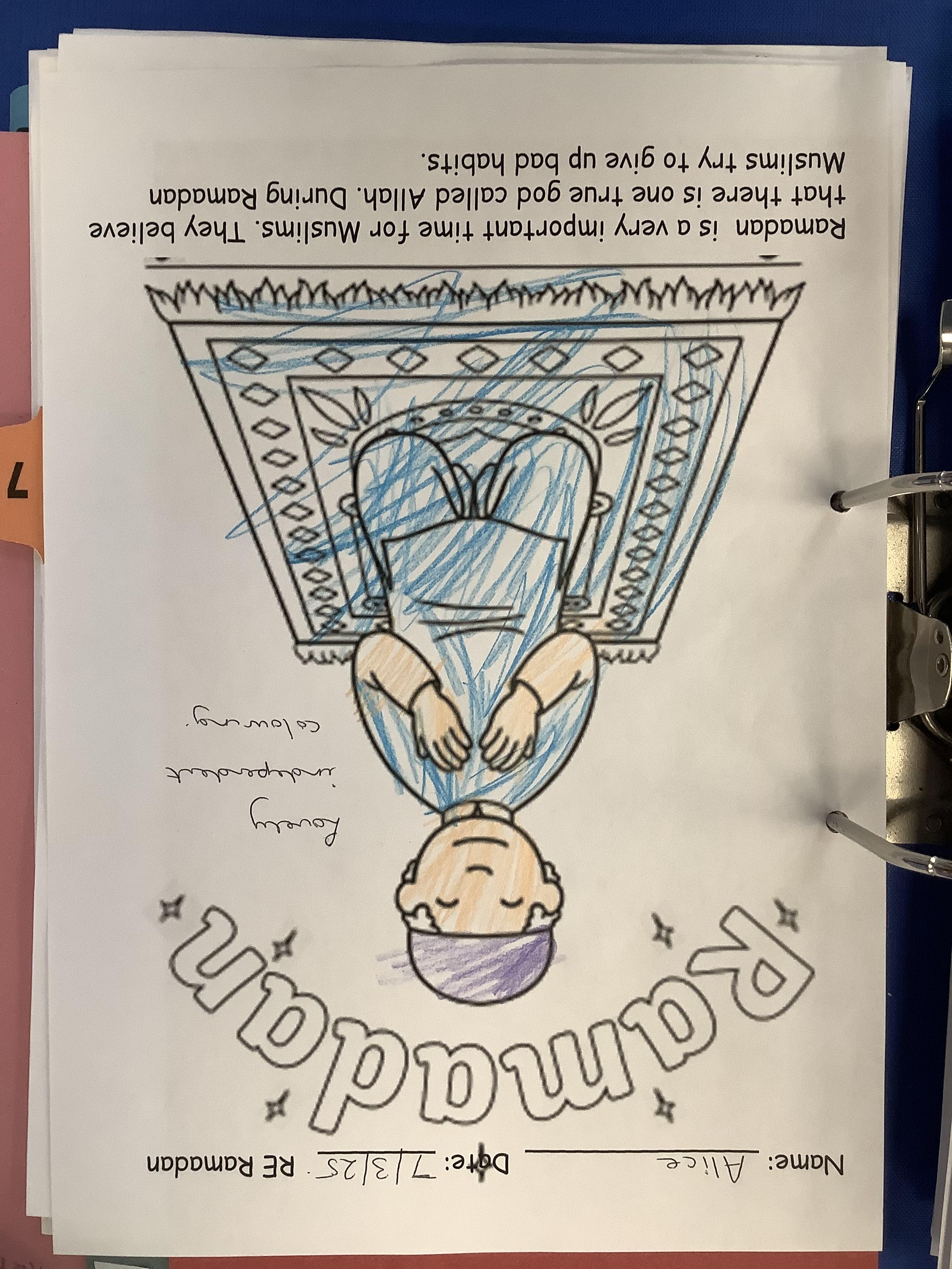 03.03.25 RE: RAMADAN We read the story called: 'Rameena's Ramadan'. We discussed how Ramadan is a very important time from Muslims and it lasts for 29-30 days. We spoke about how they go to Mosques to pray to their god called Allah. We discussed all the different things muslin people do during Ramadan e.g. give up bad habits, fasting, pray and read the Qur'an, celebrate after fasting, Eid Al-Fitr, wear their best clothes, share a luxury family meal etc.