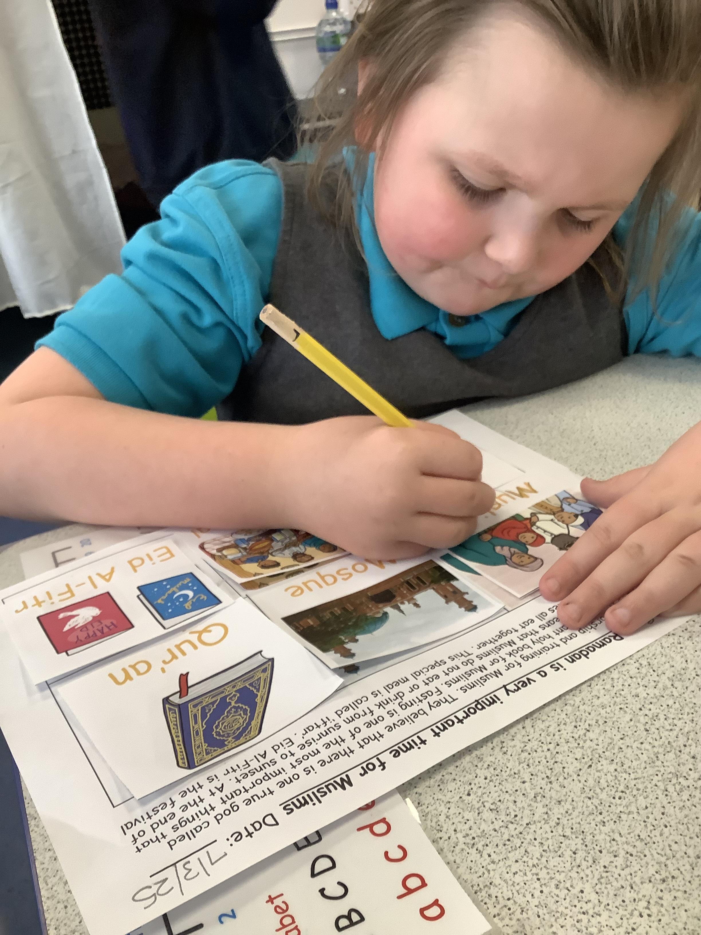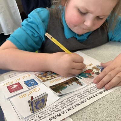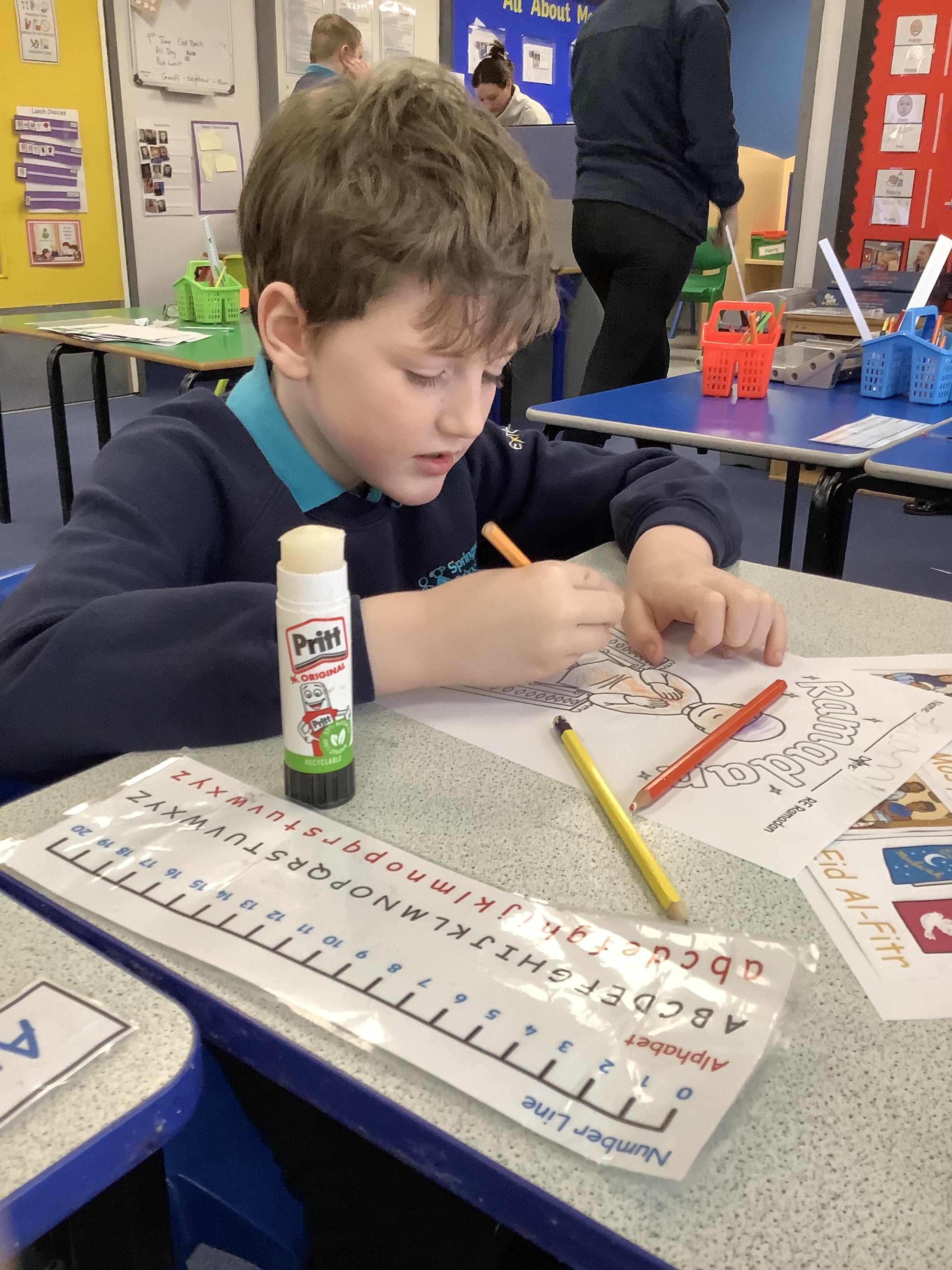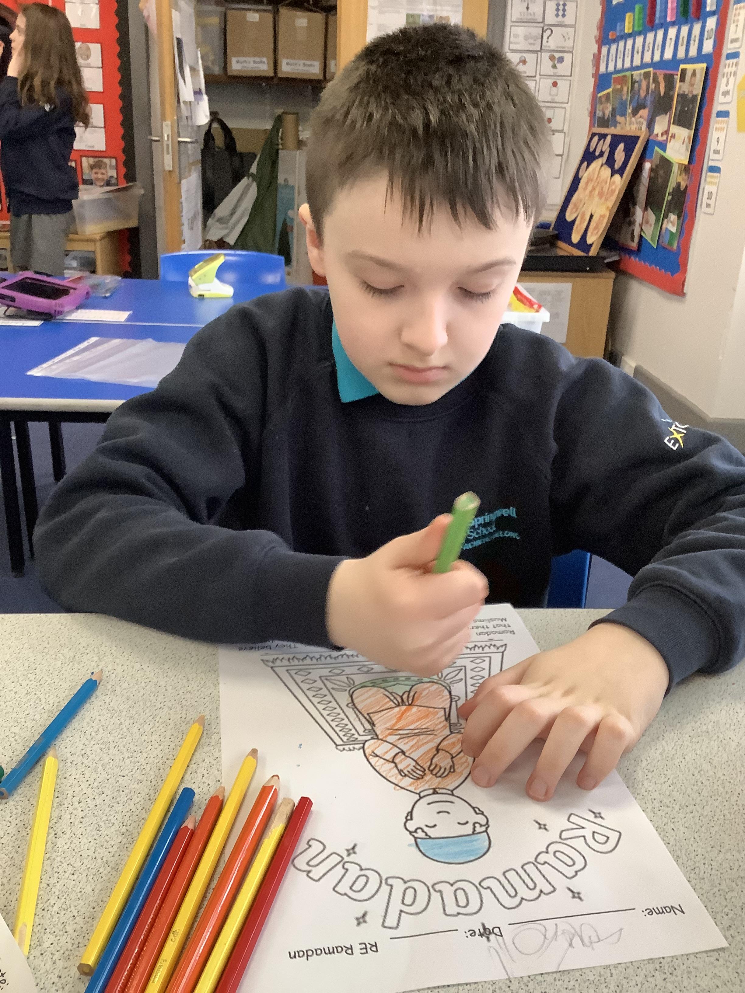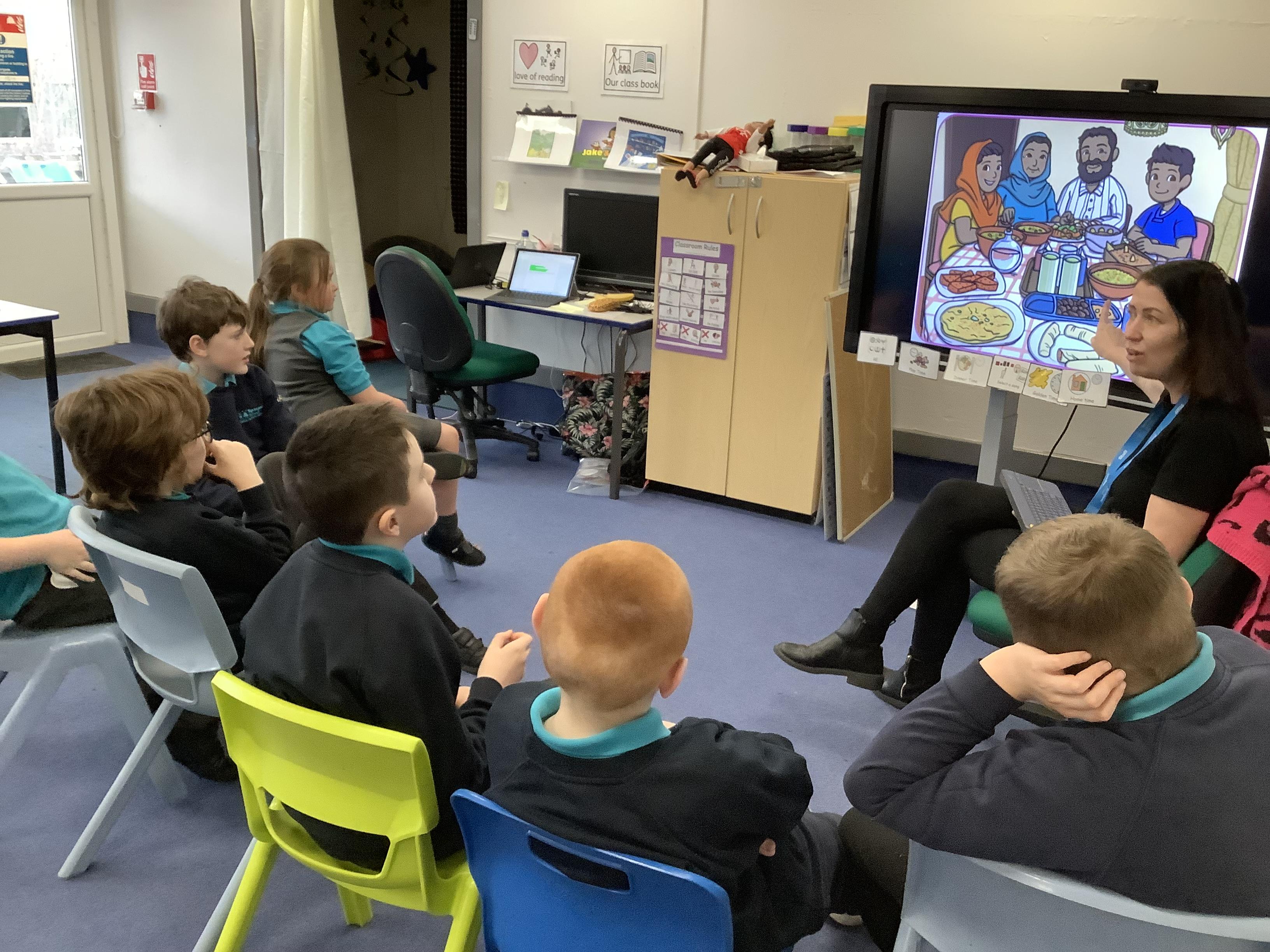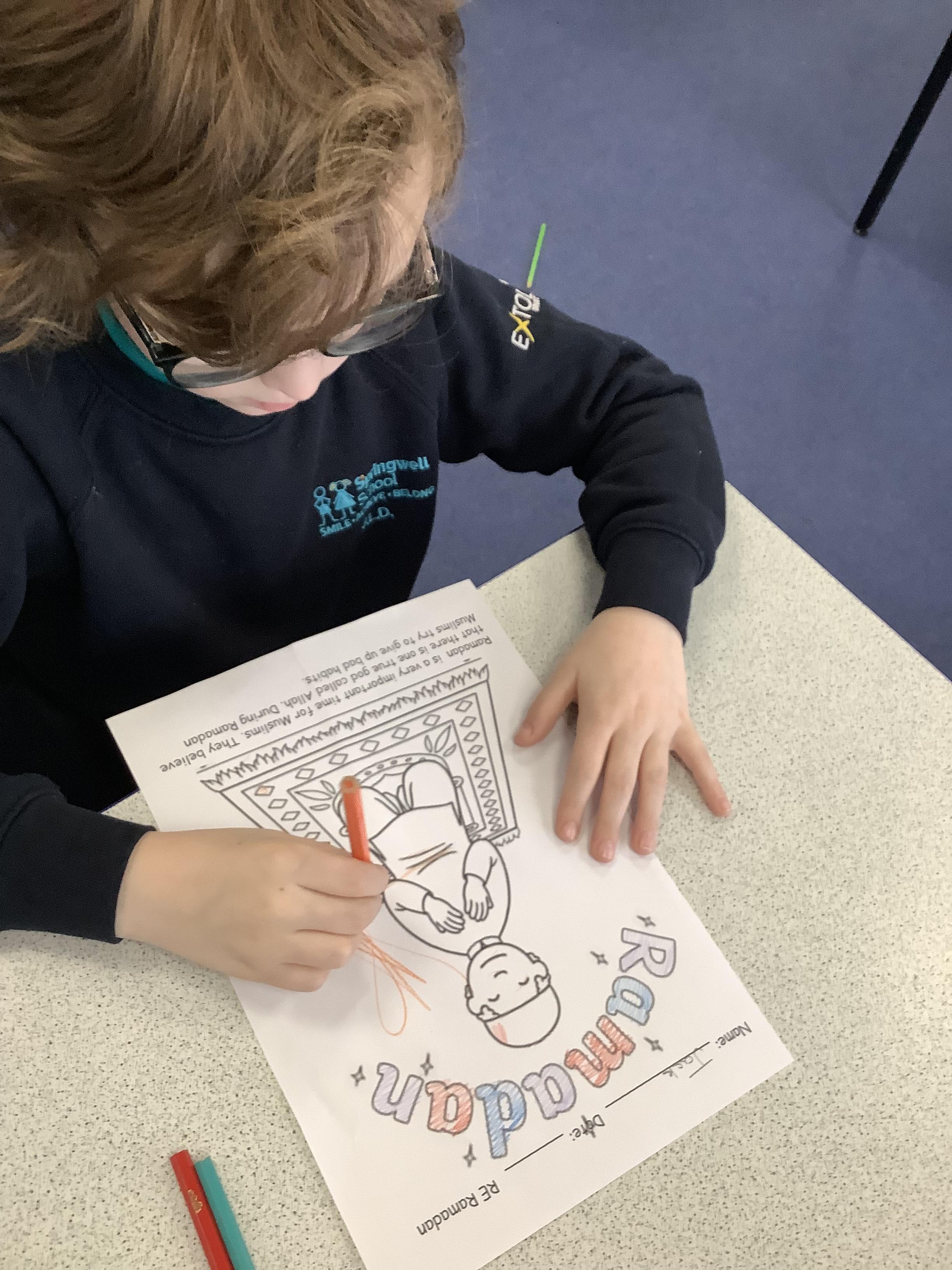 03.03.25 RE: RAMADAN We read the story called: 'Rameena's Ramadan'. We discussed how Ramadan is a very important time from Muslims and it lasts for 29-30 days. We spoke about how they go to Mosques to pray to their god called Allah. We discussed all the different things muslin people do during Ramadan e.g. give up bad habits, fasting, pray and read the Qur'an, celebrate after fasting, Eid Al-Fitr, wear their best clothes, share a luxury family meal etc.
