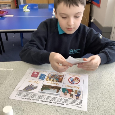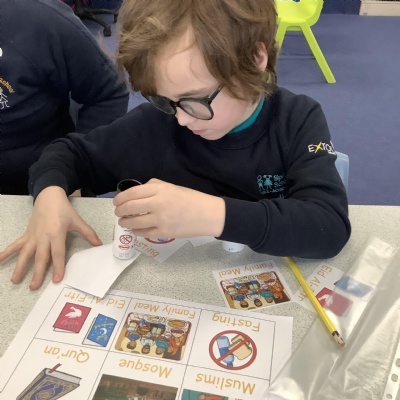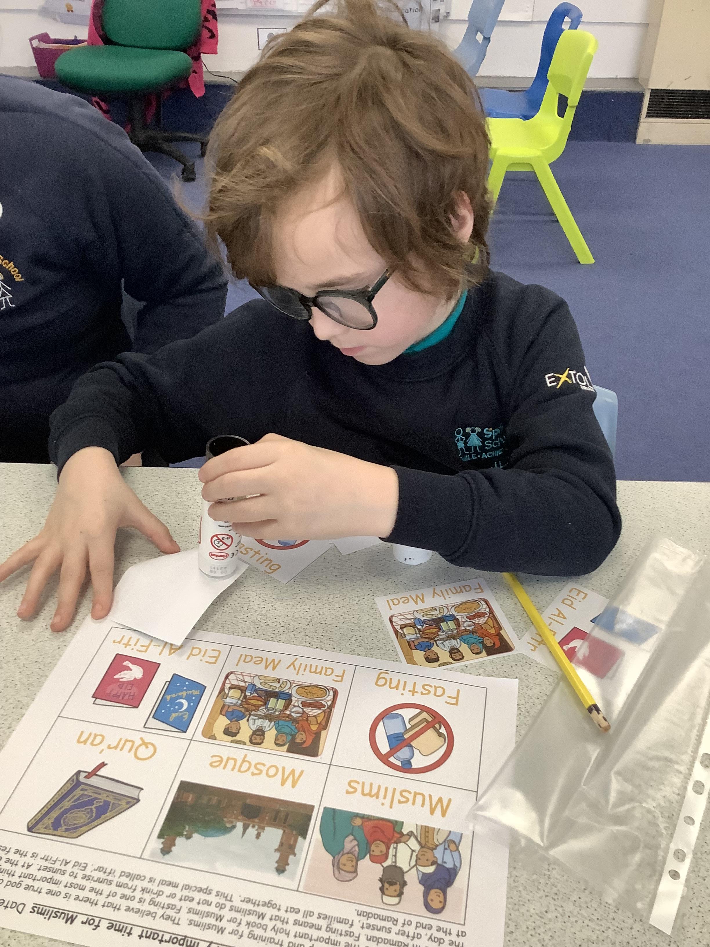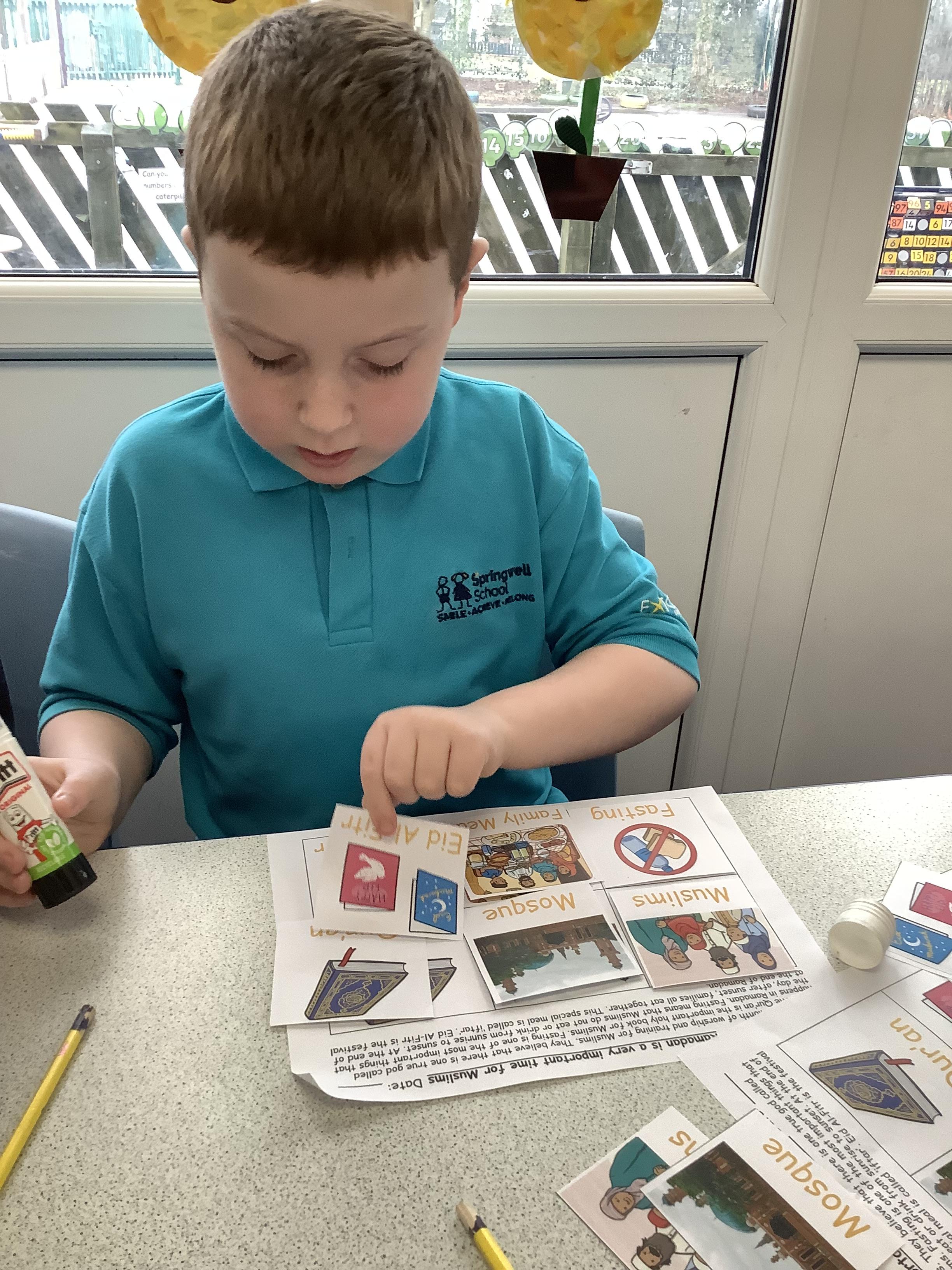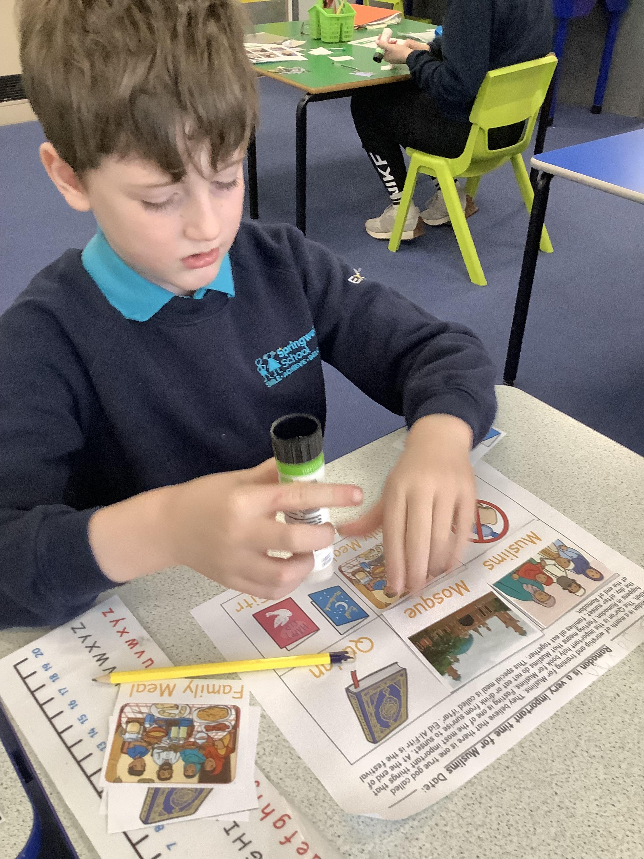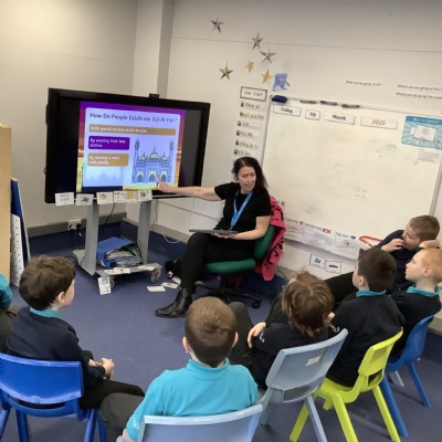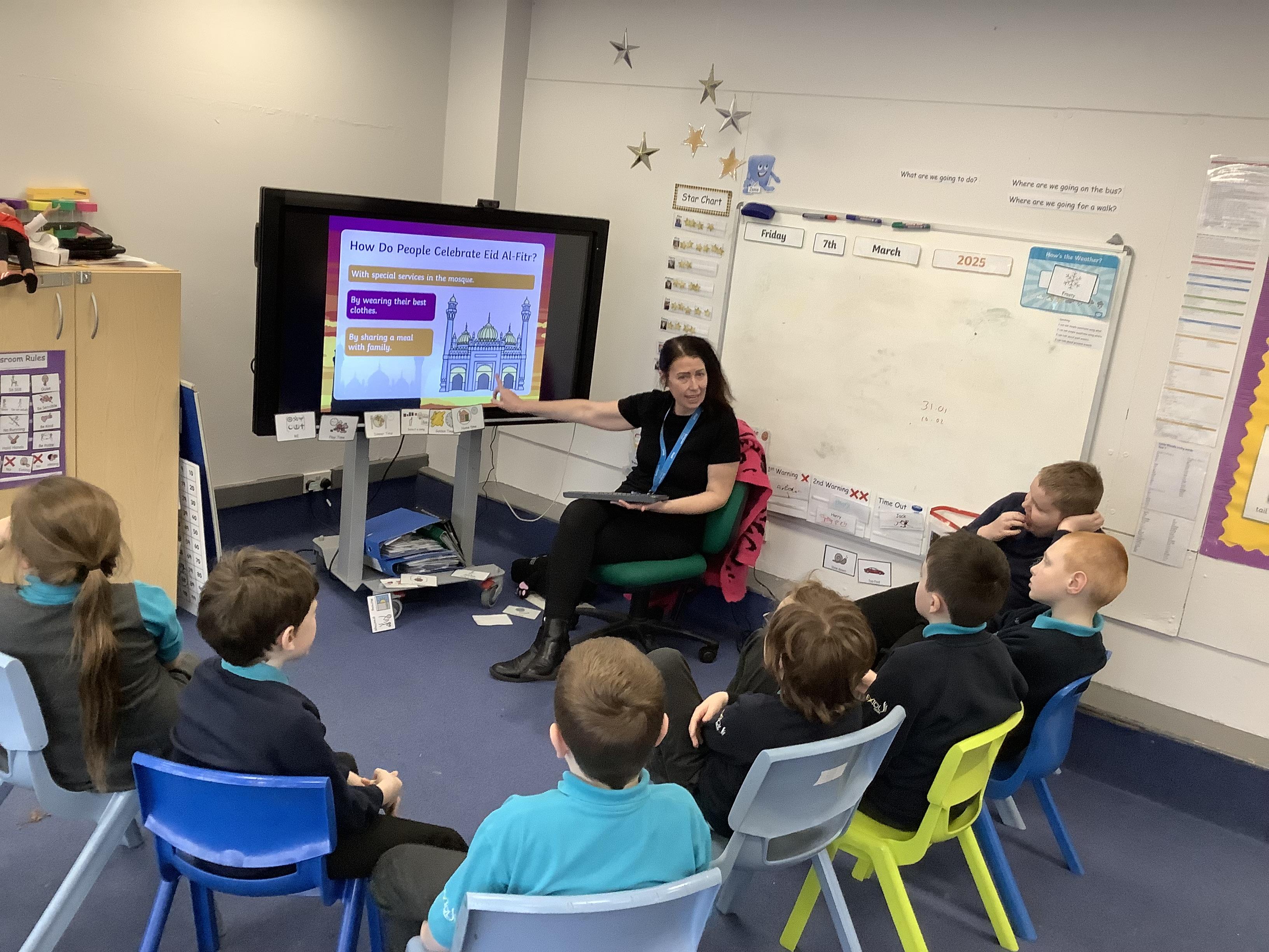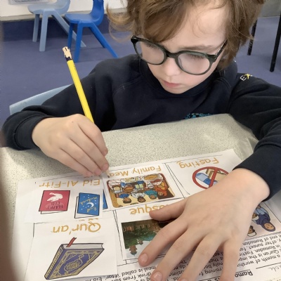 03.03.25 RE: RAMADAN We read the story called: 'Rameena's Ramadan'. We discussed how Ramadan is a very important time from Muslims and it lasts for 29-30 days. We spoke about how they go to Mosques to pray to their god called Allah. We discussed all the different things muslin people do during Ramadan e.g. give up bad habits, fasting, pray and read the Qur'an, celebrate after fasting, Eid Al-Fitr, wear their best clothes, share a luxury family meal etc.