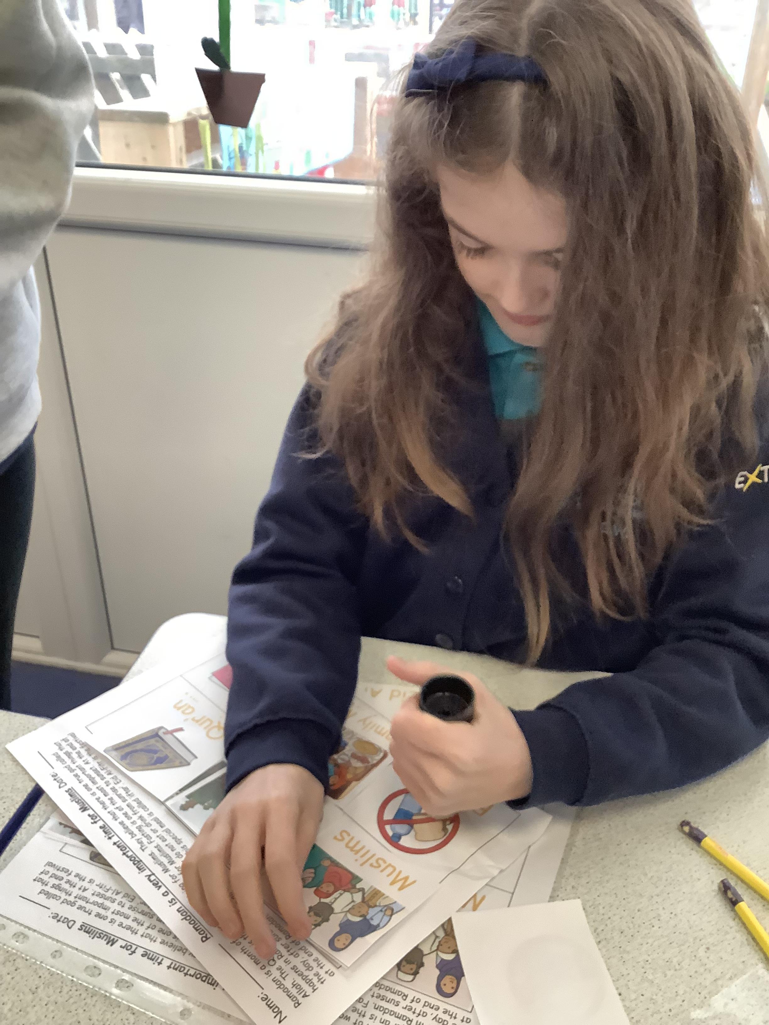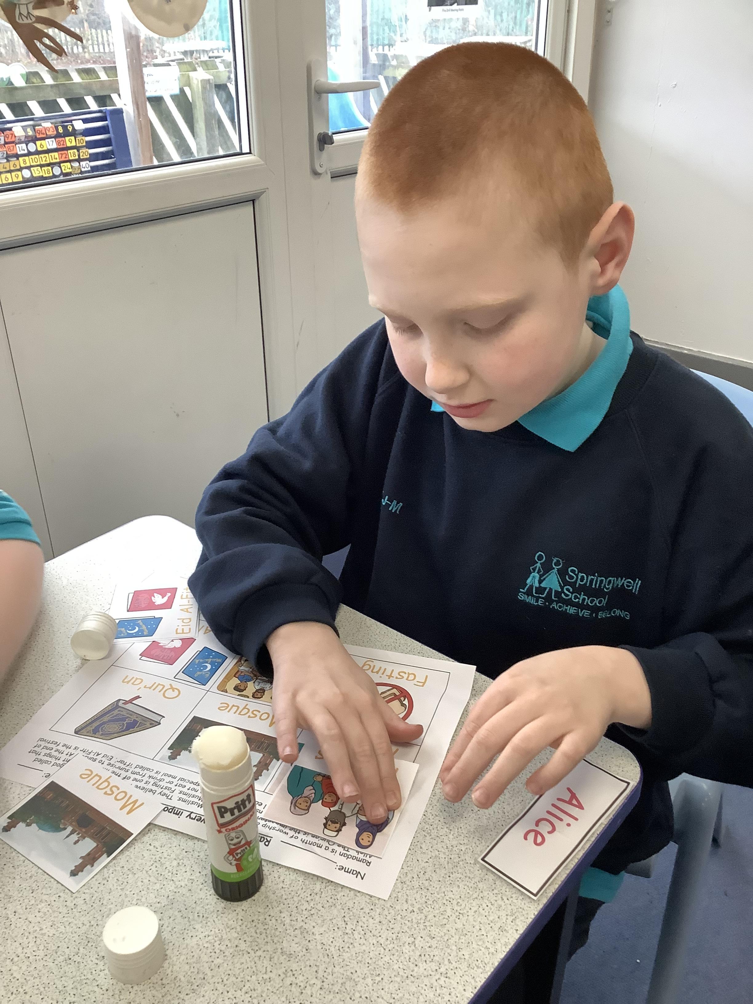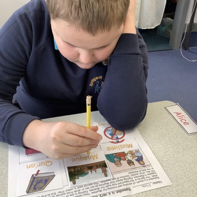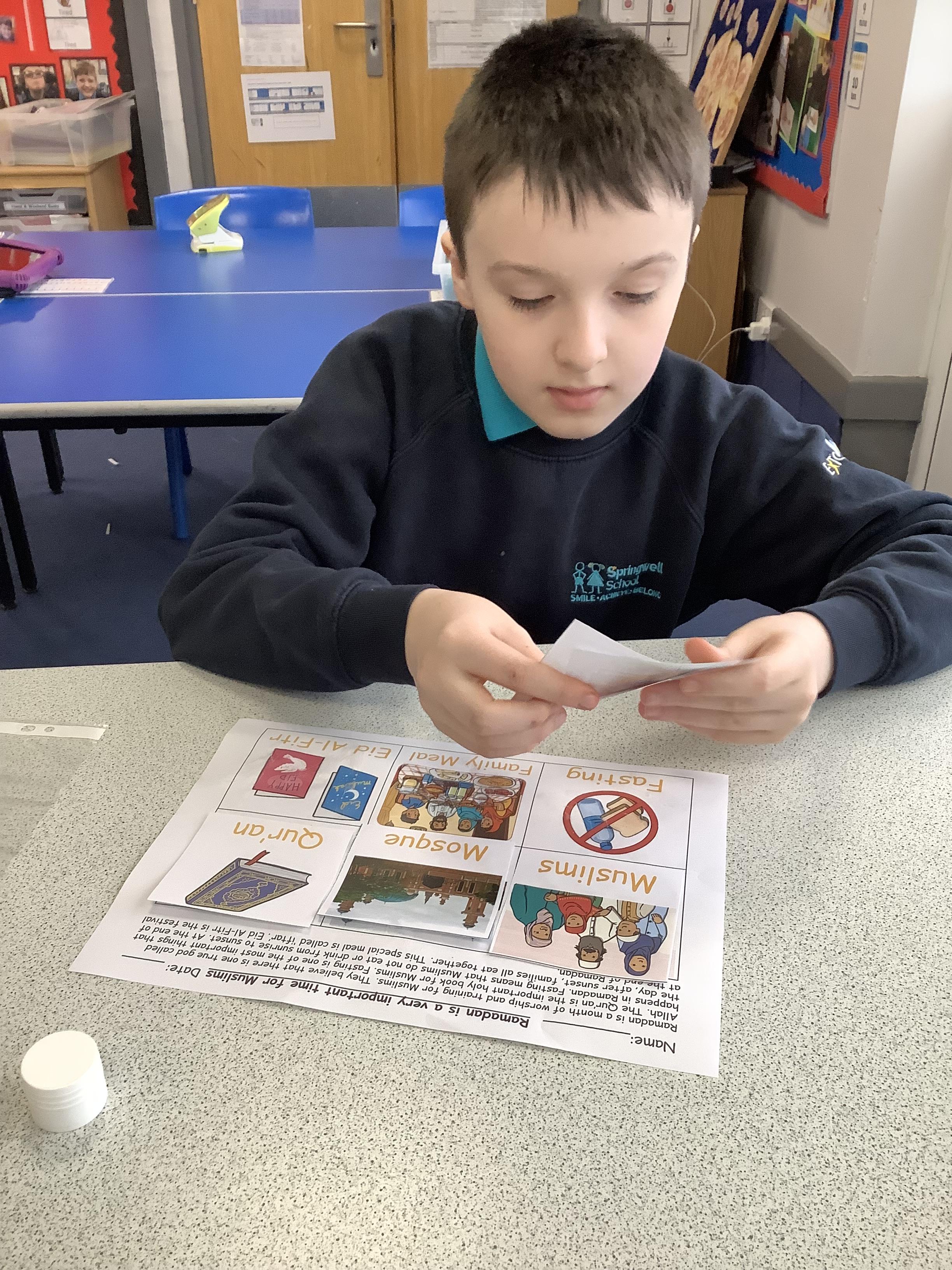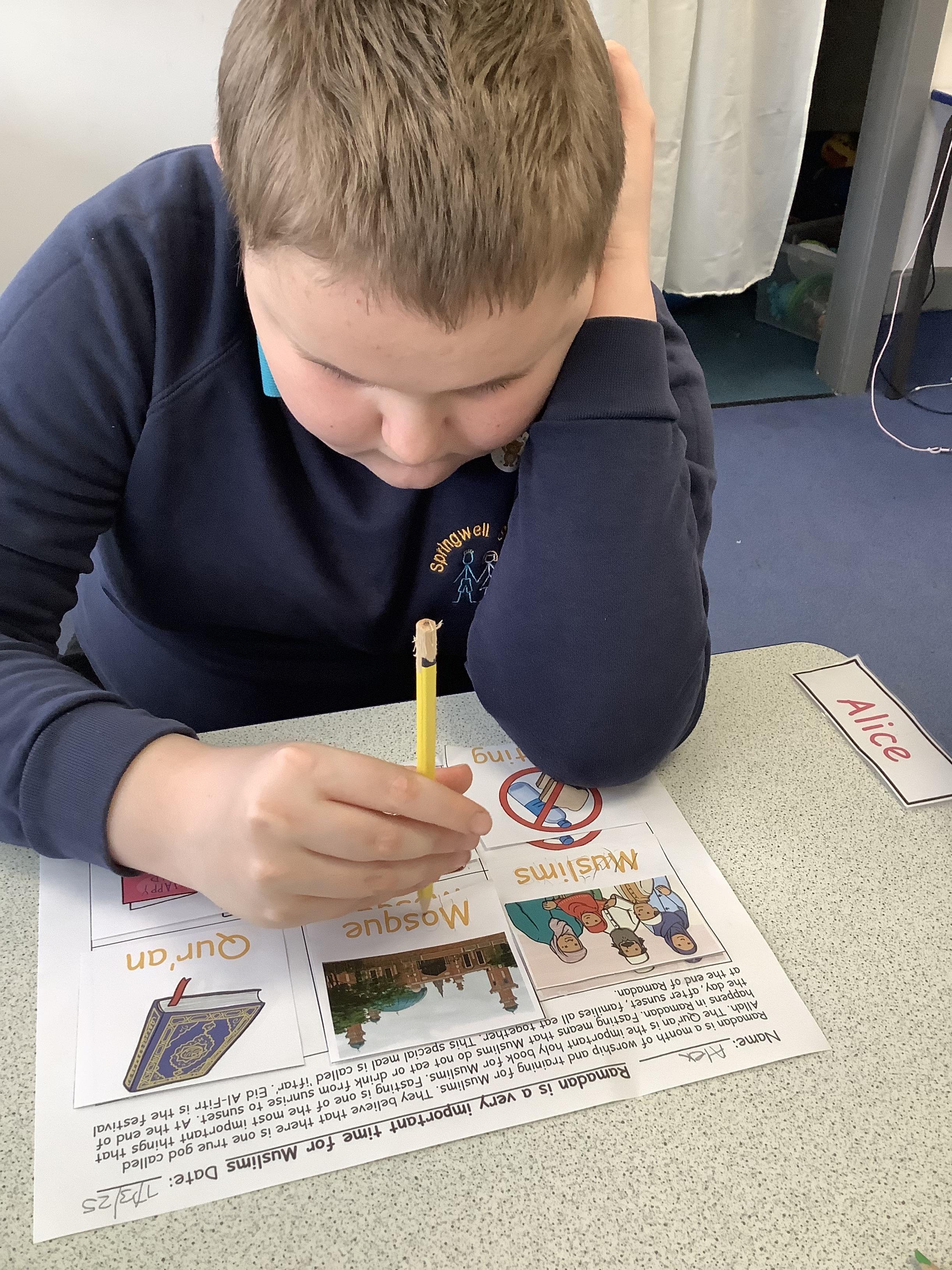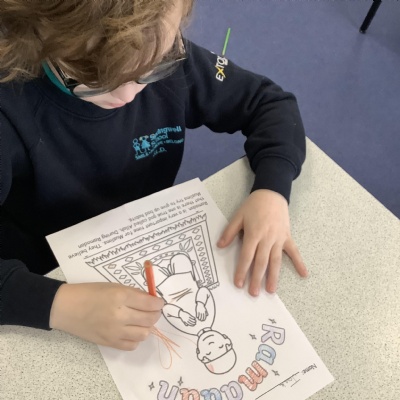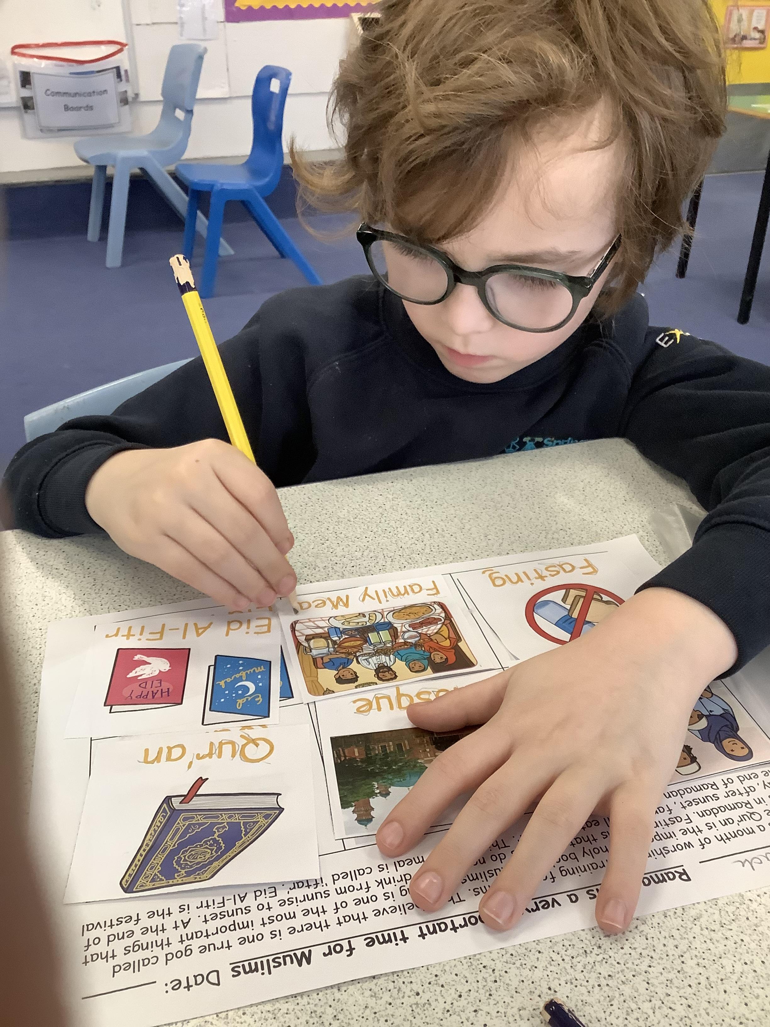 03.03.25 RE: RAMADAN We read the story called: 'Rameena's Ramadan'. We discussed how Ramadan is a very important time from Muslims and it lasts for 29-30 days. We spoke about how they go to Mosques to pray to their god called Allah. We discussed all the different things muslin people do during Ramadan e.g. give up bad habits, fasting, pray and read the Qur'an, celebrate after fasting, Eid Al-Fitr, wear their best clothes, share a luxury family meal etc.