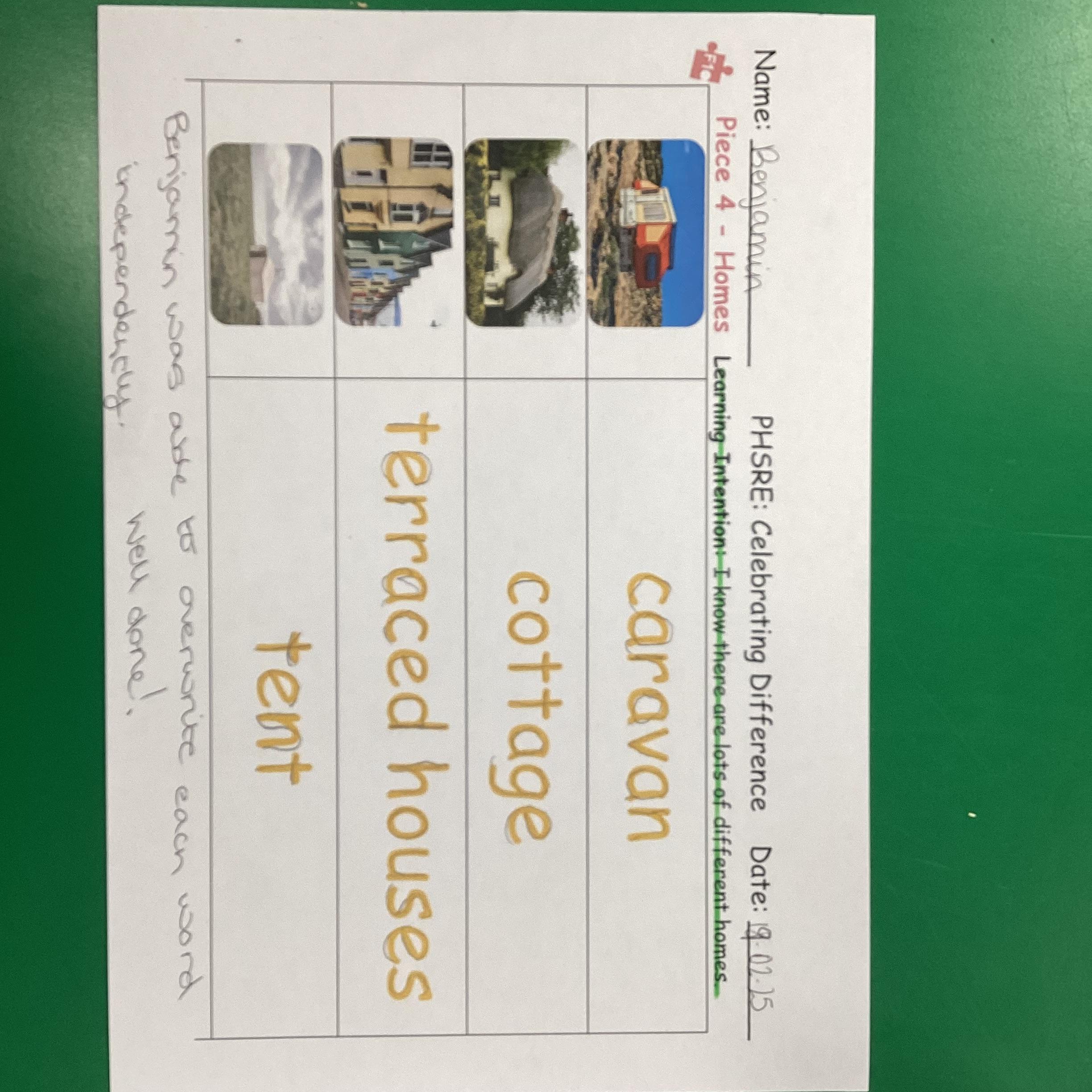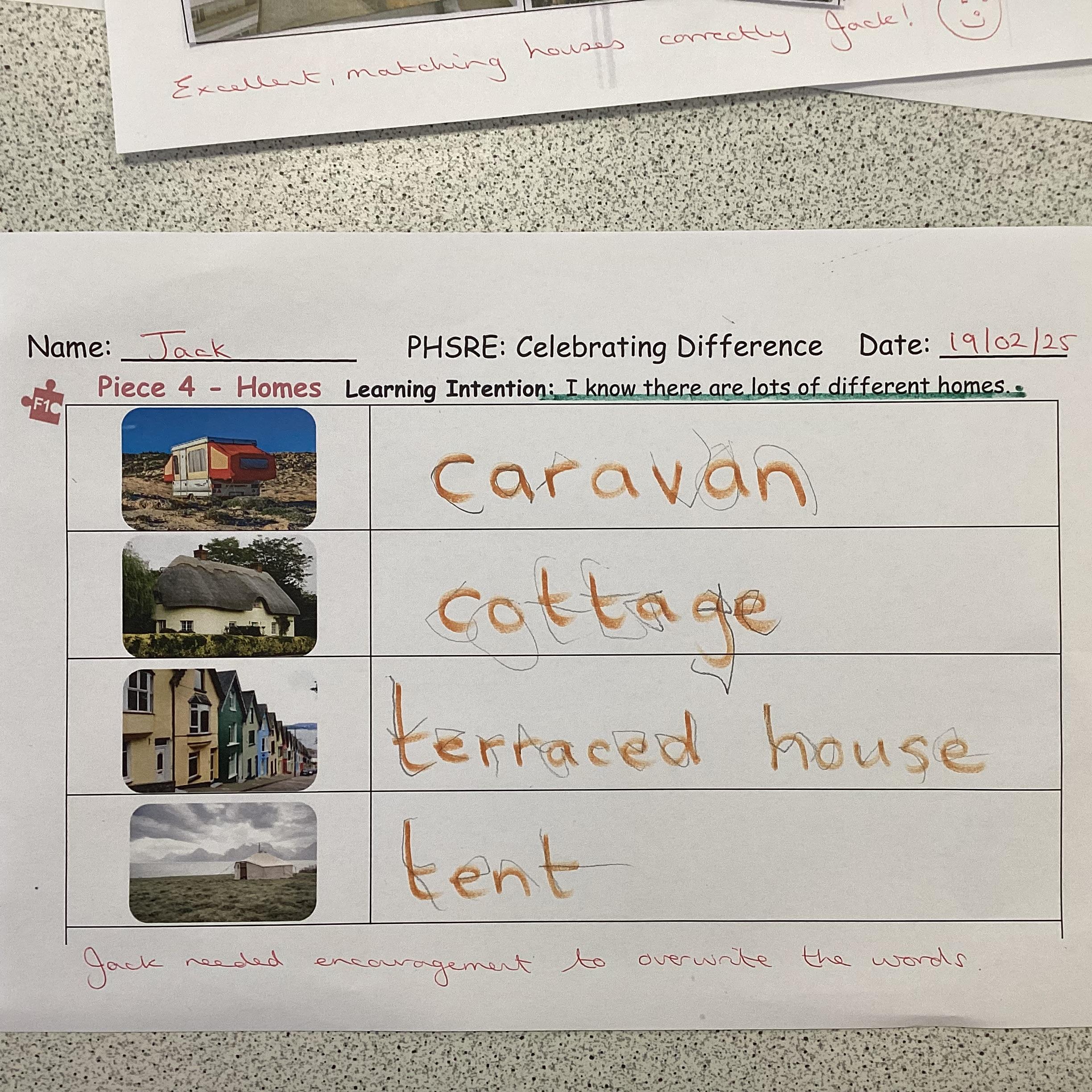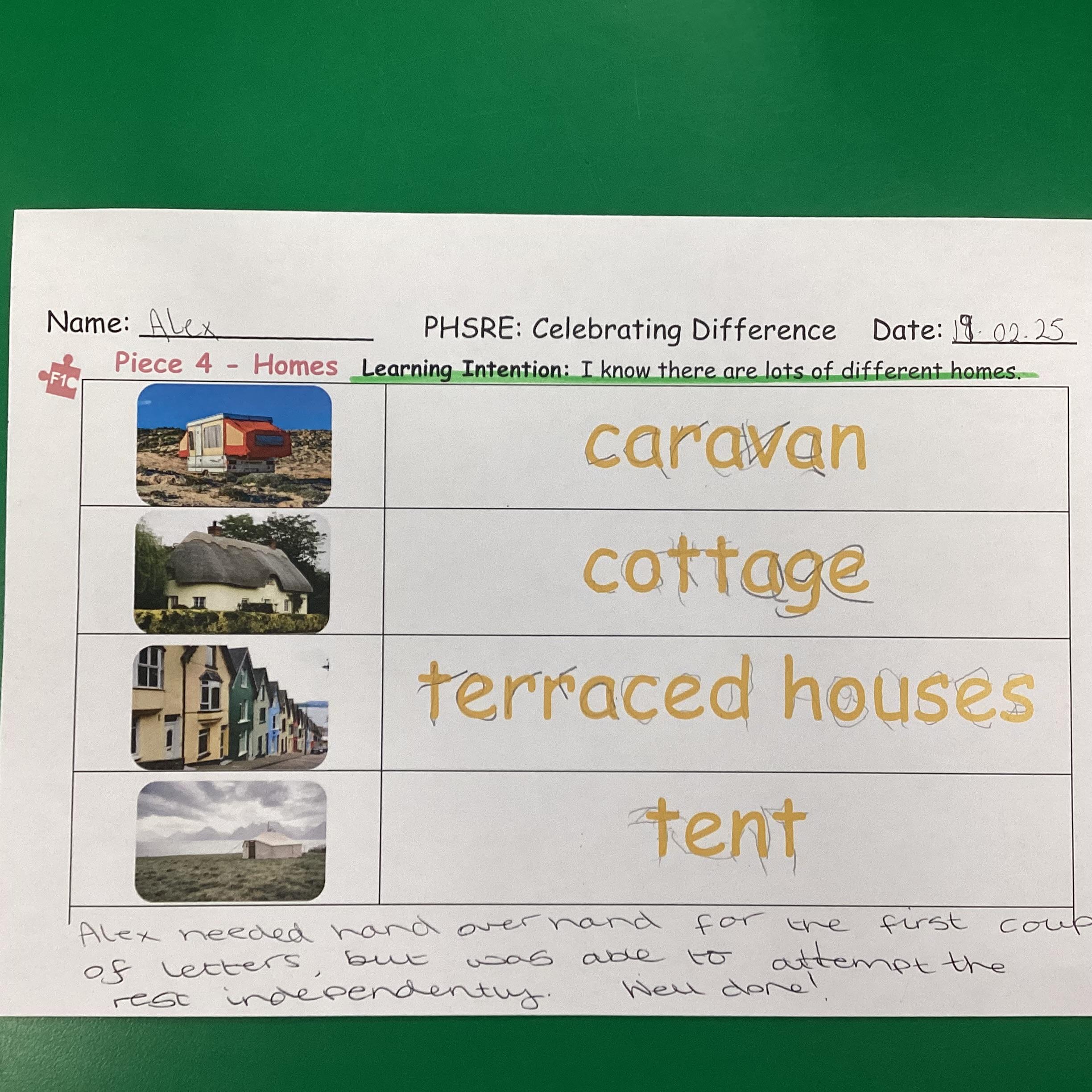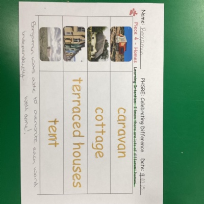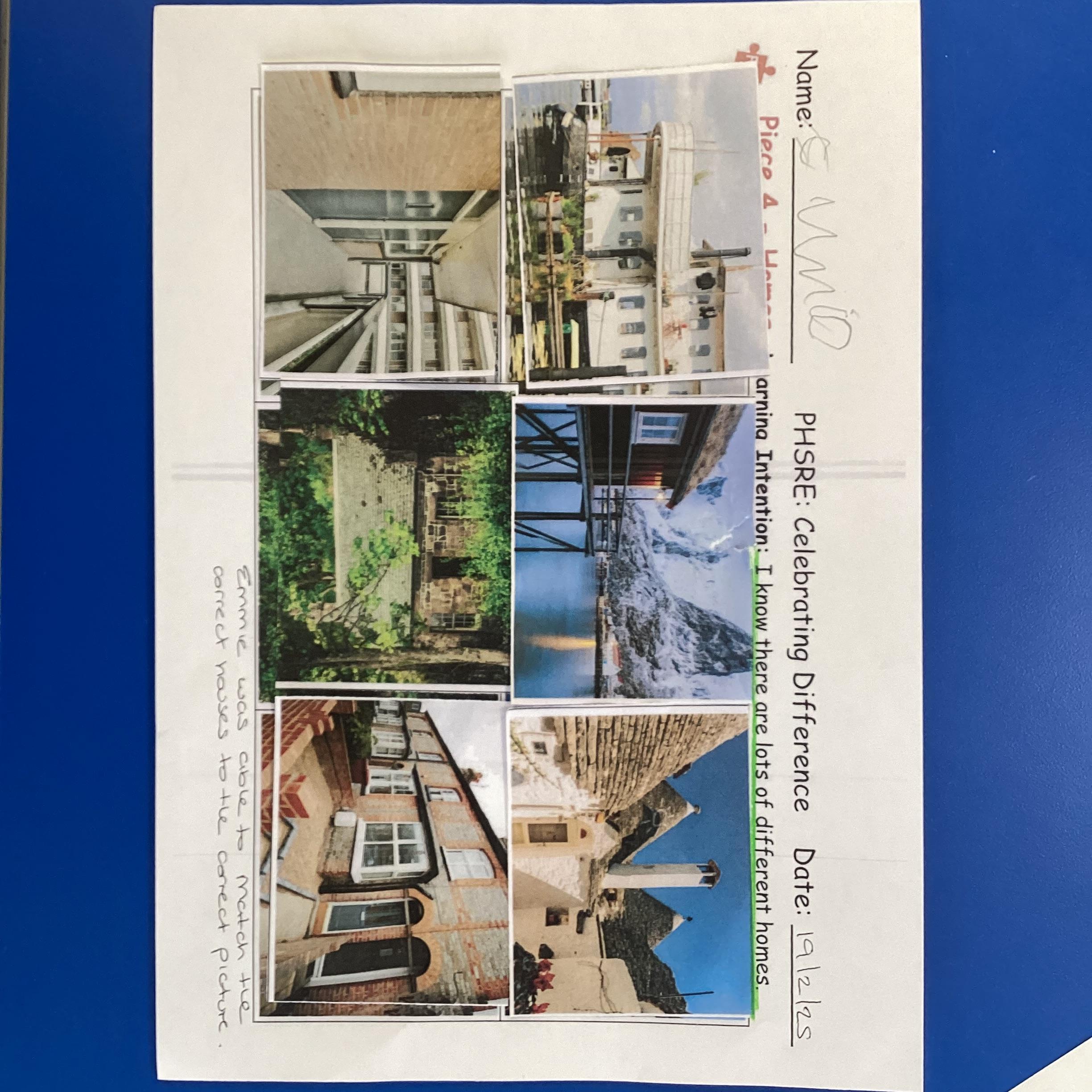 18.02.25 PHSRE CELEBRATING DIFFERENCE PIECE 4: HOMES We looked at a variety of photos showing different types of homes. The children were identifying and matching the different homes and writing a list. We all had a go at beating our new chime bar during 'calm me time'.