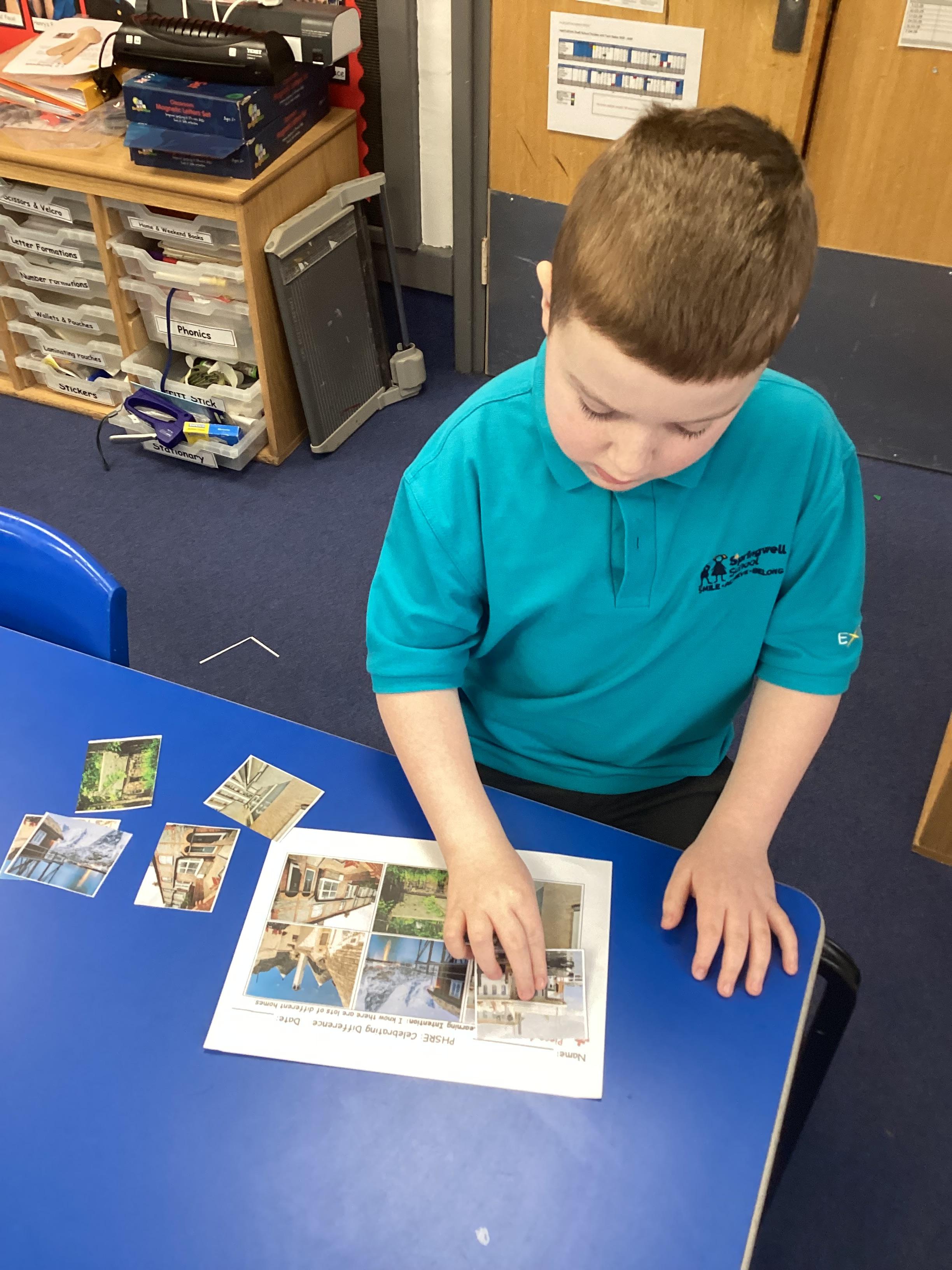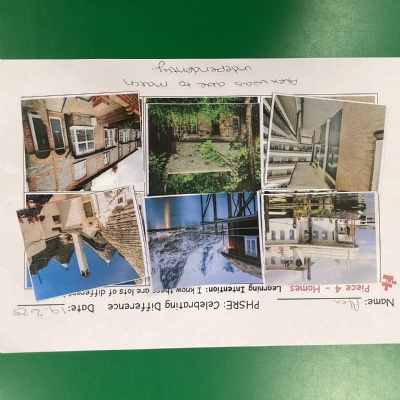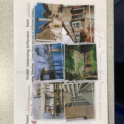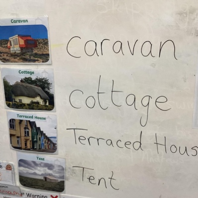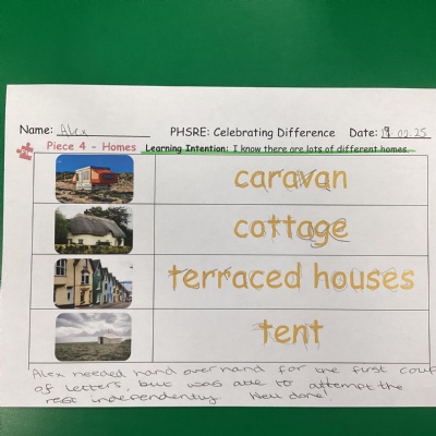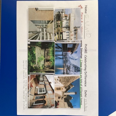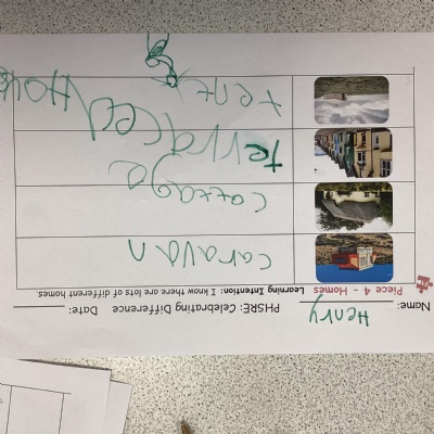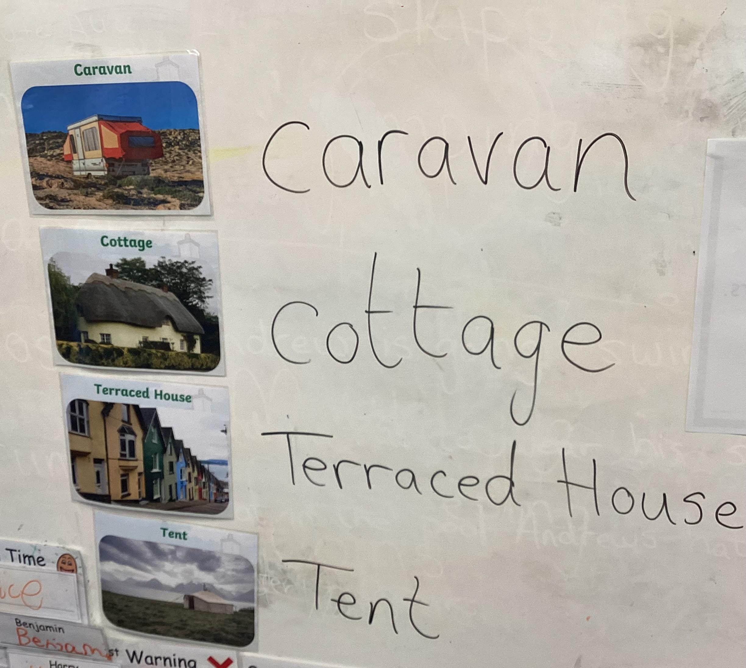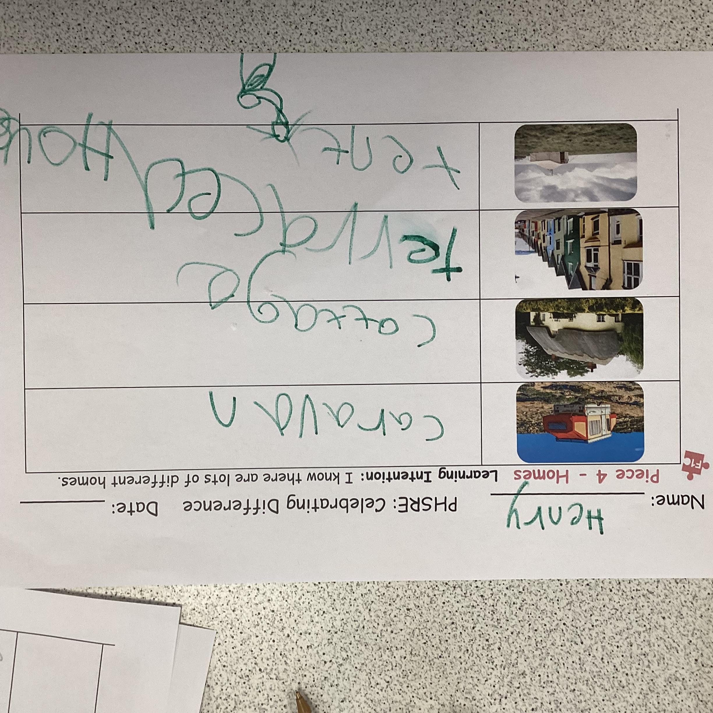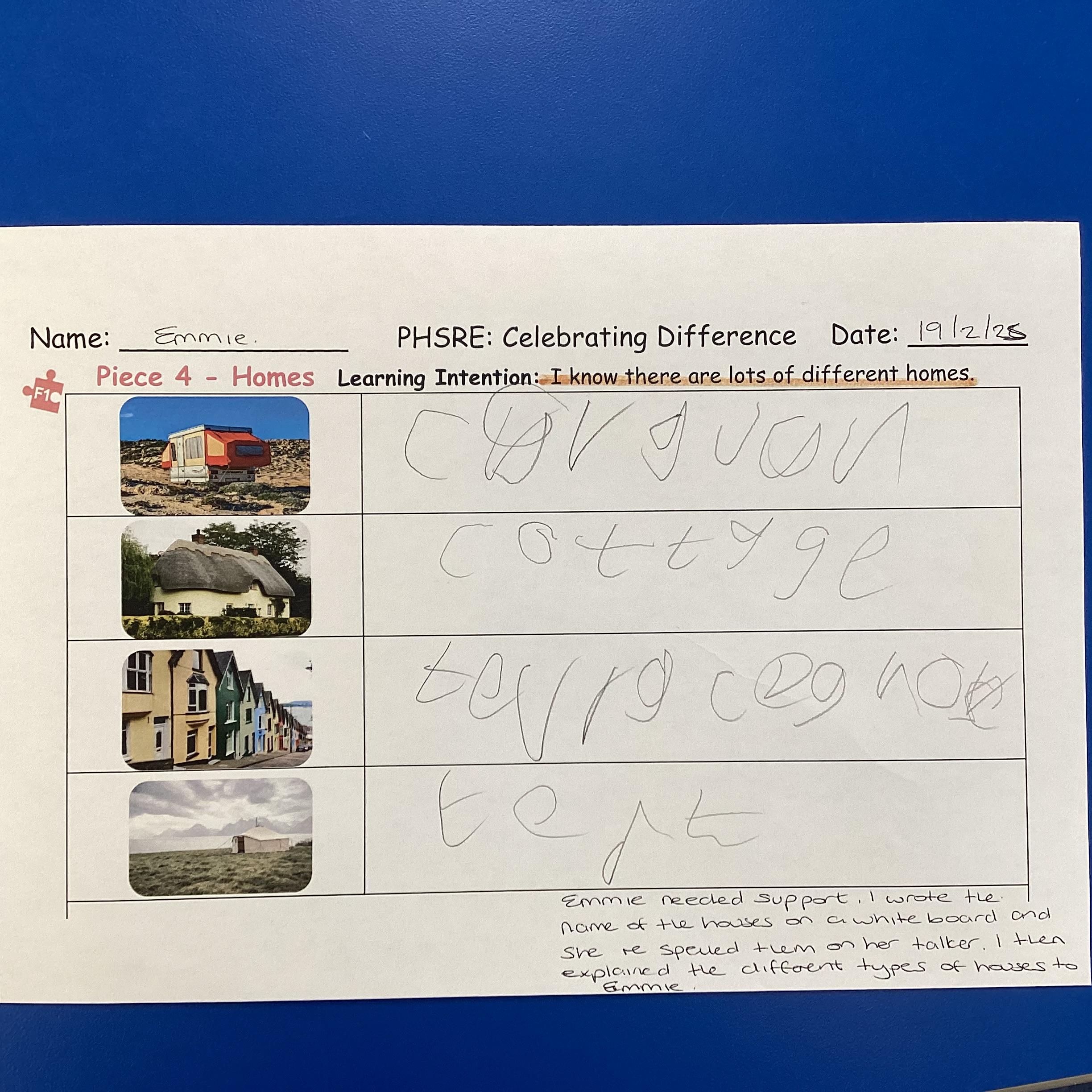 18.02.25 PHSRE CELEBRATING DIFFERENCE PIECE 4: HOMES We looked at a variety of photos showing different types of homes. The children were identifying and matching the different homes and writing a list. We all had a go at beating our new chime bar during 'calm me time'.