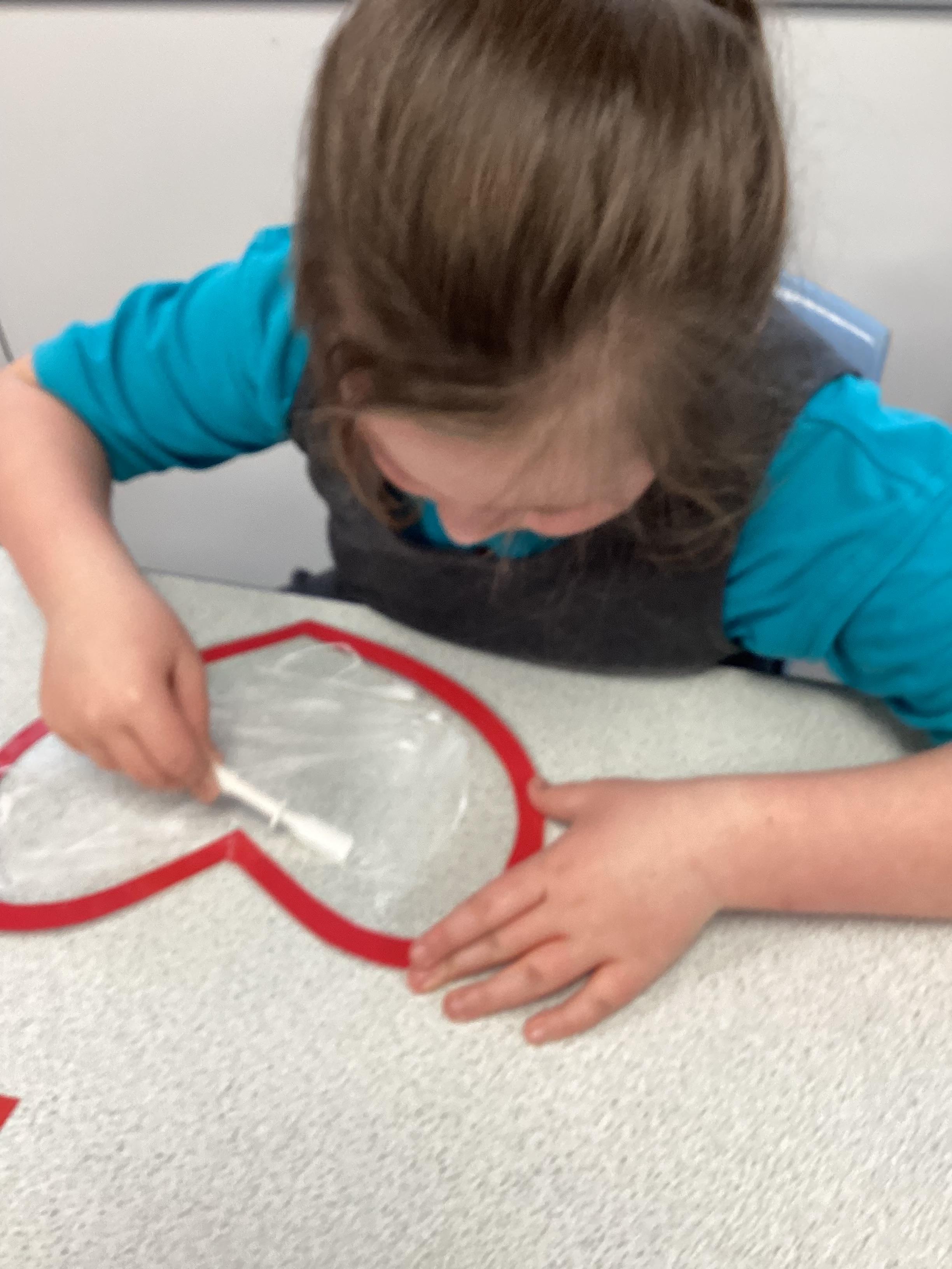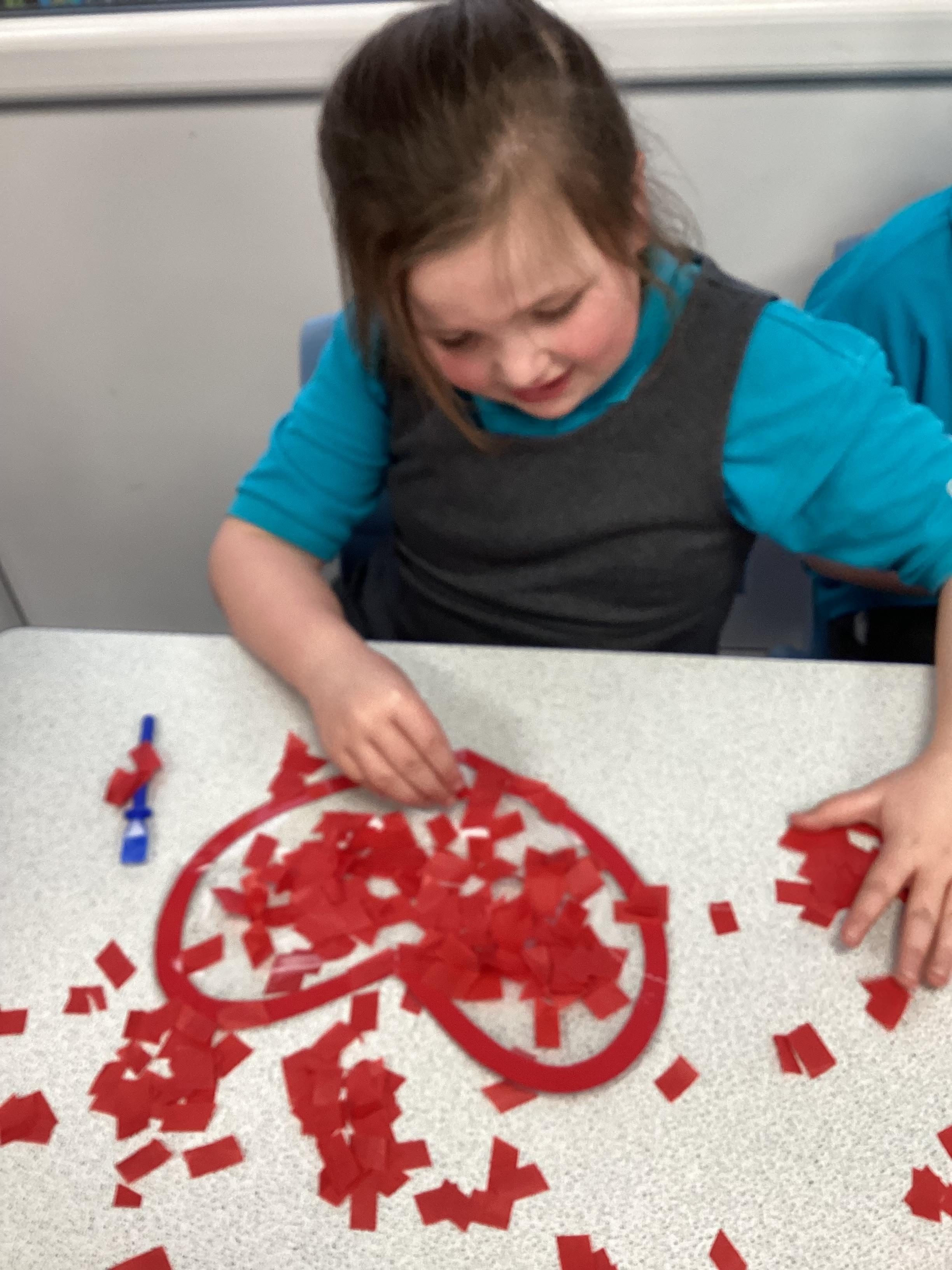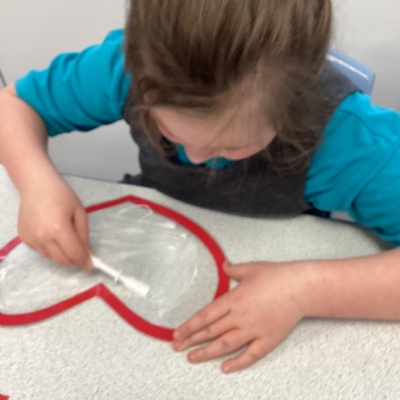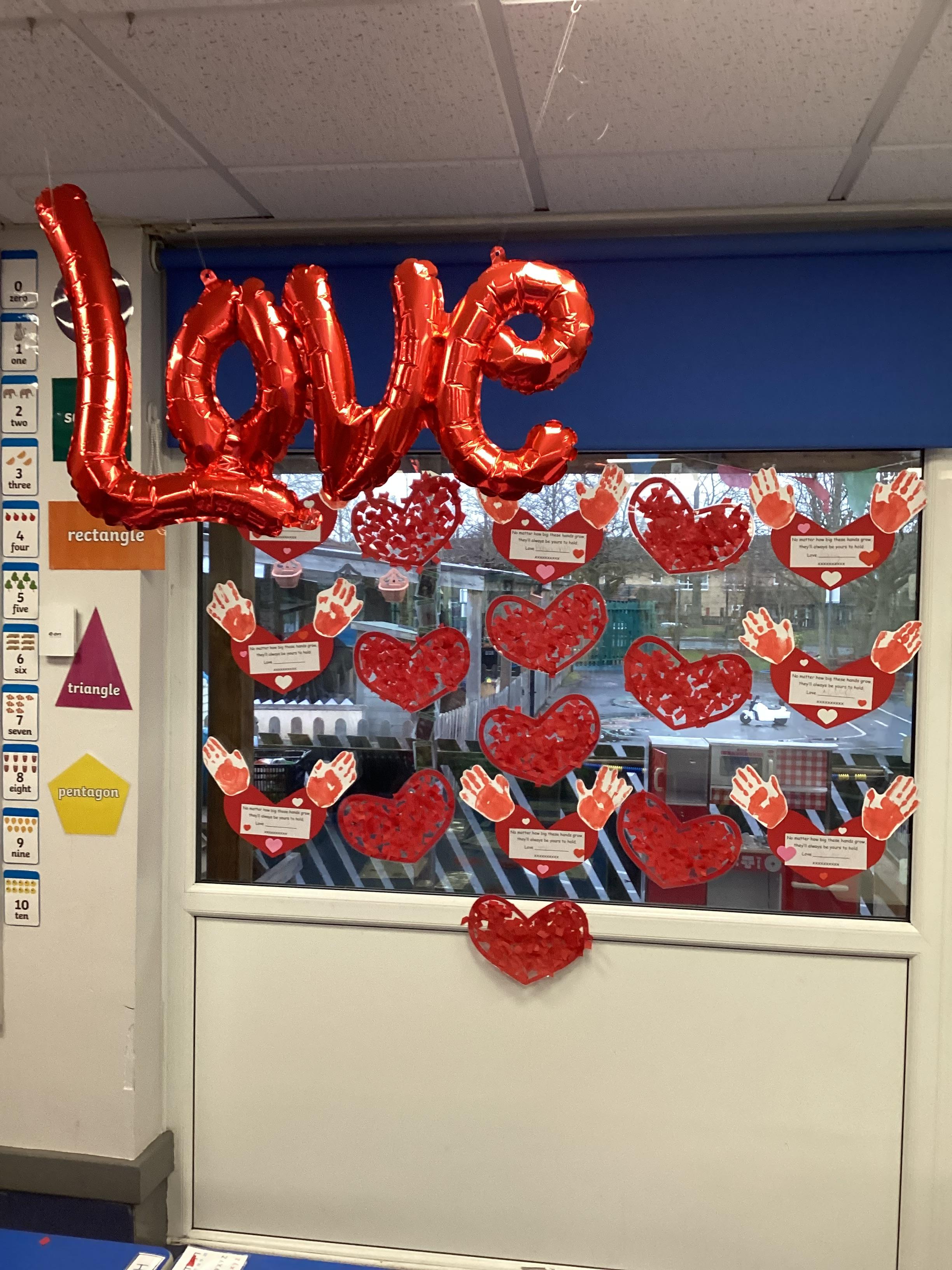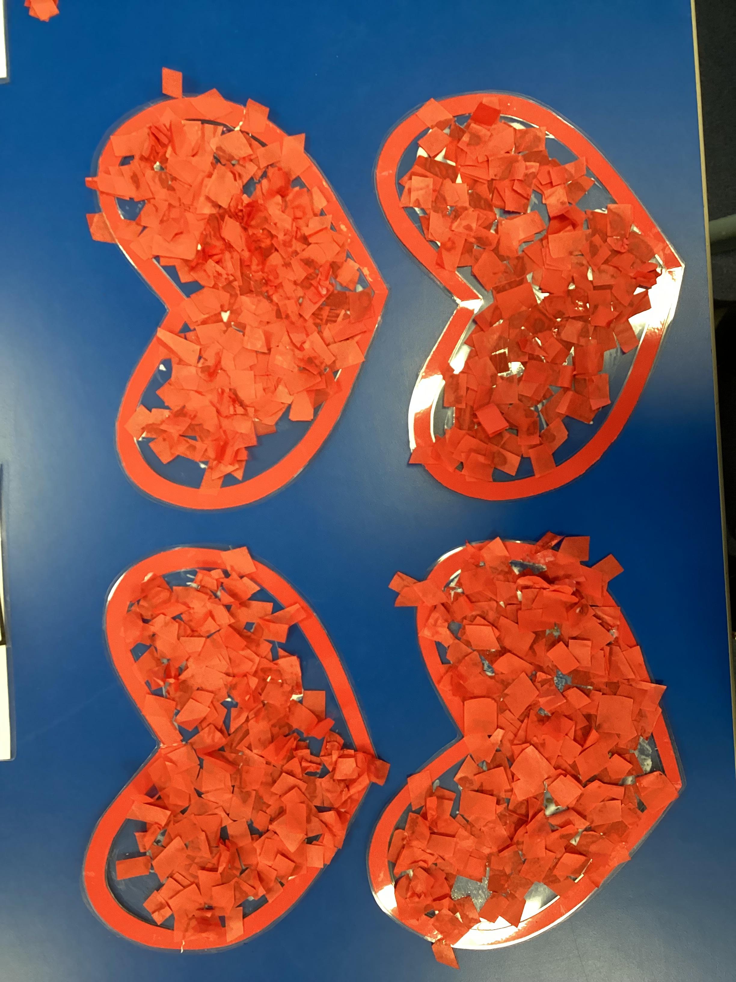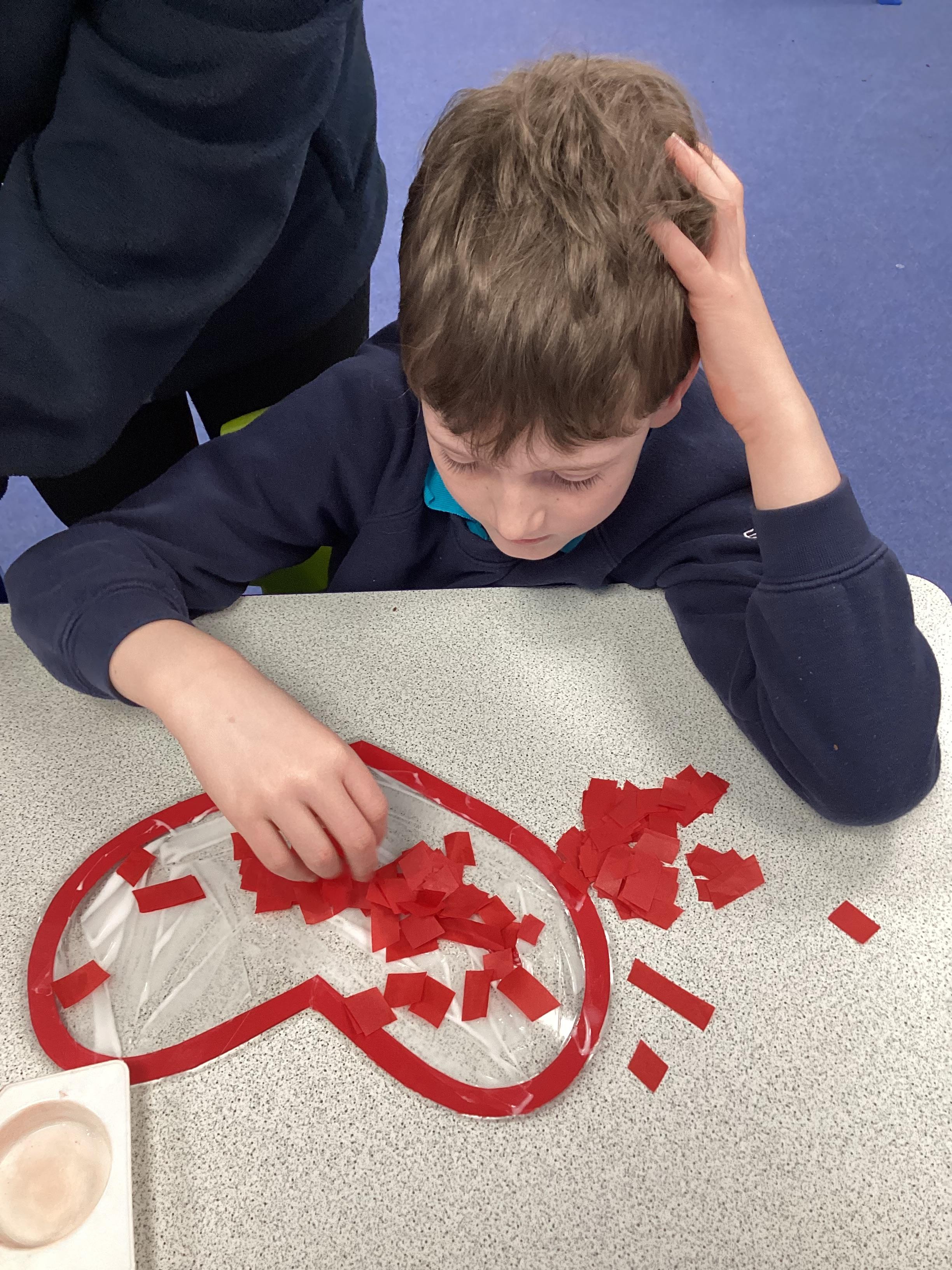 14.02.25 LITERACY: We have been reading the story called: 'Happy Valentines Day, Mouse'. We then made our own valentines day card, to give to the person who we love. The children collage their own red, heart sun catcher too! We have displayed them on our classroom window so the light can shine though them.