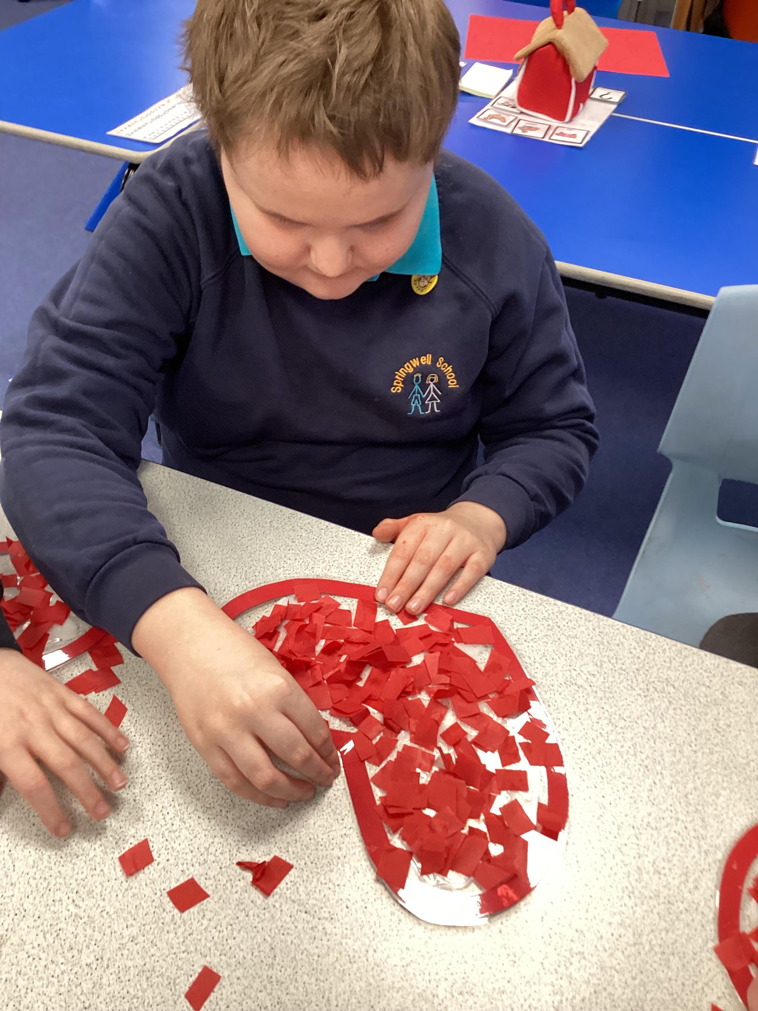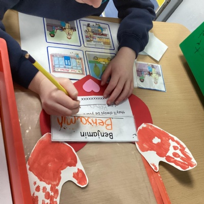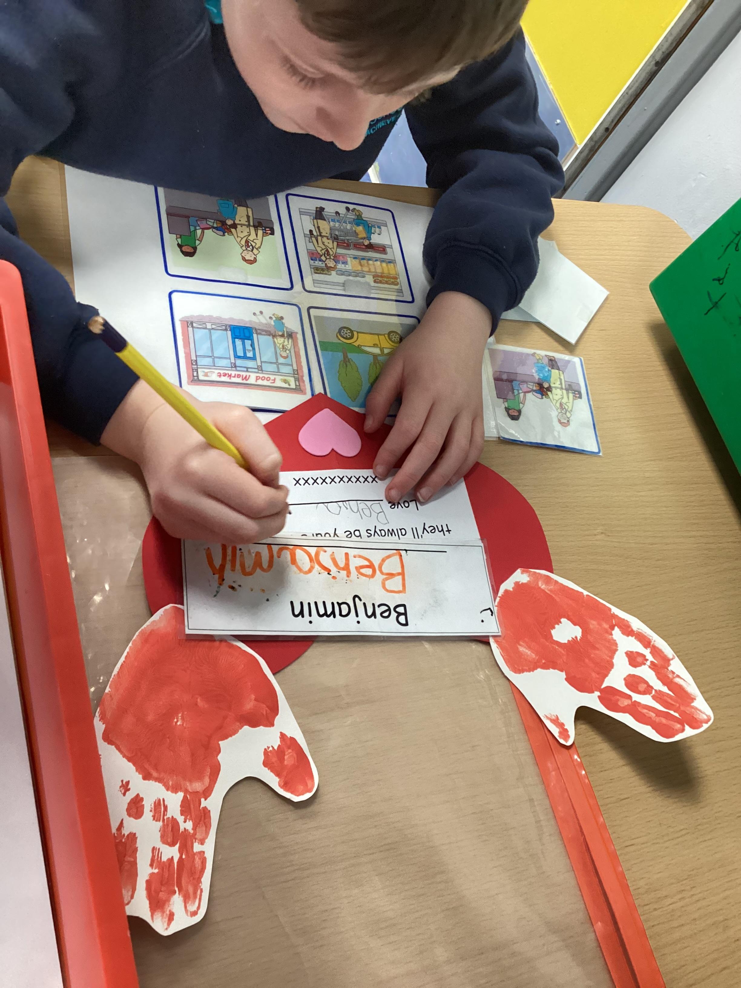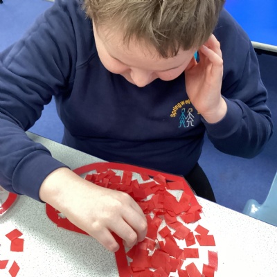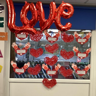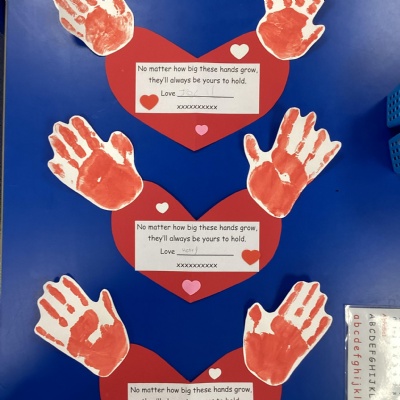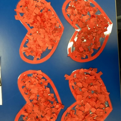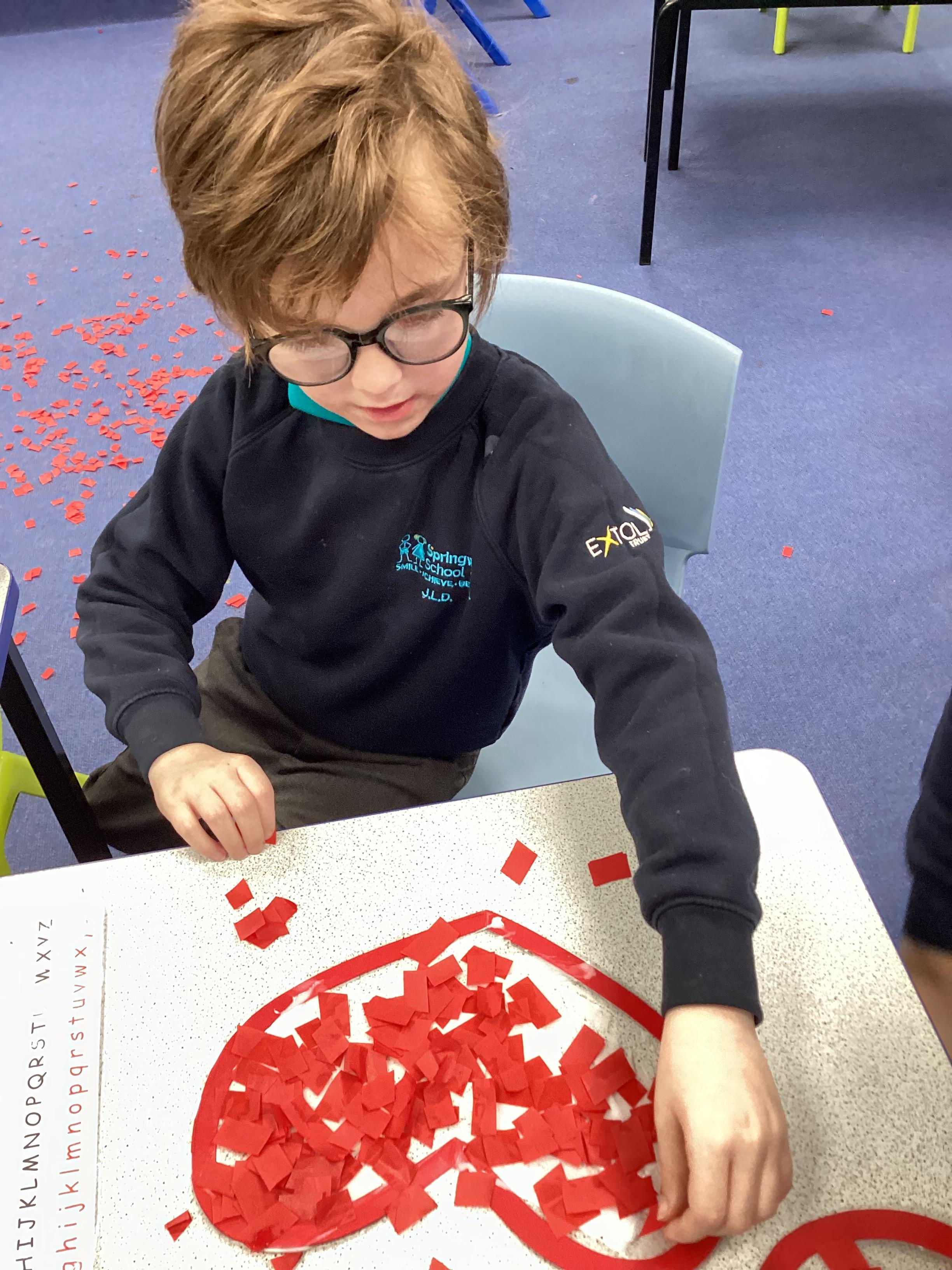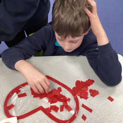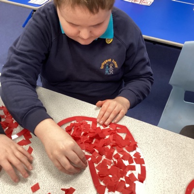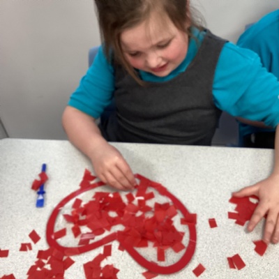 14.02.25 LITERACY: We have been reading the story called: 'Happy Valentines Day, Mouse'. We then made our own valentines day card, to give to the person who we love. The children collage their own red, heart sun catcher too! We have displayed them on our classroom window so the light can shine though them.
