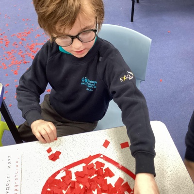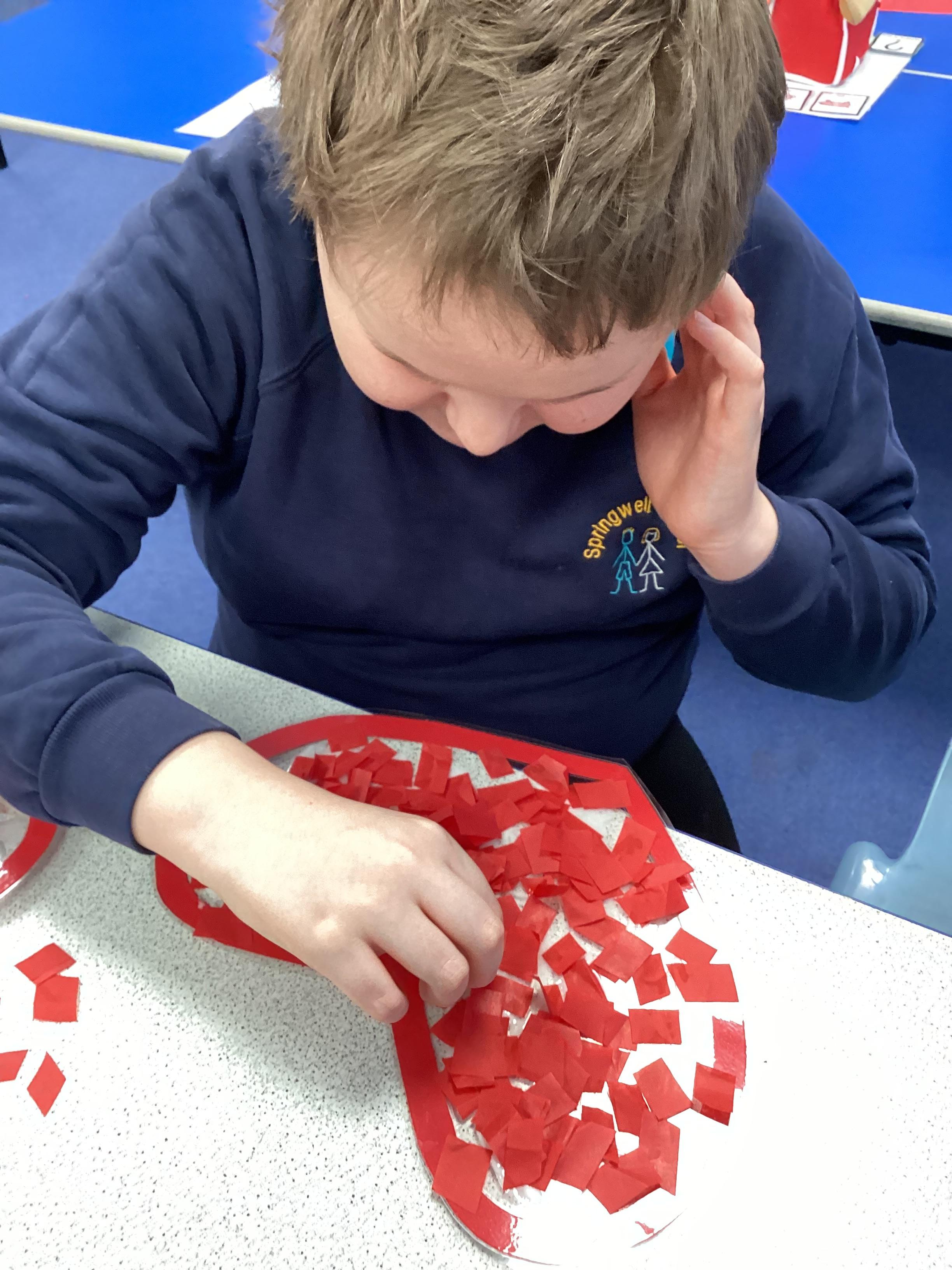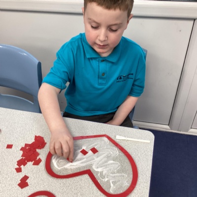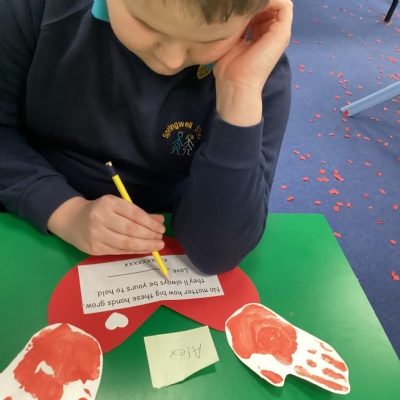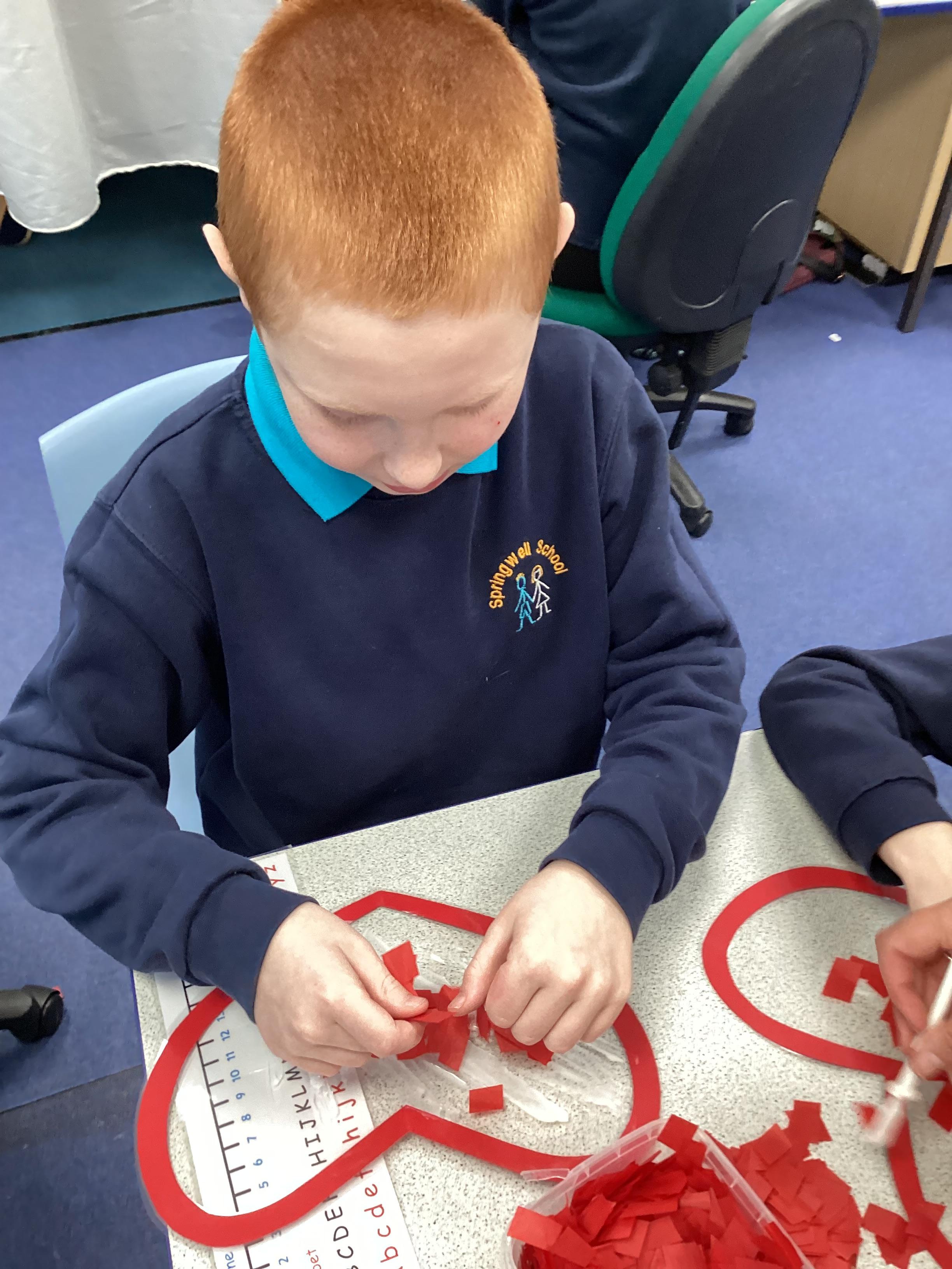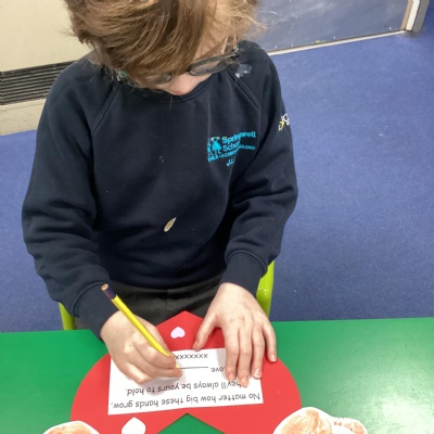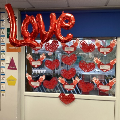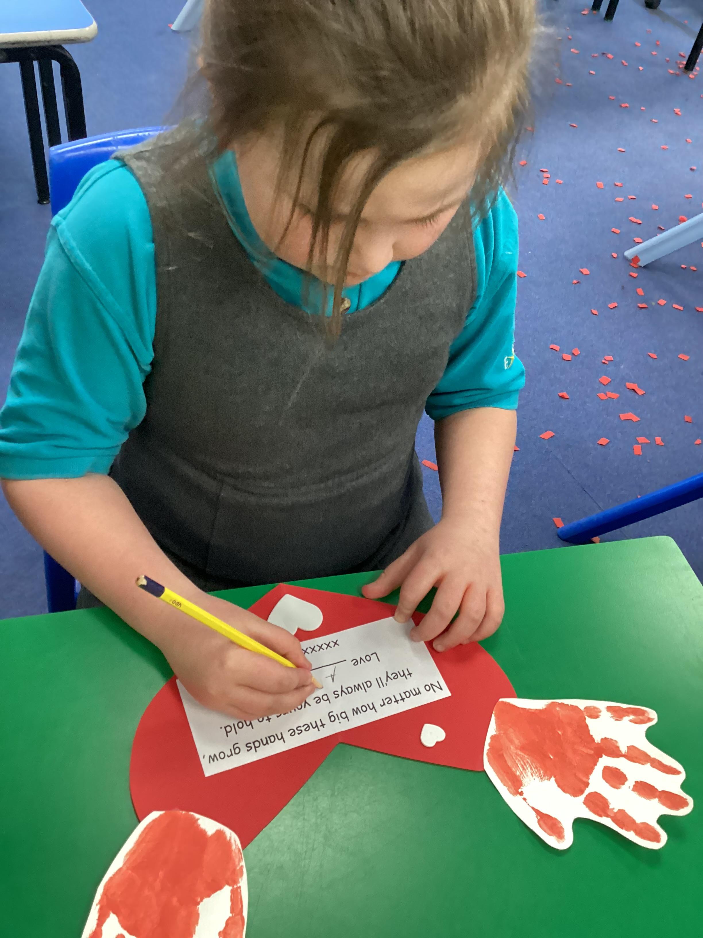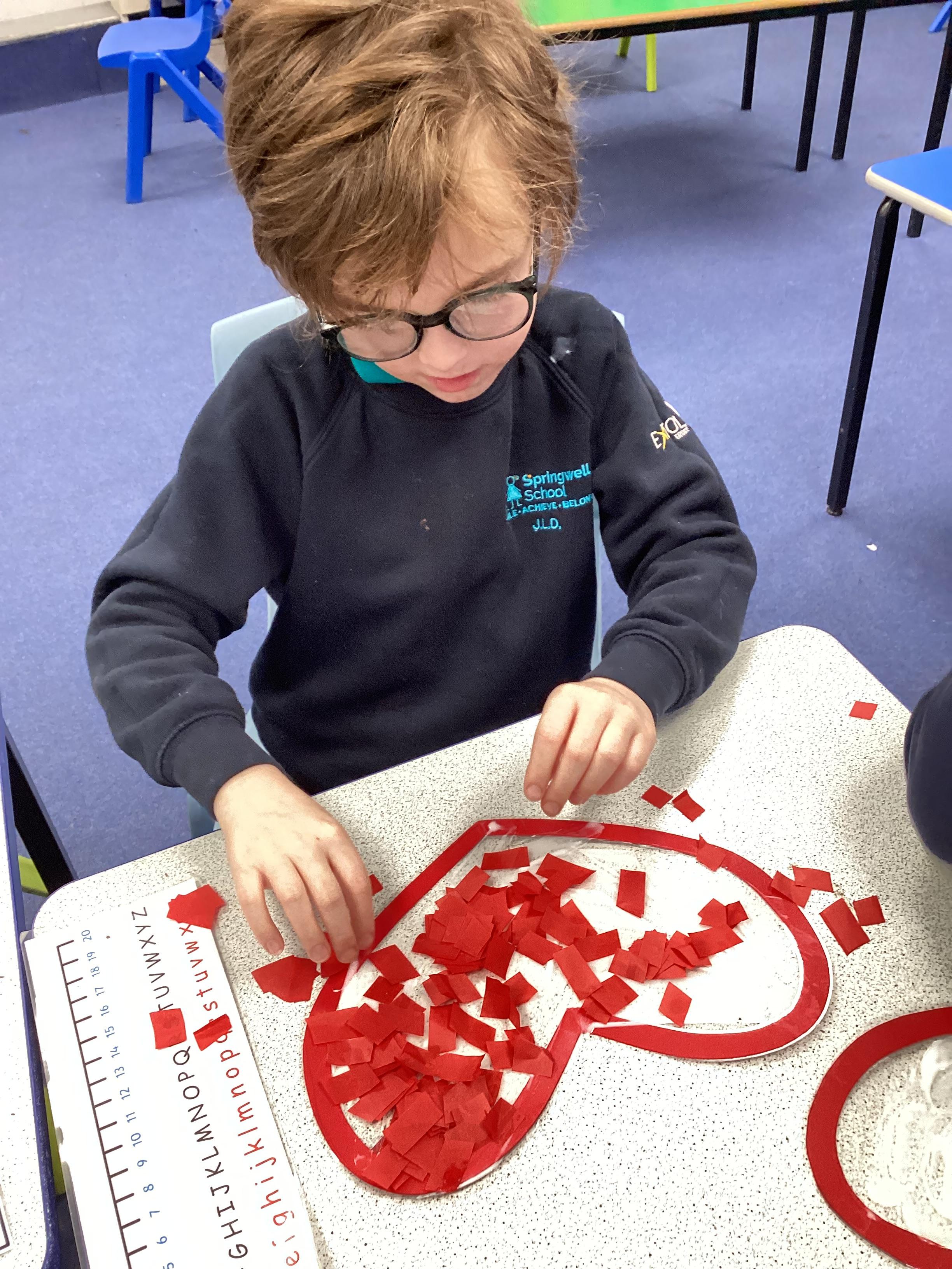 14.02.25 LITERACY: We have been reading the story called: 'Happy Valentines Day, Mouse'. We then made our own valentines day card, to give to the person who we love. The children collage their own red, heart sun catcher too! We have displayed them on our classroom window so the light can shine though them.