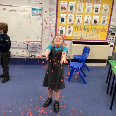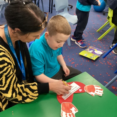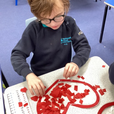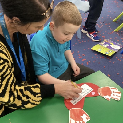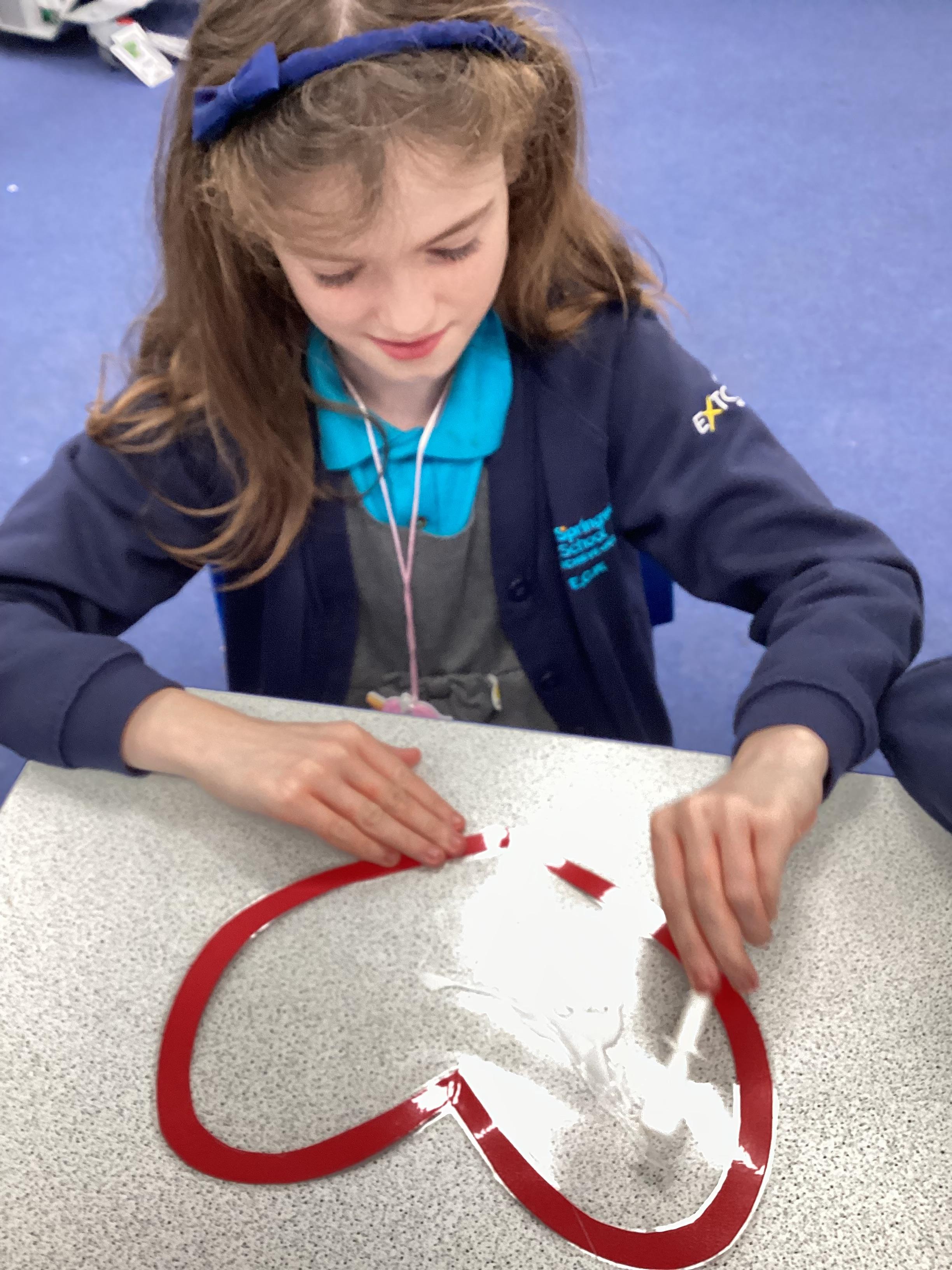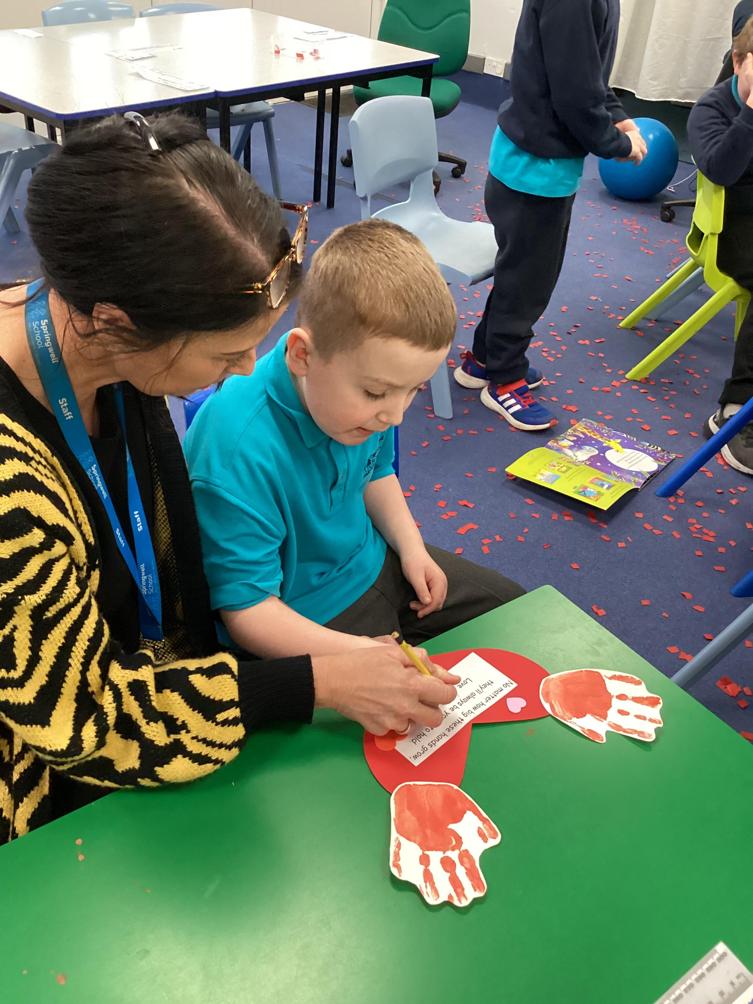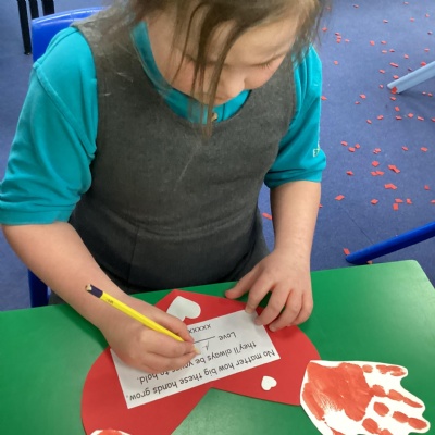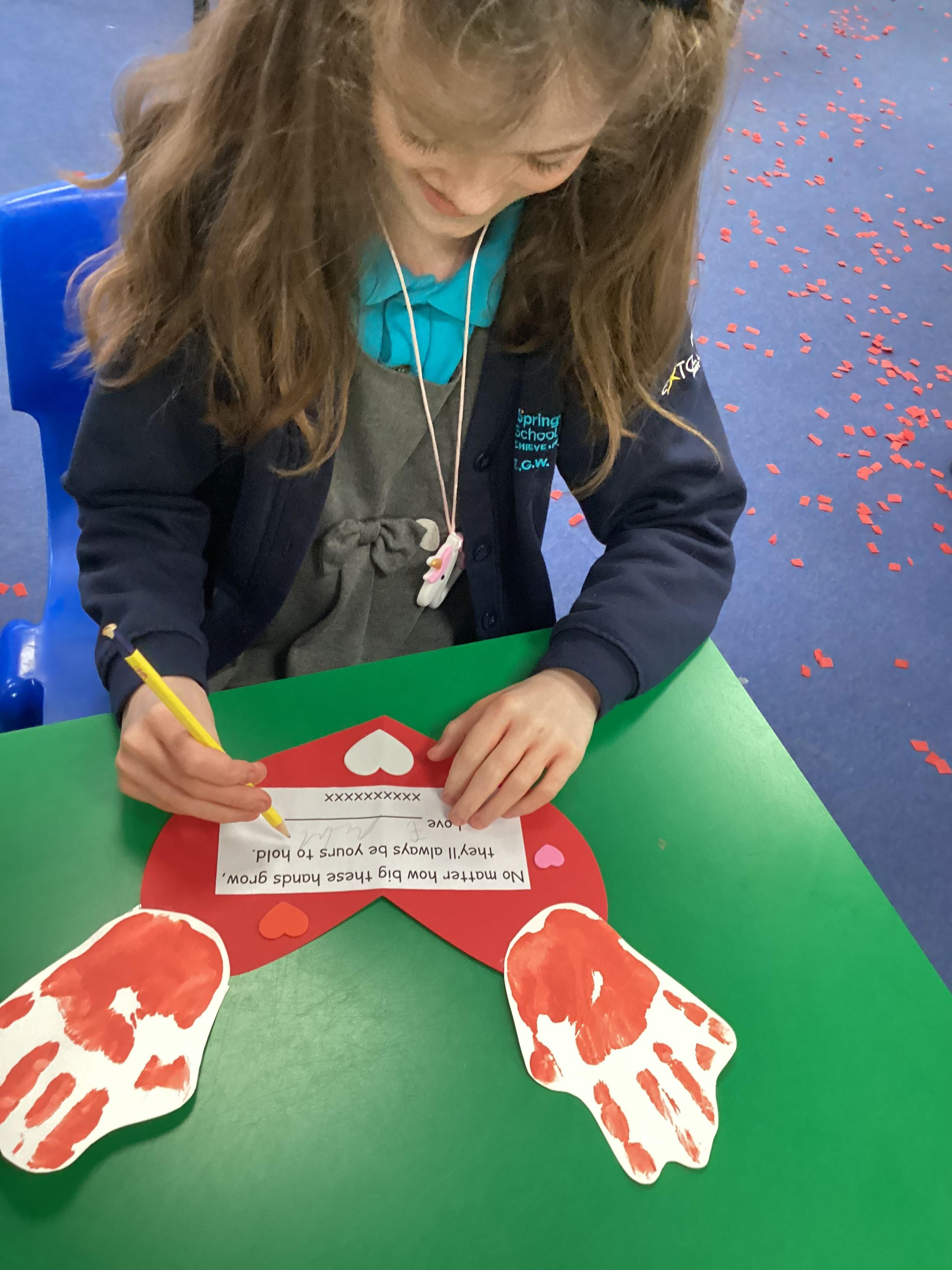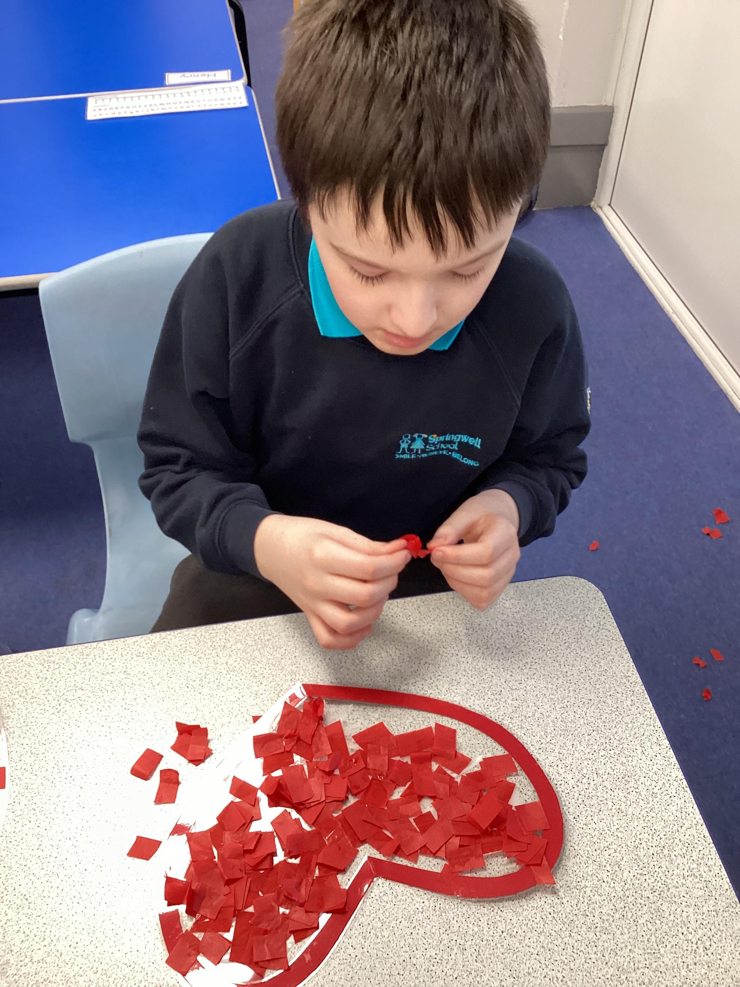 14.02.25 LITERACY: We have been reading the story called: 'Happy Valentines Day, Mouse'. We then made our own valentines day card, to give to the person who we love. The children collage their own red, heart sun catcher too! We have displayed them on our classroom window so the light can shine though them.
