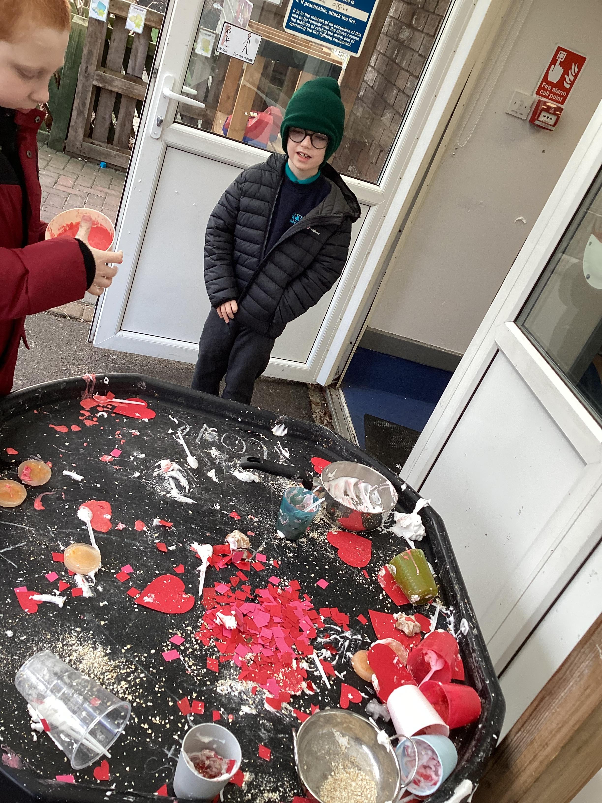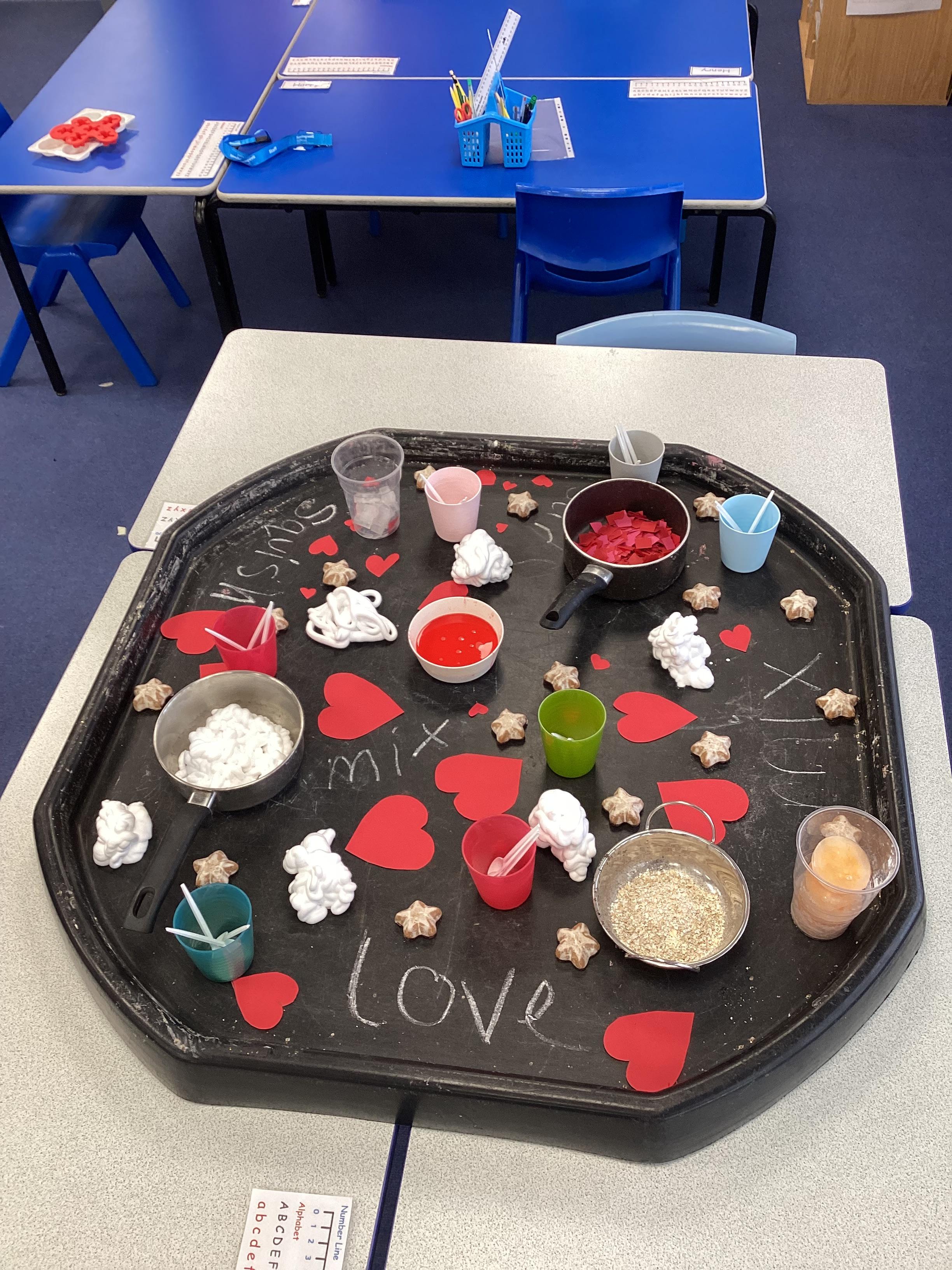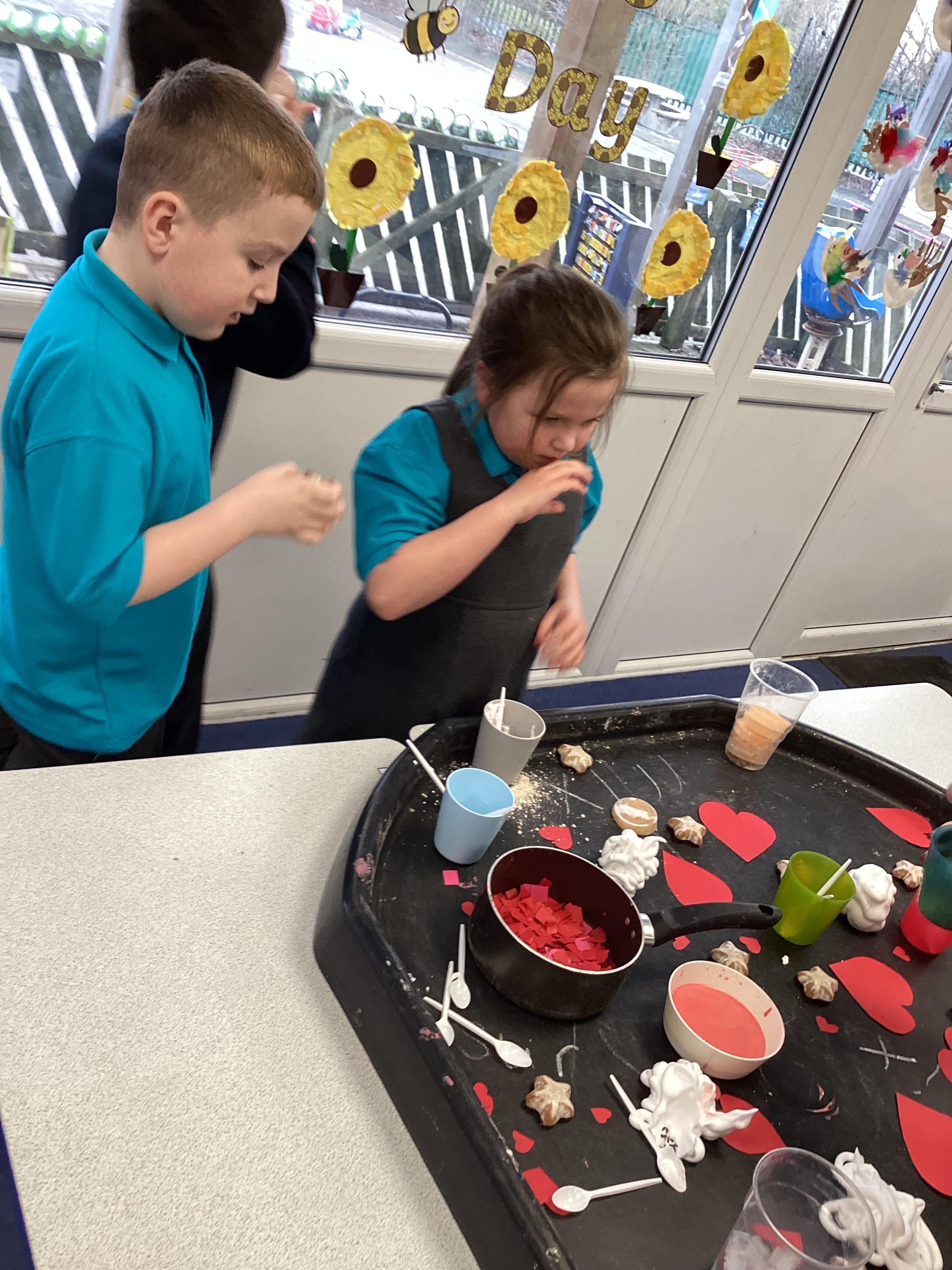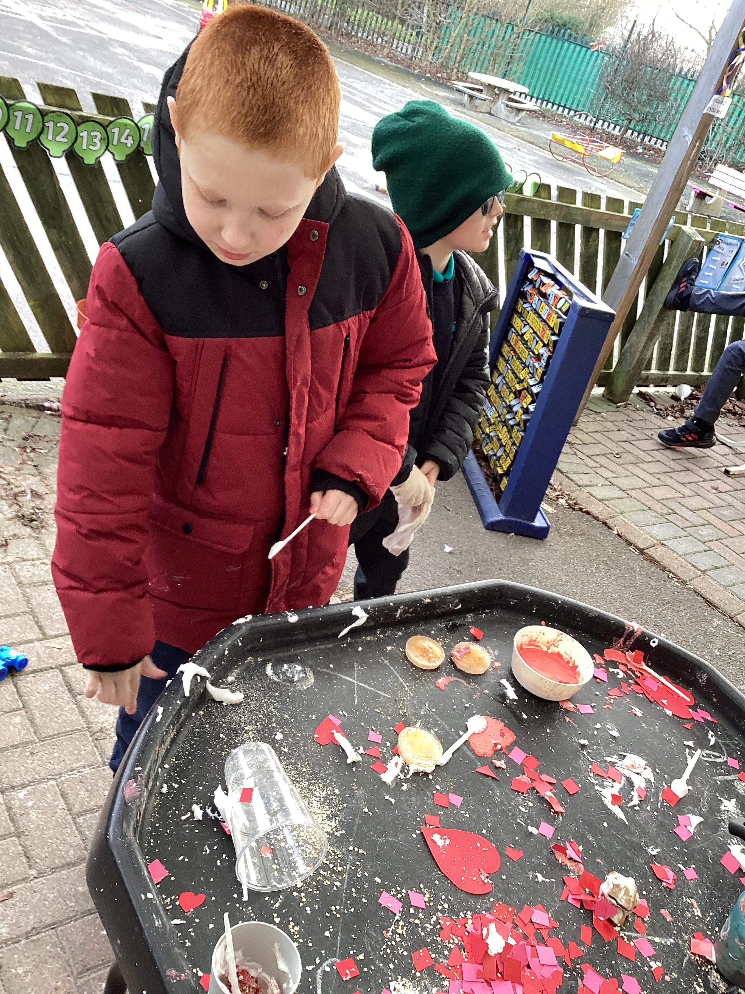 13.02.25 Valentines Messy Play - The children enjoyed making love potions during literacy today. They used some lovely language while exploring, mixing, stirring and even eating our ingredients.