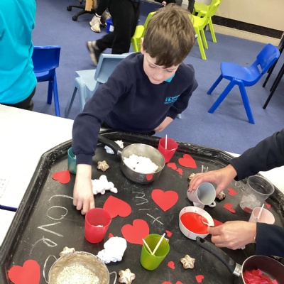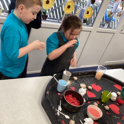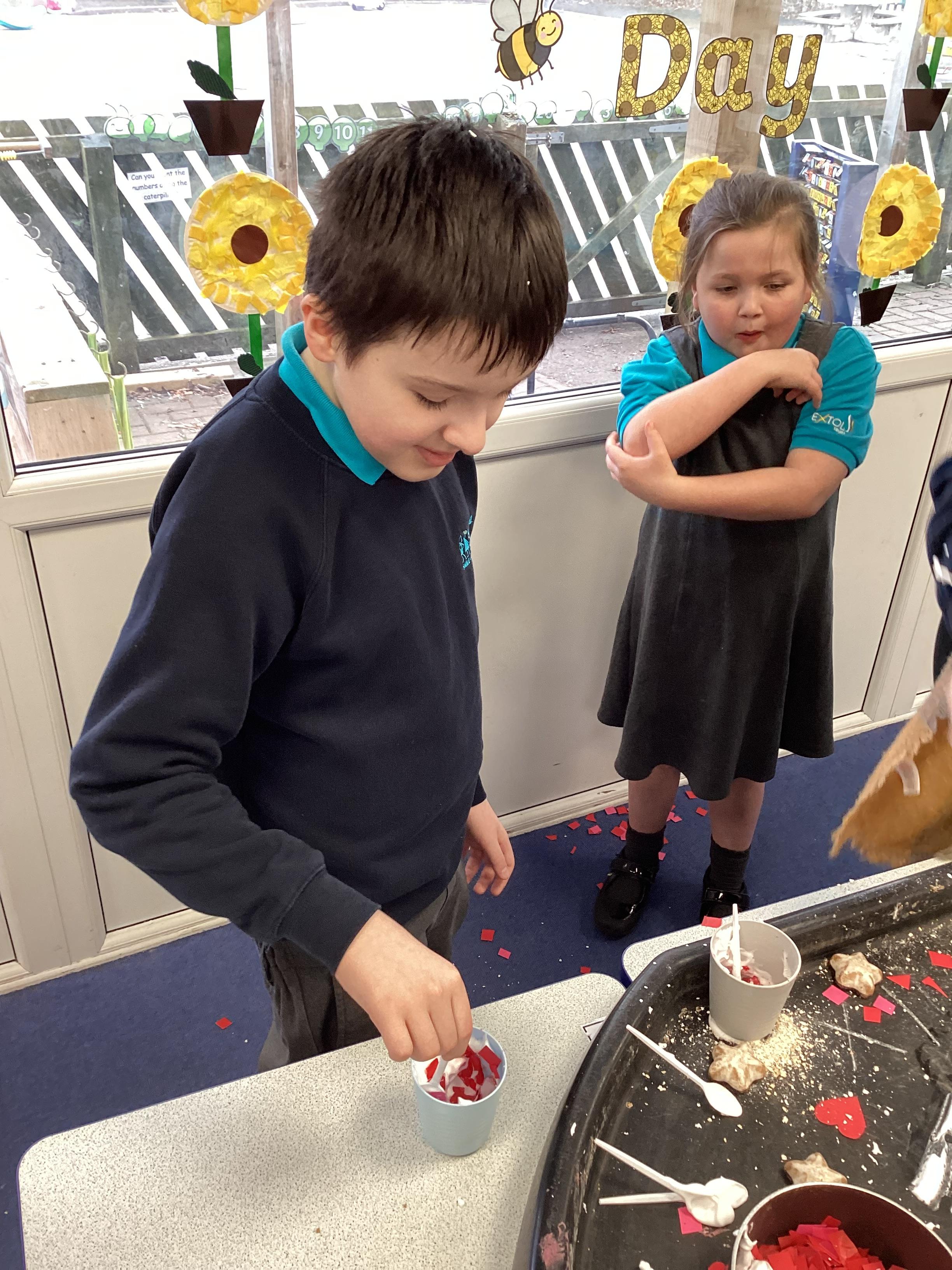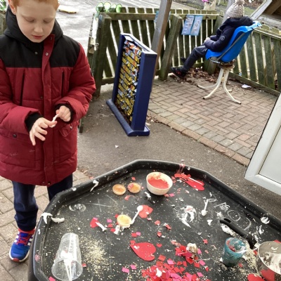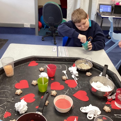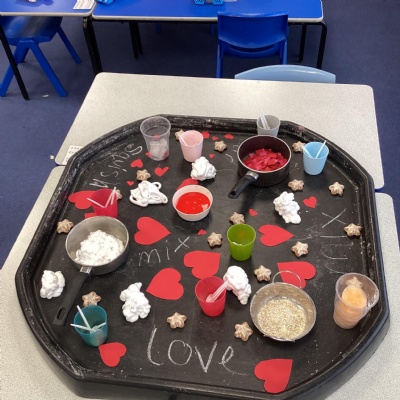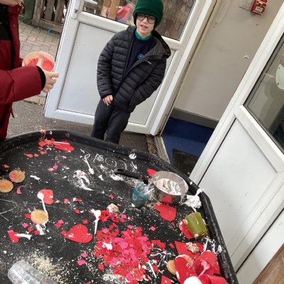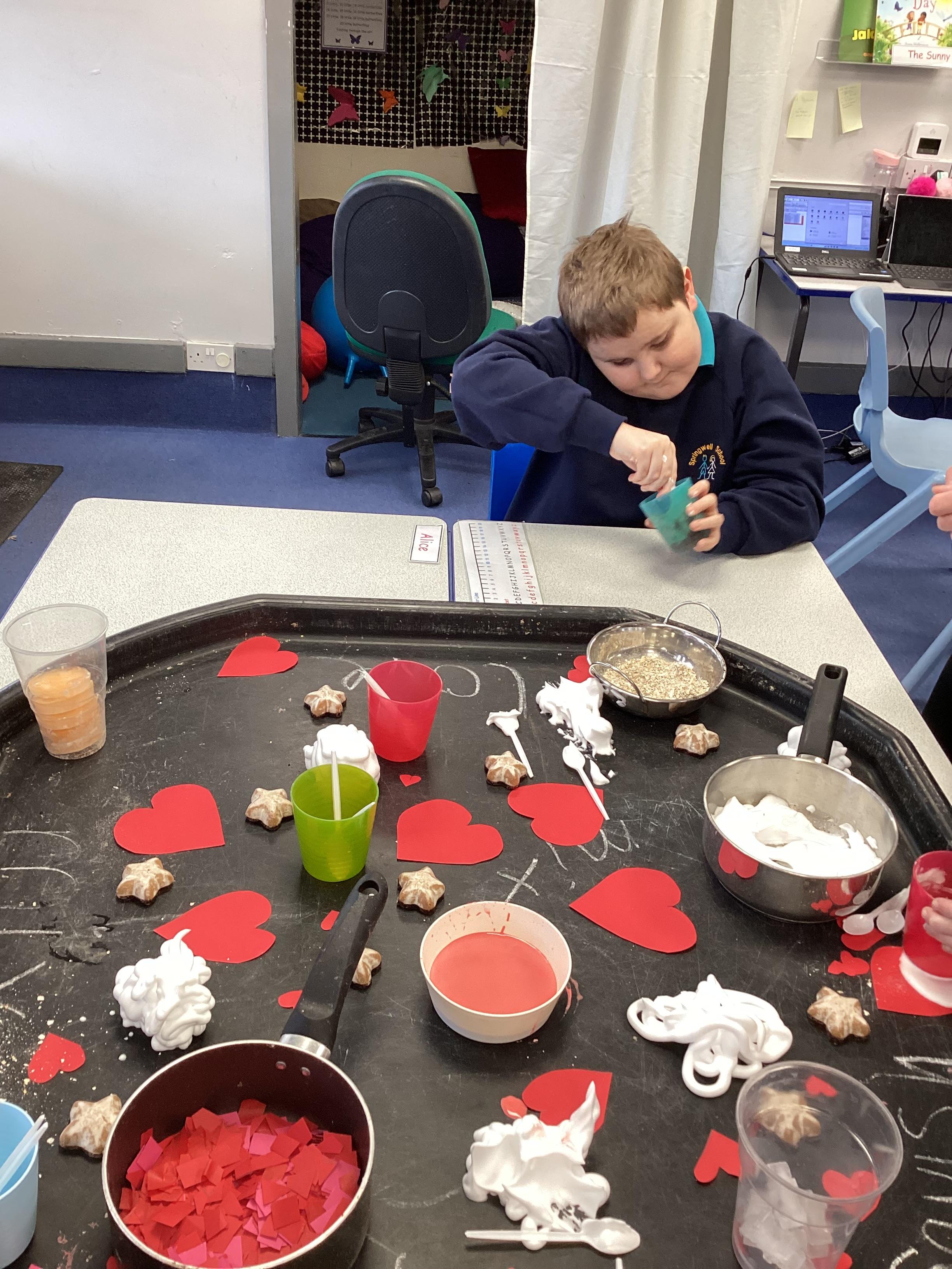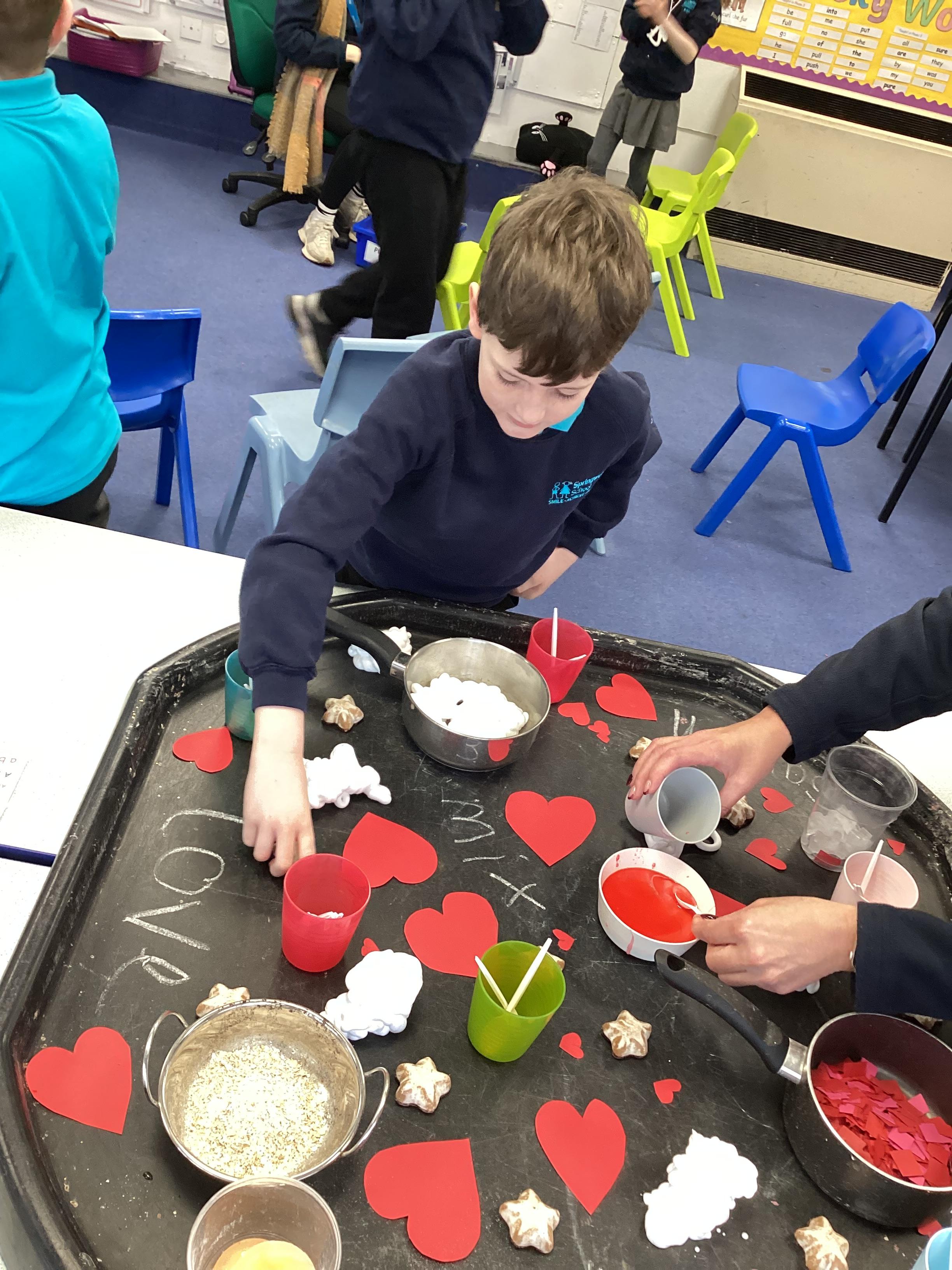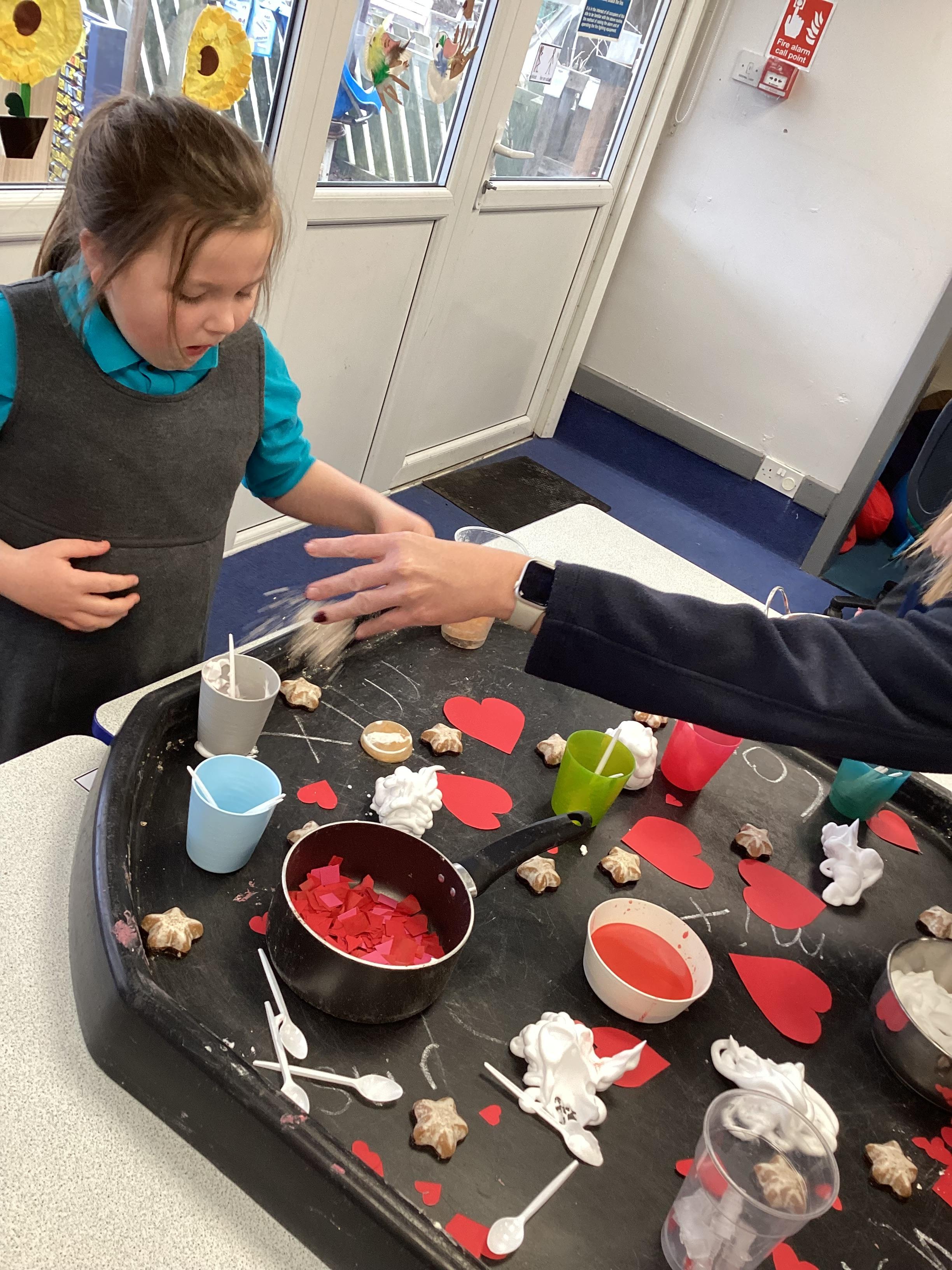 13.02.25 Valentines Messy Play - The children enjoyed making love potions during literacy today. They used some lovely language while exploring, mixing, stirring and even eating our ingredients.