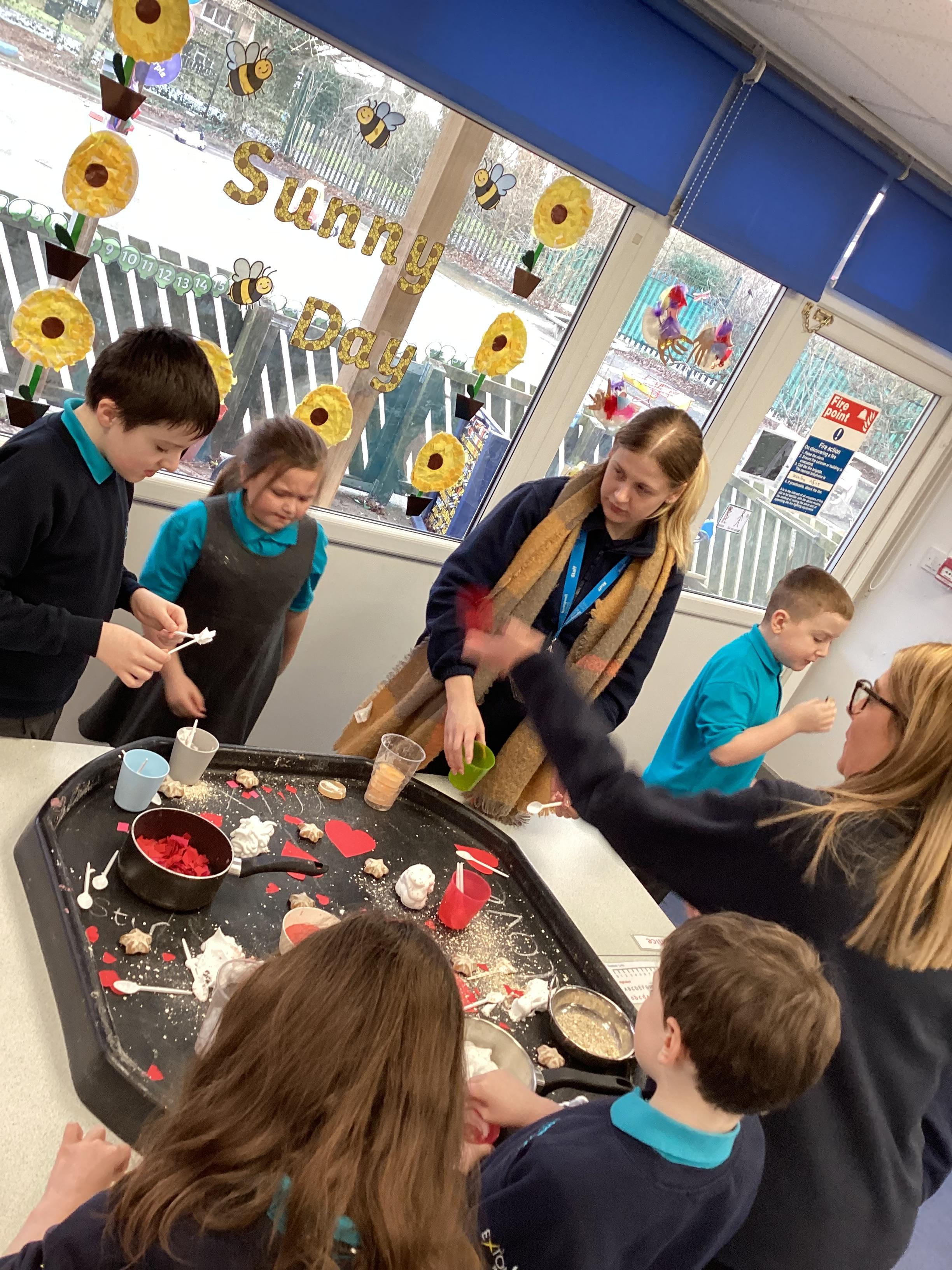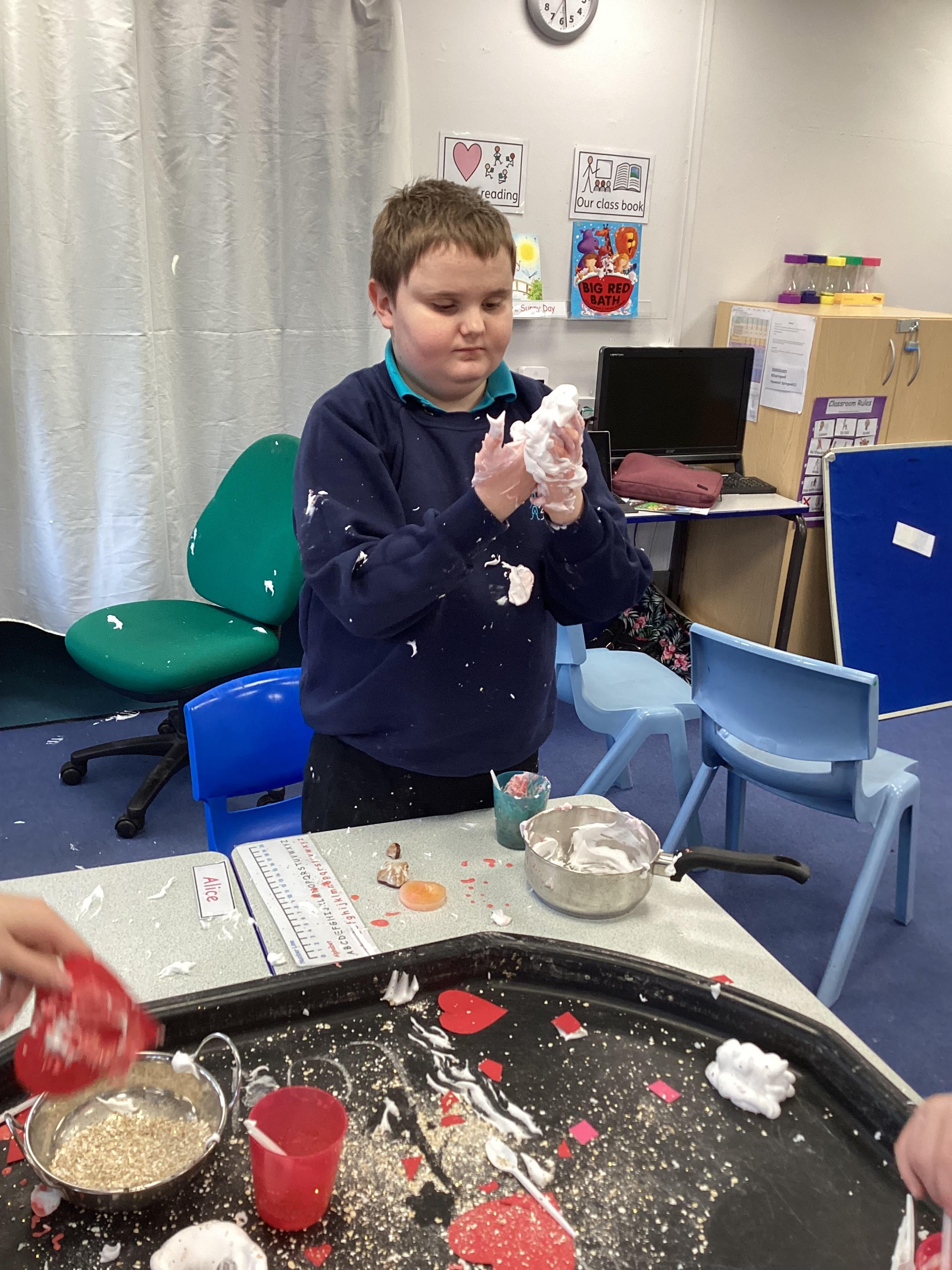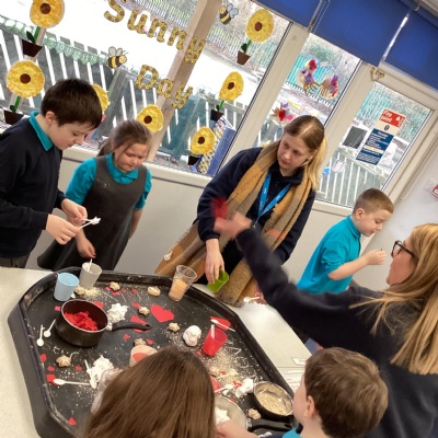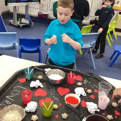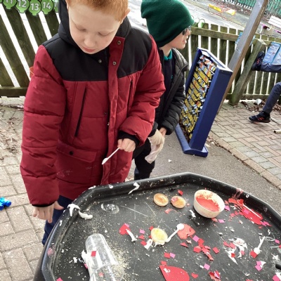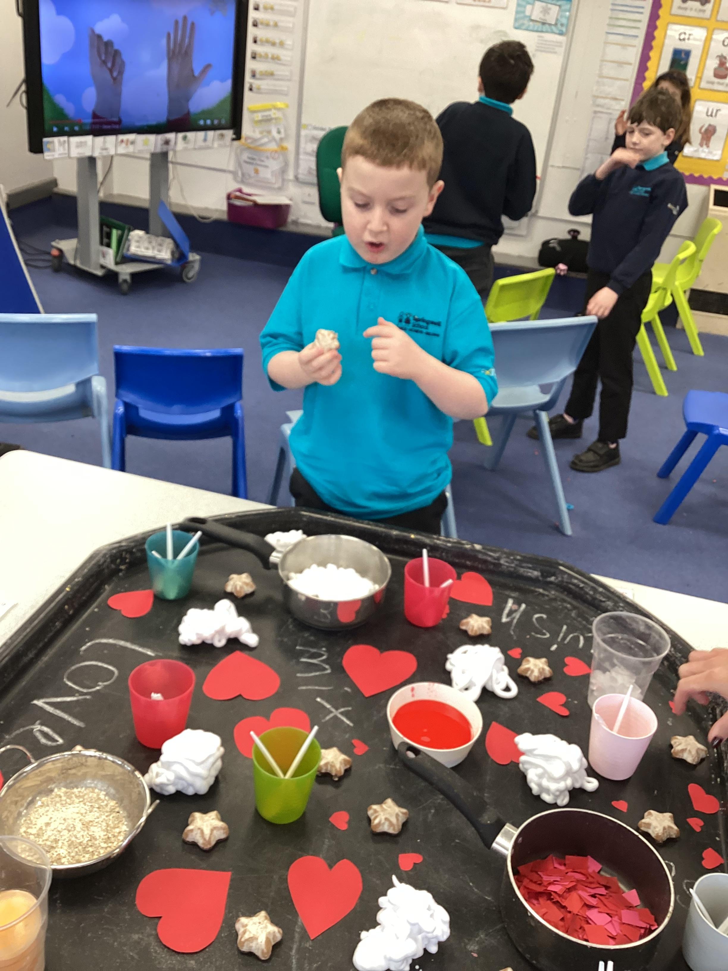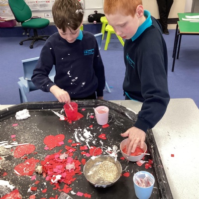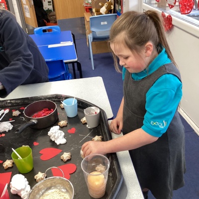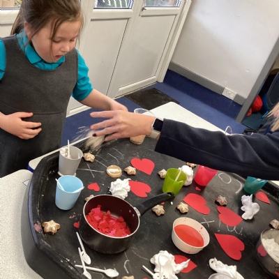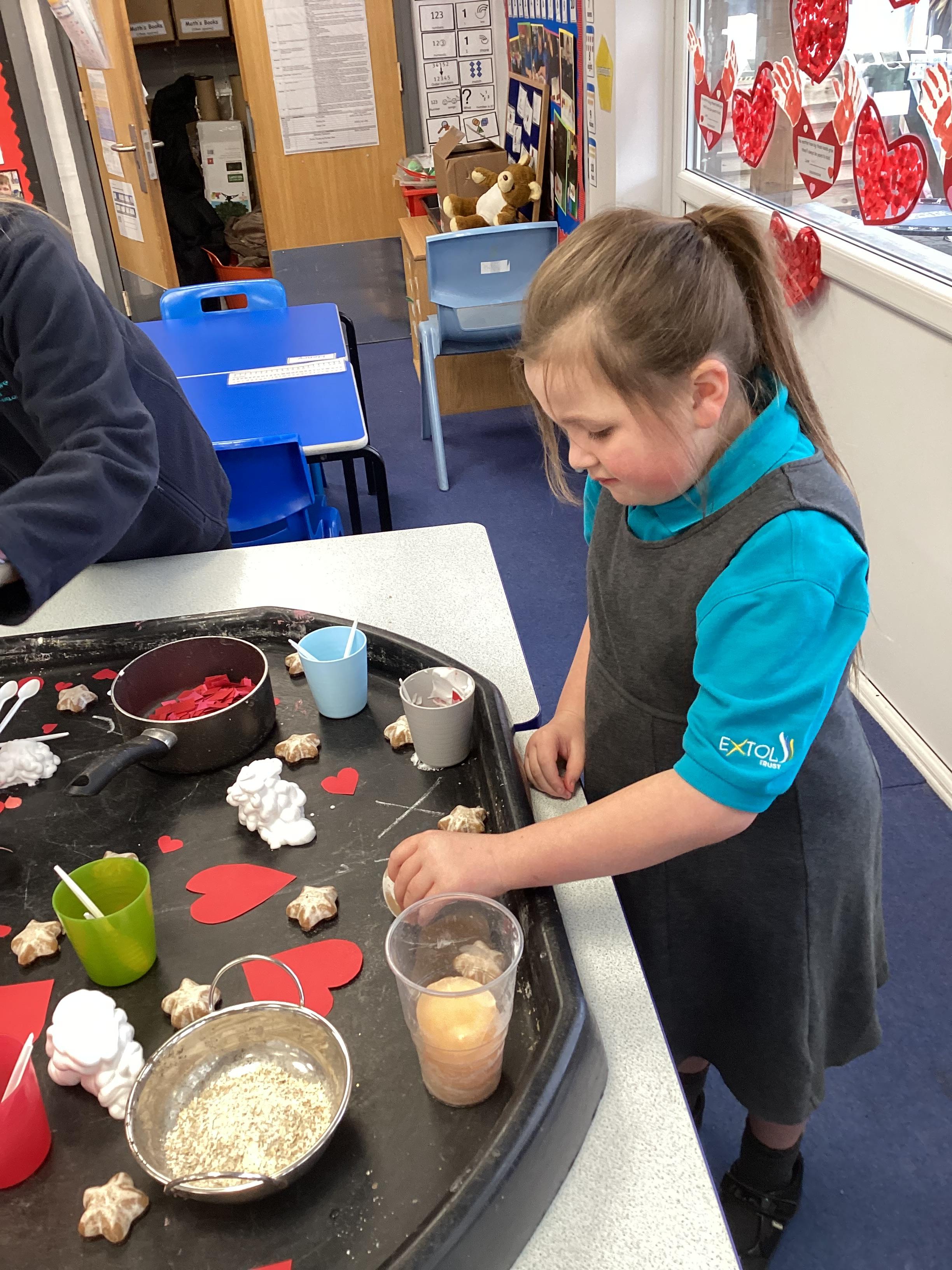 13.02.25 Valentines Messy Play - The children enjoyed making love potions during literacy today. They used some lovely language while exploring, mixing, stirring and even eating our ingredients.