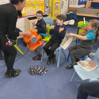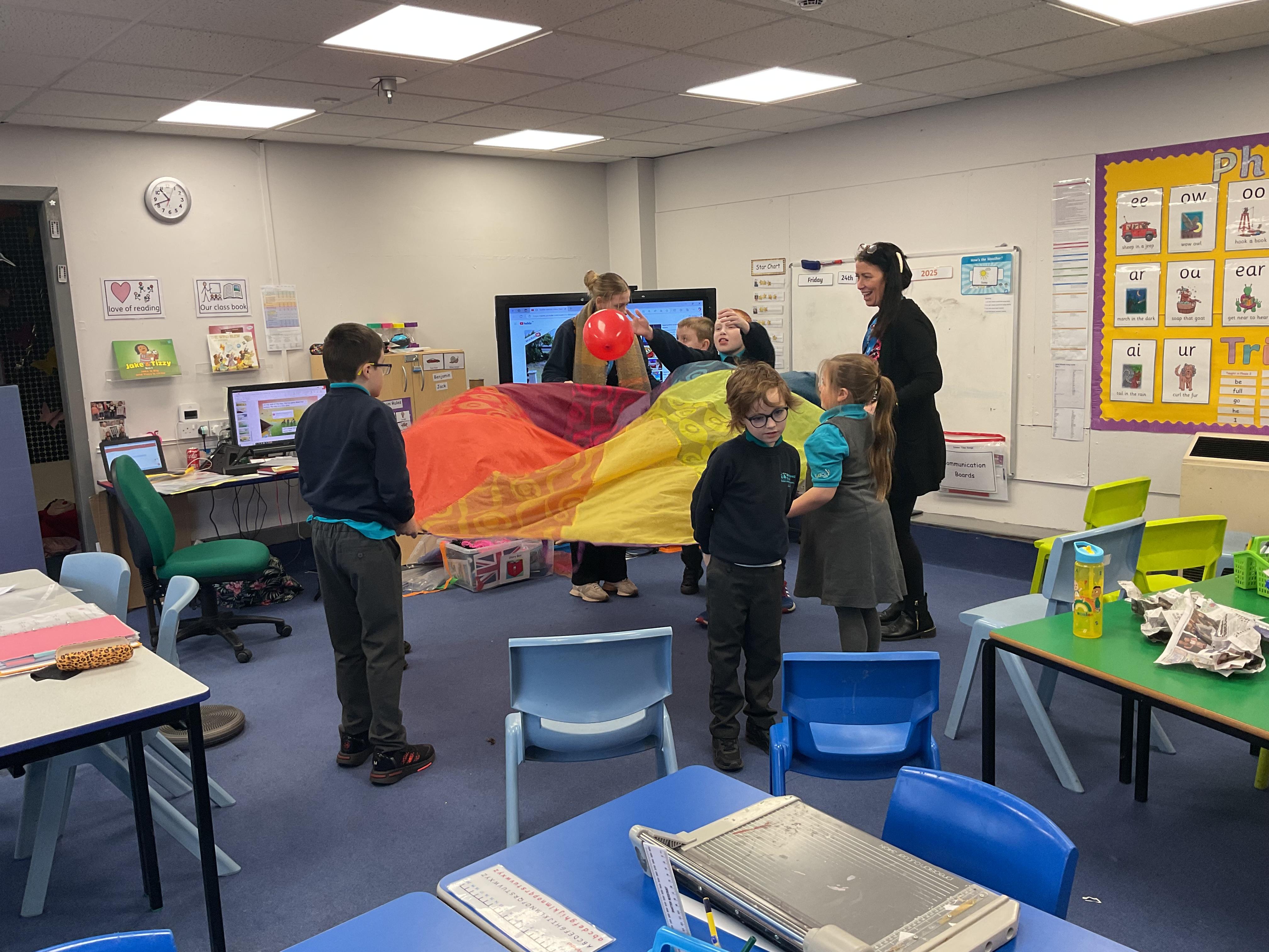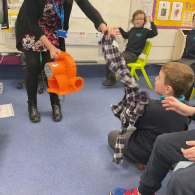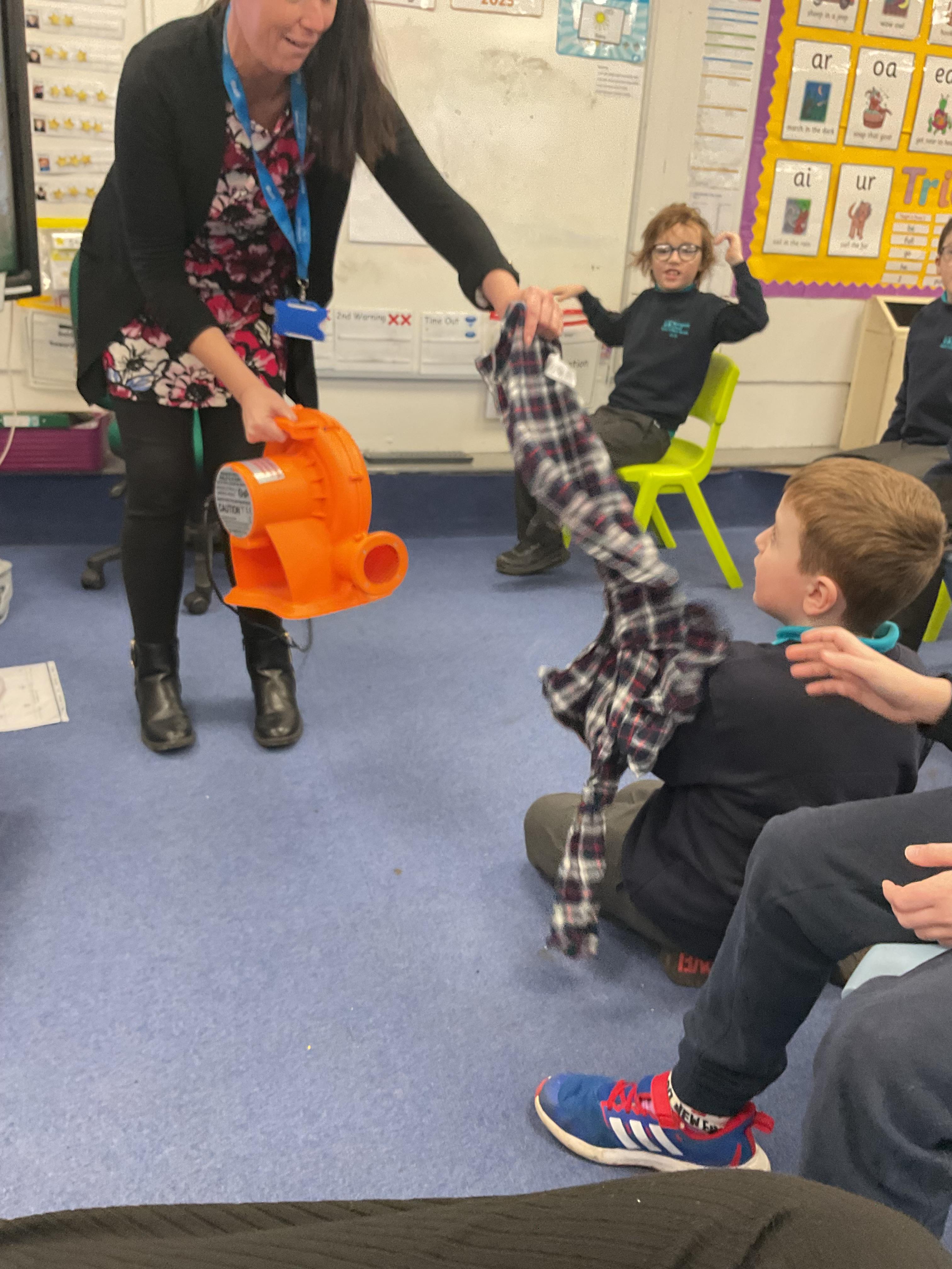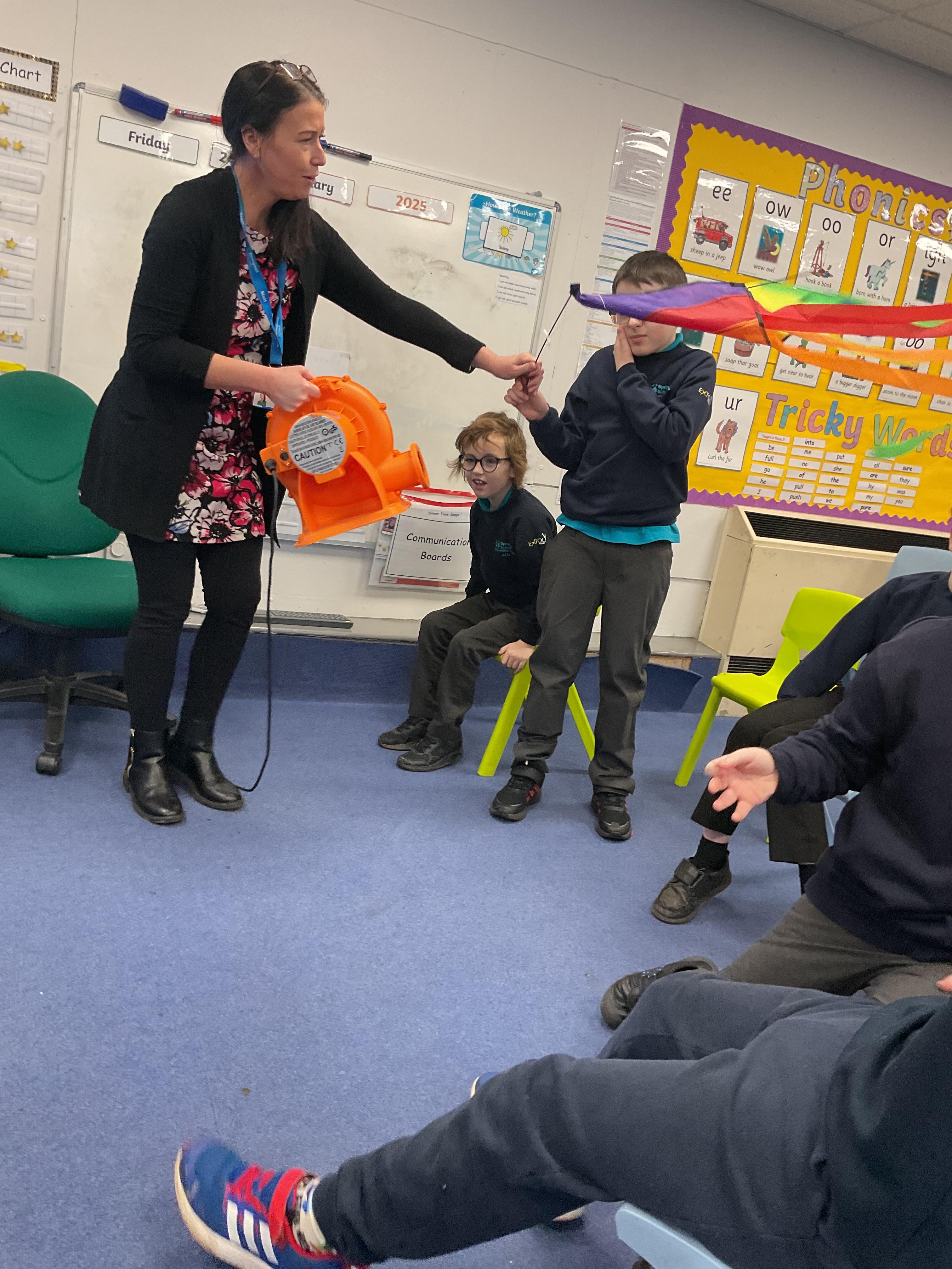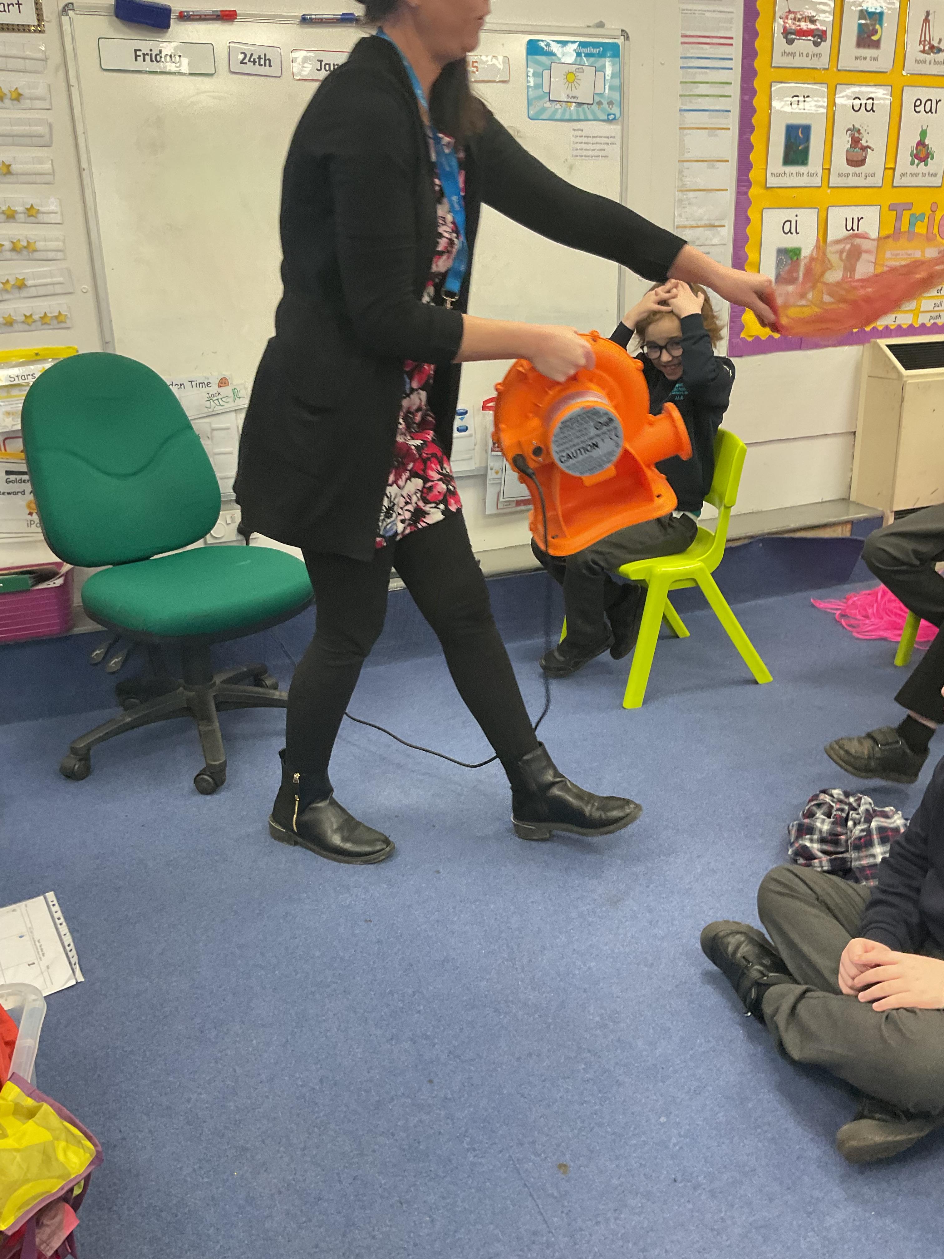 22.01.25 LITERACY Text: 'The Wind Blew' - The children loved feeling the wind machine blow on them, they giggled when the wind machine blew away all the different objects away in the story. After the story, the children enjoyed singing and dancing with the parachute to the song: 'It's a Windy Day'.