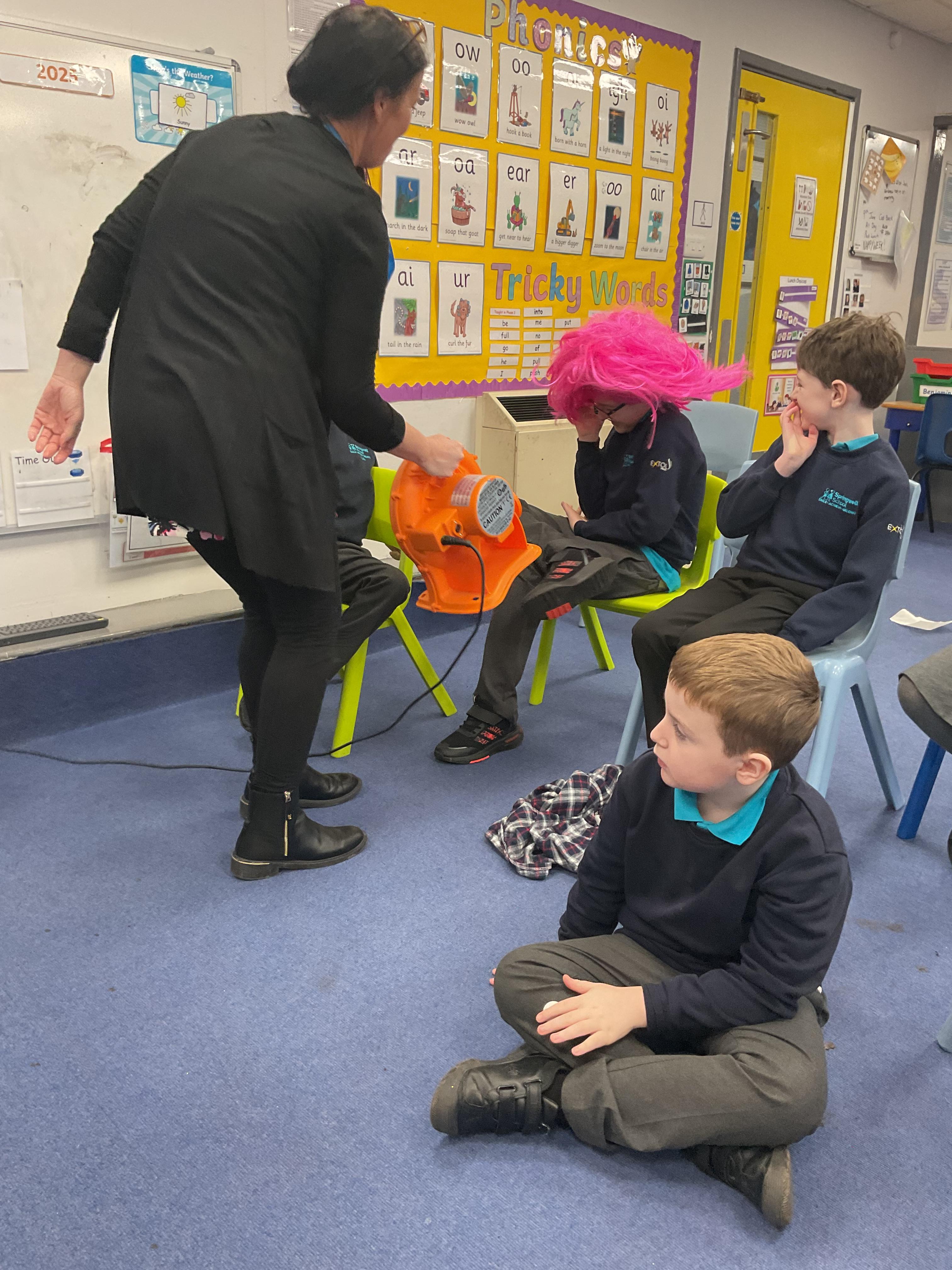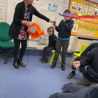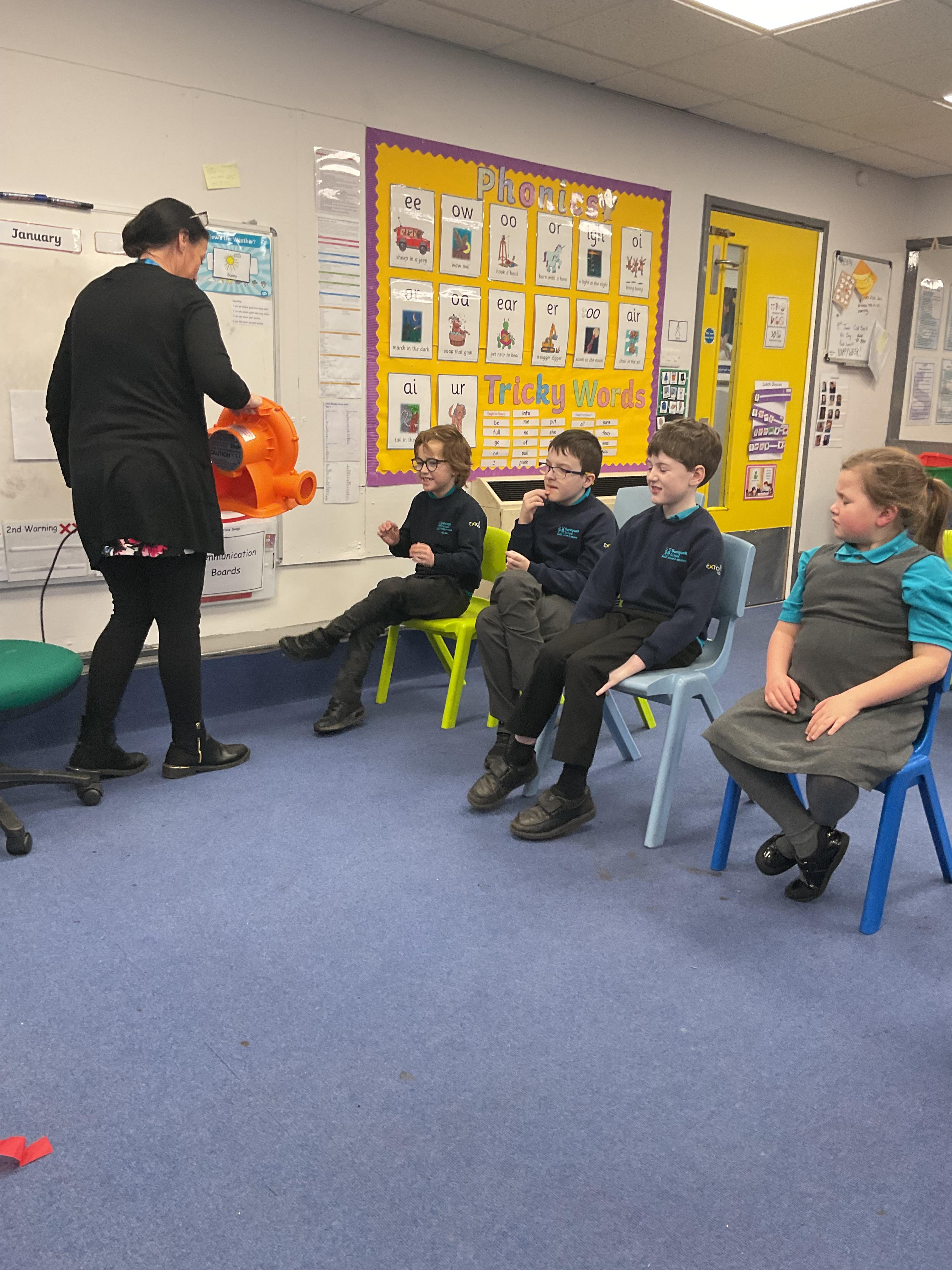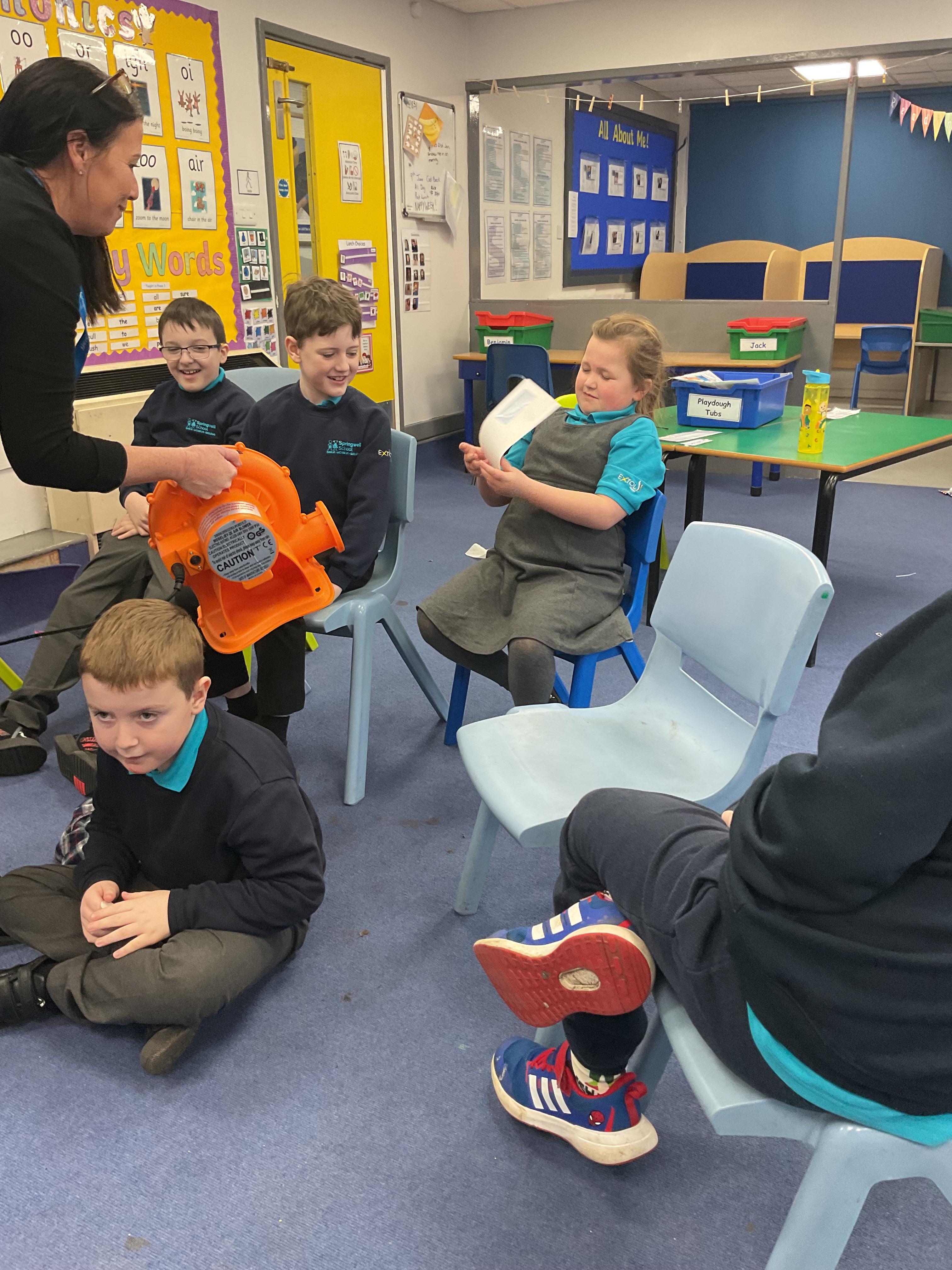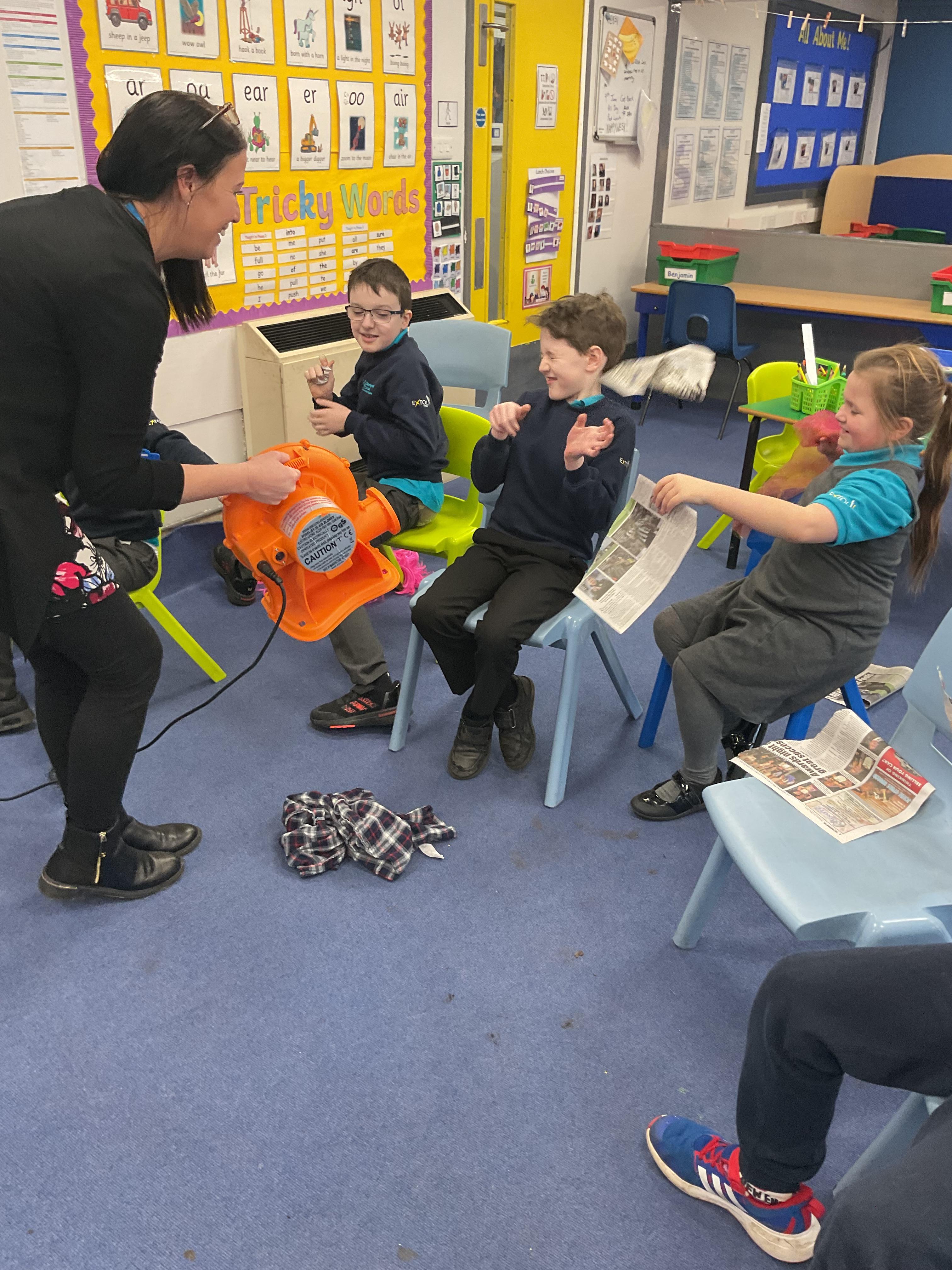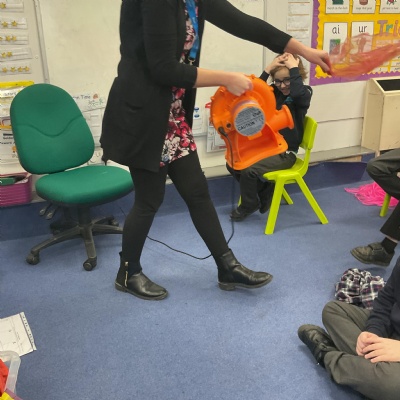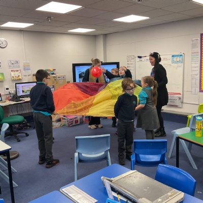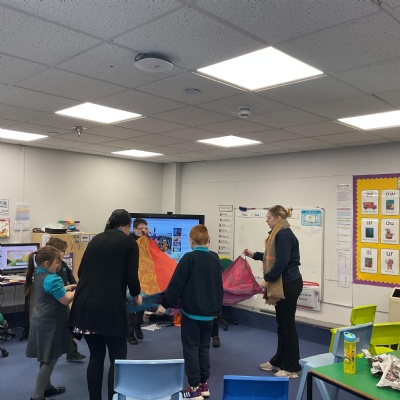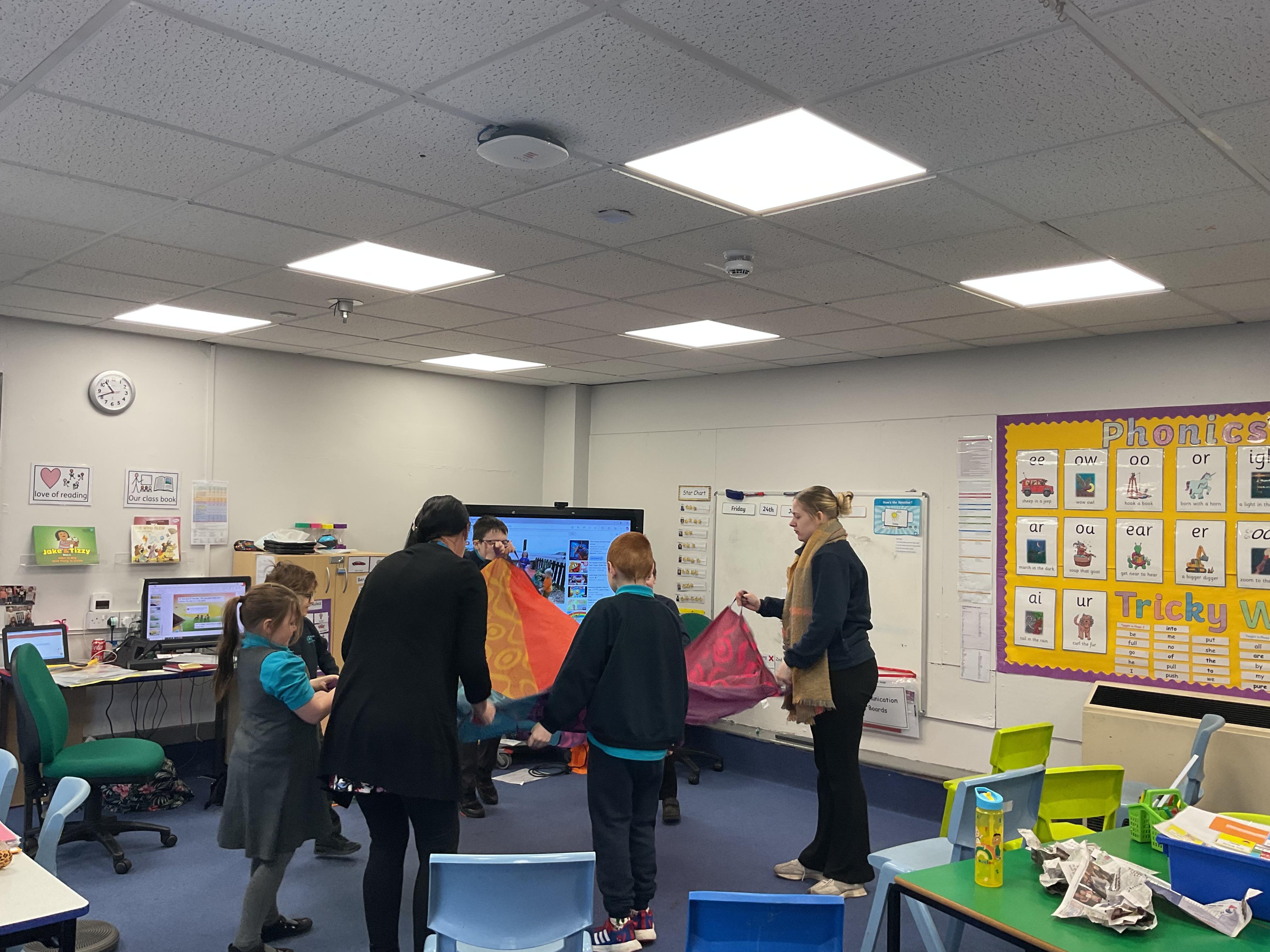22.01.25 LITERACY Text: 'The Wind Blew' - The children loved feeling the wind machine blow on them, they giggled when the wind machine blew away all the different objects away in the story. After the story, the children enjoyed singing and dancing with the parachute to the song: 'It's a Windy Day'.