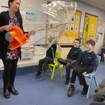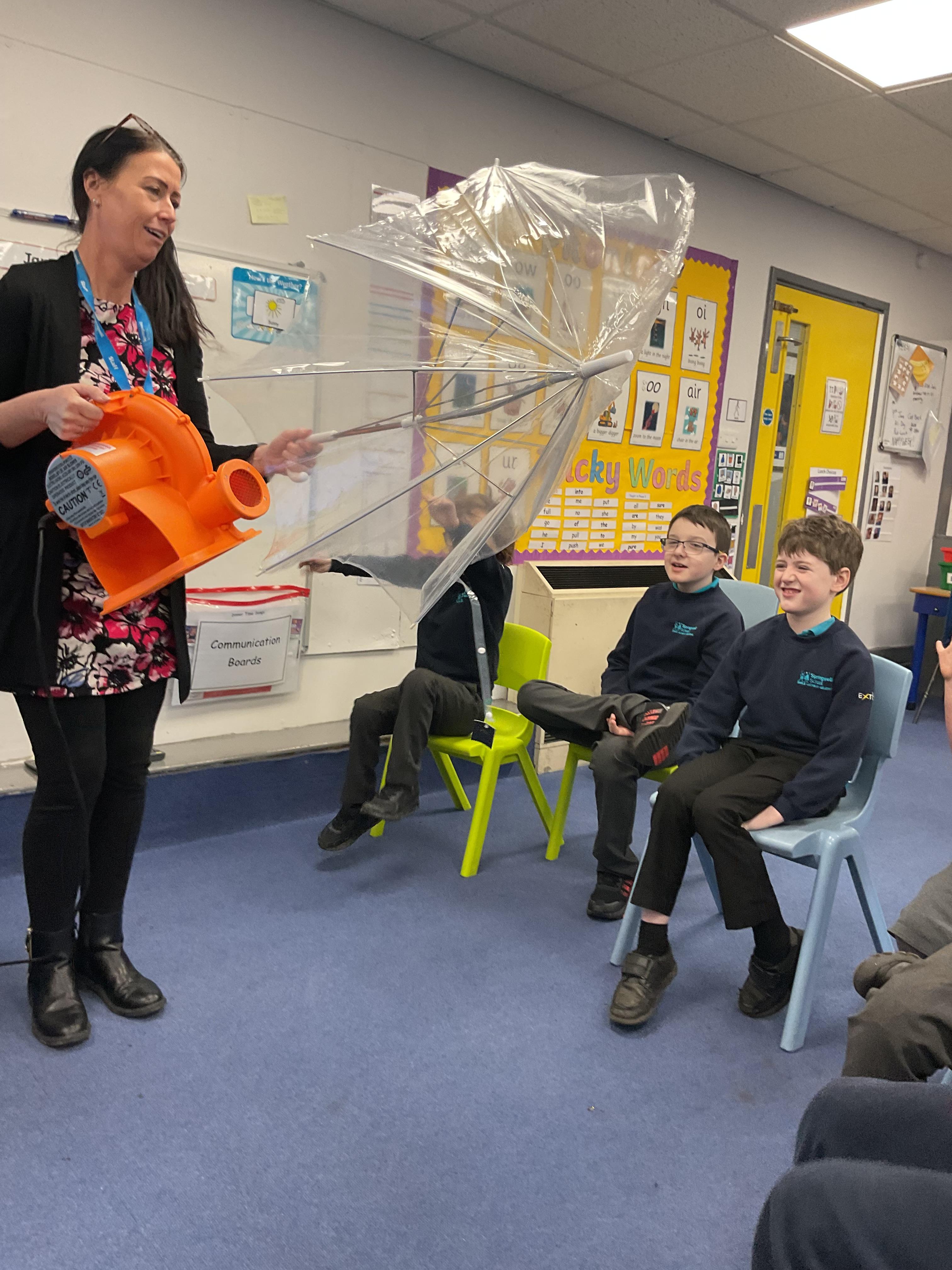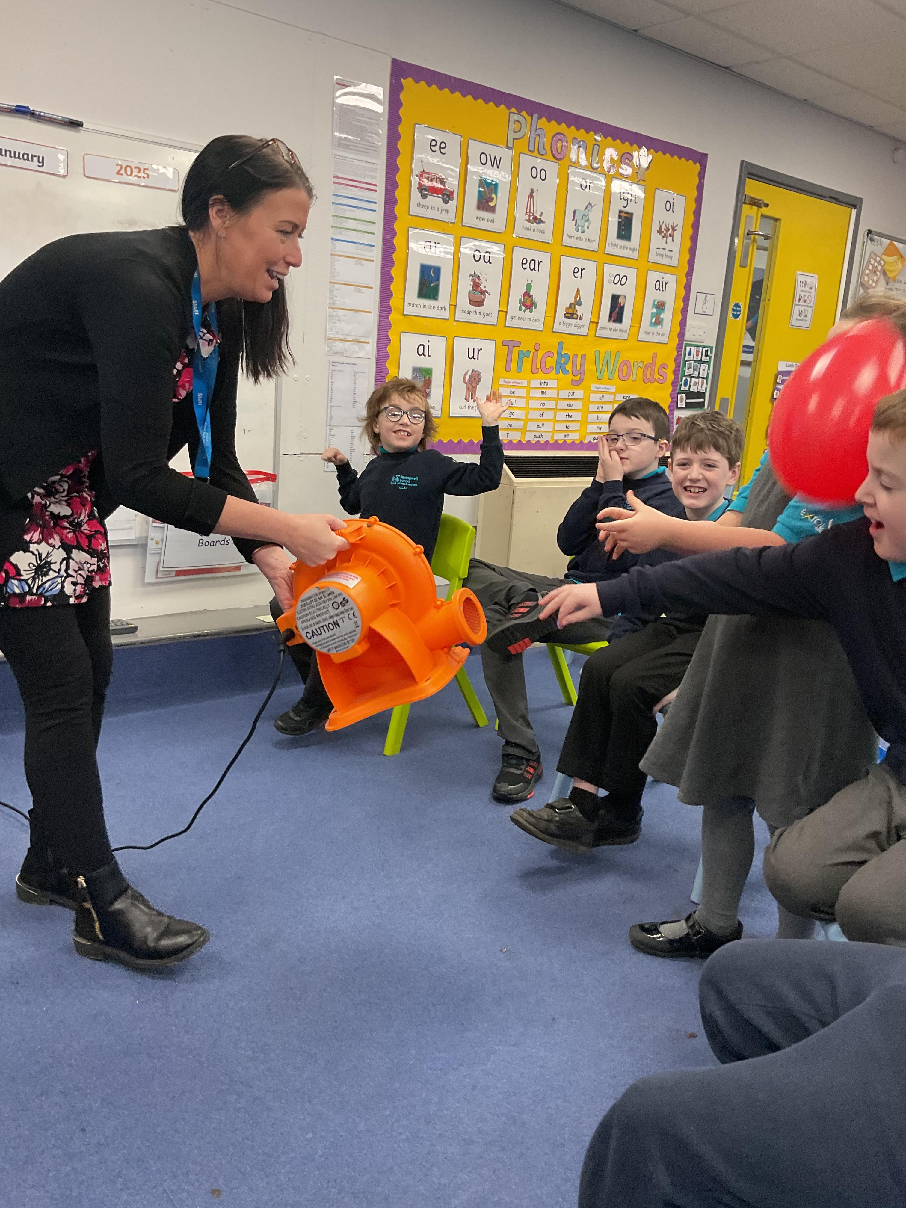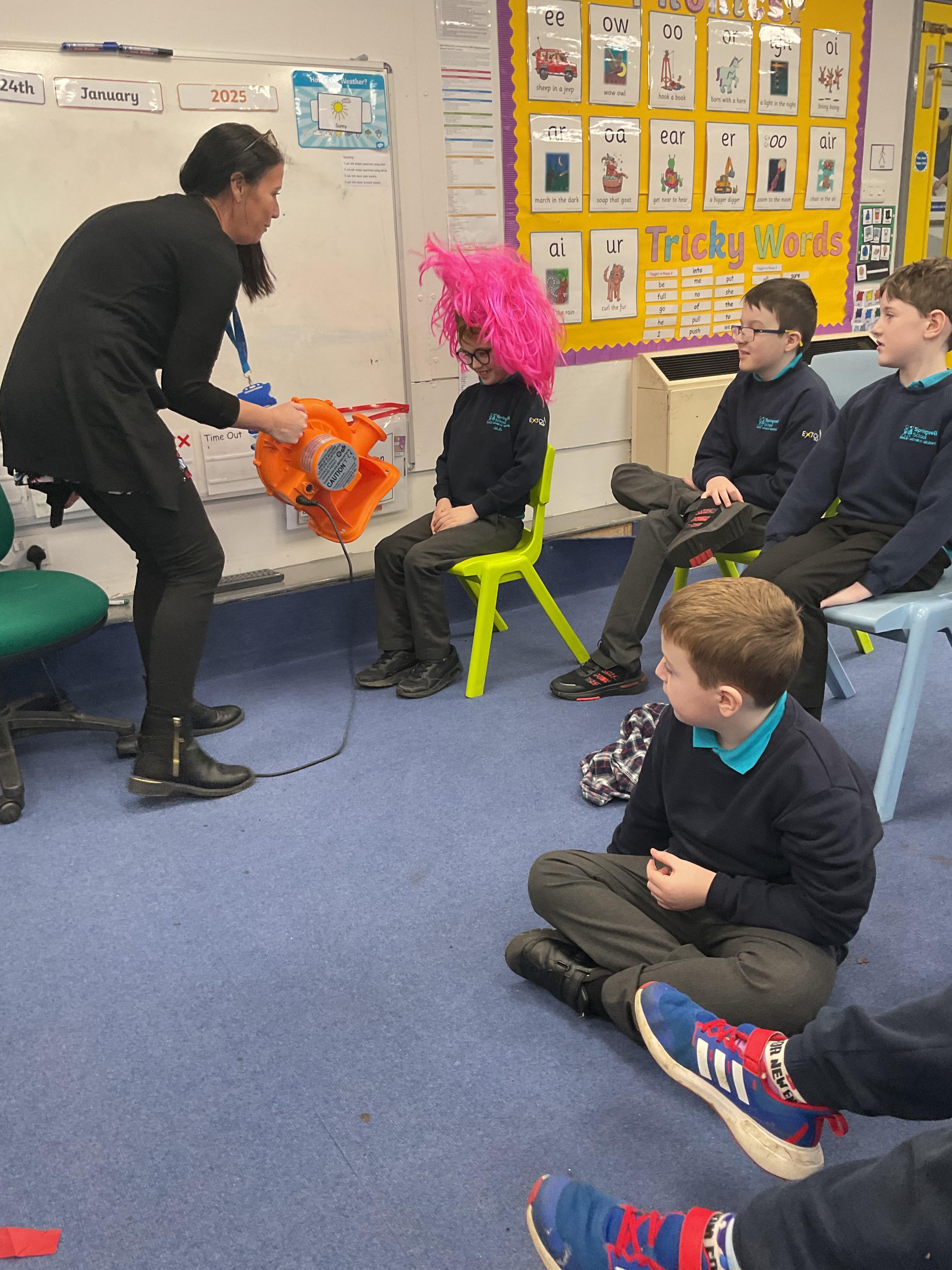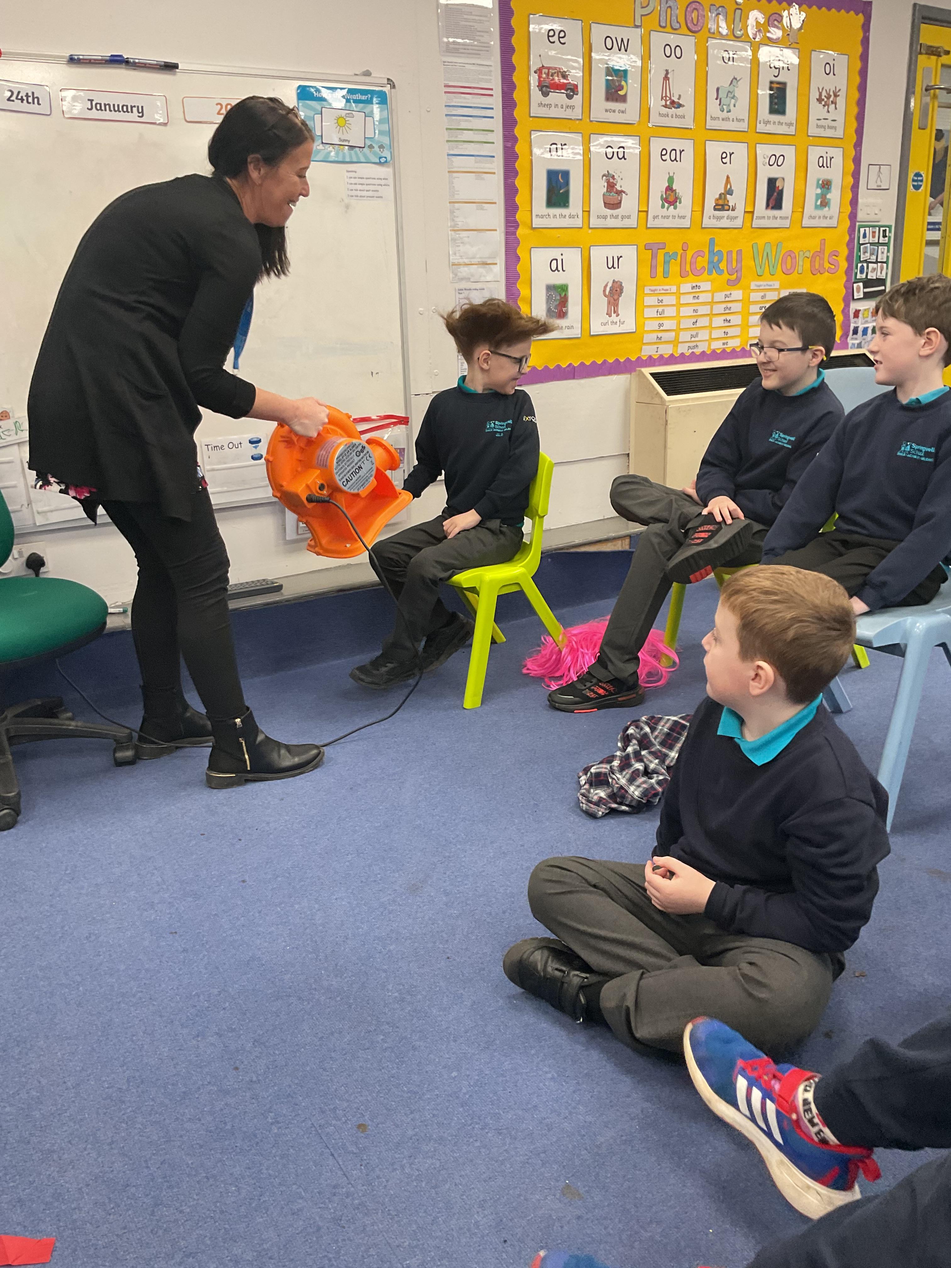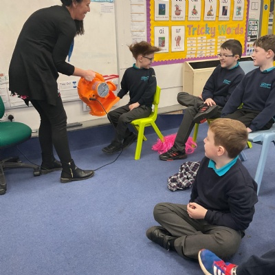 22.01.25 LITERACY Text: 'The Wind Blew' - The children loved feeling the wind machine blow on them, they giggled when the wind machine blew away all the different objects away in the story. After the story, the children enjoyed singing and dancing with the parachute to the song: 'It's a Windy Day'.
