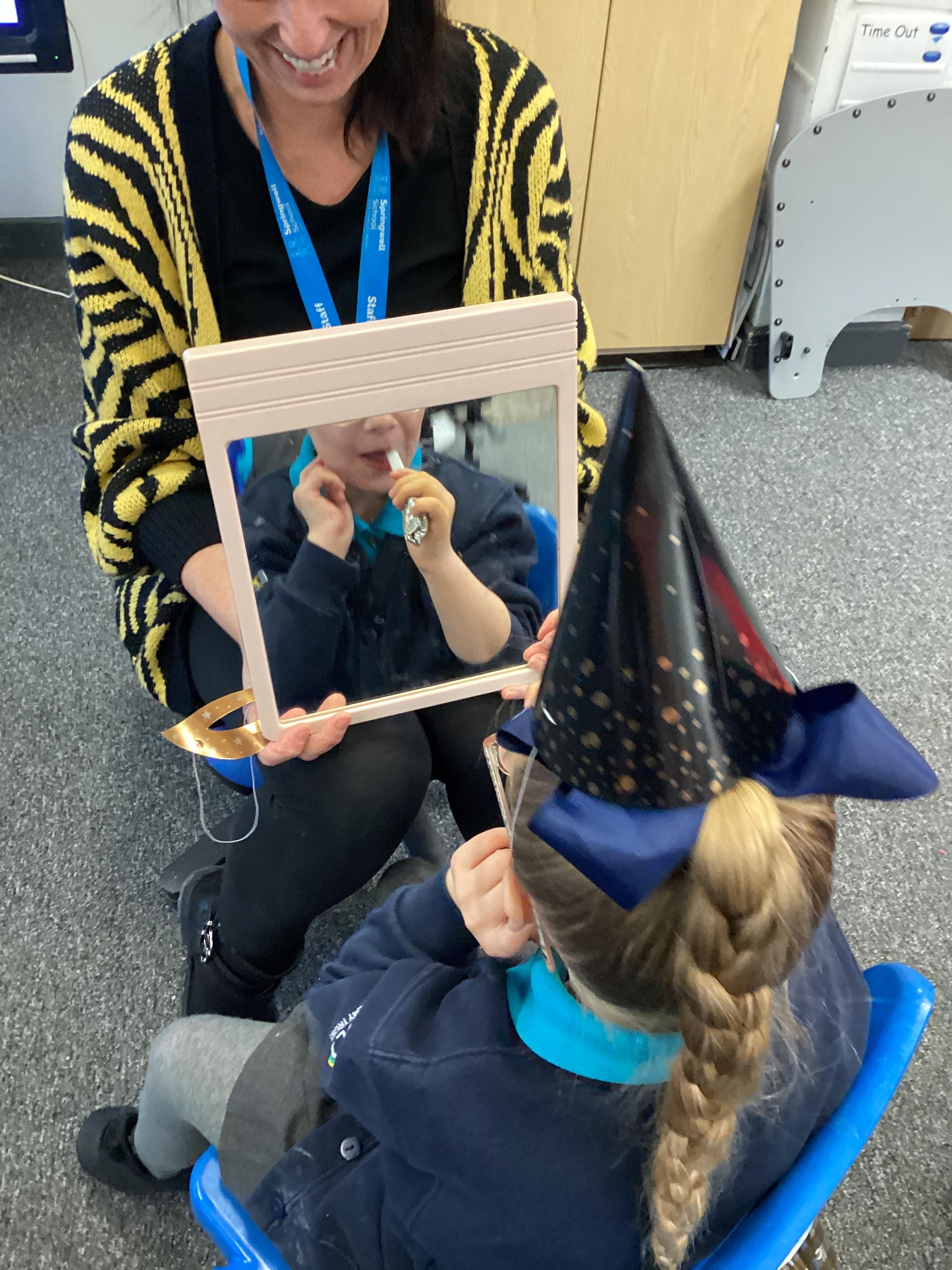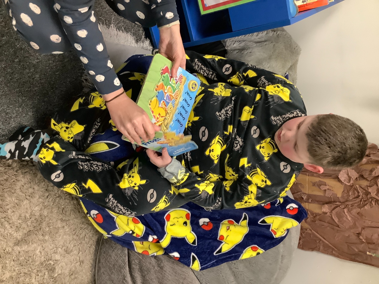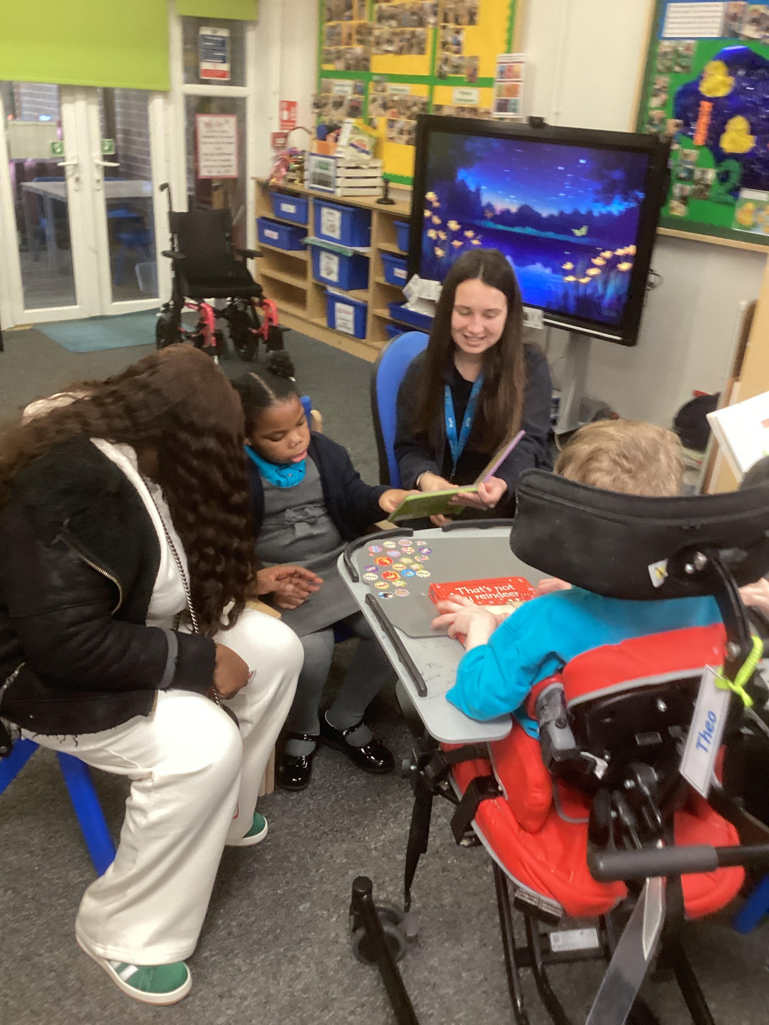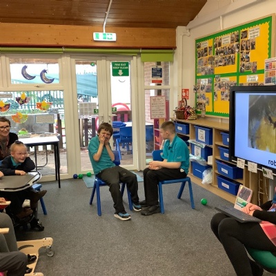 We all came into school today wearing our pyjamas, which created such a cosy and relaxed atmosphere. The children chose a book from our reading corner and enjoyed quietly looking through it while snuggled up in the comfy space. After lunch, we all sat comfortably in a circle and excitedly unwrapped our special World Book Day story. Our book was called: 'Five More Minutes' by 'Marta Altés'. The teacher read the story aloud and encouraged the children to explore all the sensory props as the story unfolded. We especially loved the part where the foxes jumped in the puddles. To bring this moment to life, we created our own splashes by slapping our hands into a tray of water — it was so funny and everyone giggled together. To finish, we re‑enacted the end of the story when the foxes went to bed. The children snuggled up, got cosy, and listened to some calming, relaxing music, creating a peaceful end to our World Book Day adventure.
