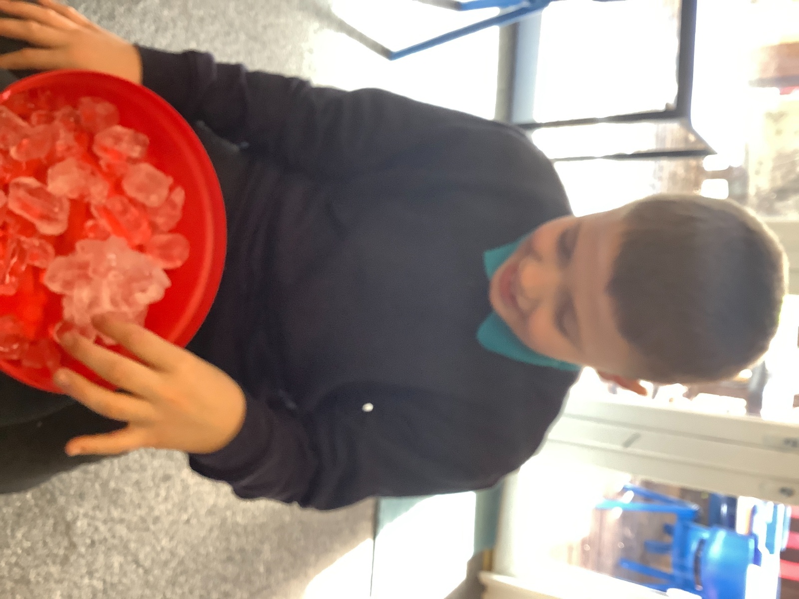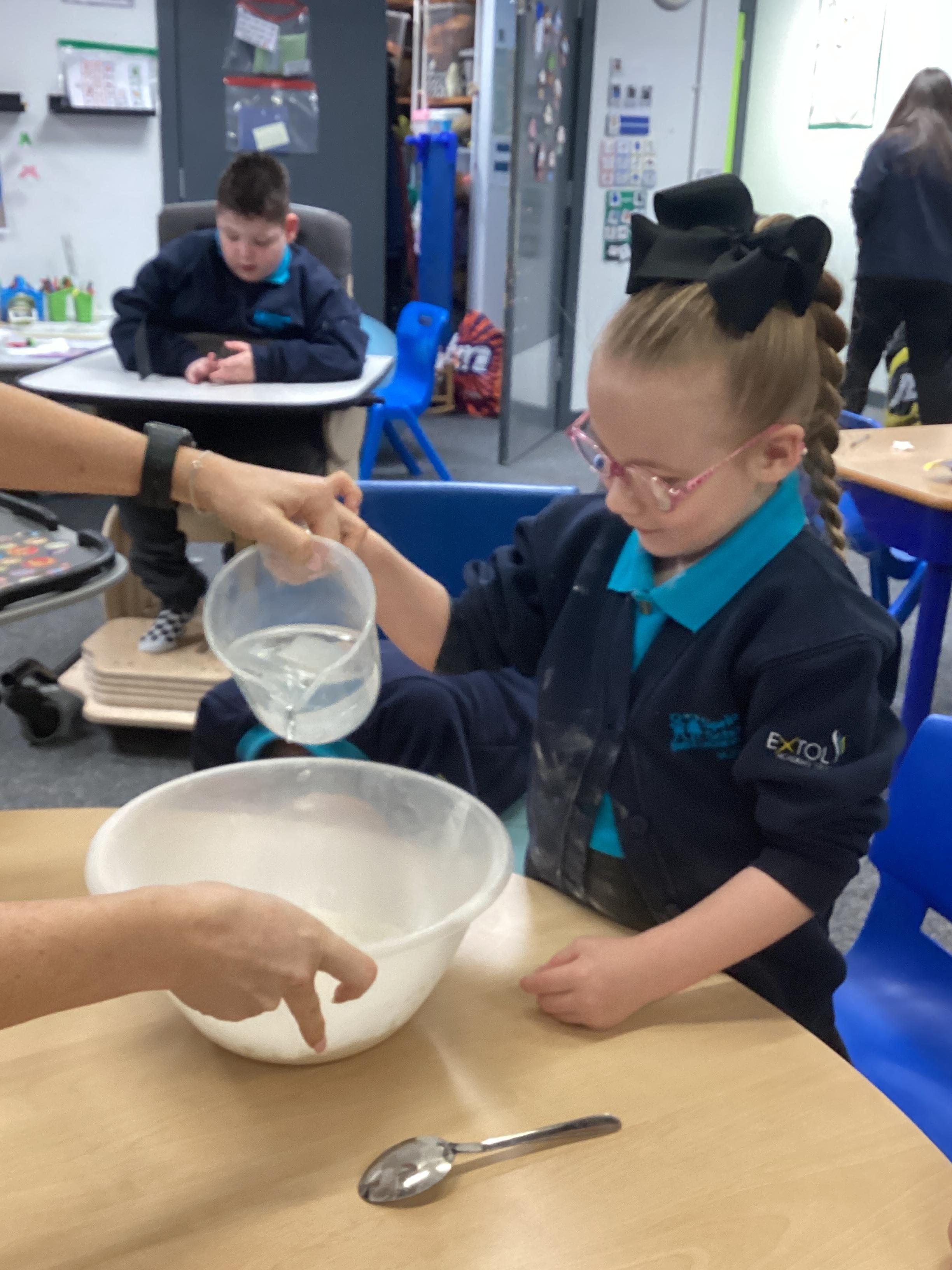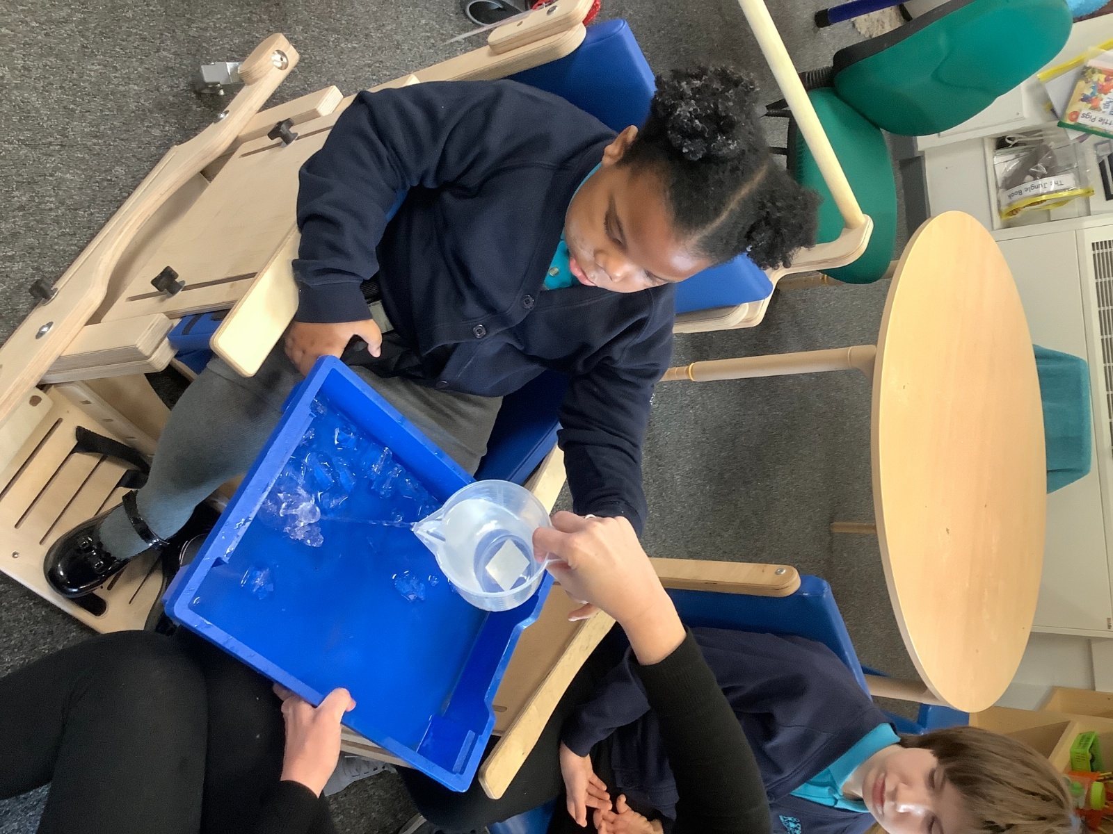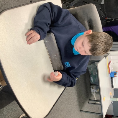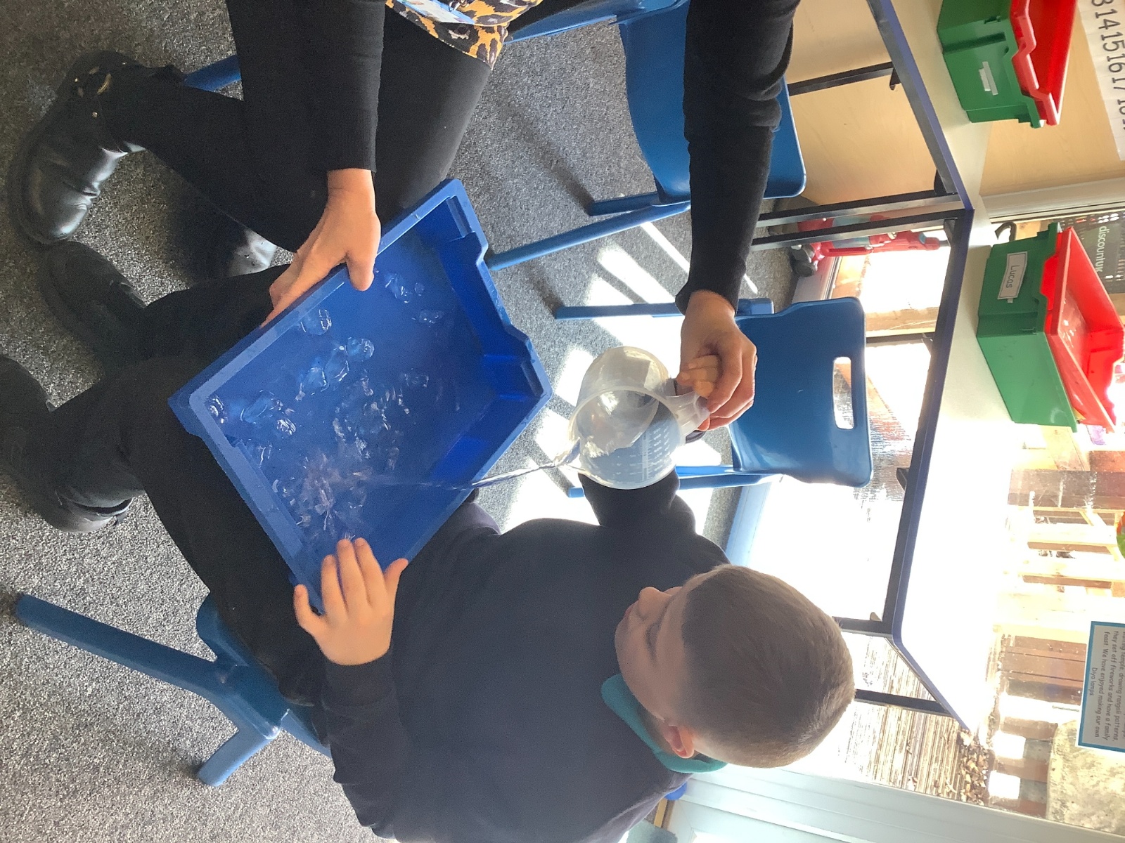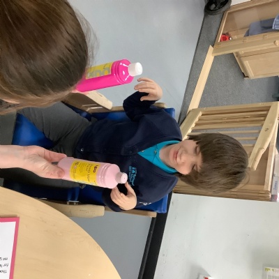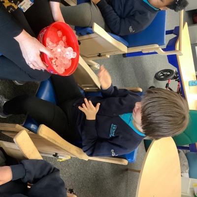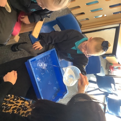 We have been transforming solid chocolate pieces into a smooth, runny liquid by gently heating them in the microwave. The children have also been exploring how solid ice changes state by pouring warm water over ice cubes and watching them melt into liquid water.