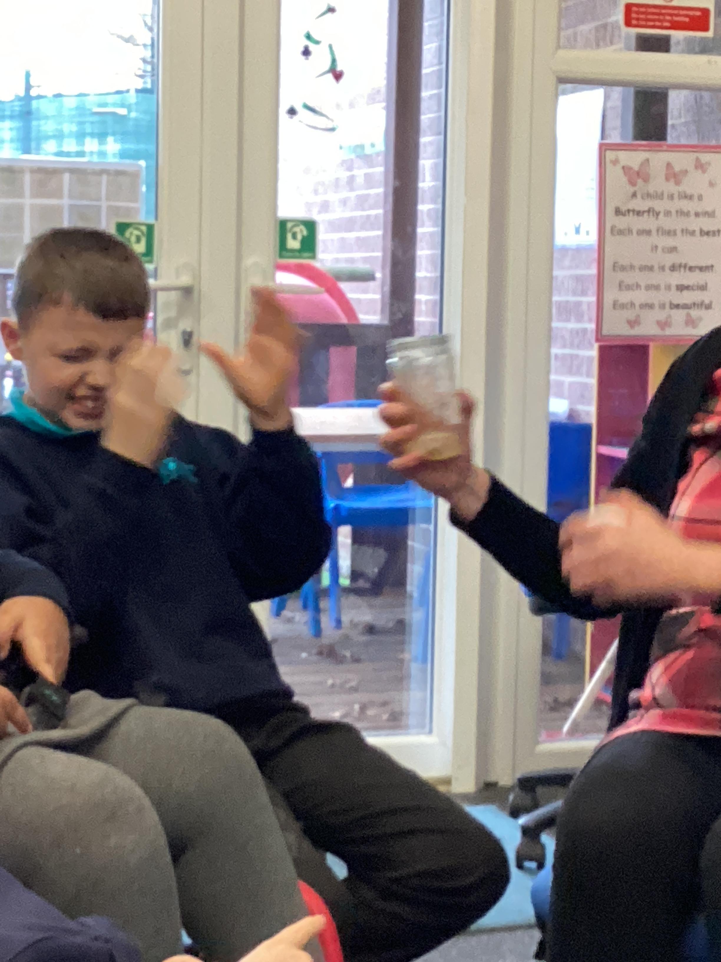 Another activity involved pouring warm water over shaving foam and observing the reaction — the foam gradually disintegrated and dissolved into the water. The children also enjoyed searching through a tray of noodles, eagerly hunting for a hidden centipede.