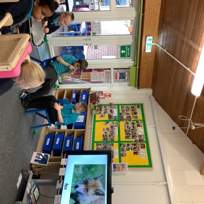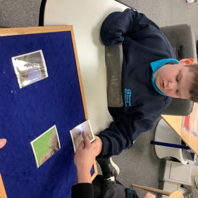 Together, we looked at a variety of animals that live in woodland areas, e.g. owls, deer, birds, robins, badgers, hedgehogs, butterflies etc. We talked about their appearance and how each animal was similar and different, e.g. some owls had long ears and some owls had short ears, all birds have feathers etc. Images of these woodland animal faces were cut in half and mixed up. The children were asked to match the halves of the faces and identify the animals.