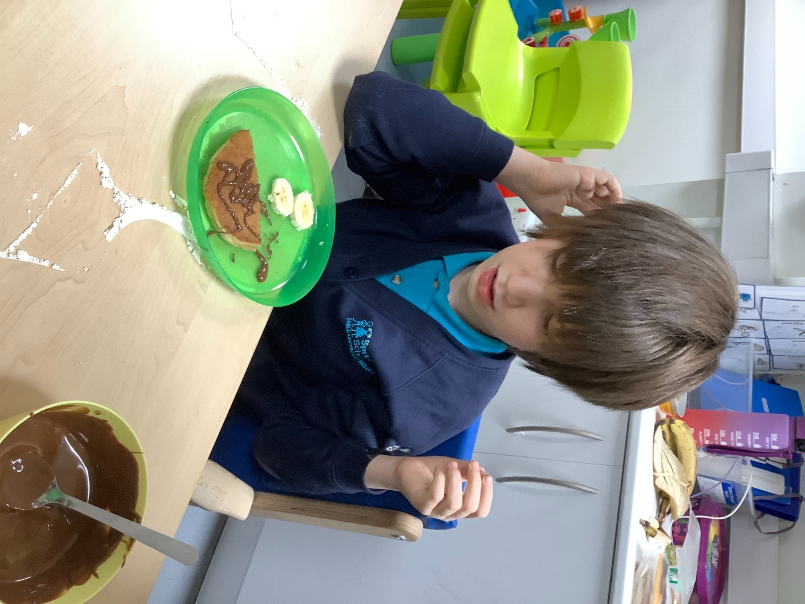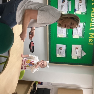 The children made pancakes this morning. Evie had a turn at tossing the pancake into the air, but it didn’t quite land back in the middle of the pan, which made everyone laugh. Once the pancakes were cooked, the children chose their own favourite toppings from a selection that included strawberries, banana, chocolate and more. They were absolutely delicious and enjoyed by all.
