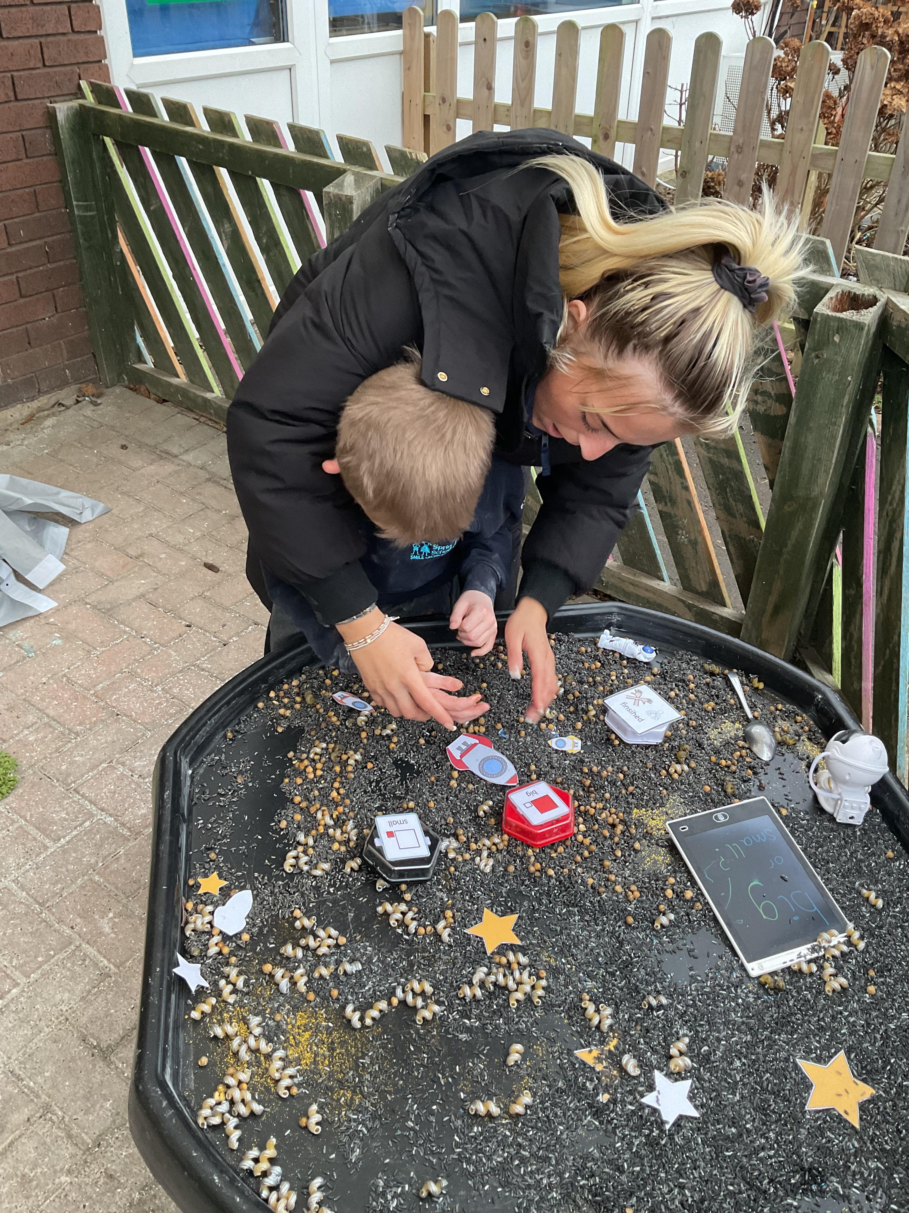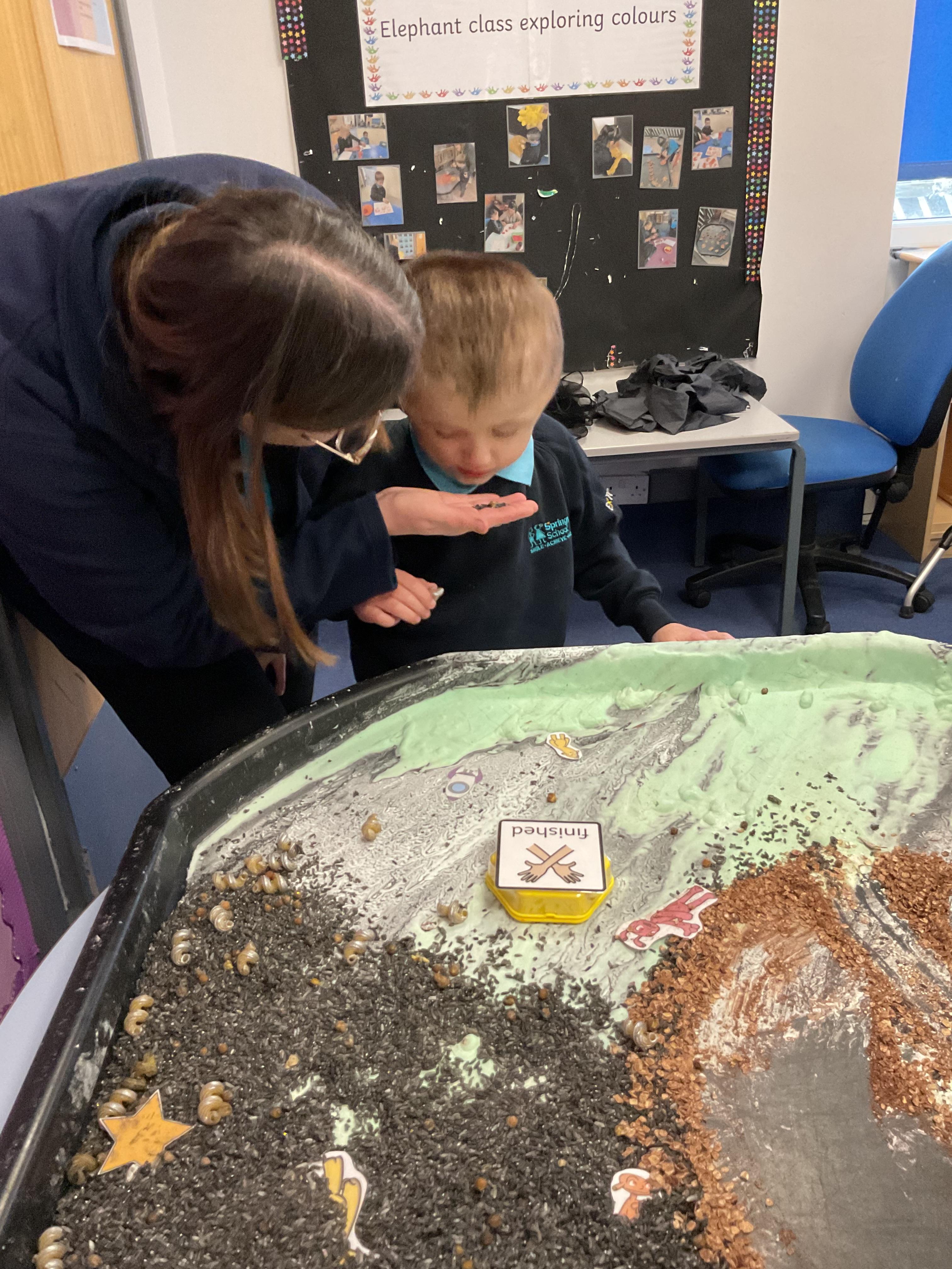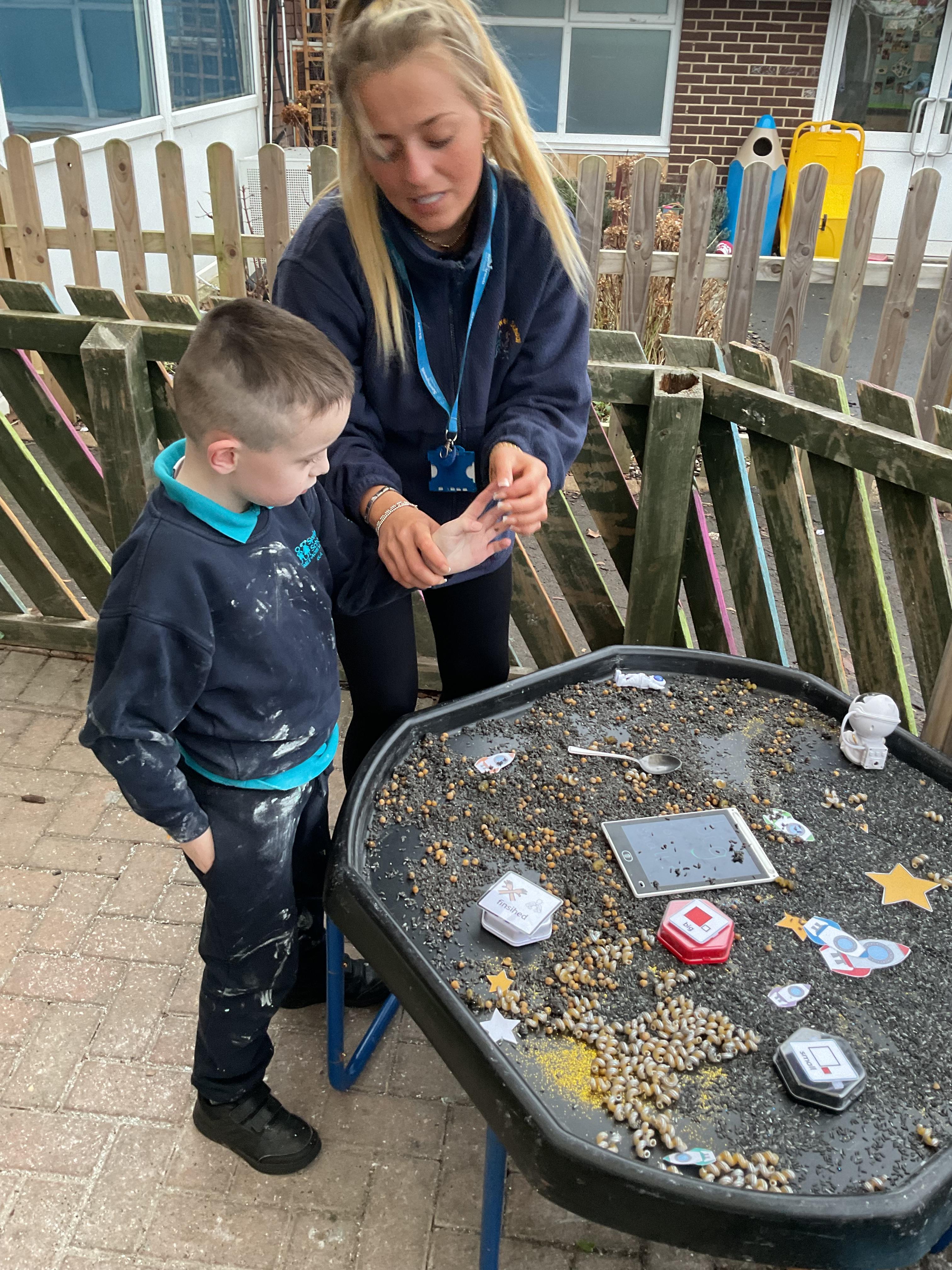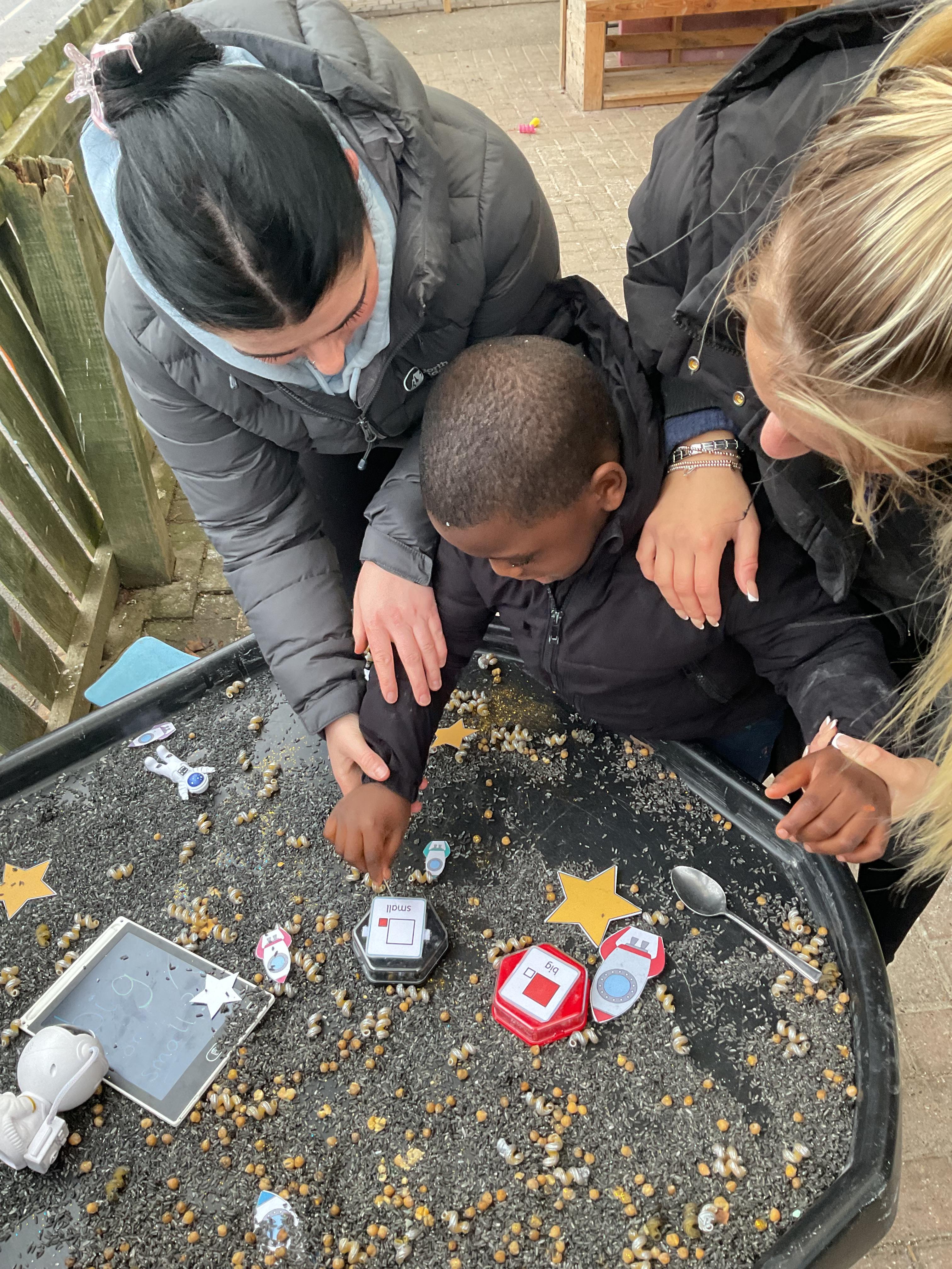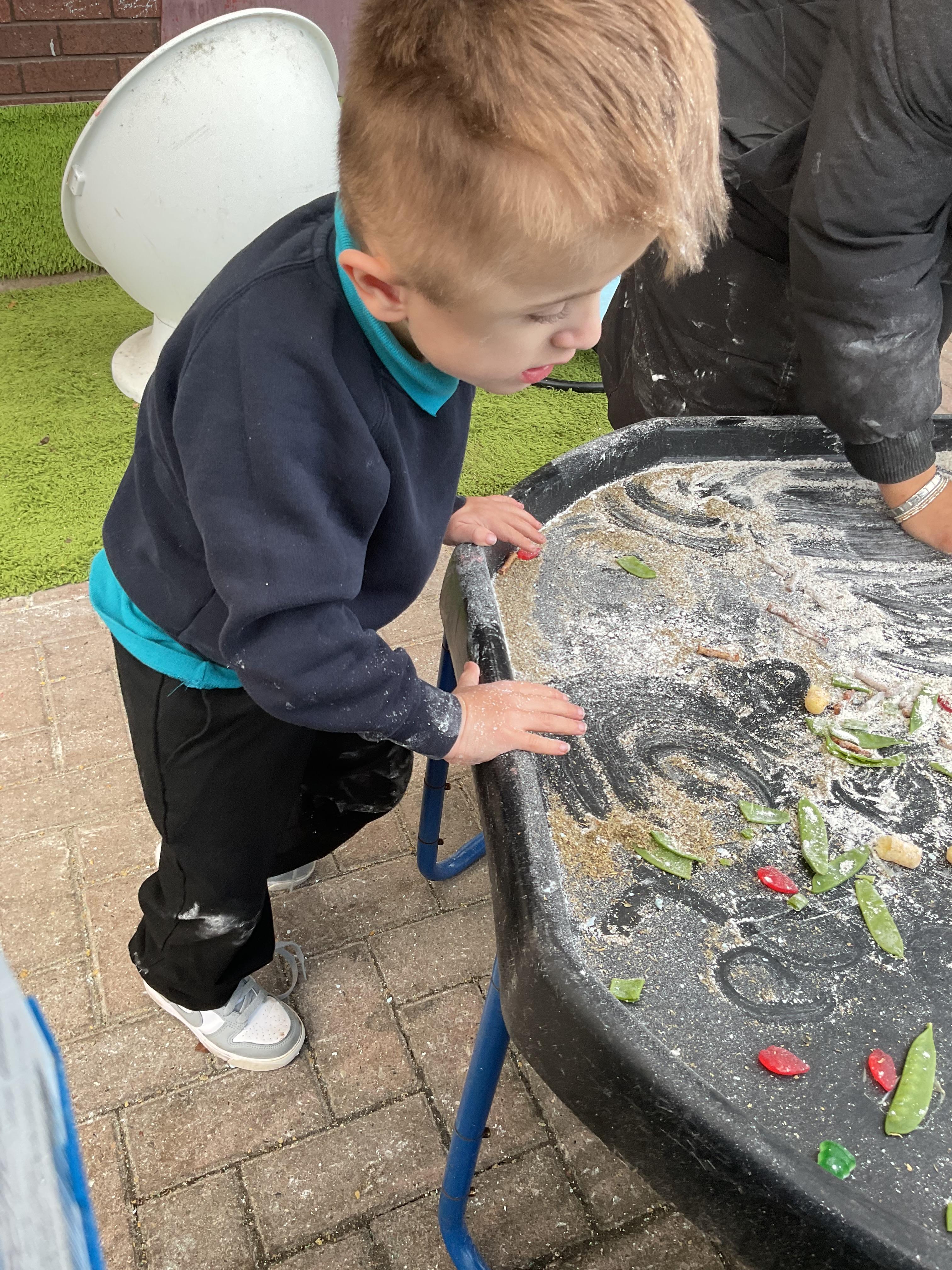 This week has been full of excitement as we continued our learning all about the future. The children loved revisiting our sensory story “Tomorrow, Tomorrow” and engaged brilliantly with all the interactive element. Our colour of the week was black and we explored a range of black objects on our themed table while also learning the Makaton sign for black. In maths, we investigated big and small rockets using a messy play tuff tray filled with rice, pasta and chickpeas. We also had great fun making green gloop, watching how it moved and noticing the sensory experience as it dripped from the plate. Everyone has worked incredibly hard on their workbox tasks, including building with blocks, matching activities and mark making.