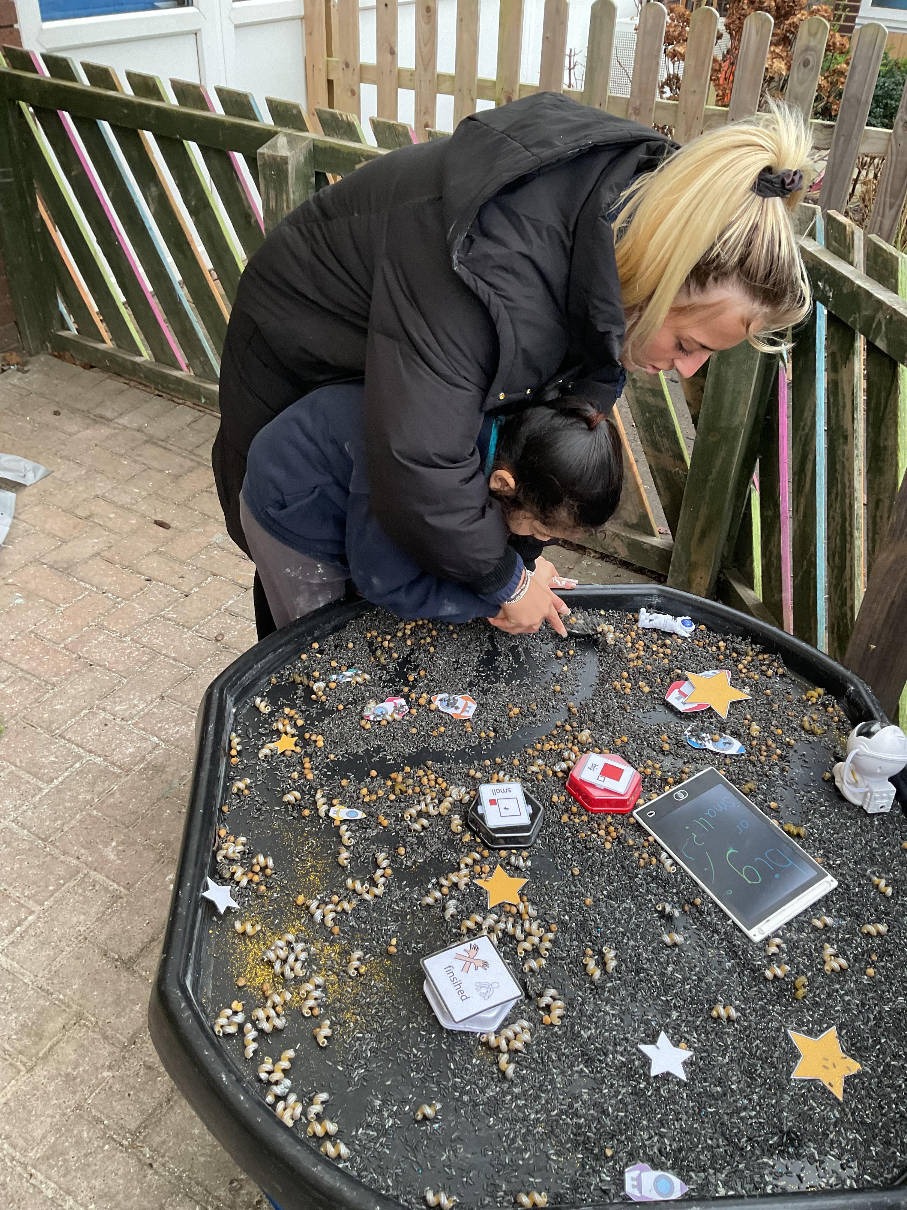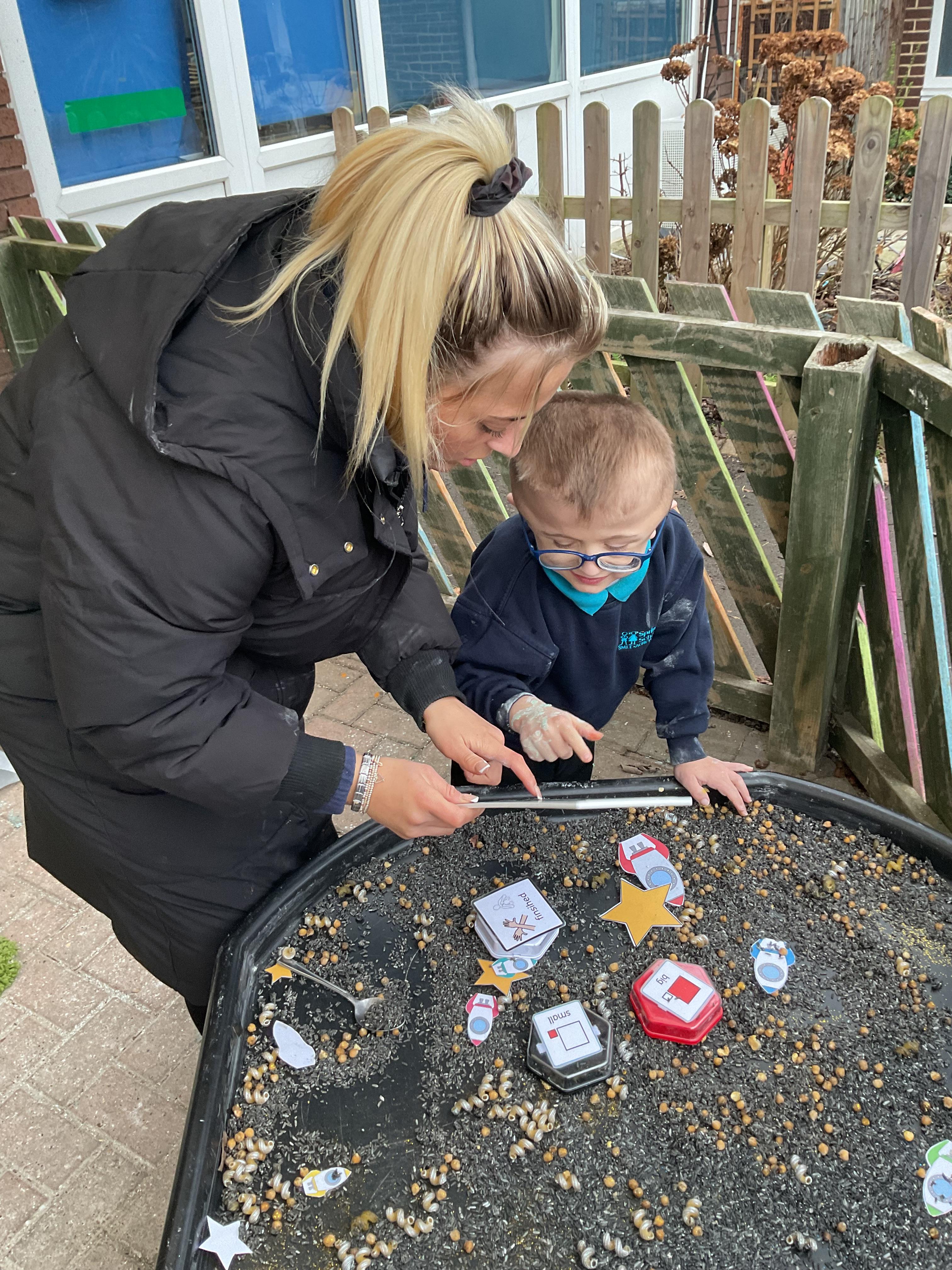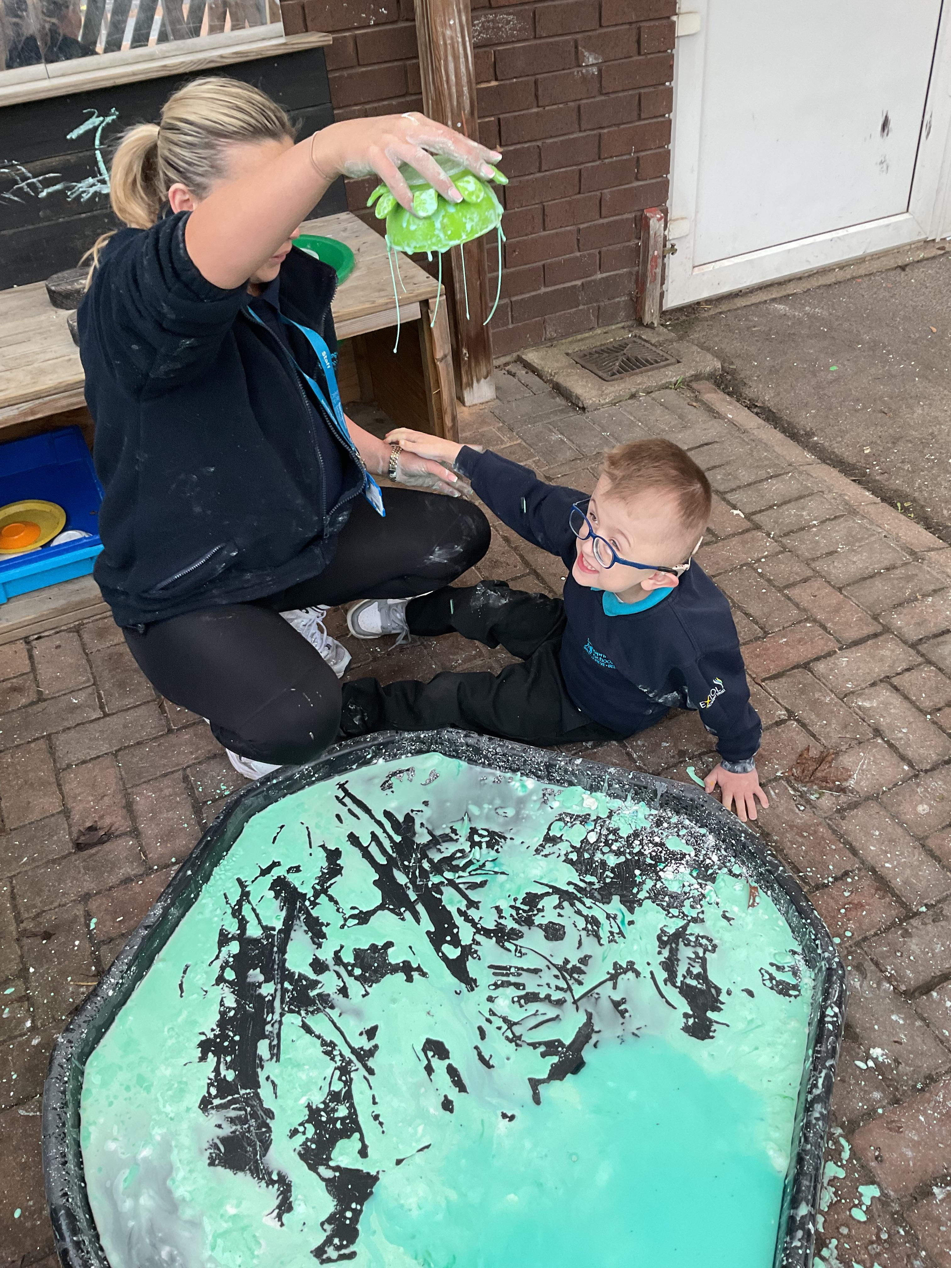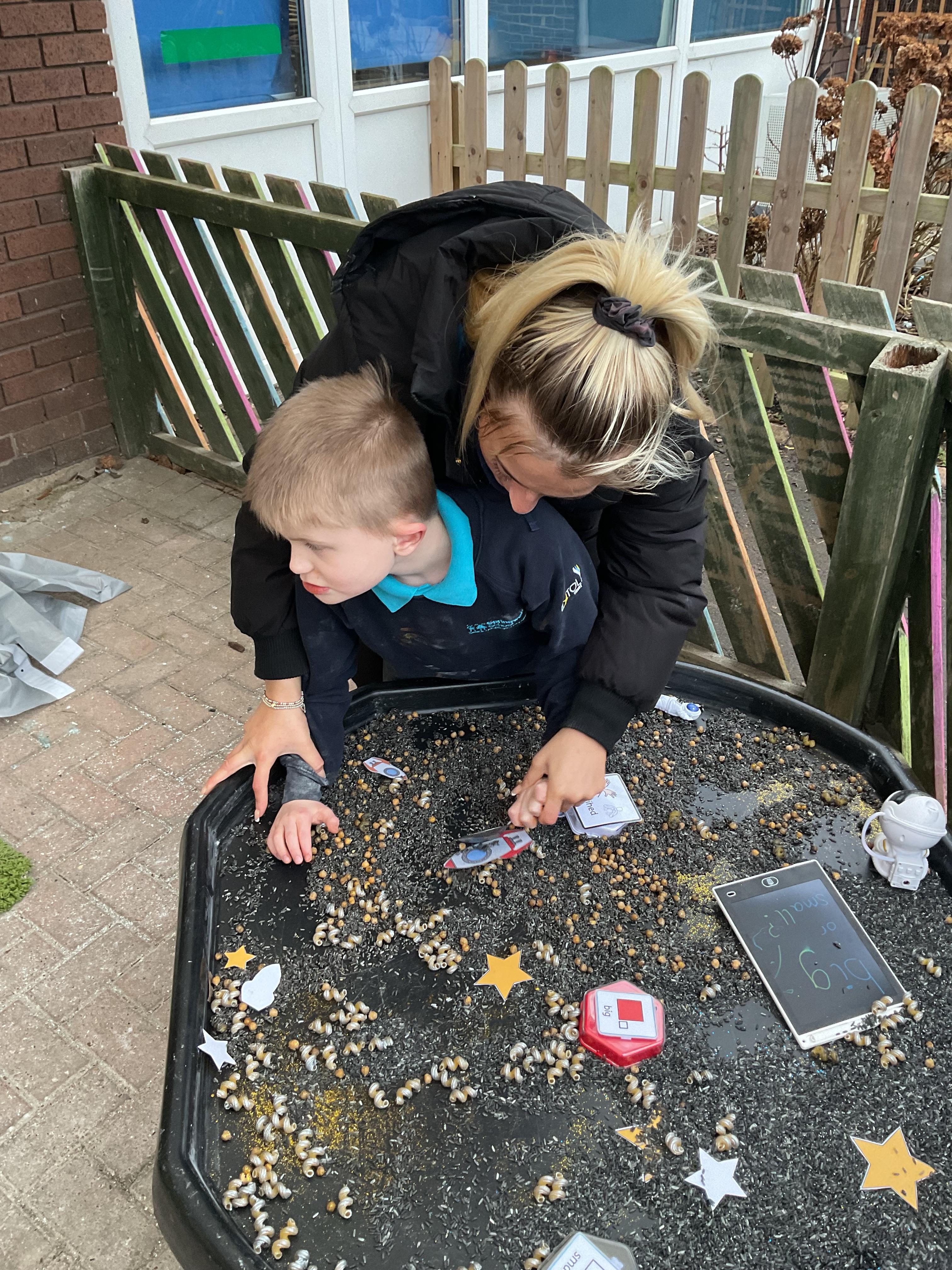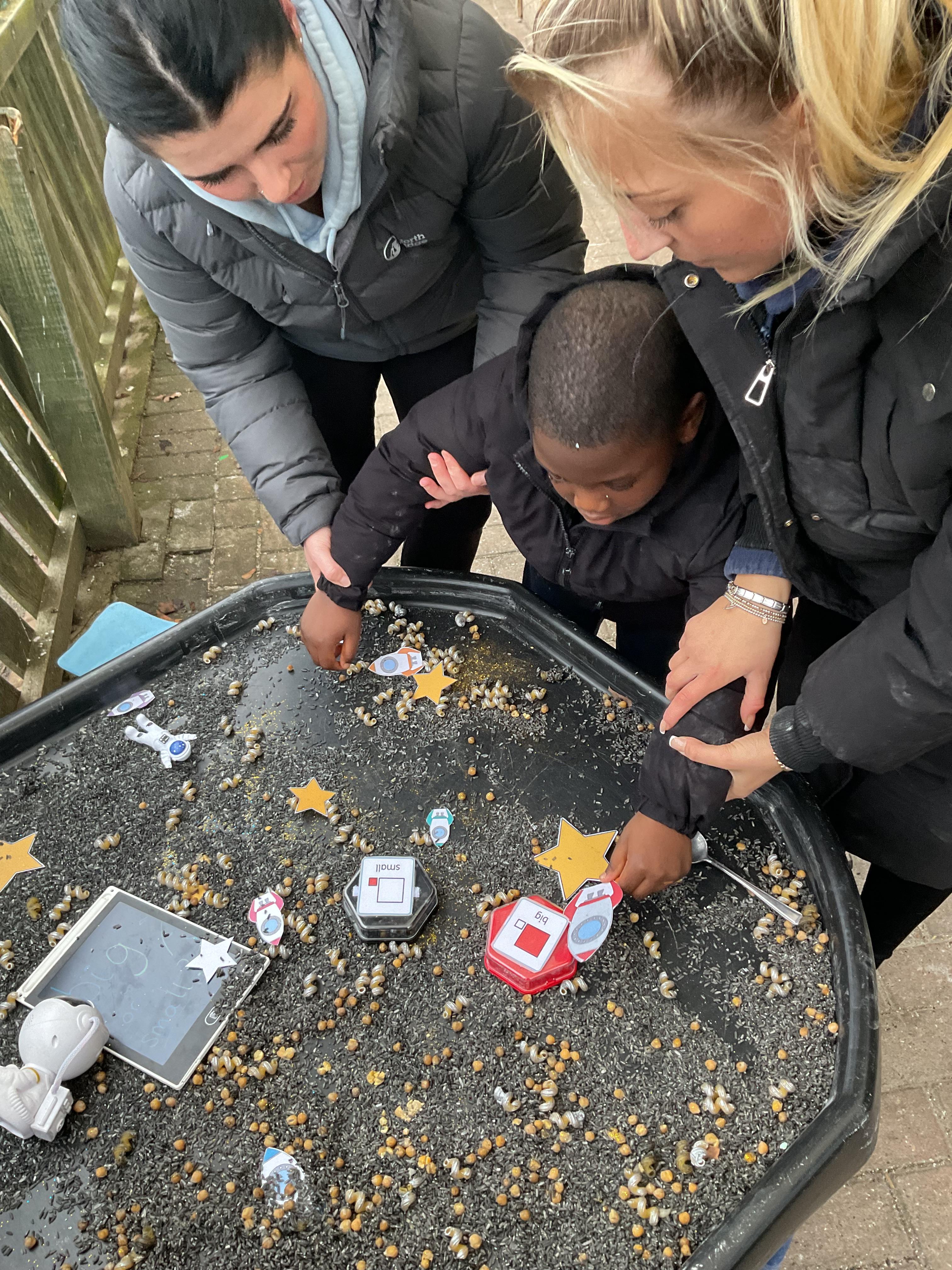 This week has been full of excitement as we continued our learning all about the future. The children loved revisiting our sensory story “Tomorrow, Tomorrow” and engaged brilliantly with all the interactive element. Our colour of the week was black and we explored a range of black objects on our themed table while also learning the Makaton sign for black. In maths, we investigated big and small rockets using a messy play tuff tray filled with rice, pasta and chickpeas. We also had great fun making green gloop, watching how it moved and noticing the sensory experience as it dripped from the plate. Everyone has worked incredibly hard on their workbox tasks, including building with blocks, matching activities and mark making.