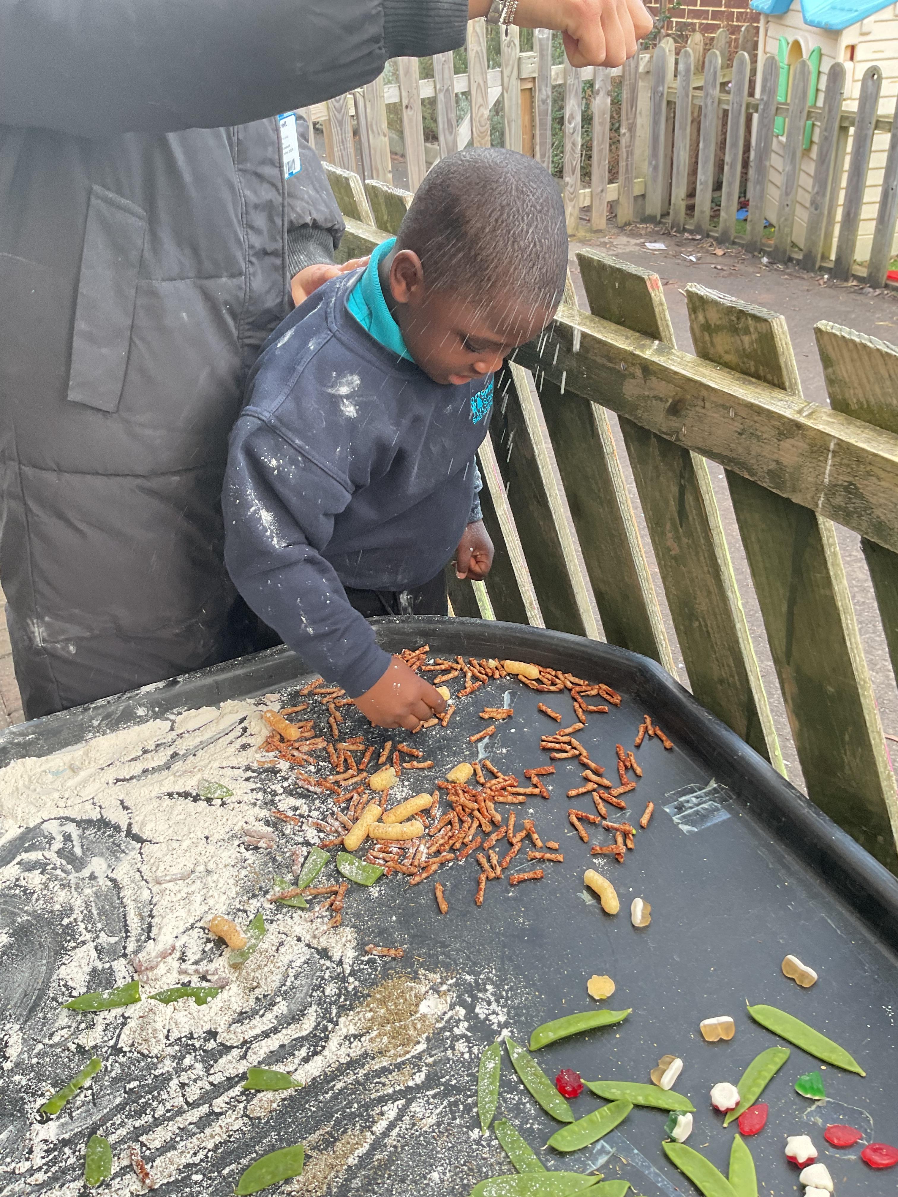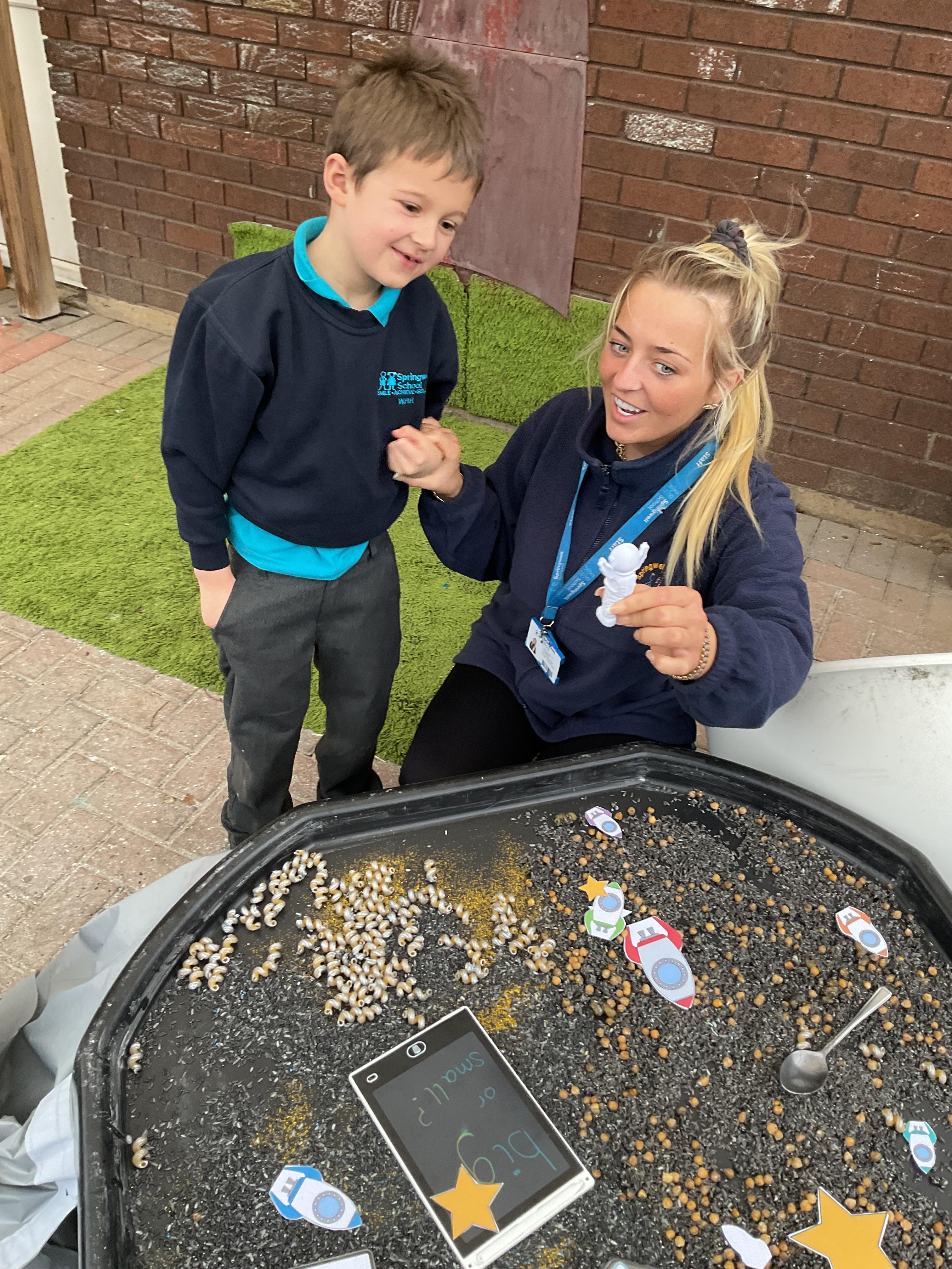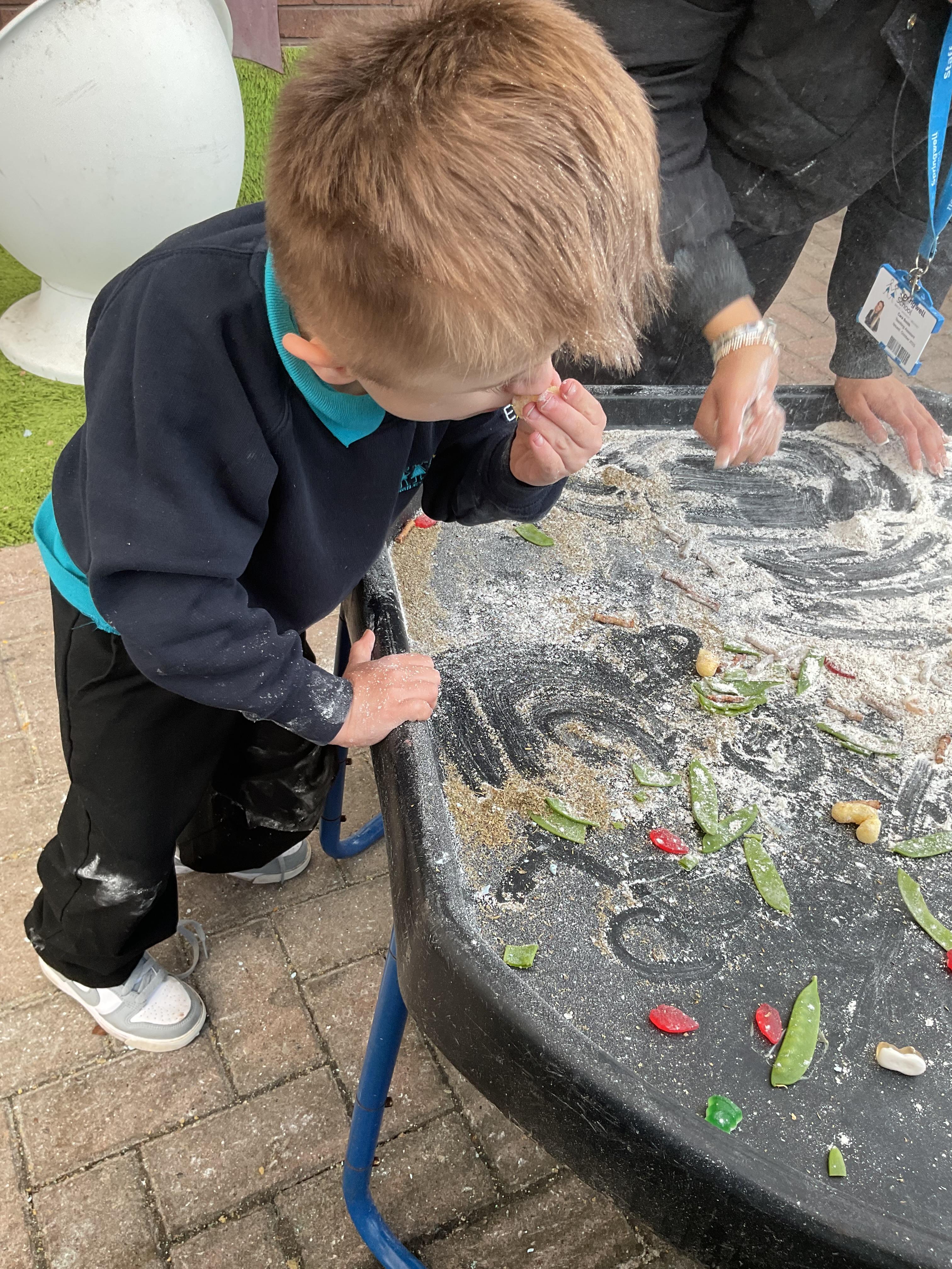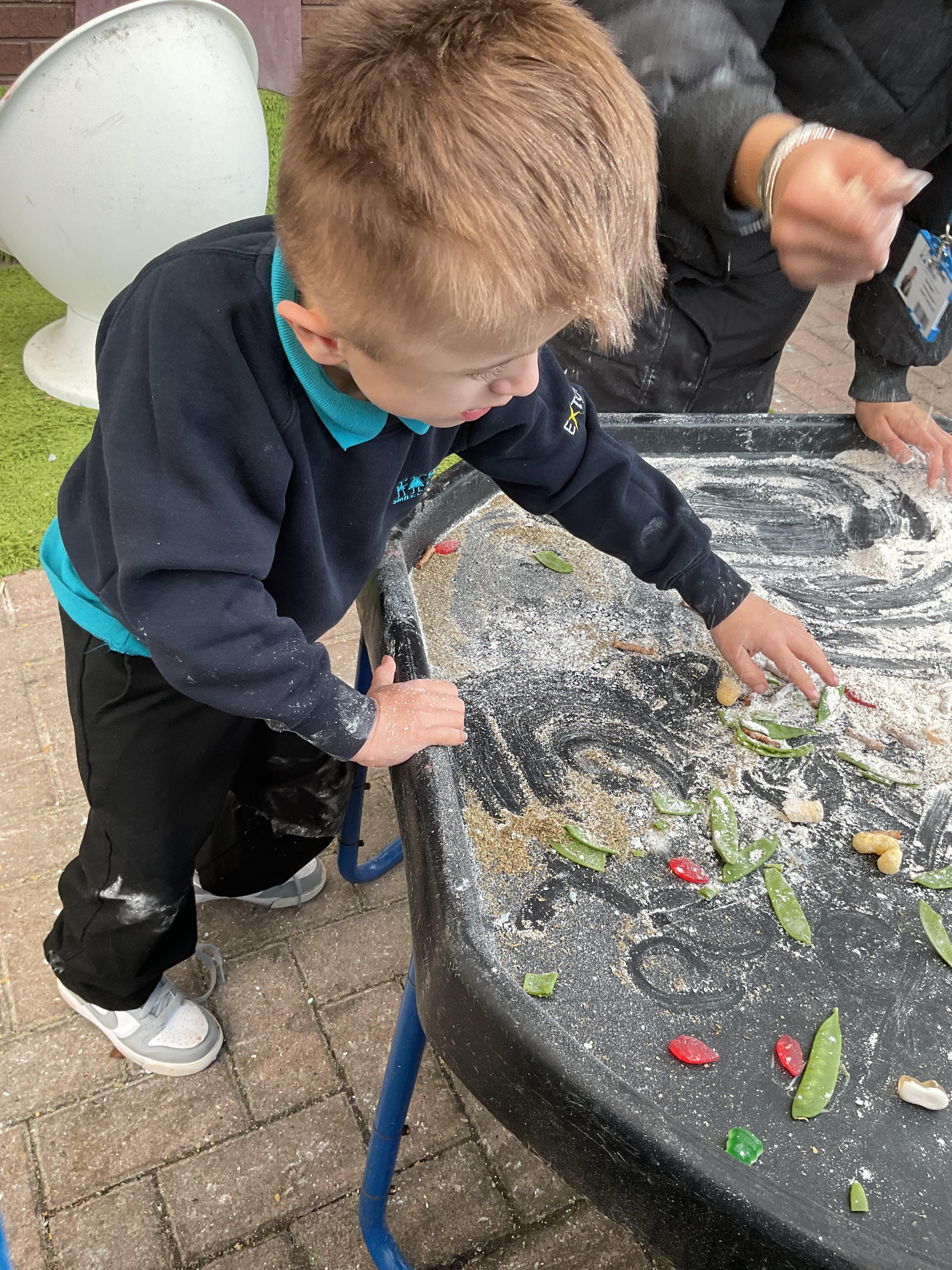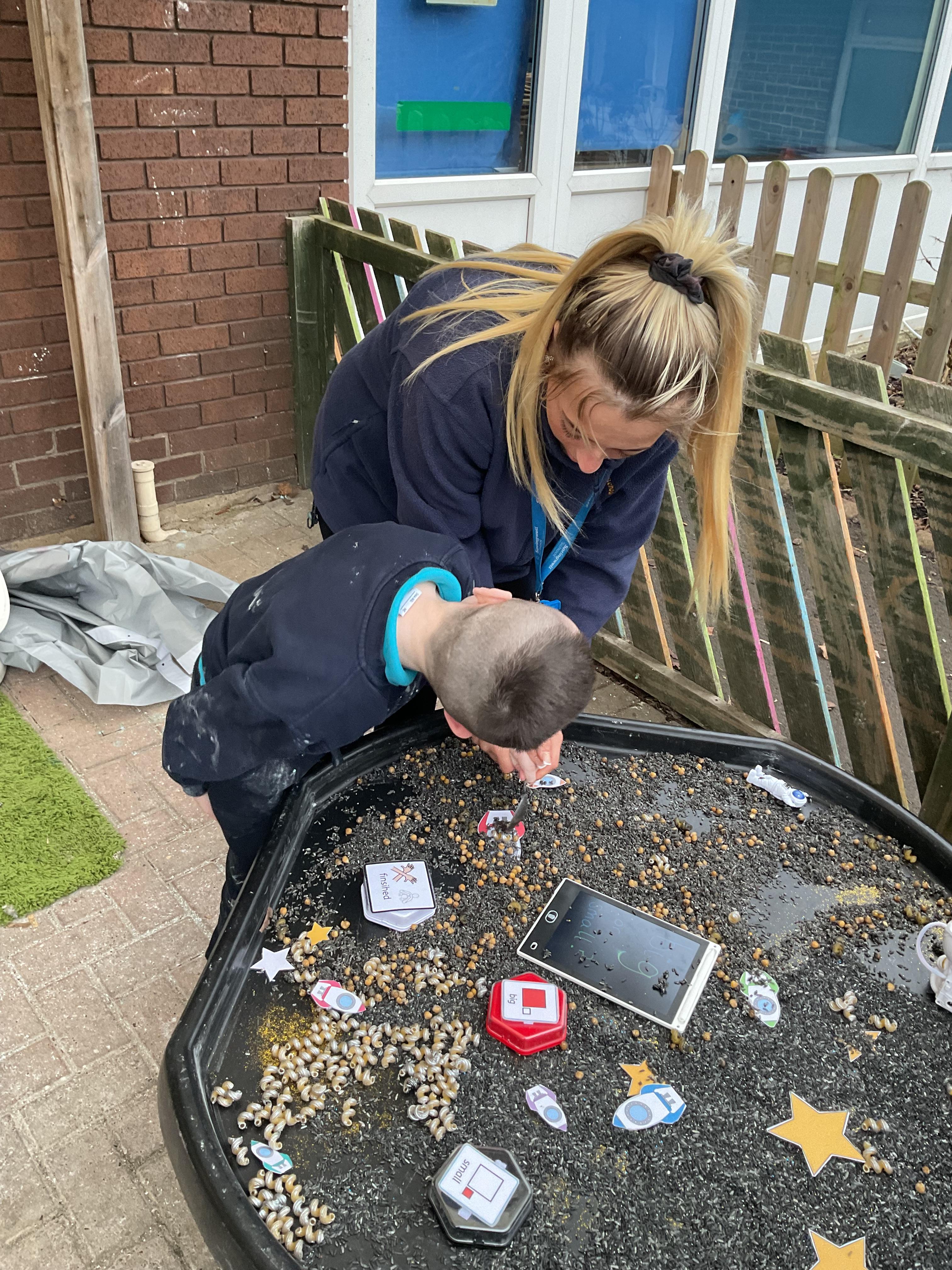 This week has been full of excitement as we continued our learning all about the future. The children loved revisiting our sensory story “Tomorrow, Tomorrow” and engaged brilliantly with all the interactive element. Our colour of the week was black and we explored a range of black objects on our themed table while also learning the Makaton sign for black. In maths, we investigated big and small rockets using a messy play tuff tray filled with rice, pasta and chickpeas. We also had great fun making green gloop, watching how it moved and noticing the sensory experience as it dripped from the plate. Everyone has worked incredibly hard on their workbox tasks, including building with blocks, matching activities and mark making.