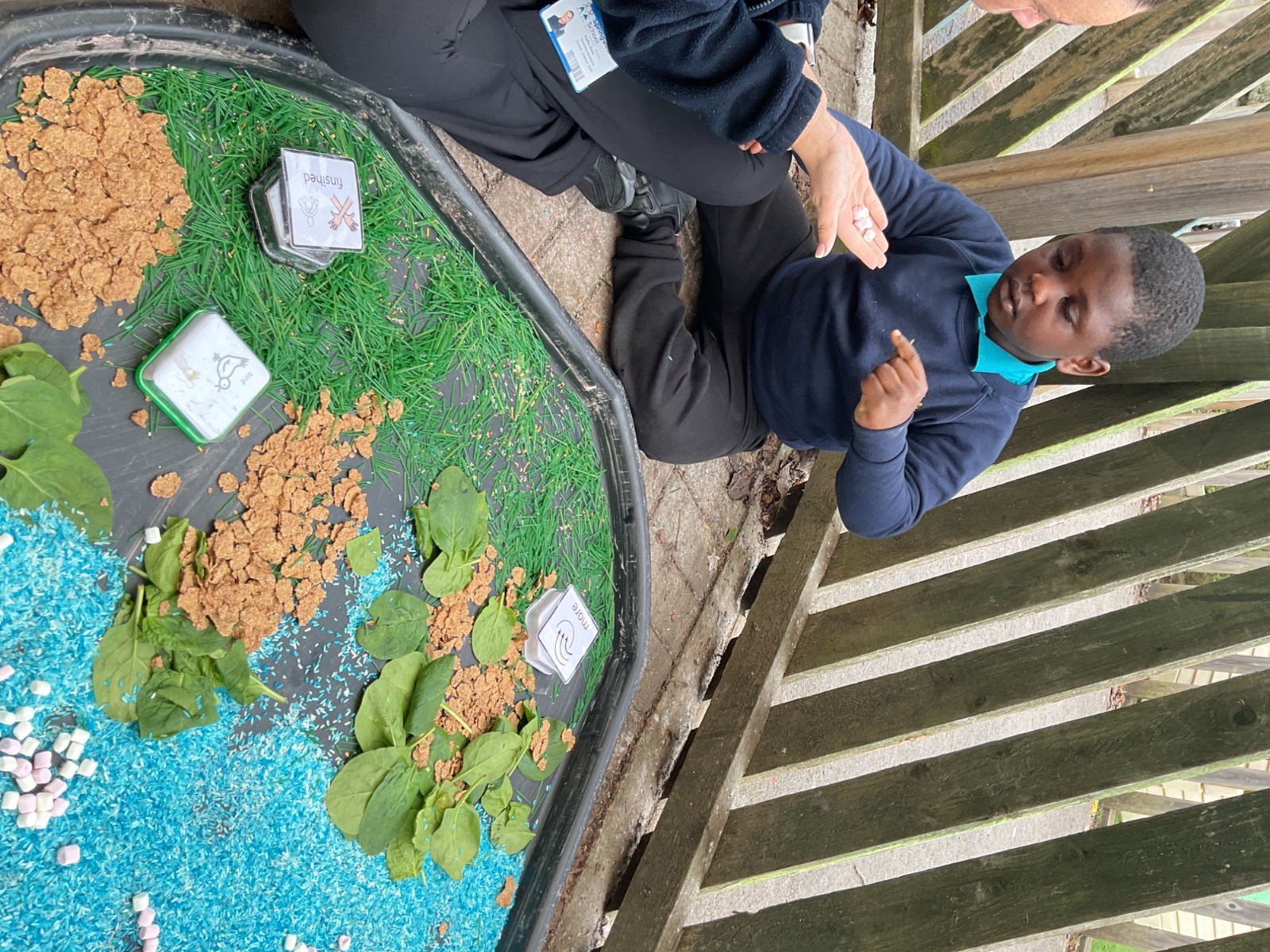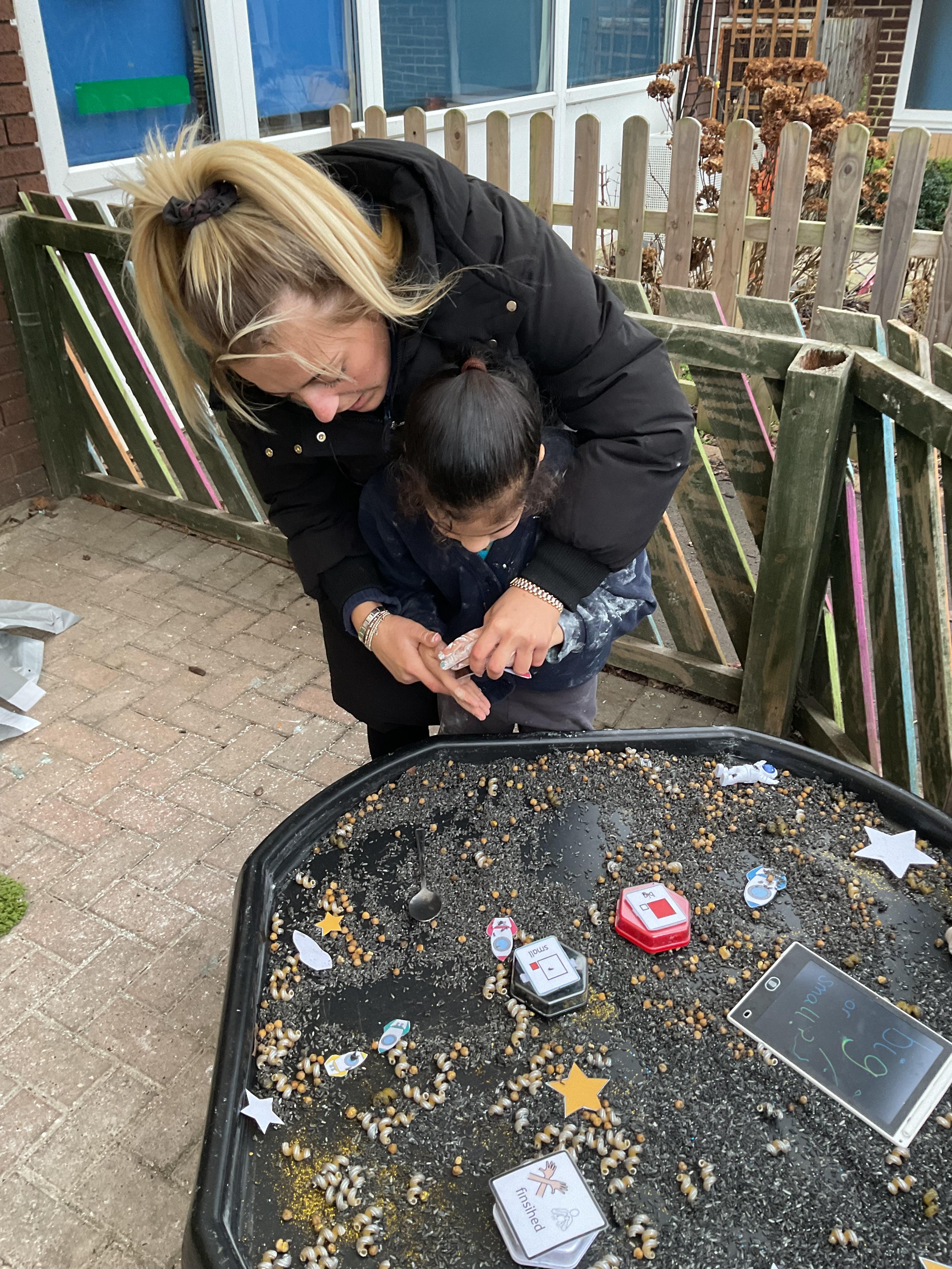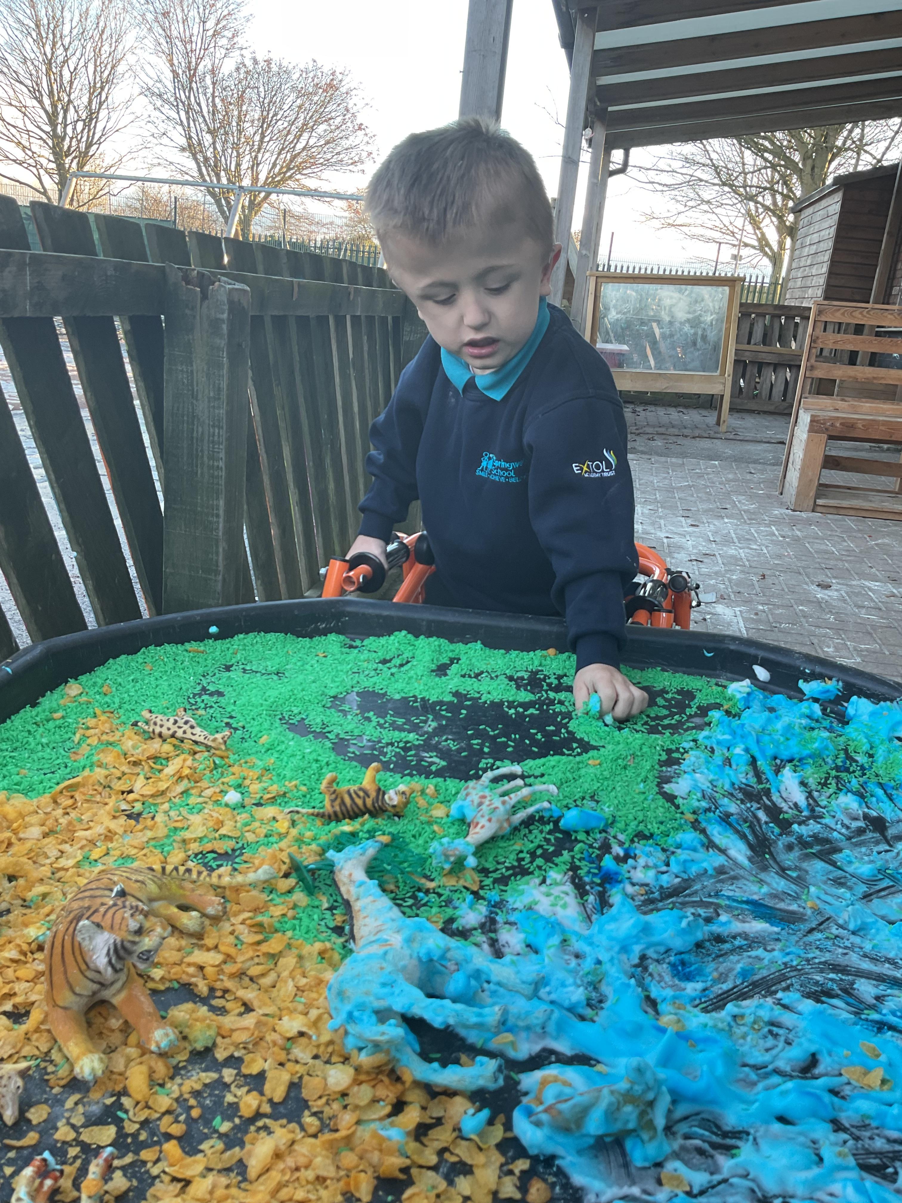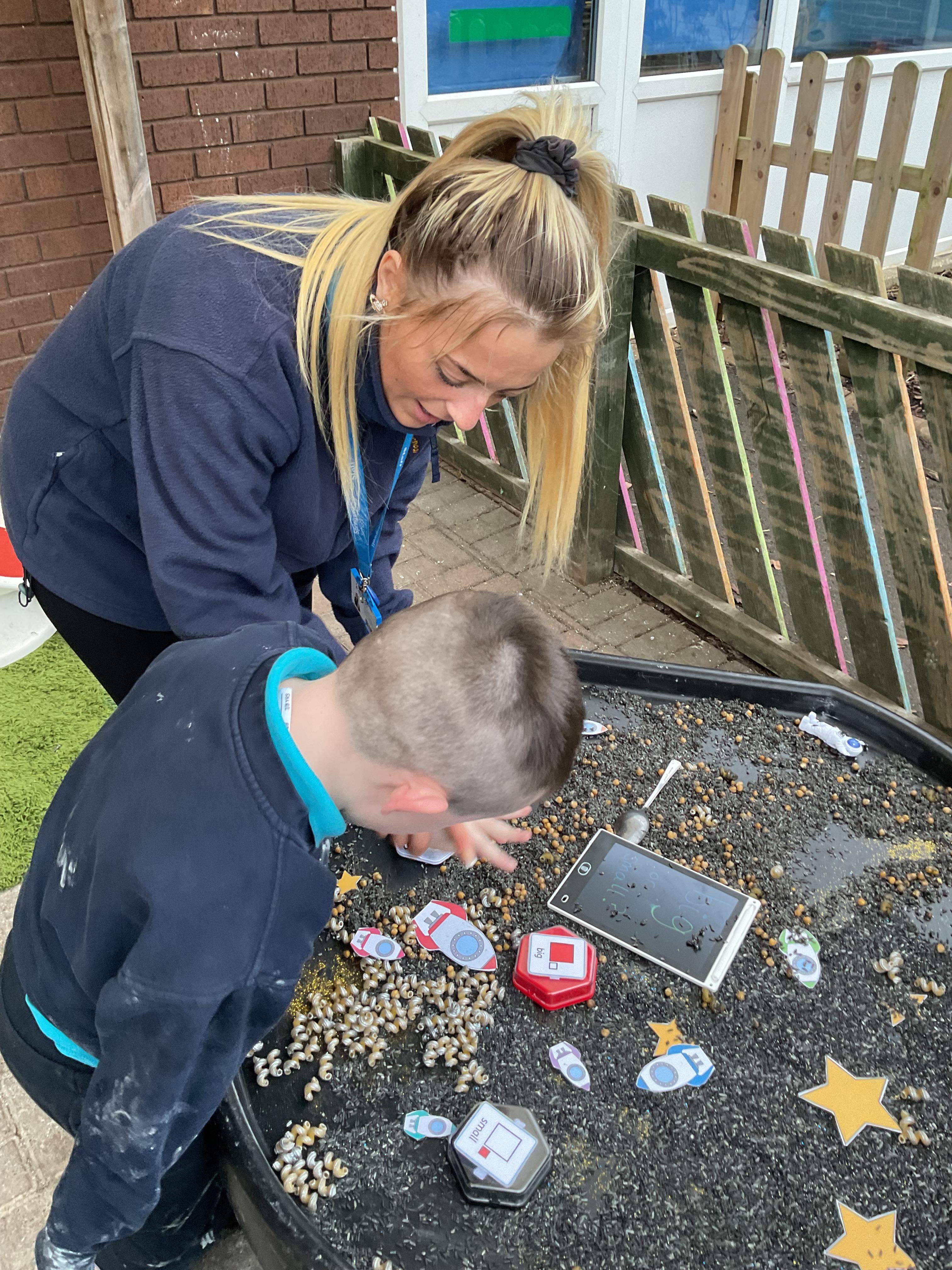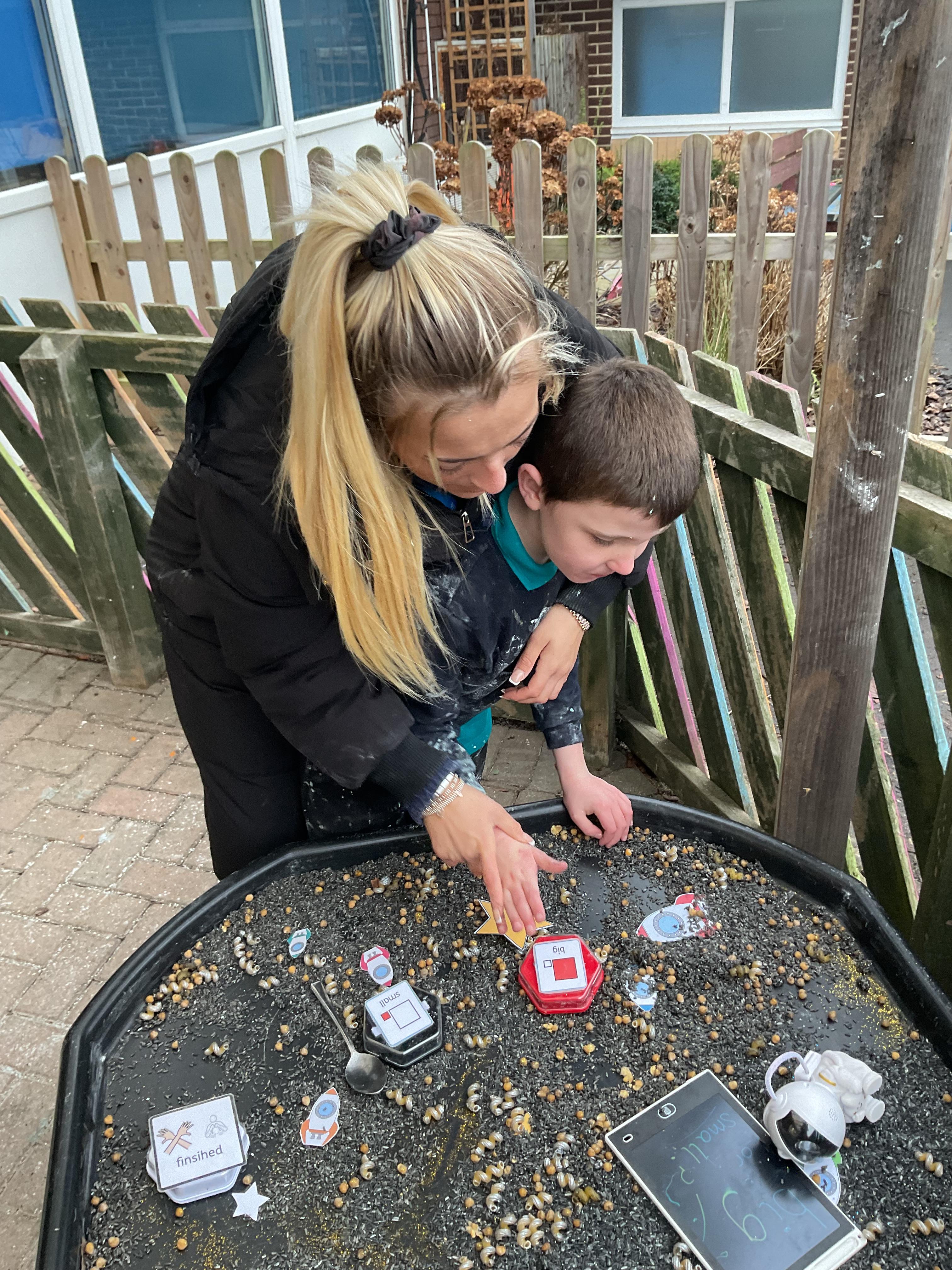 This week has been full of excitement as we continued our learning all about the future. The children loved revisiting our sensory story “Tomorrow, Tomorrow” and engaged brilliantly with all the interactive element. Our colour of the week was black and we explored a range of black objects on our themed table while also learning the Makaton sign for black. In maths, we investigated big and small rockets using a messy play tuff tray filled with rice, pasta and chickpeas. We also had great fun making green gloop, watching how it moved and noticing the sensory experience as it dripped from the plate. Everyone has worked incredibly hard on their workbox tasks, including building with blocks, matching activities and mark making.