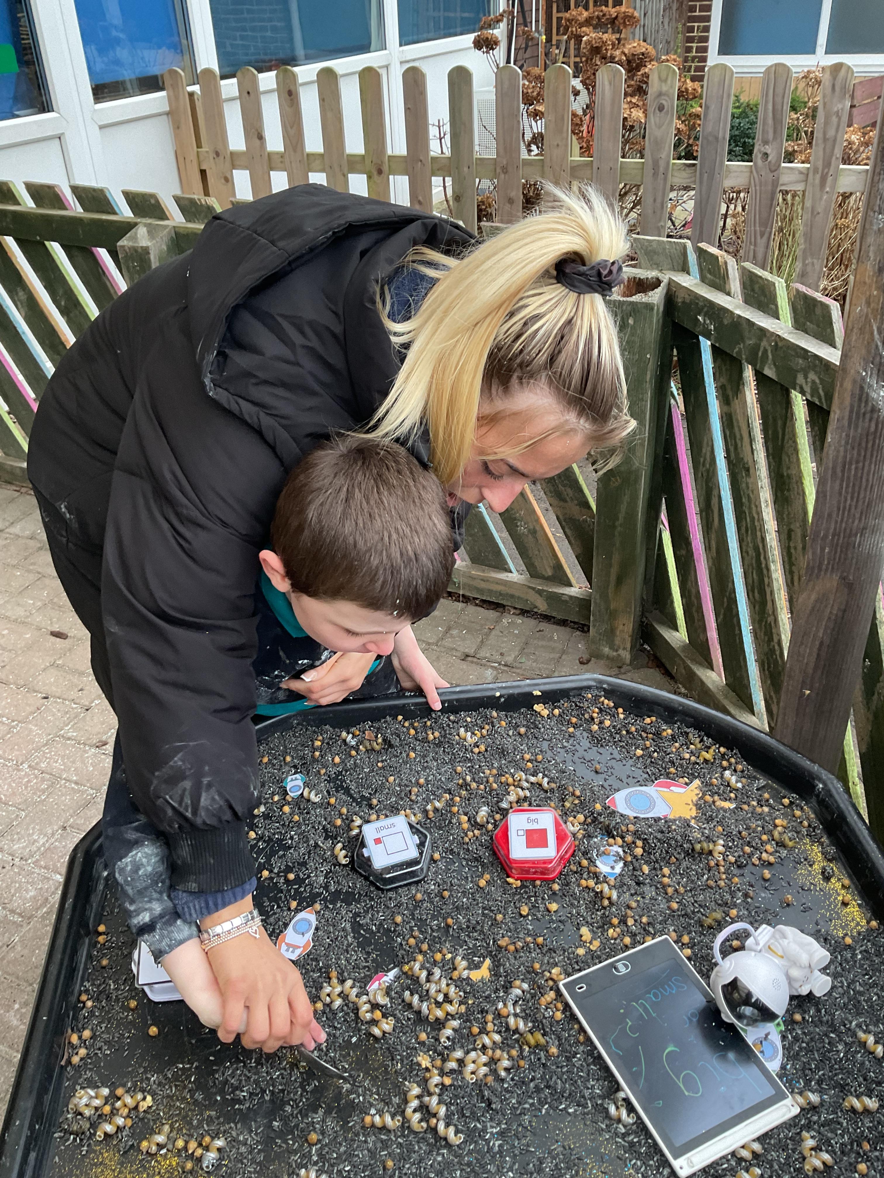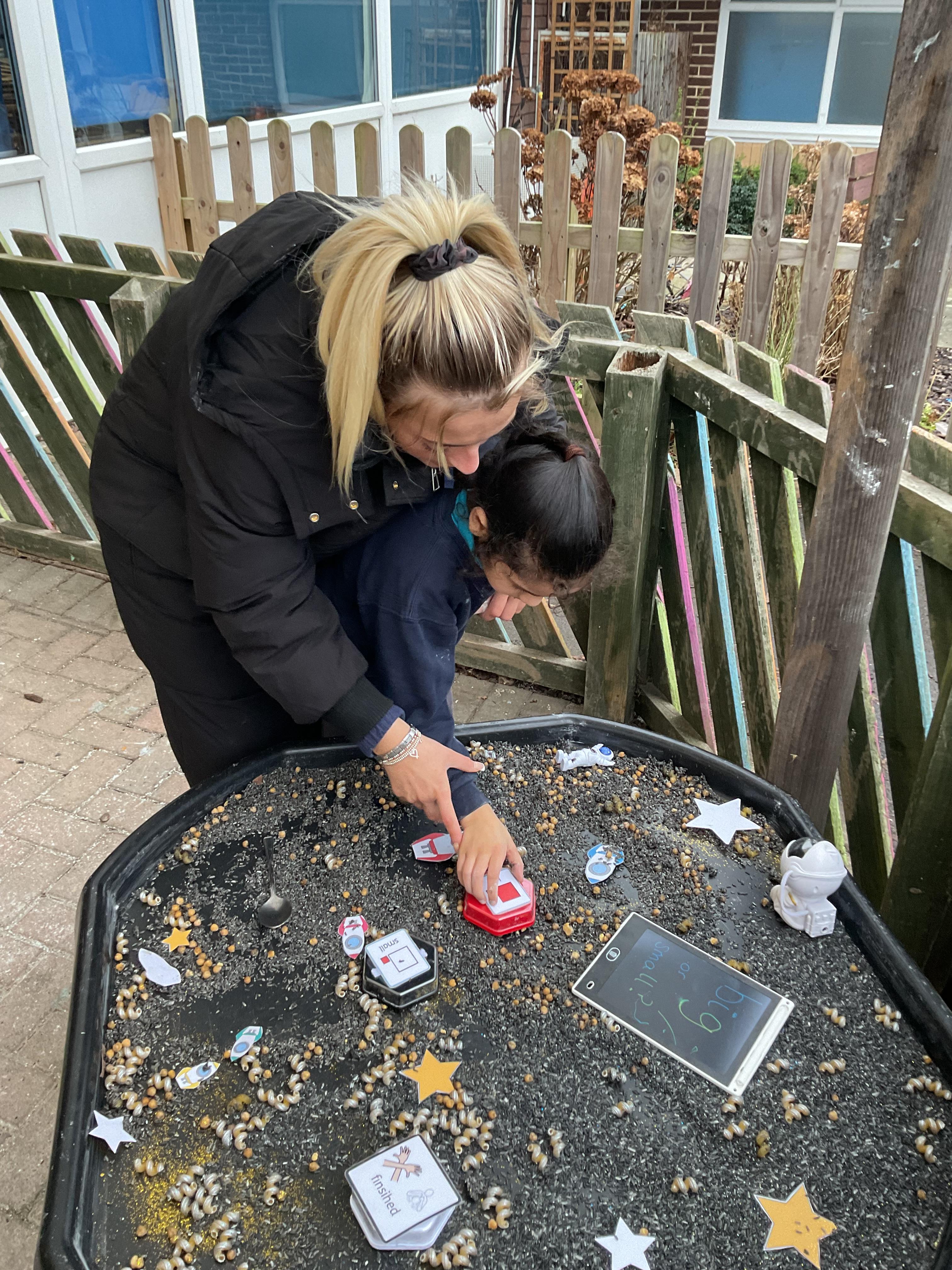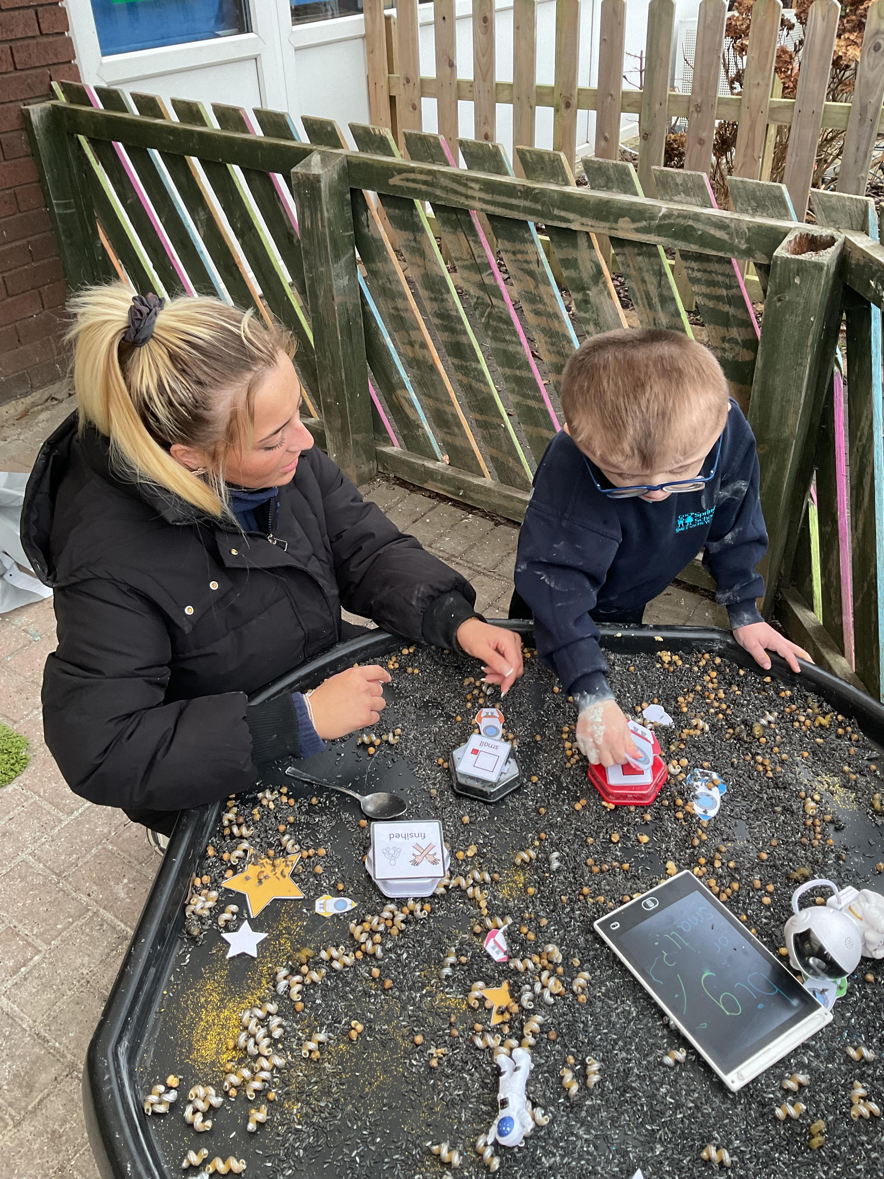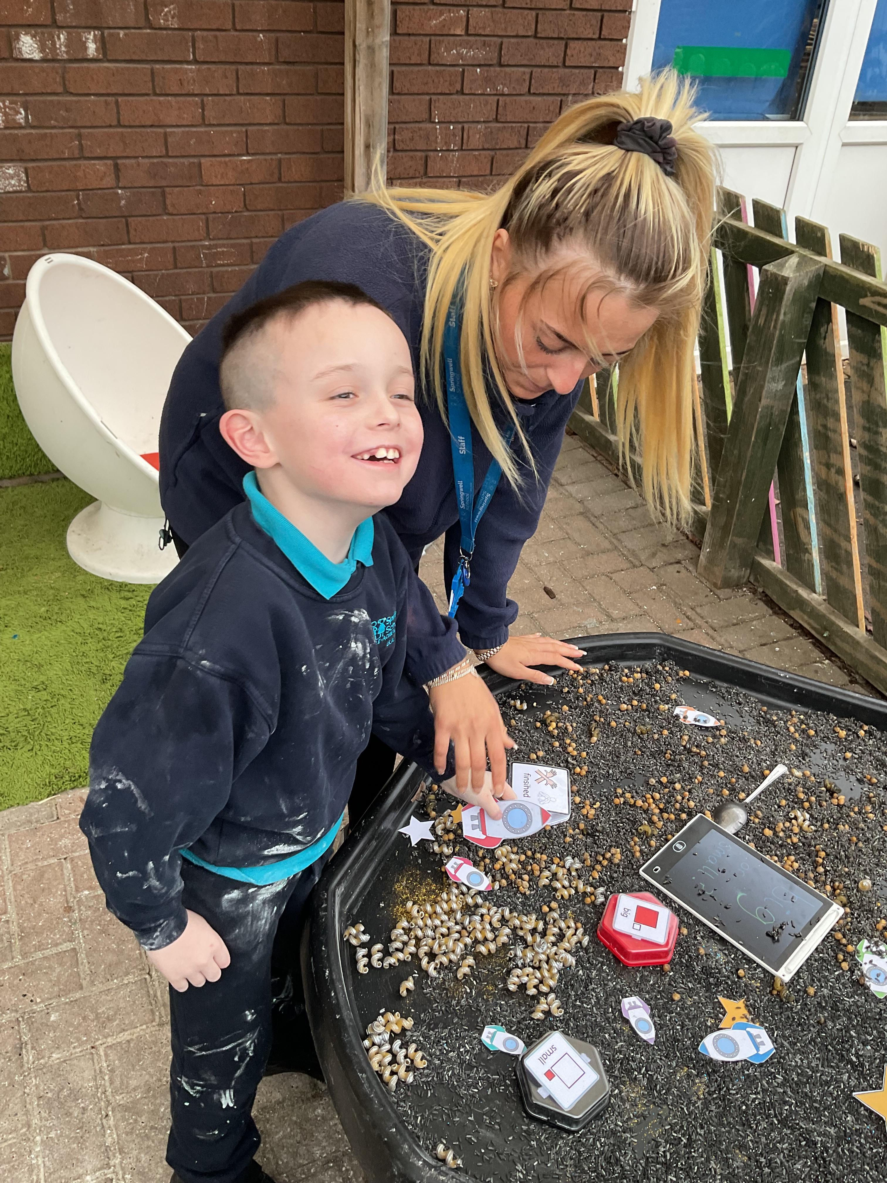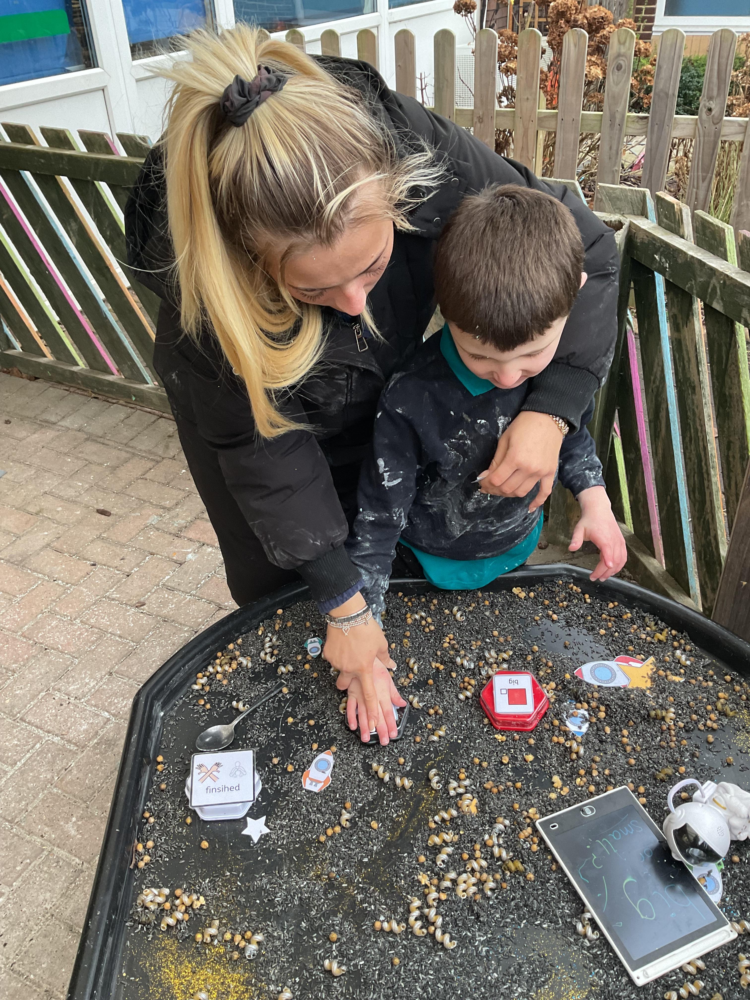 This week has been full of excitement as we continued our learning all about the future. The children loved revisiting our sensory story “Tomorrow, Tomorrow” and engaged brilliantly with all the interactive element. Our colour of the week was black and we explored a range of black objects on our themed table while also learning the Makaton sign for black. In maths, we investigated big and small rockets using a messy play tuff tray filled with rice, pasta and chickpeas. We also had great fun making green gloop, watching how it moved and noticing the sensory experience as it dripped from the plate. Everyone has worked incredibly hard on their workbox tasks, including building with blocks, matching activities and mark making.