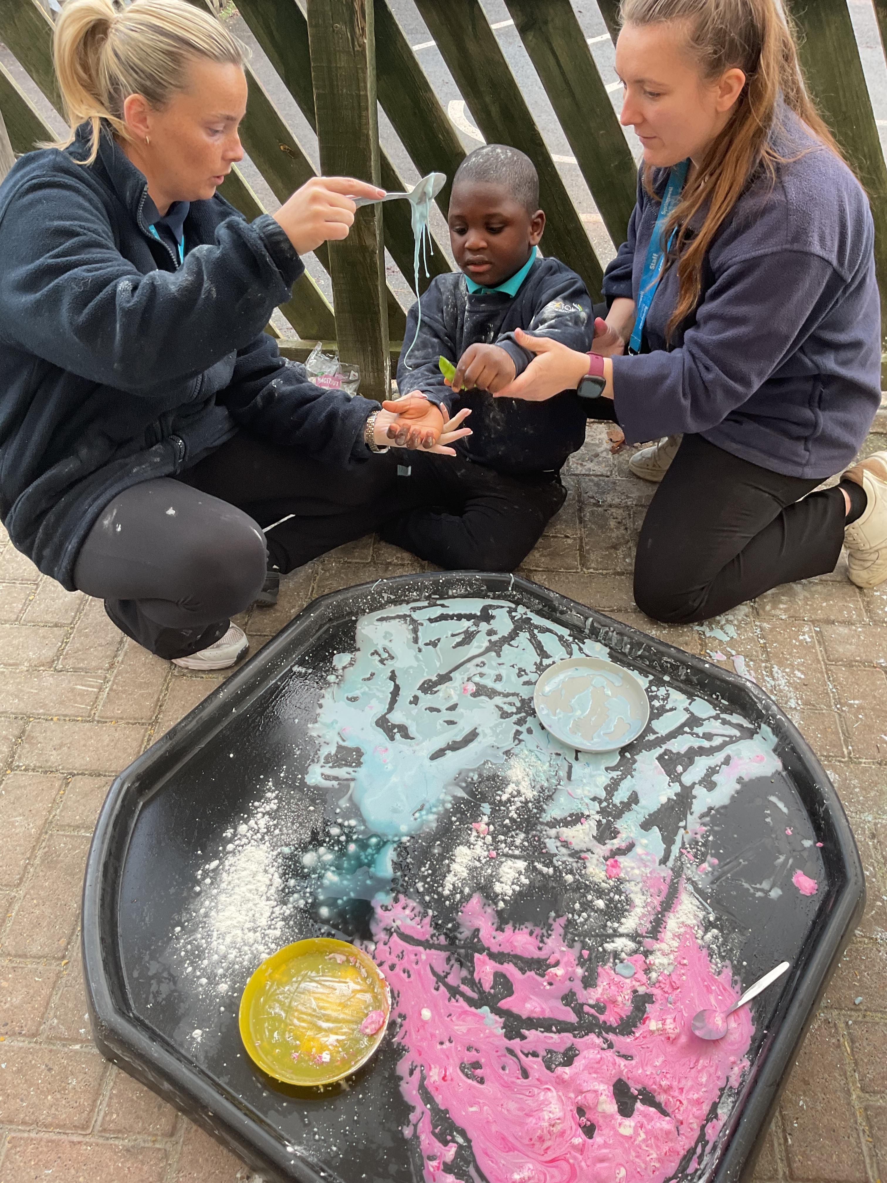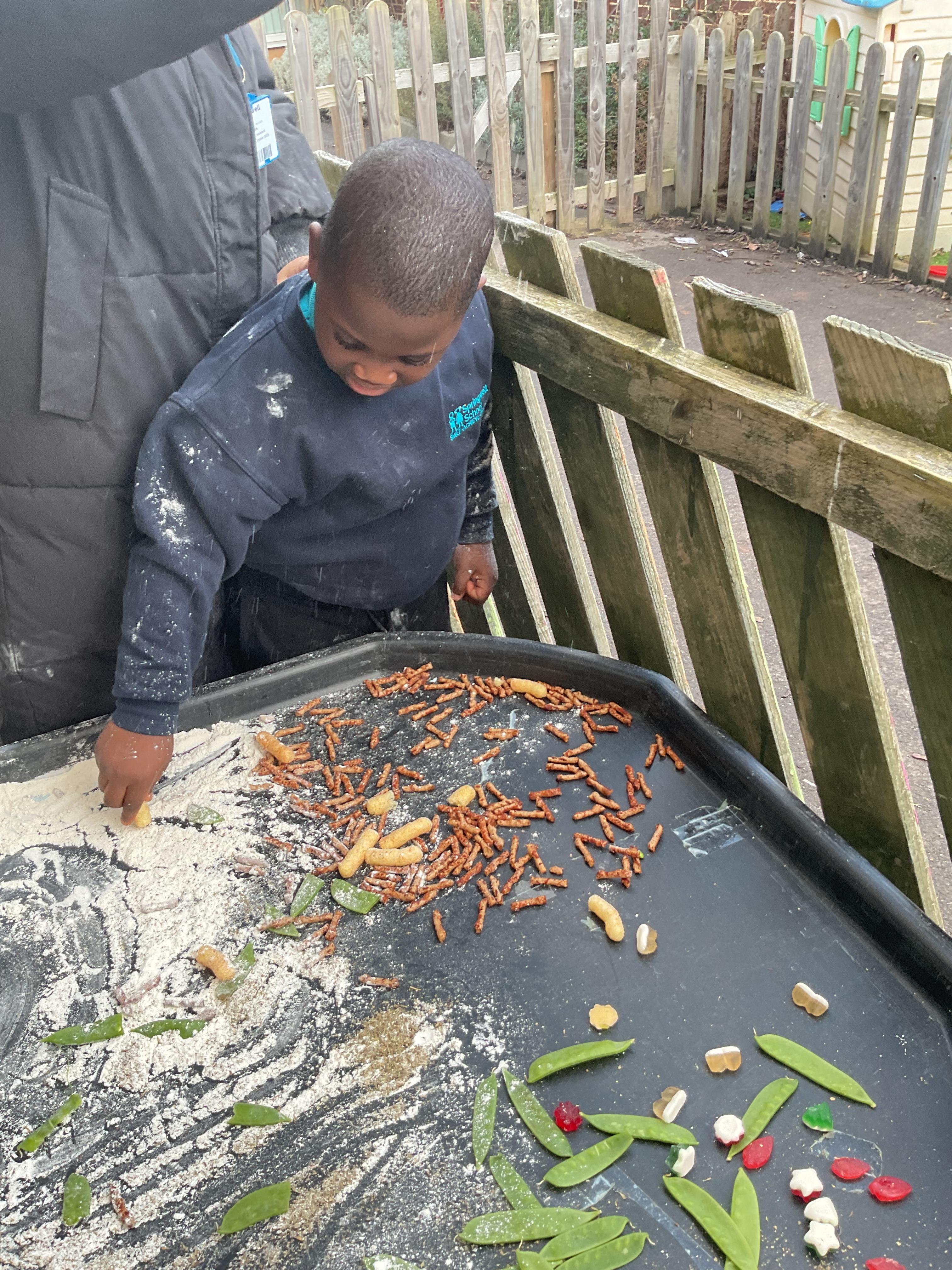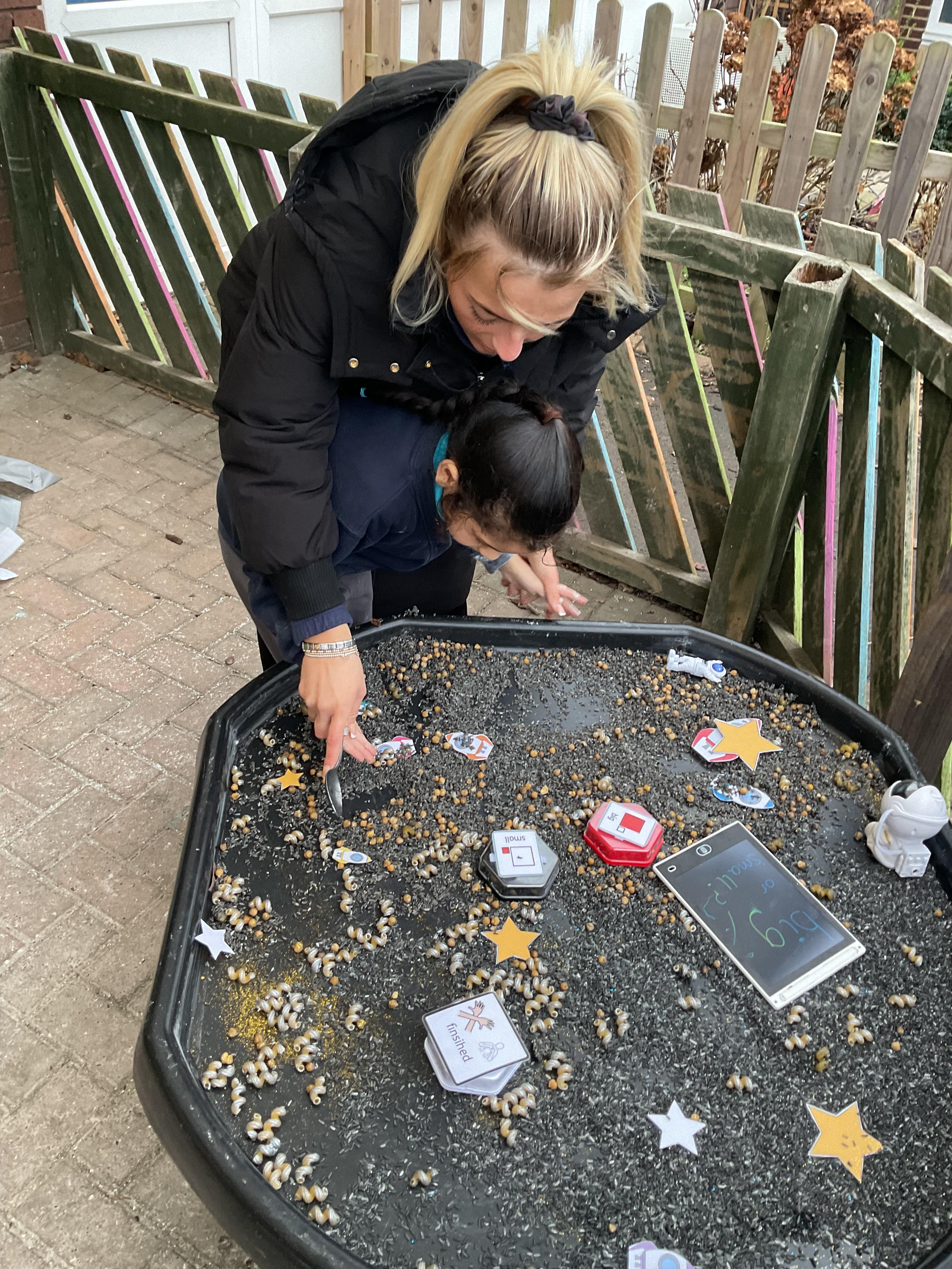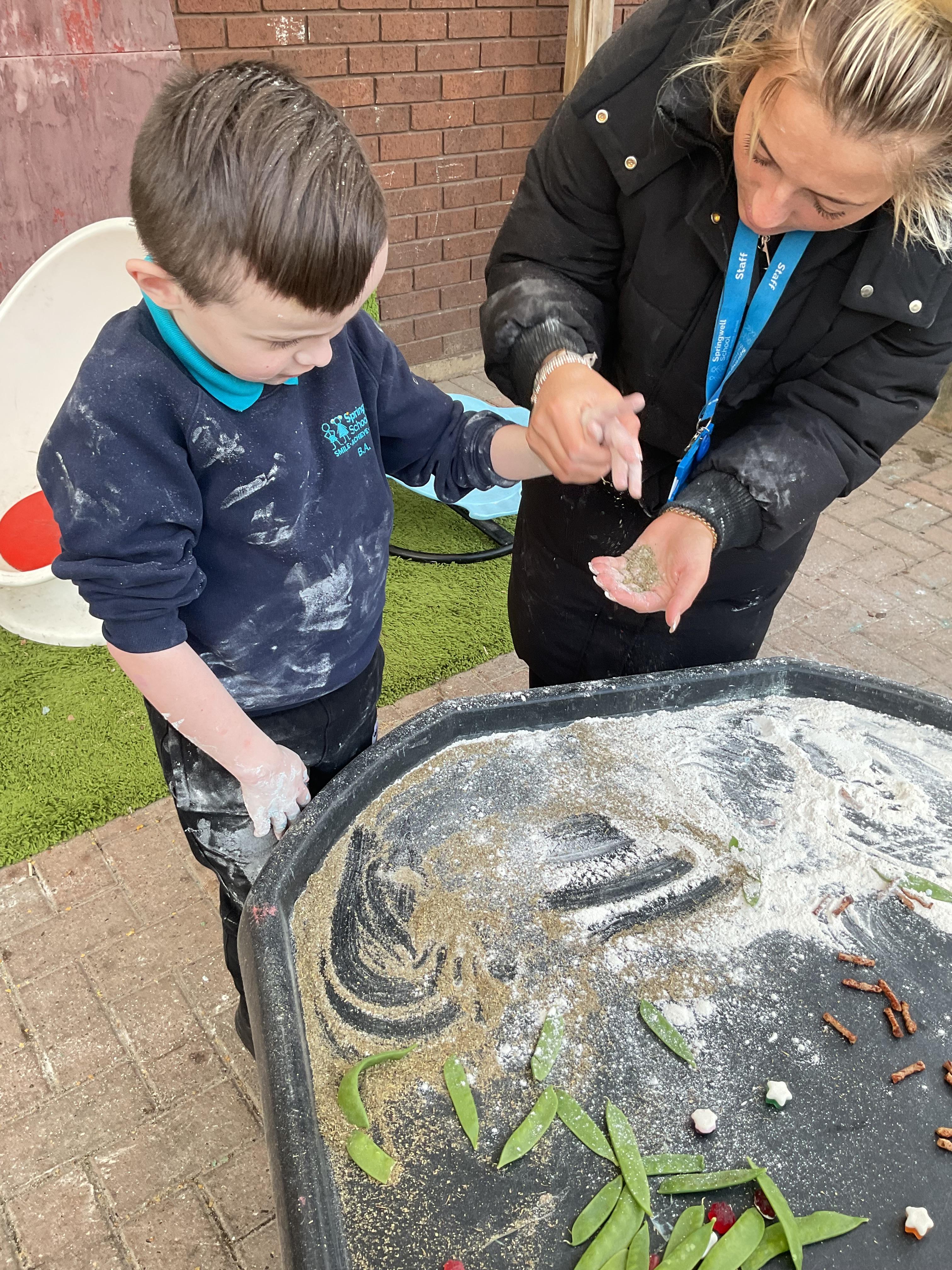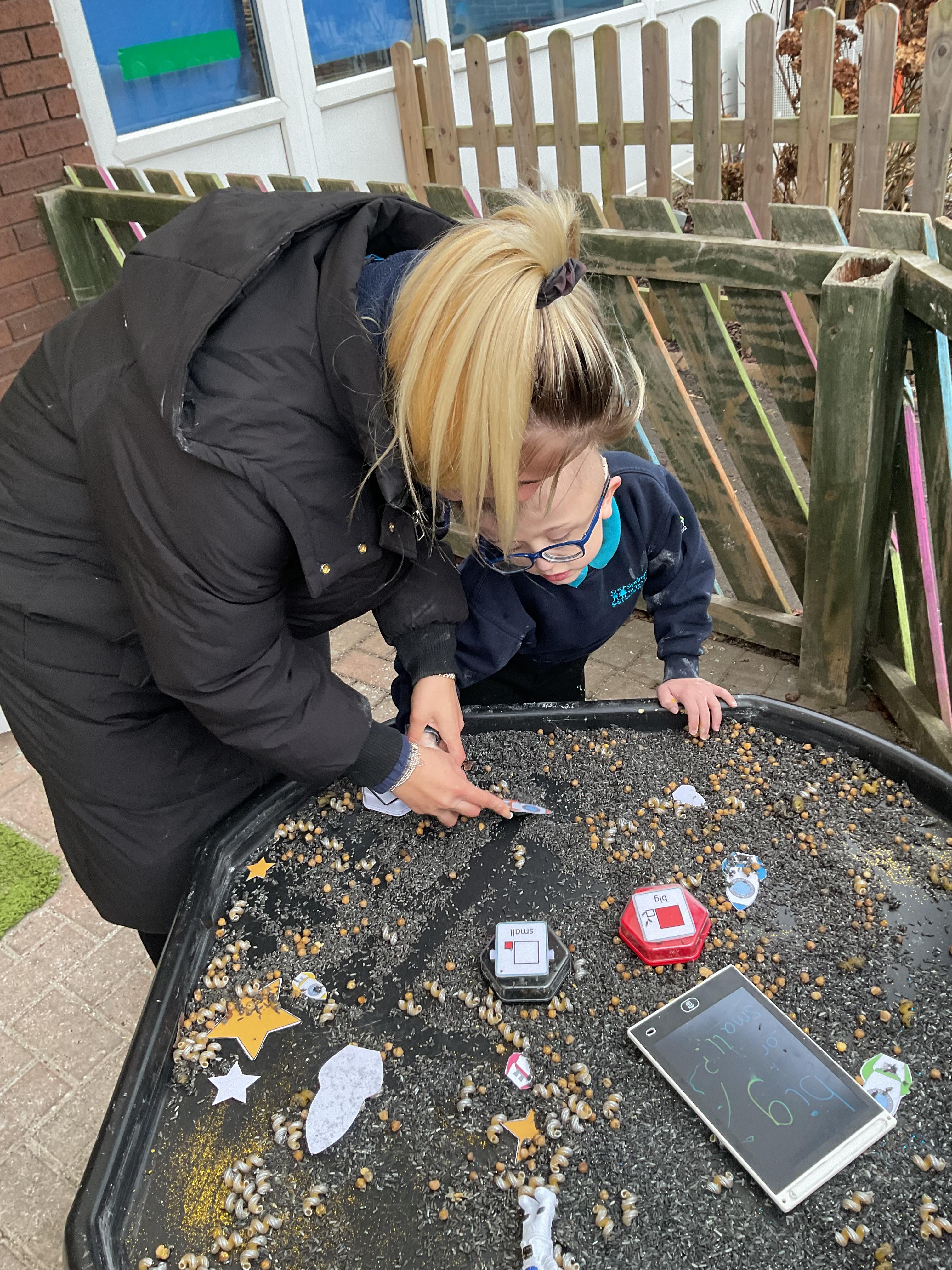 This week has been full of excitement as we continued our learning all about the future. The children loved revisiting our sensory story “Tomorrow, Tomorrow” and engaged brilliantly with all the interactive element. Our colour of the week was black and we explored a range of black objects on our themed table while also learning the Makaton sign for black. In maths, we investigated big and small rockets using a messy play tuff tray filled with rice, pasta and chickpeas. We also had great fun making green gloop, watching how it moved and noticing the sensory experience as it dripped from the plate. Everyone has worked incredibly hard on their workbox tasks, including building with blocks, matching activities and mark making.