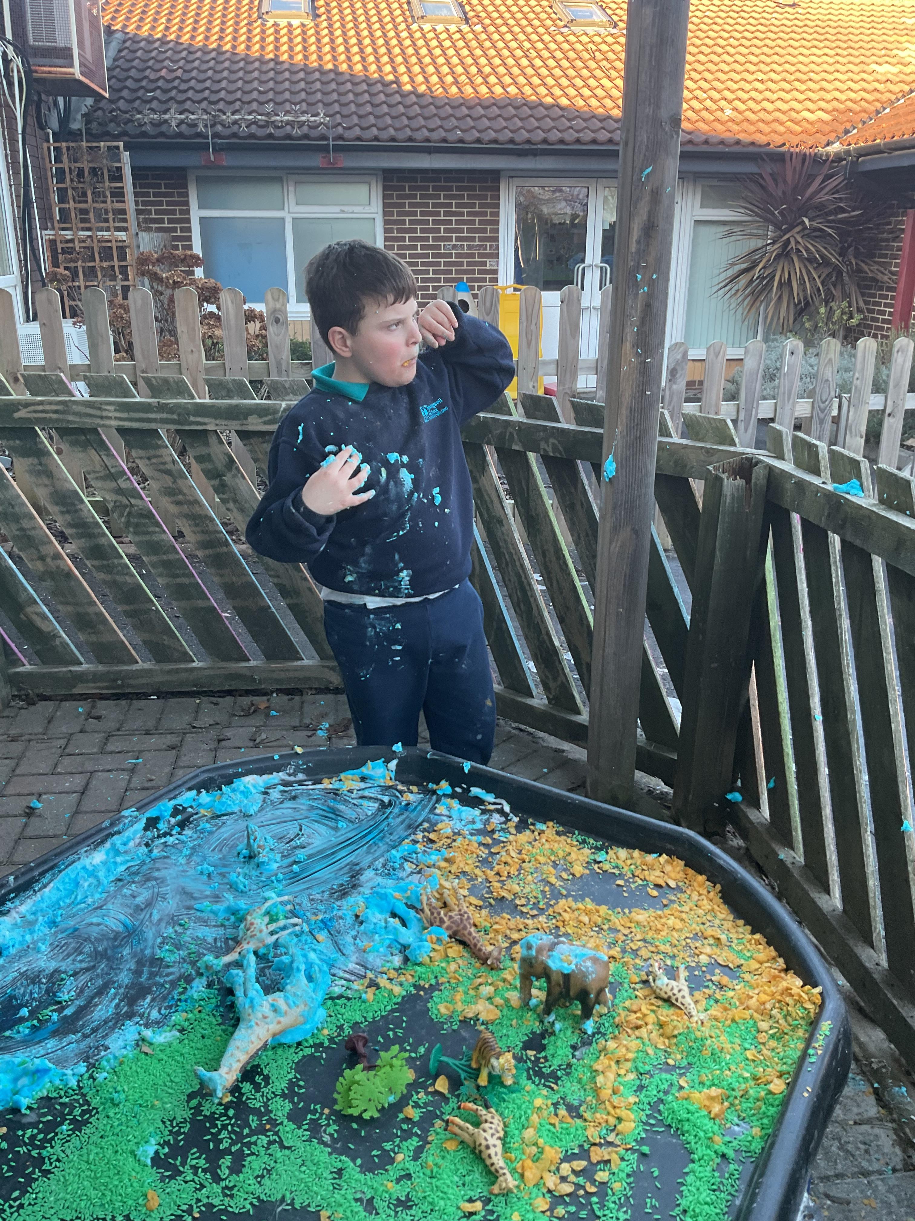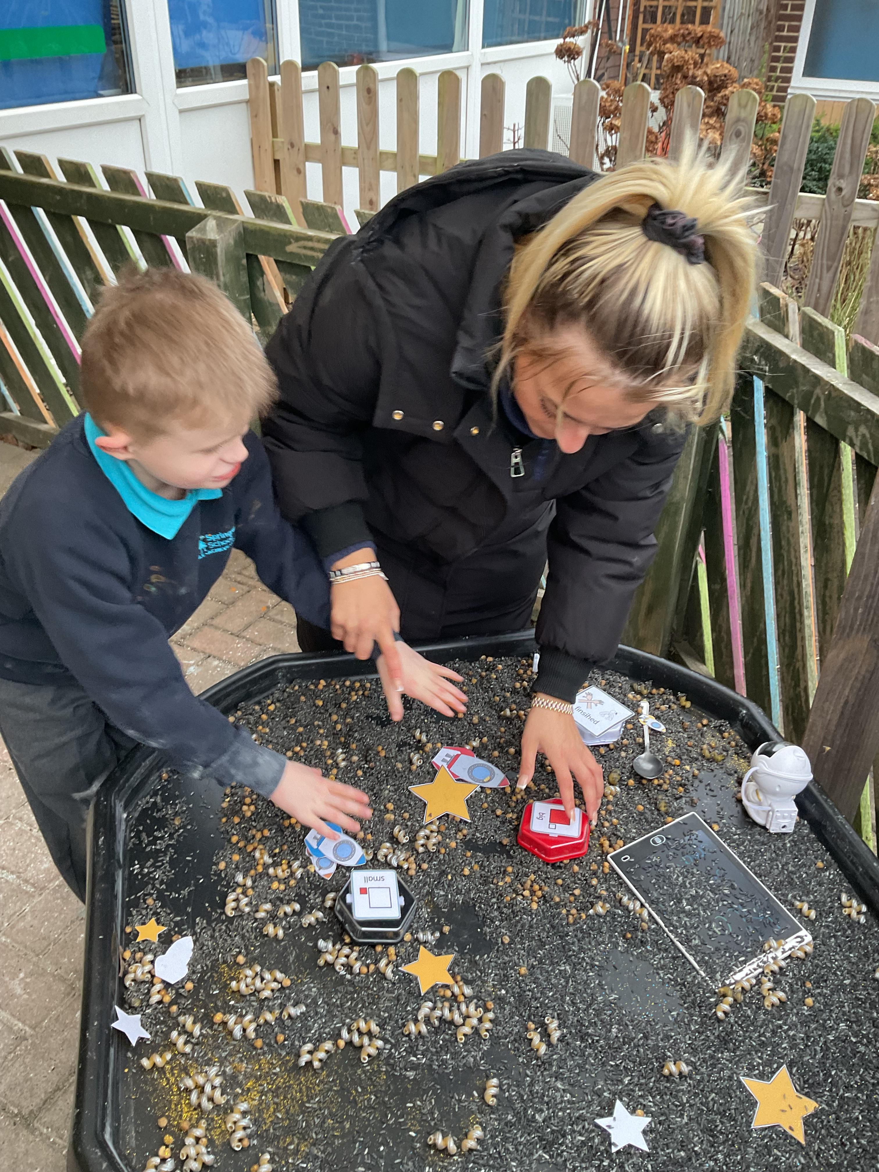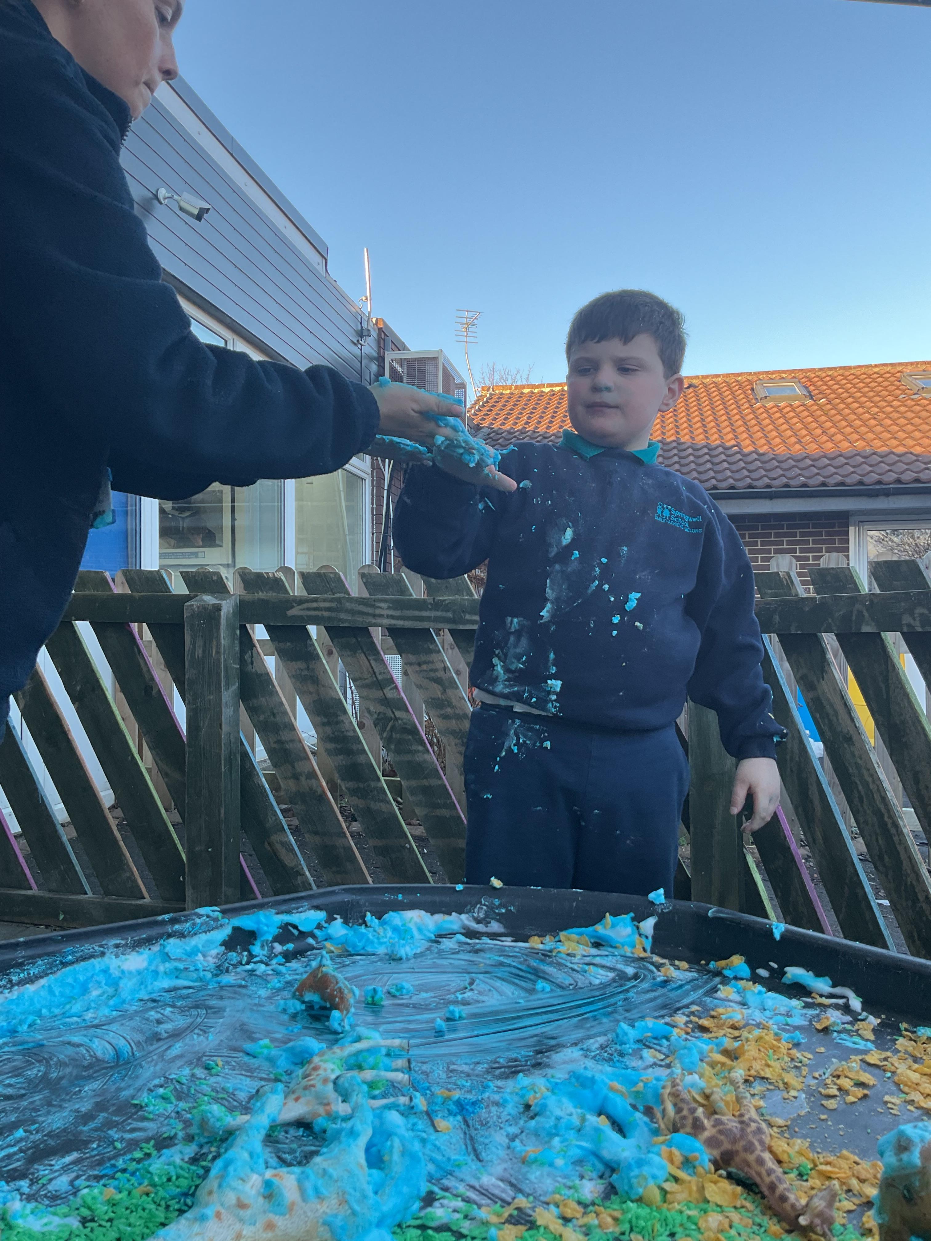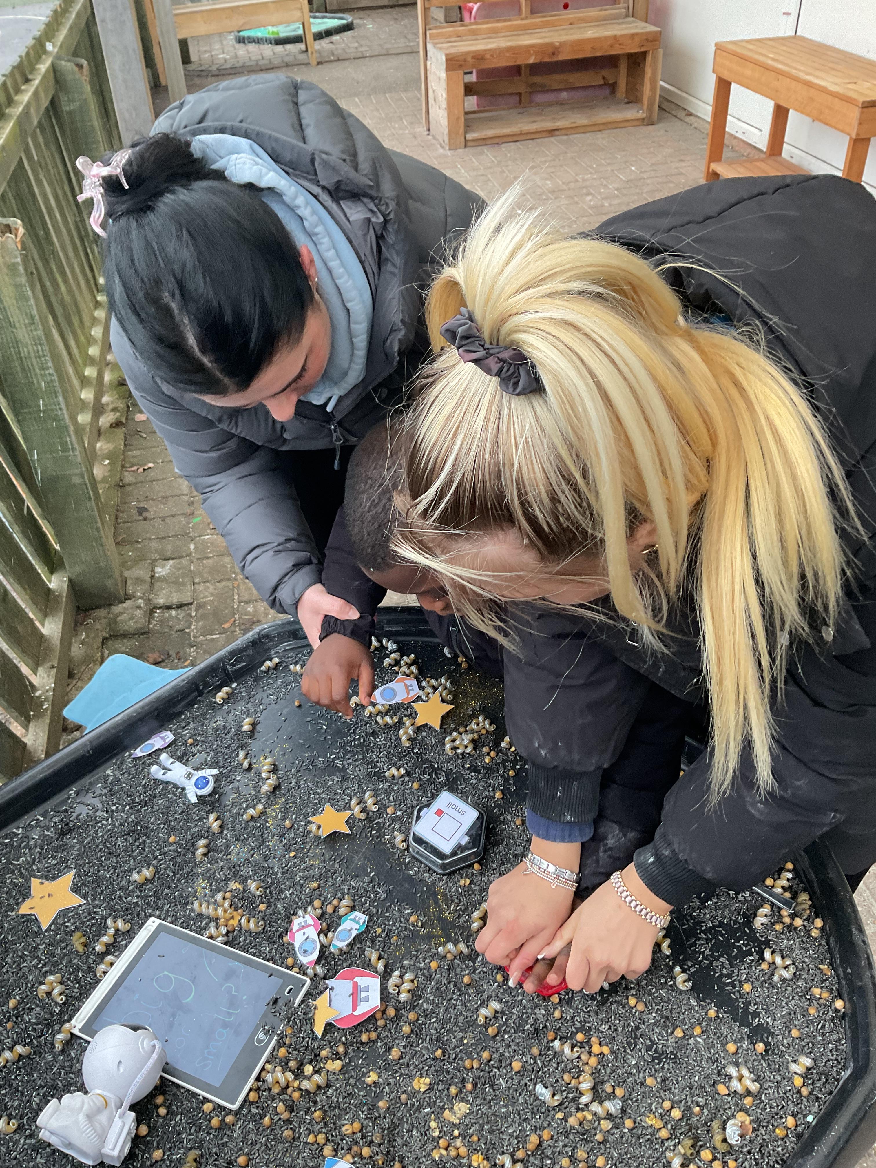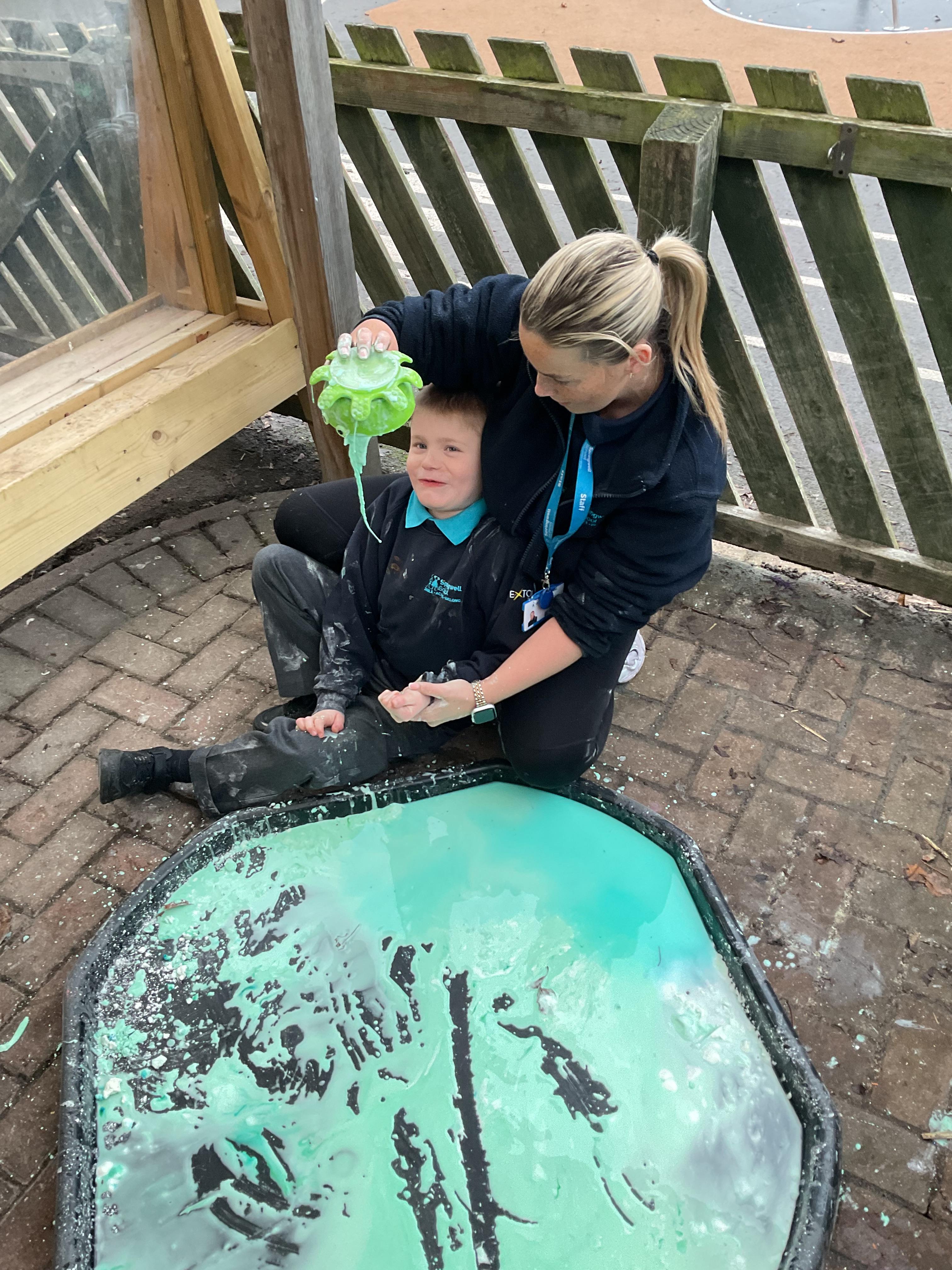 This week has been full of excitement as we continued our learning all about the future. The children loved revisiting our sensory story “Tomorrow, Tomorrow” and engaged brilliantly with all the interactive element. Our colour of the week was black and we explored a range of black objects on our themed table while also learning the Makaton sign for black. In maths, we investigated big and small rockets using a messy play tuff tray filled with rice, pasta and chickpeas. We also had great fun making green gloop, watching how it moved and noticing the sensory experience as it dripped from the plate. Everyone has worked incredibly hard on their workbox tasks, including building with blocks, matching activities and mark making.