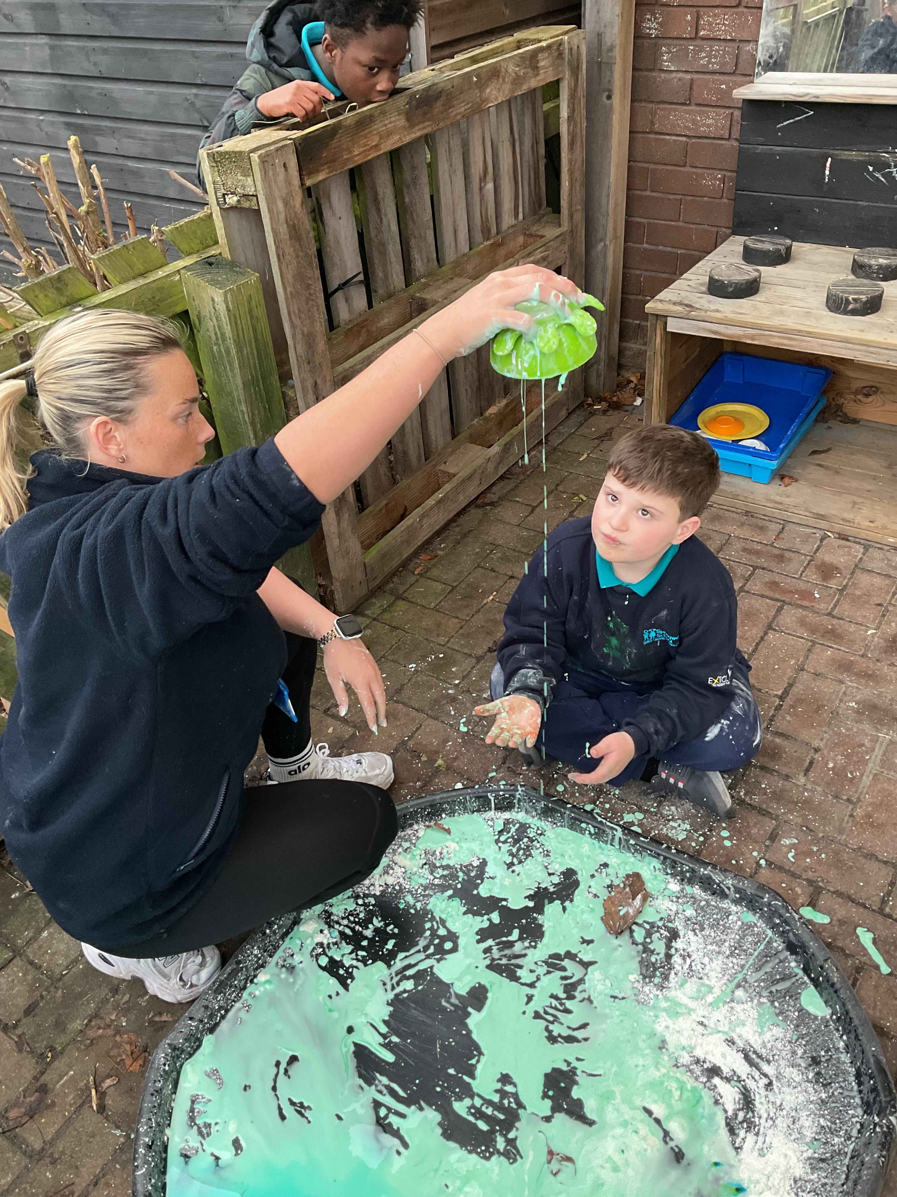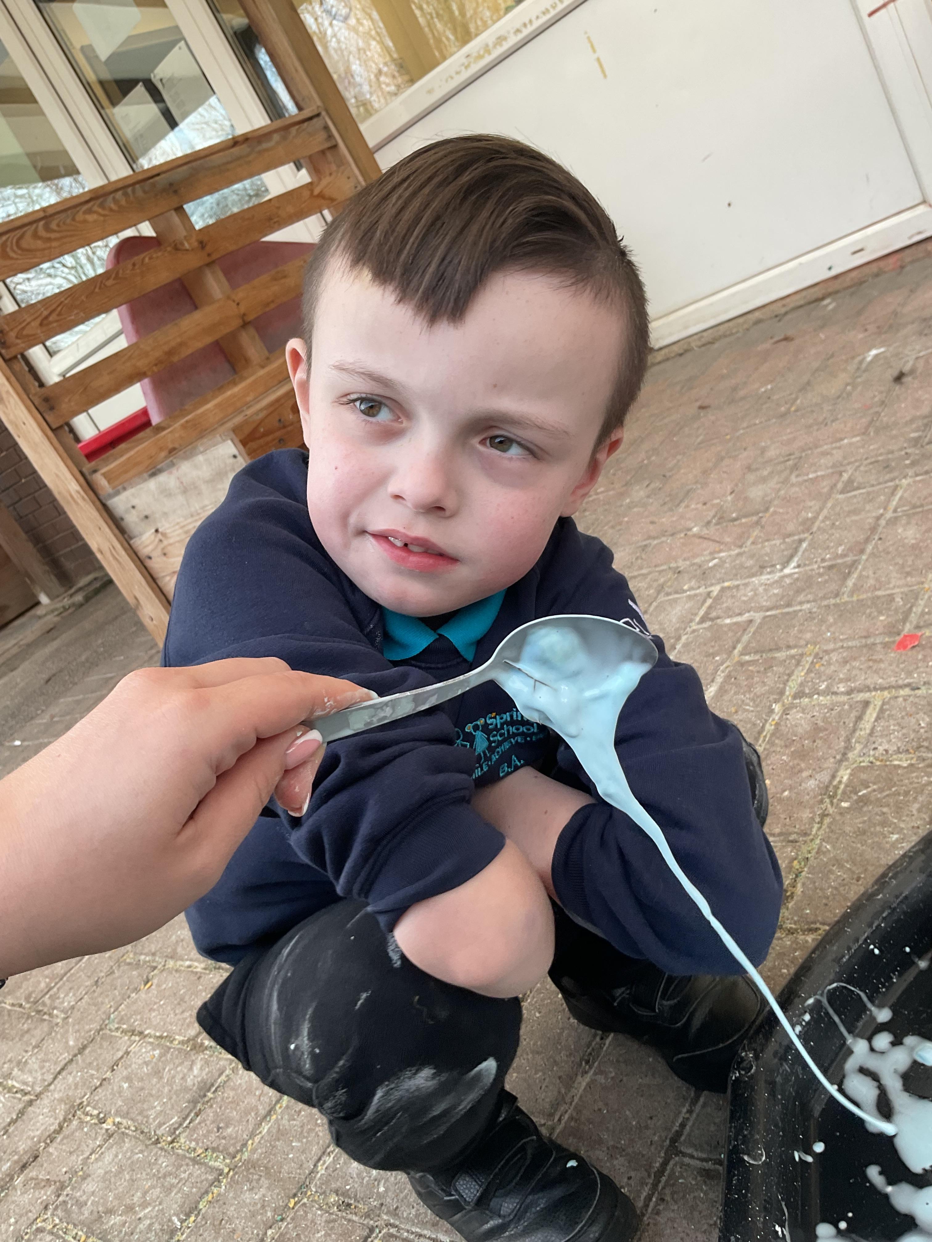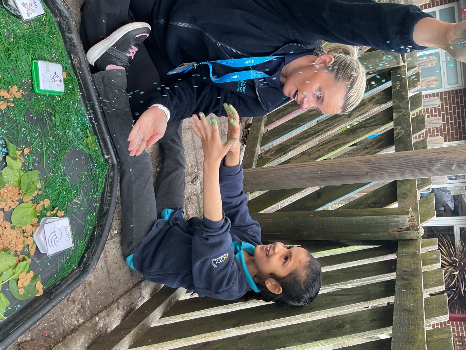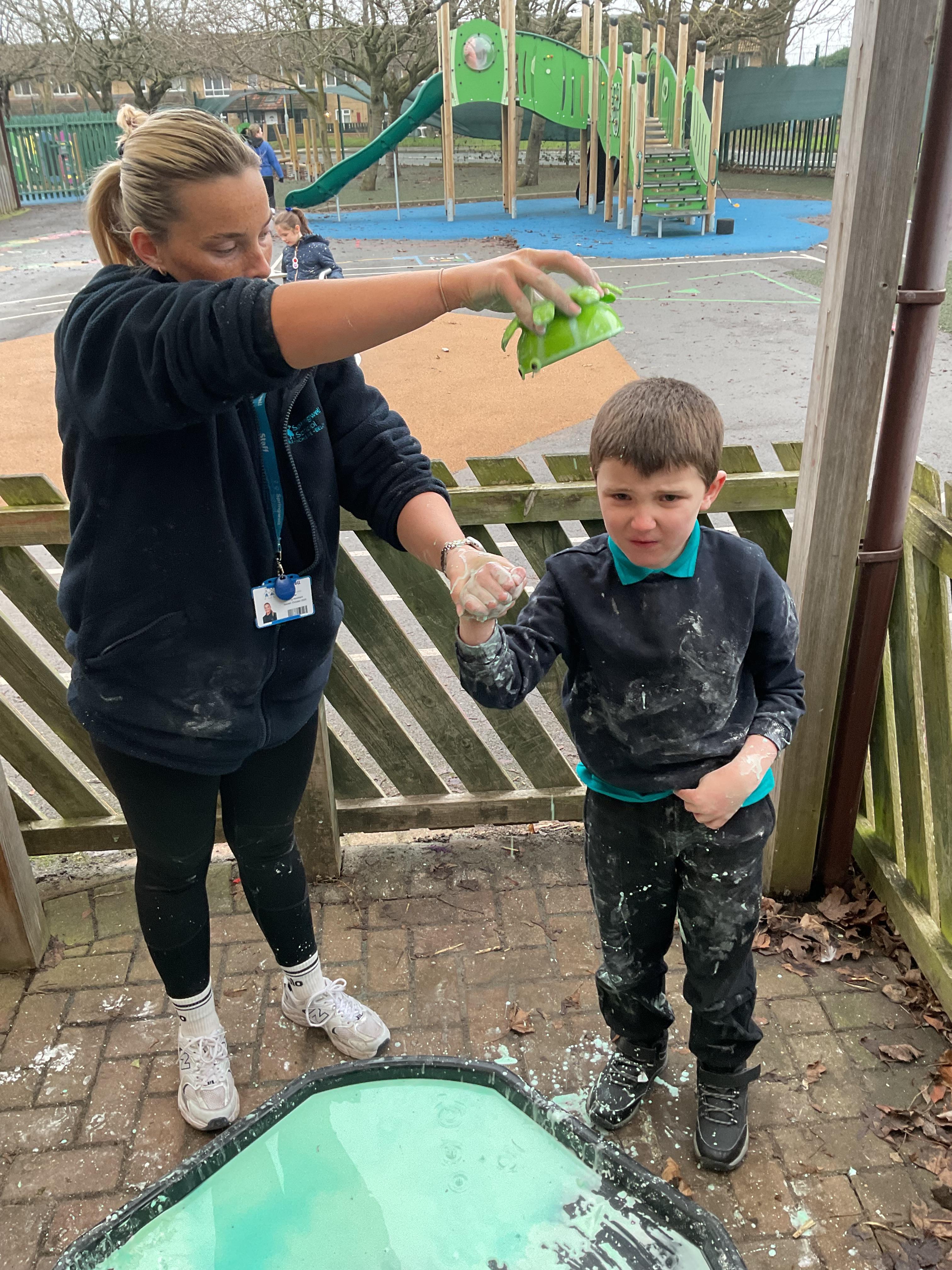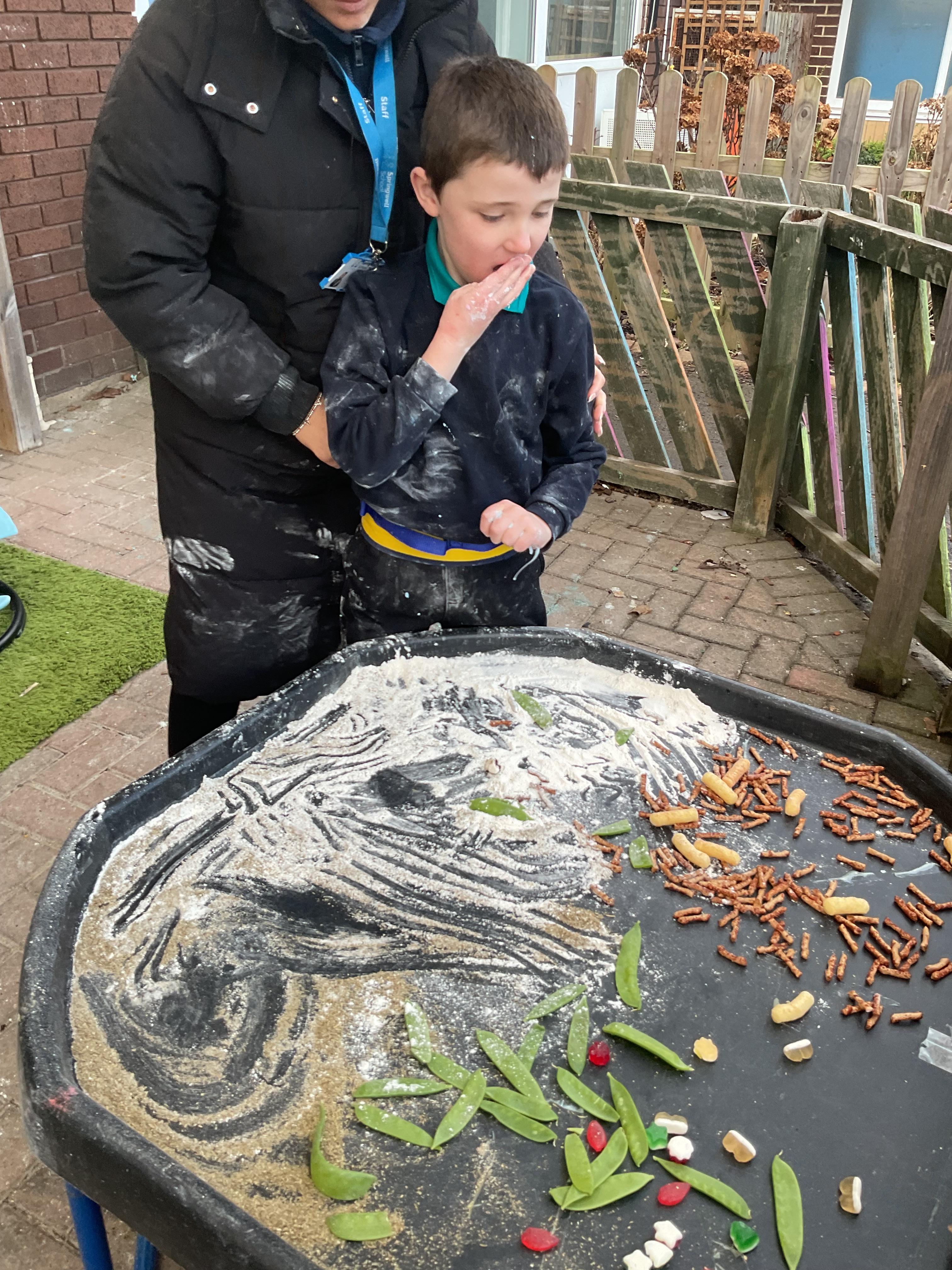 This week has been full of excitement as we continued our learning all about the future. The children loved revisiting our sensory story “Tomorrow, Tomorrow” and engaged brilliantly with all the interactive element. Our colour of the week was black and we explored a range of black objects on our themed table while also learning the Makaton sign for black. In maths, we investigated big and small rockets using a messy play tuff tray filled with rice, pasta and chickpeas. We also had great fun making green gloop, watching how it moved and noticing the sensory experience as it dripped from the plate. Everyone has worked incredibly hard on their workbox tasks, including building with blocks, matching activities and mark making.